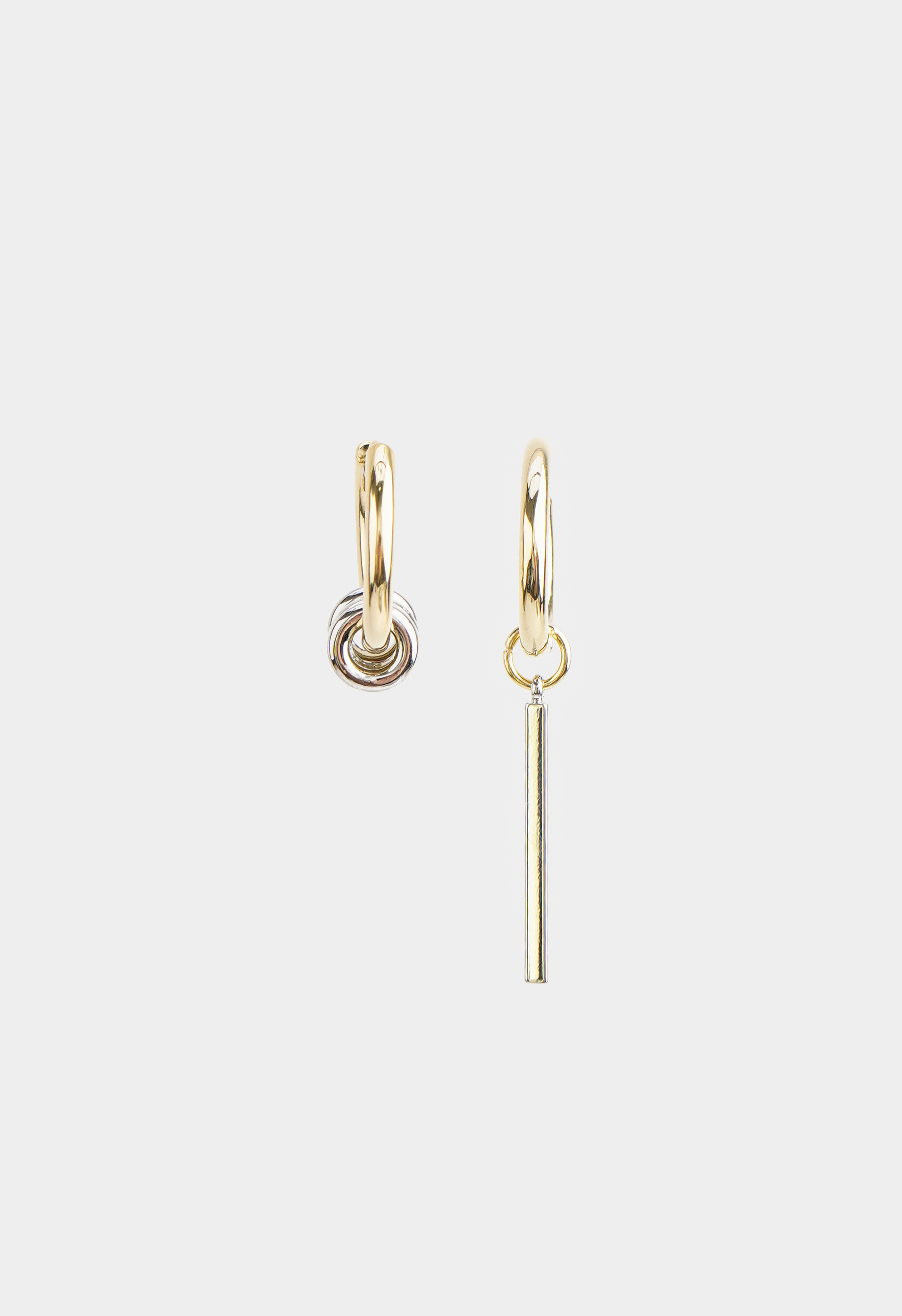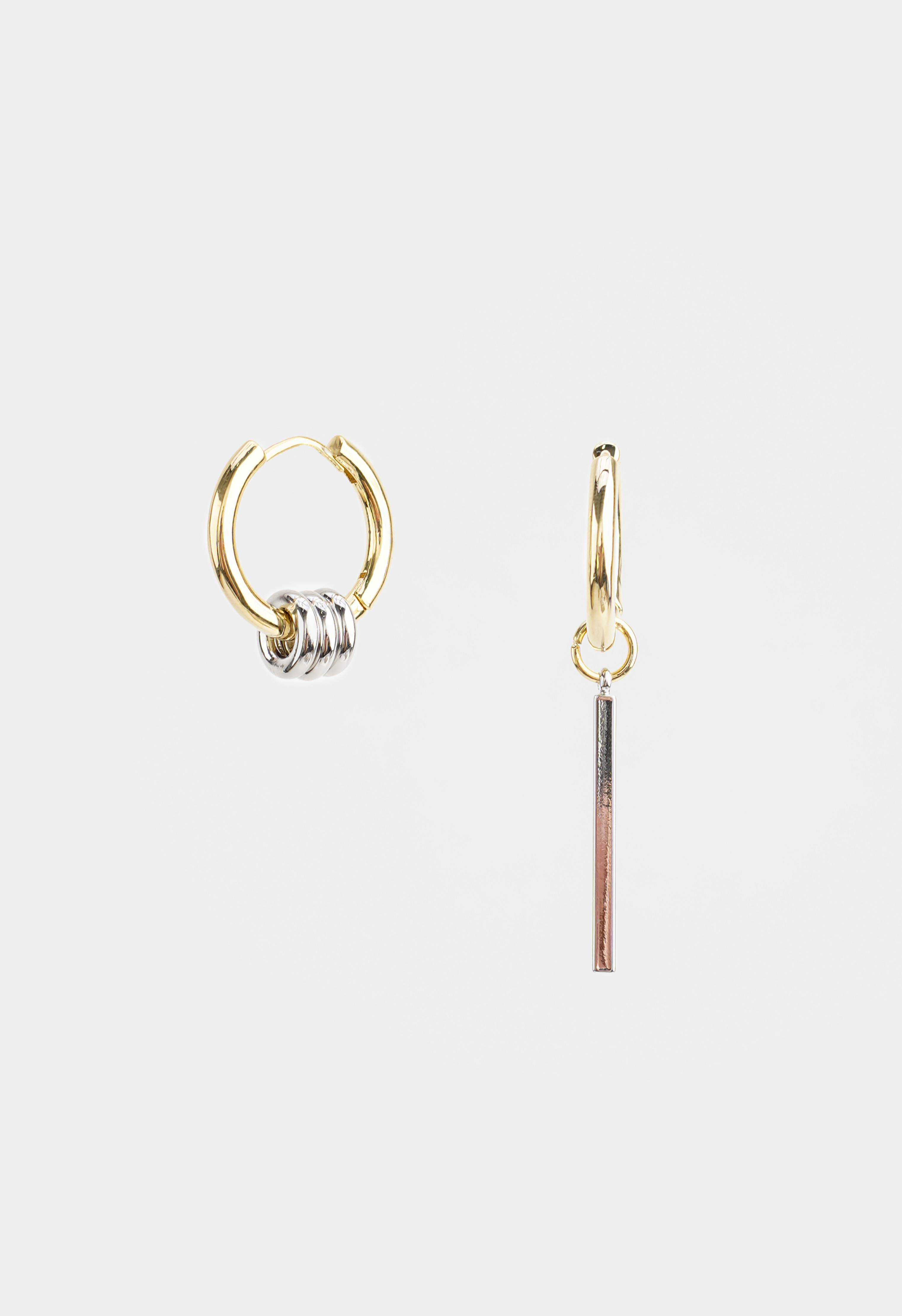 Эти серьги – идеальный баланс формы. В этом ансамбле одно ухо украшают маленькие серебряные колечки, которые ловят свет и взгляды. Другое – освещено строгой золотой линией длинной серьги, вытягивающей силуэт и добавляющей шарм утонченной асимметрии.