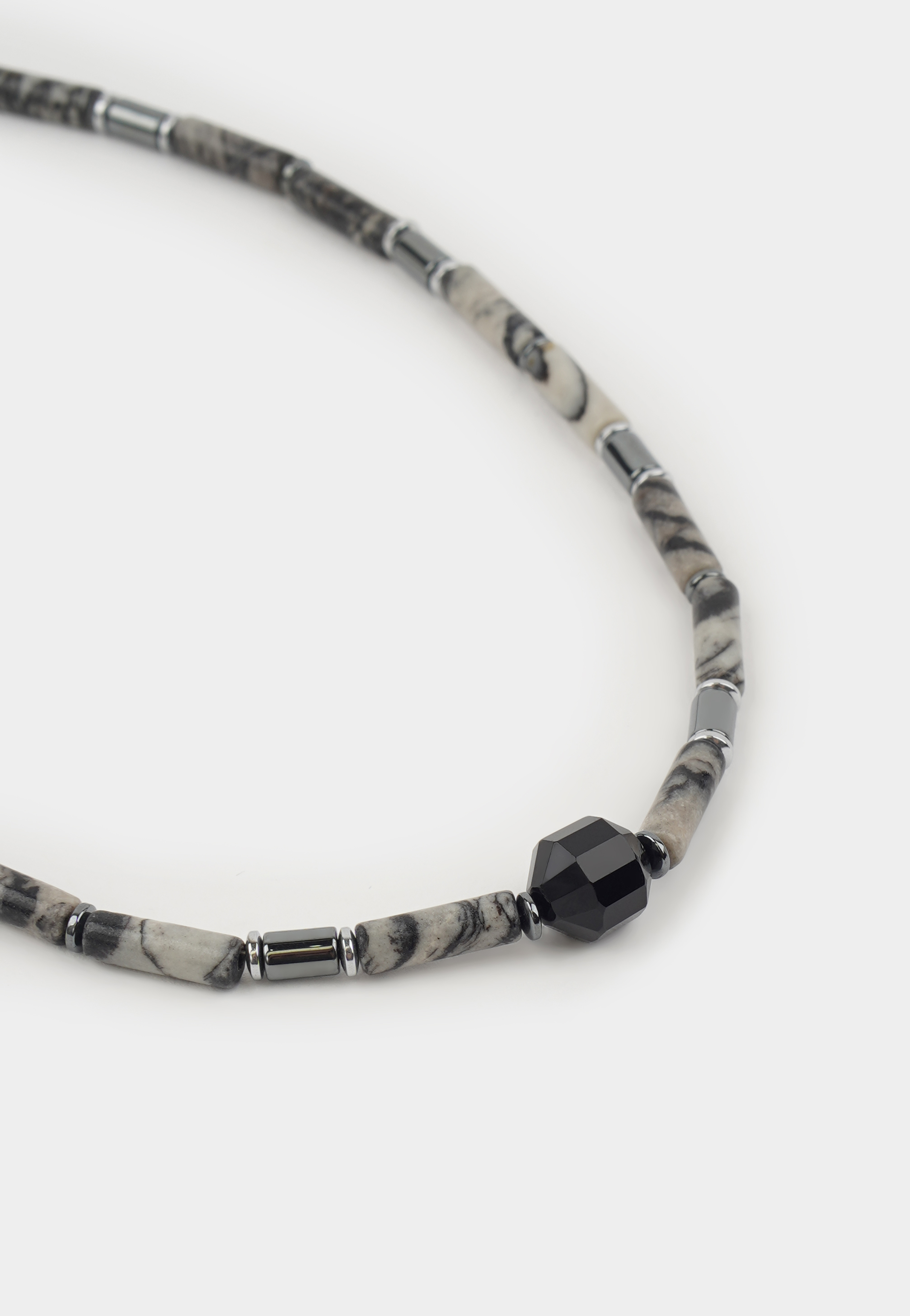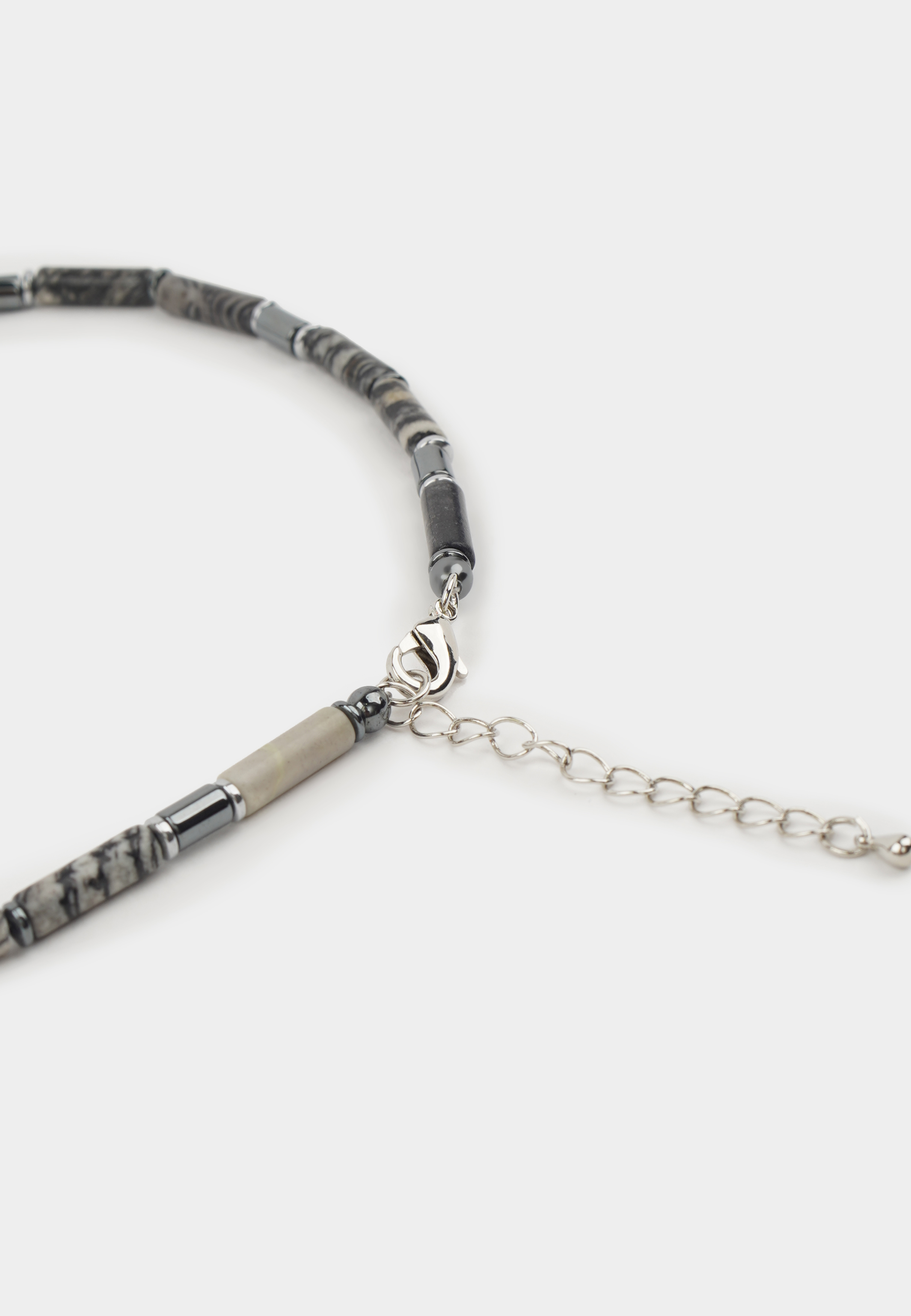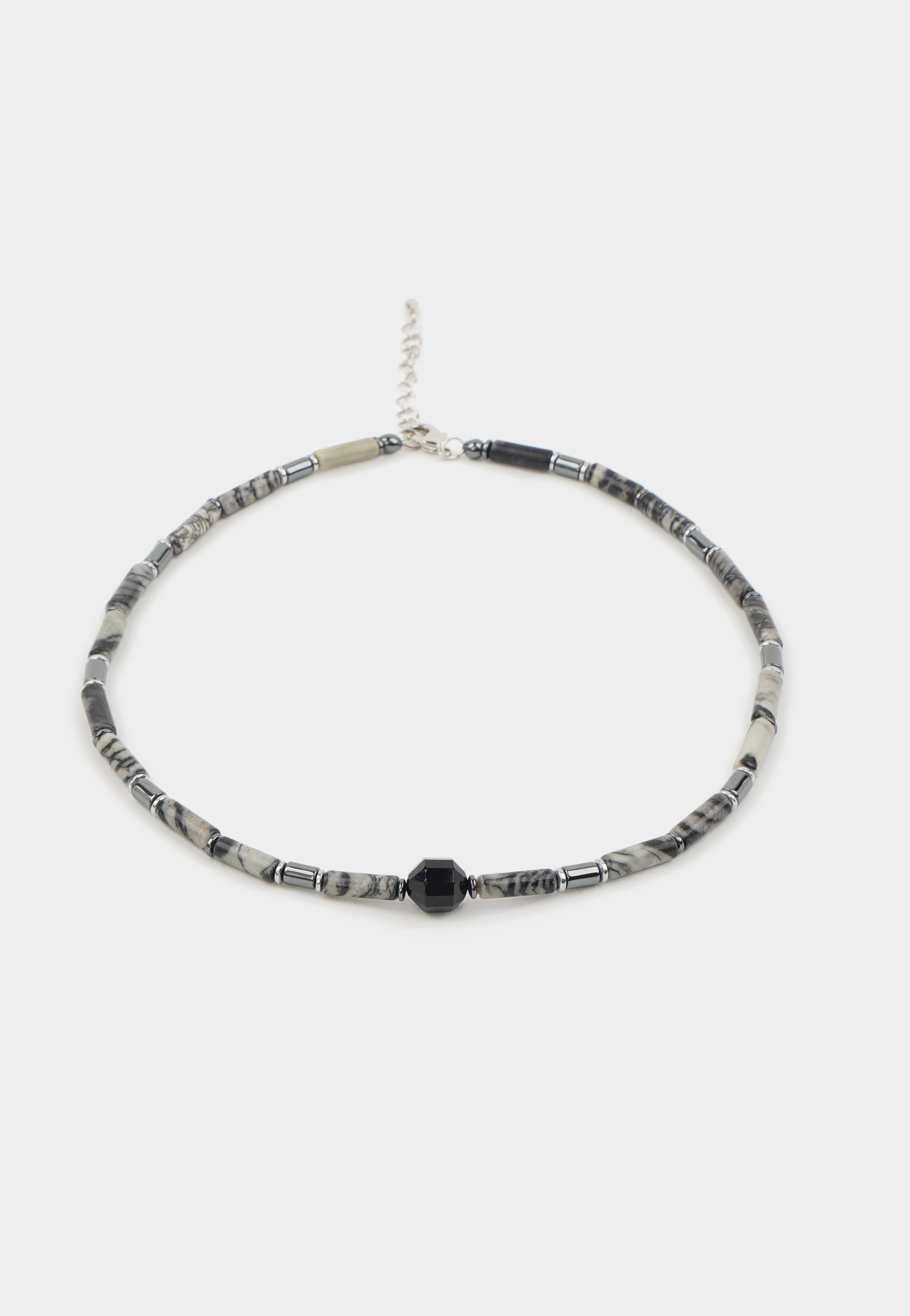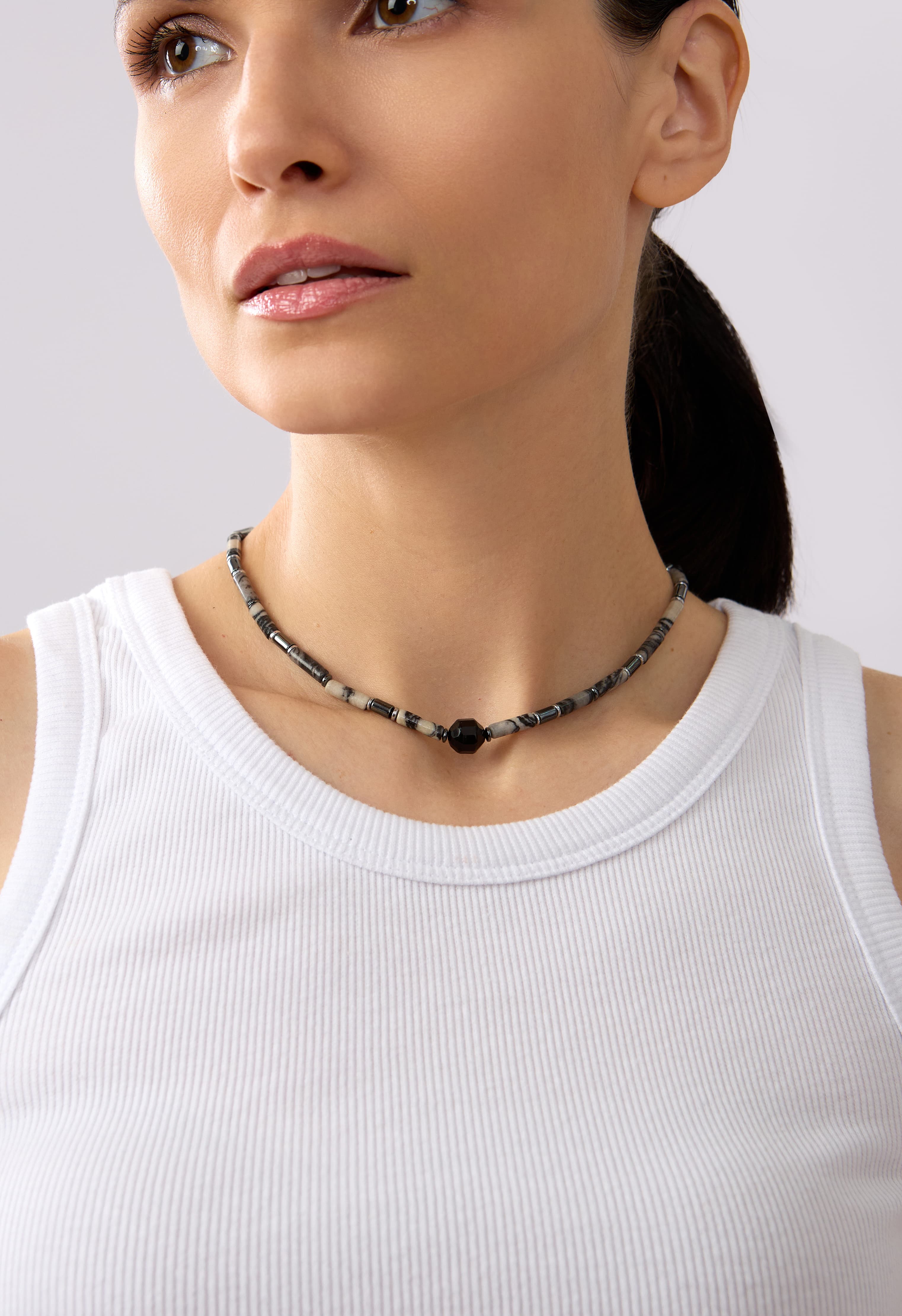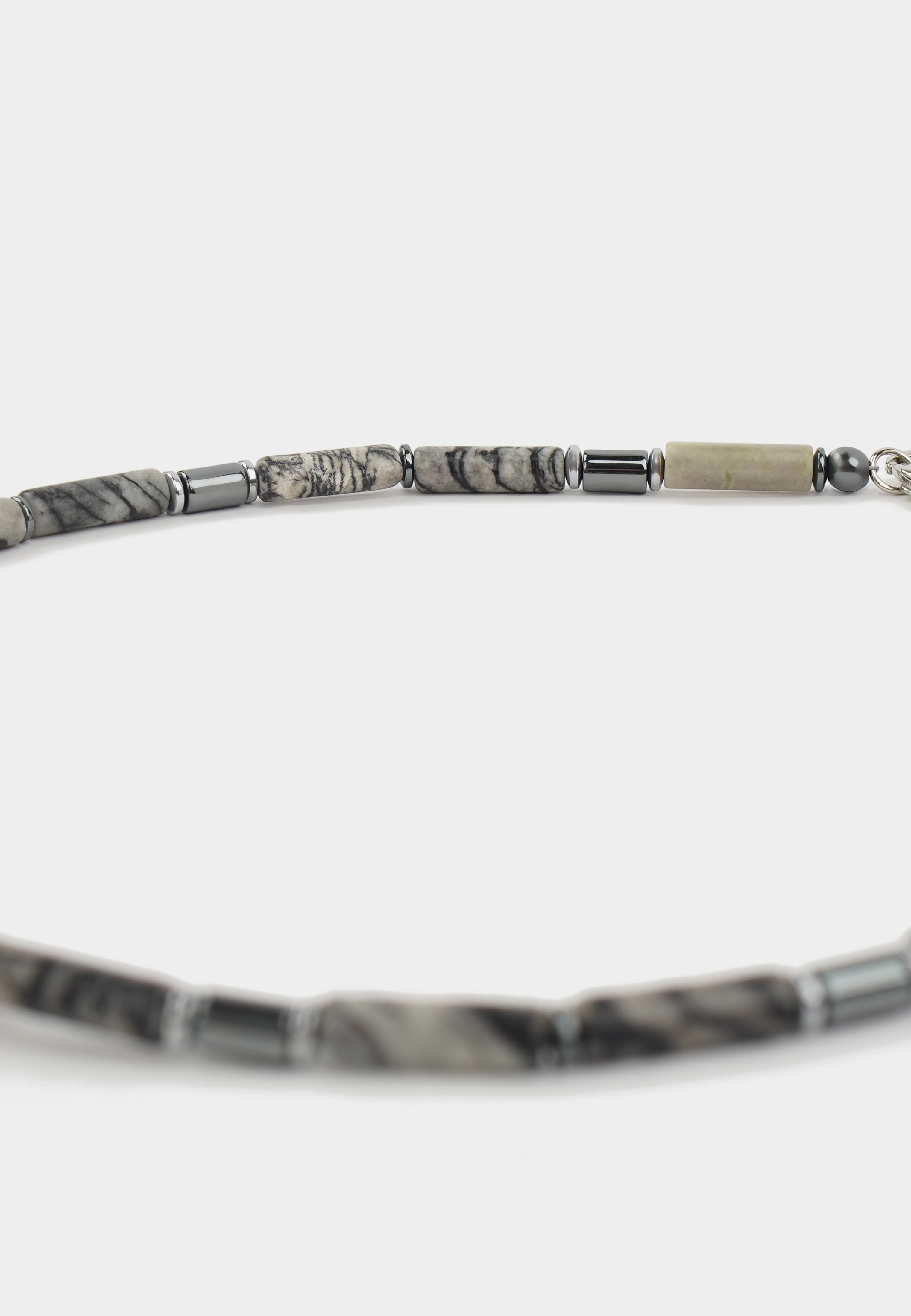 Ожерелье в благородной палитре серебристого и черного оттенков – гармония природных камней яшмы, халцедона и гематита. Лаконичное, но выразительное украшение легко дополнит как повседневный образ, так и вечерний выход. Застежка на карабине надежно фиксирует украшение, а спокойное сияние камней придает образу уверенности и характера.