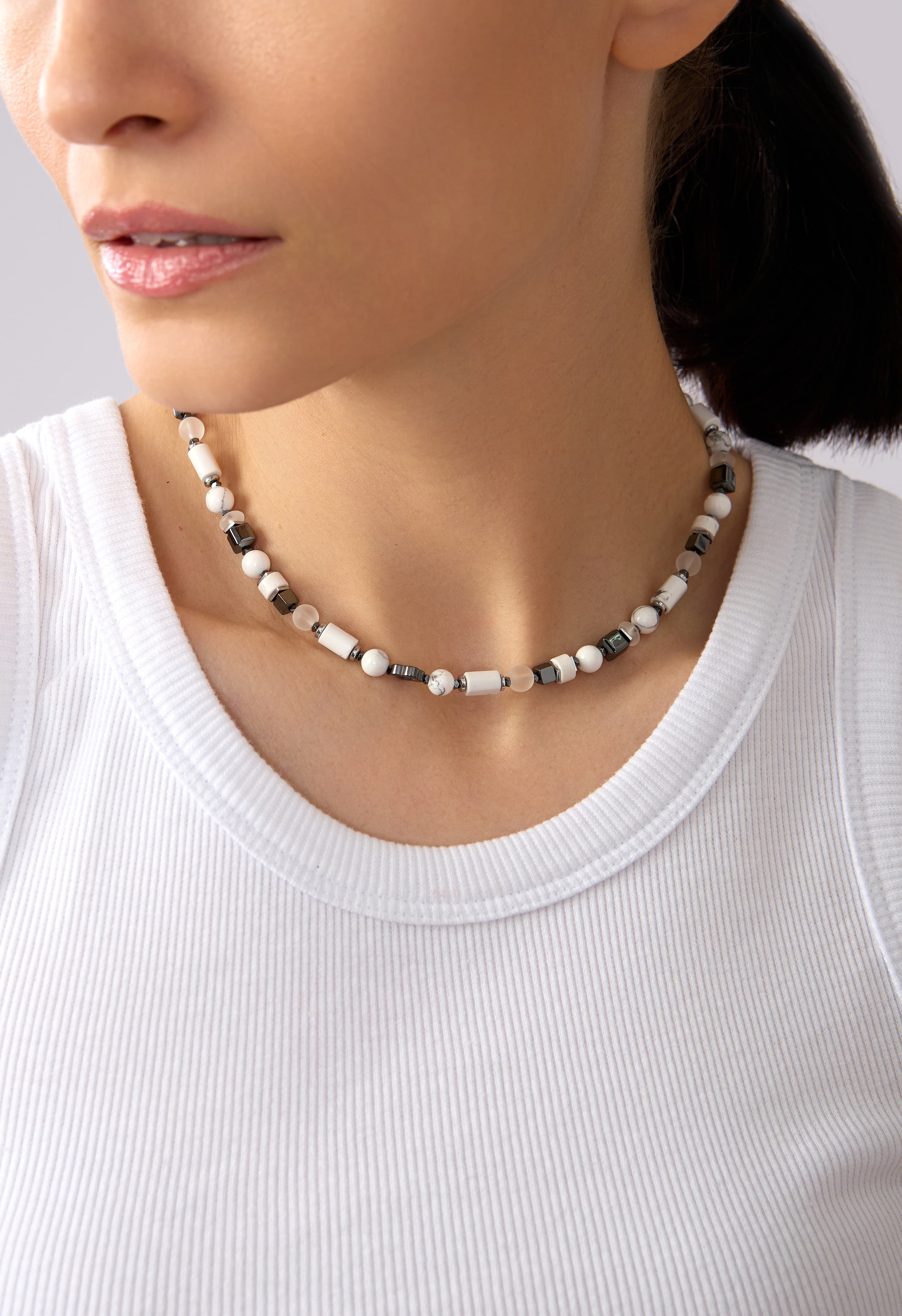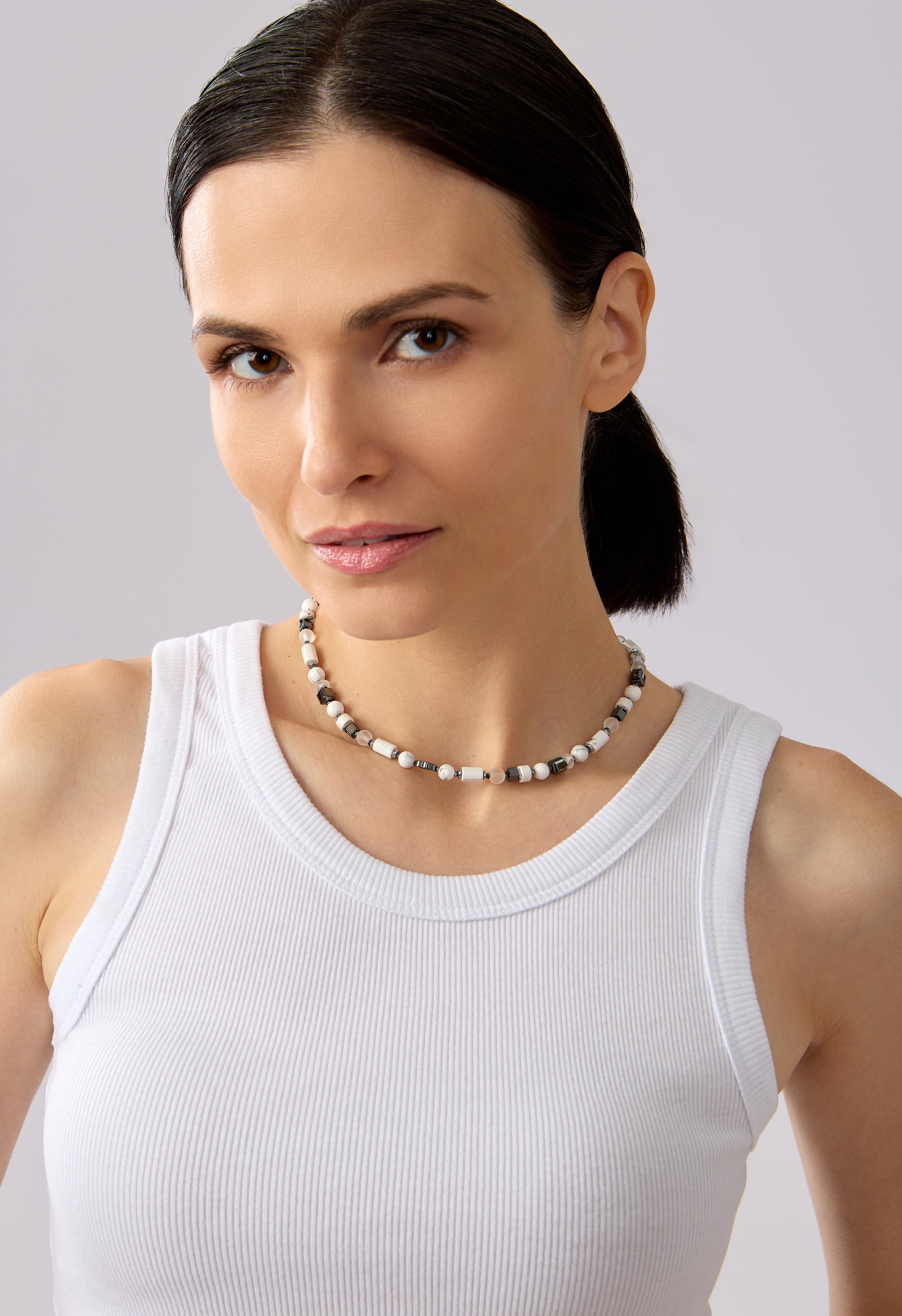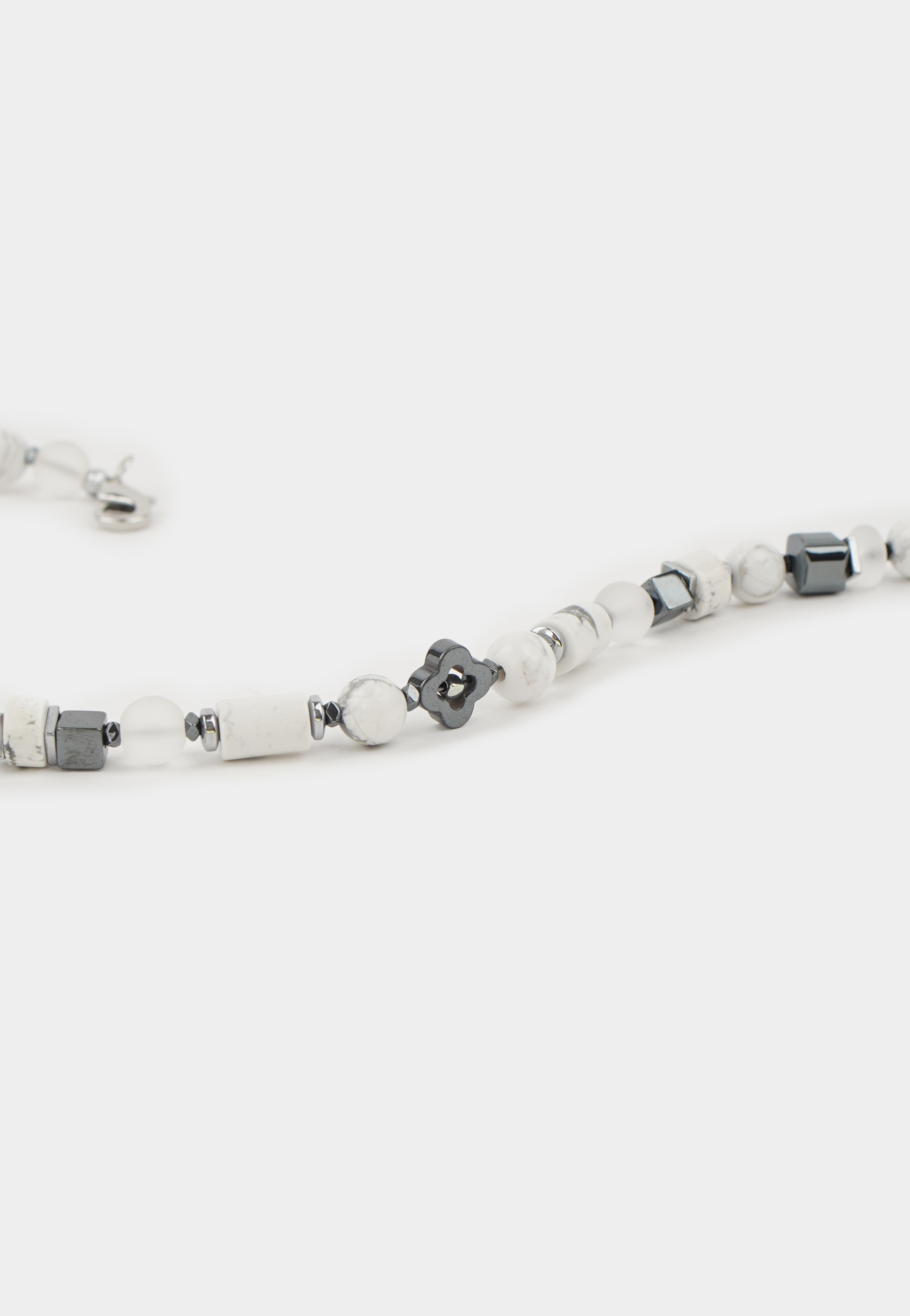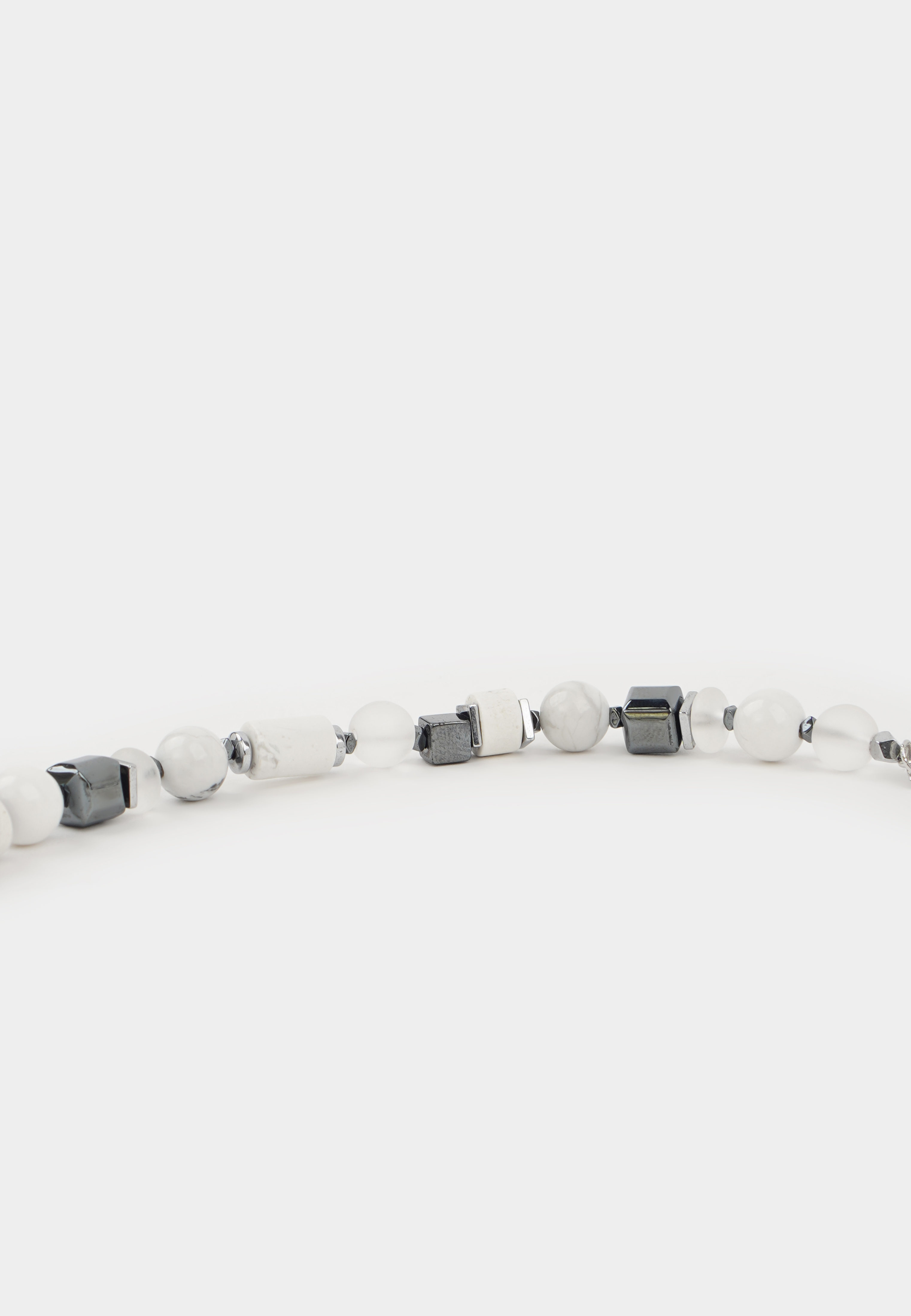 Ожерелье в бело-перламутрово-черной гамме – это гармония контрастов и природной красоты. Кахолонг, гематит и кварц создают выразительное, но ненавязчивое сочетание текстур и оттенков, которое привлекает внимание своей естественностью. Застежка на карабине обеспечивает комфортную посадку, а универсальный дизайн легко вписывается как в повседневный, так и в более нарядный образ.