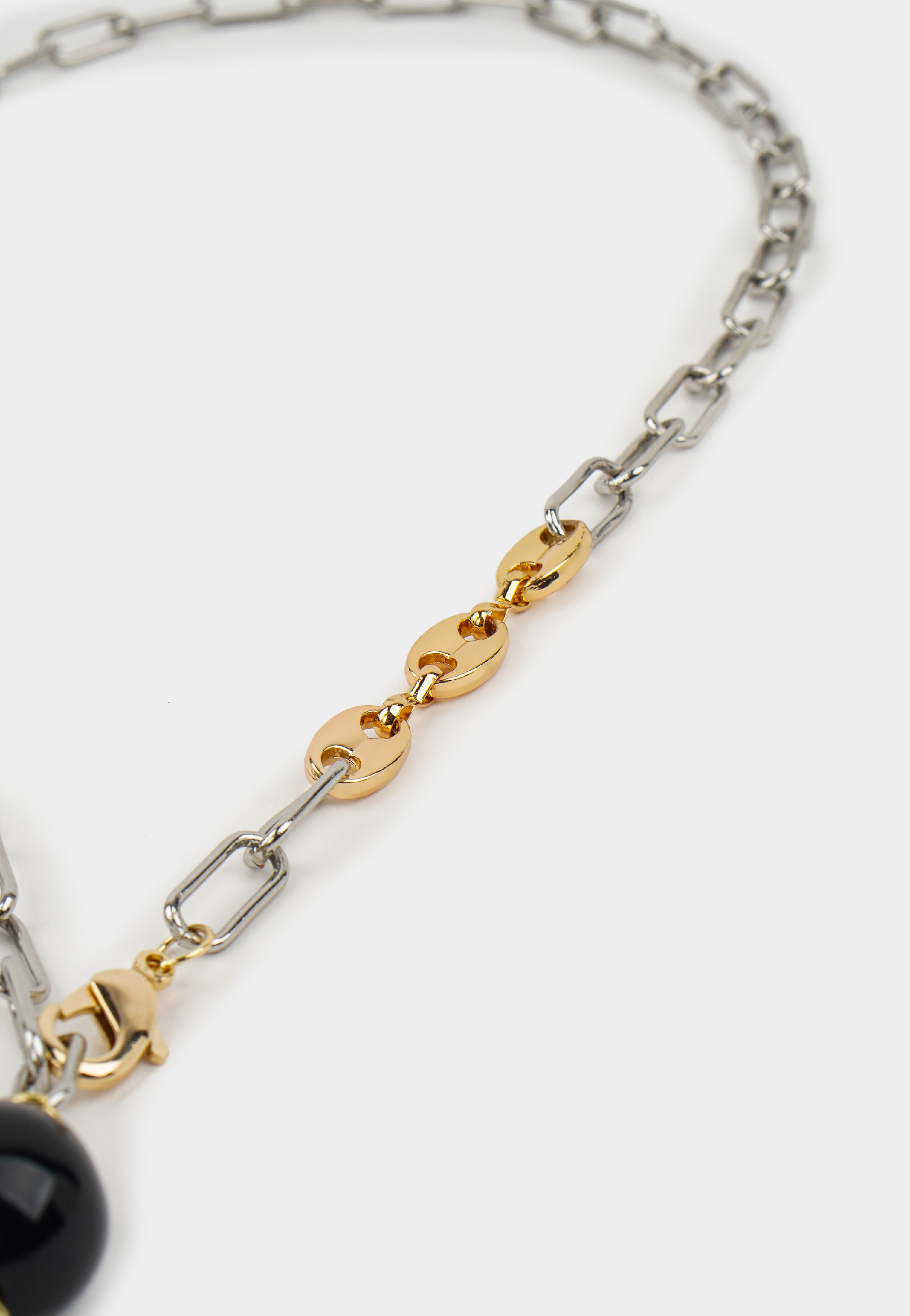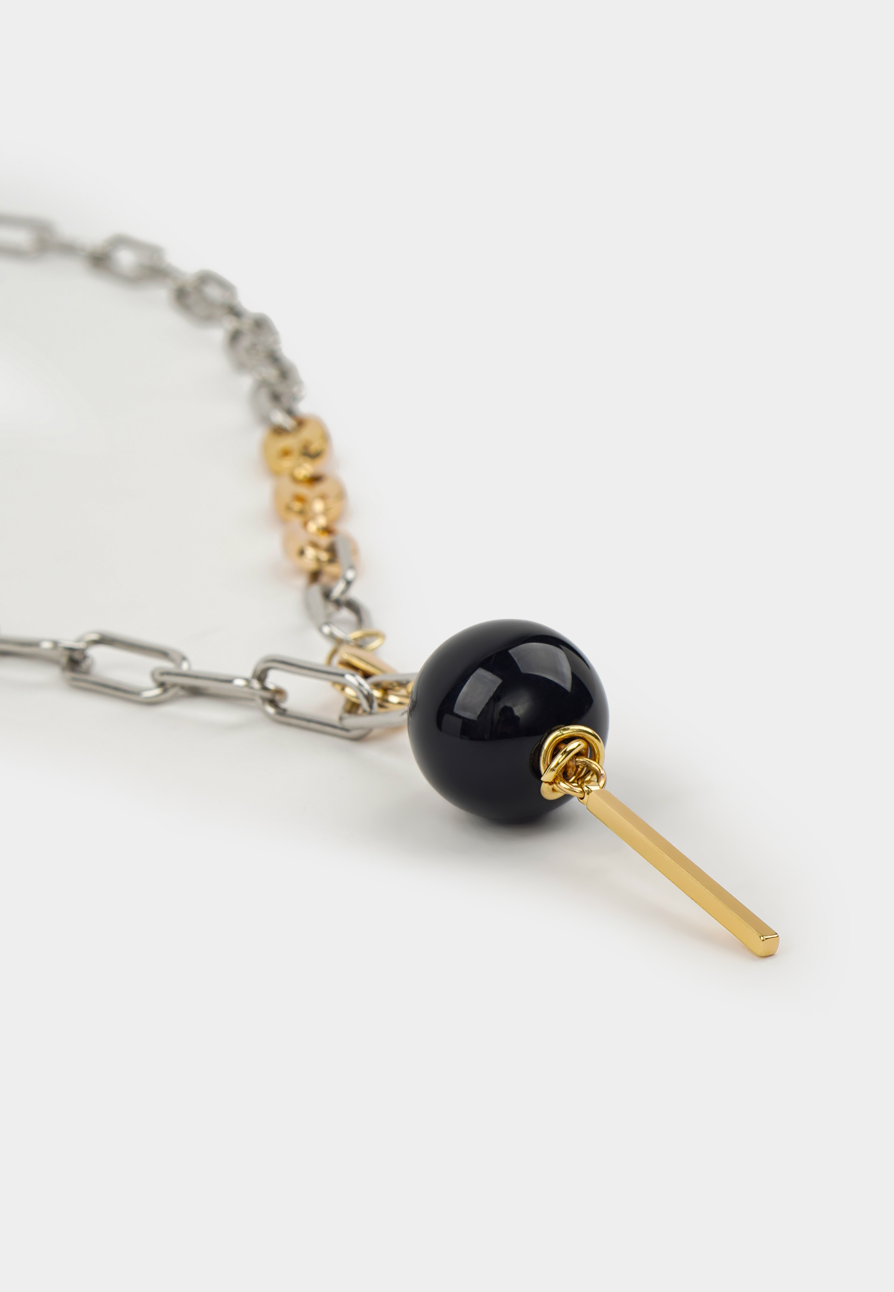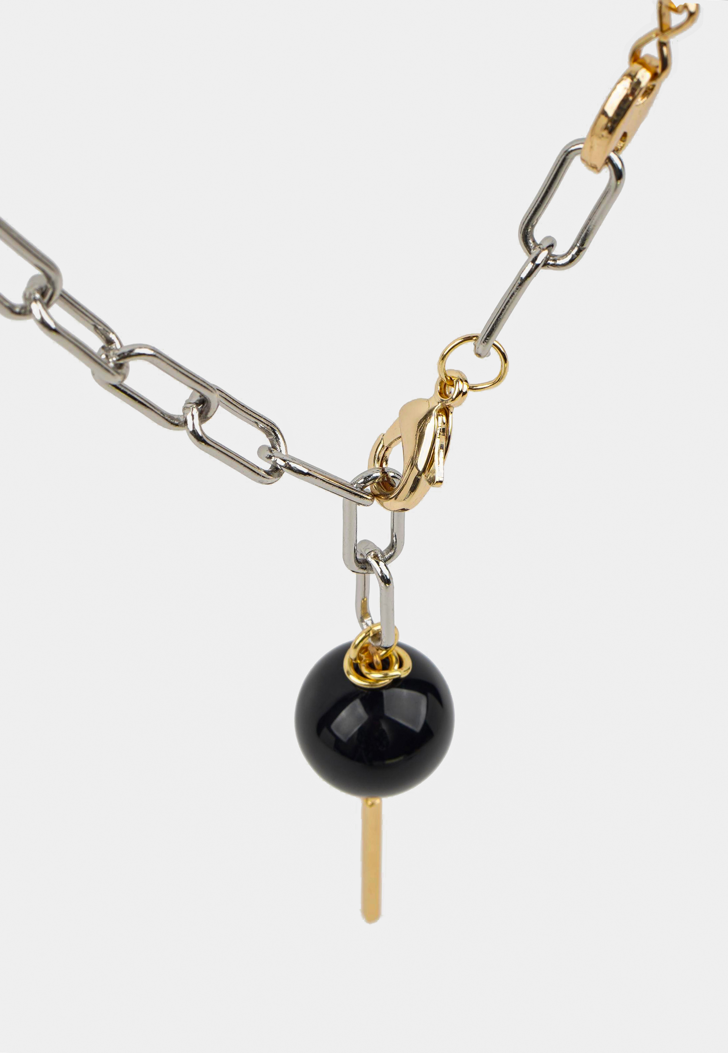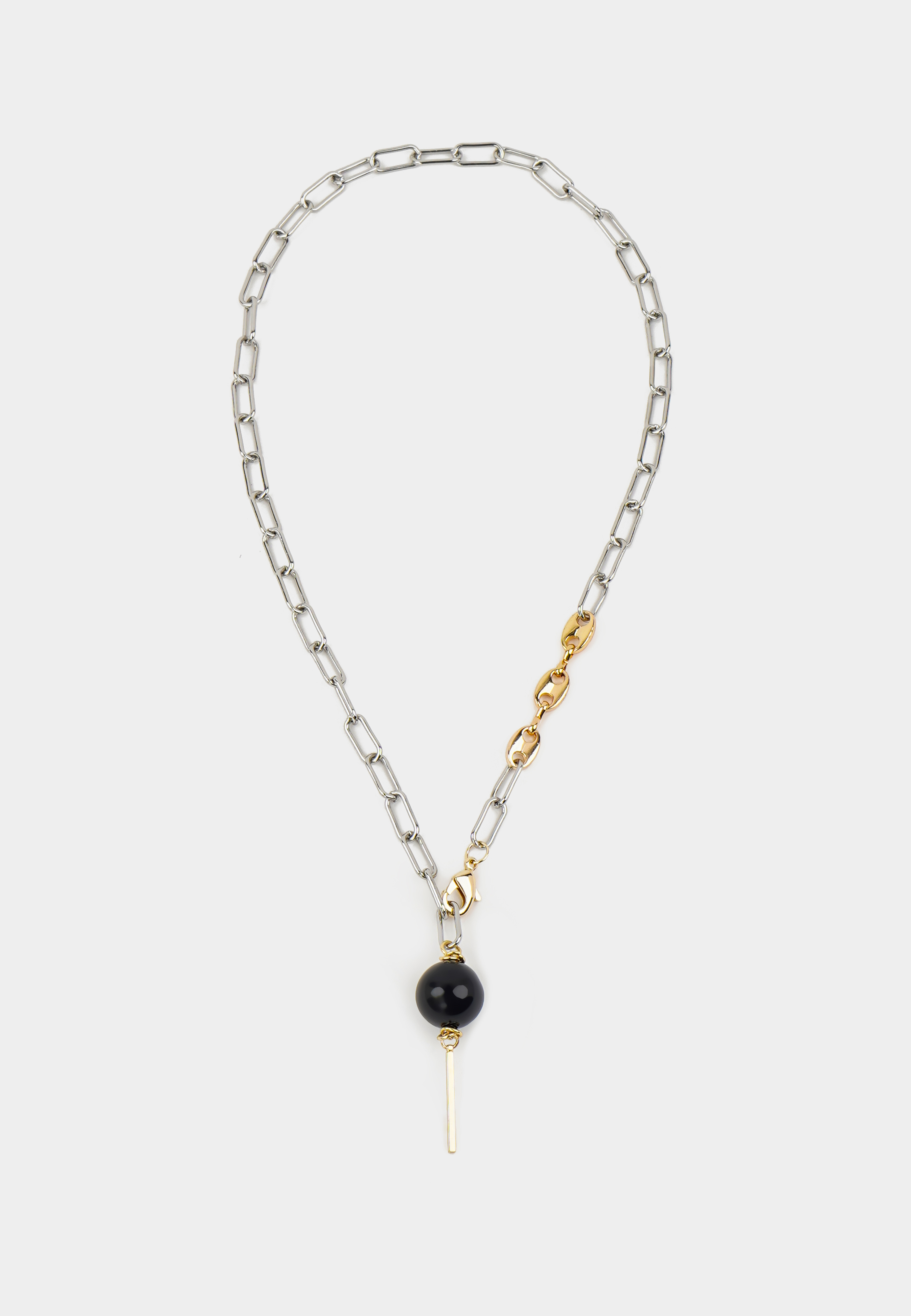 Контрастное ожерелье в серебристо-золотисто-черной палитре станет акцентной деталью вашего образа. Натуральный агат придает украшению глубину и насыщенность, а застежка на карабине делает его удобным в повседневной носке. Украшение легко сочетается с базовым гардеробом и добавляет образу благородства без излишней вычурности.