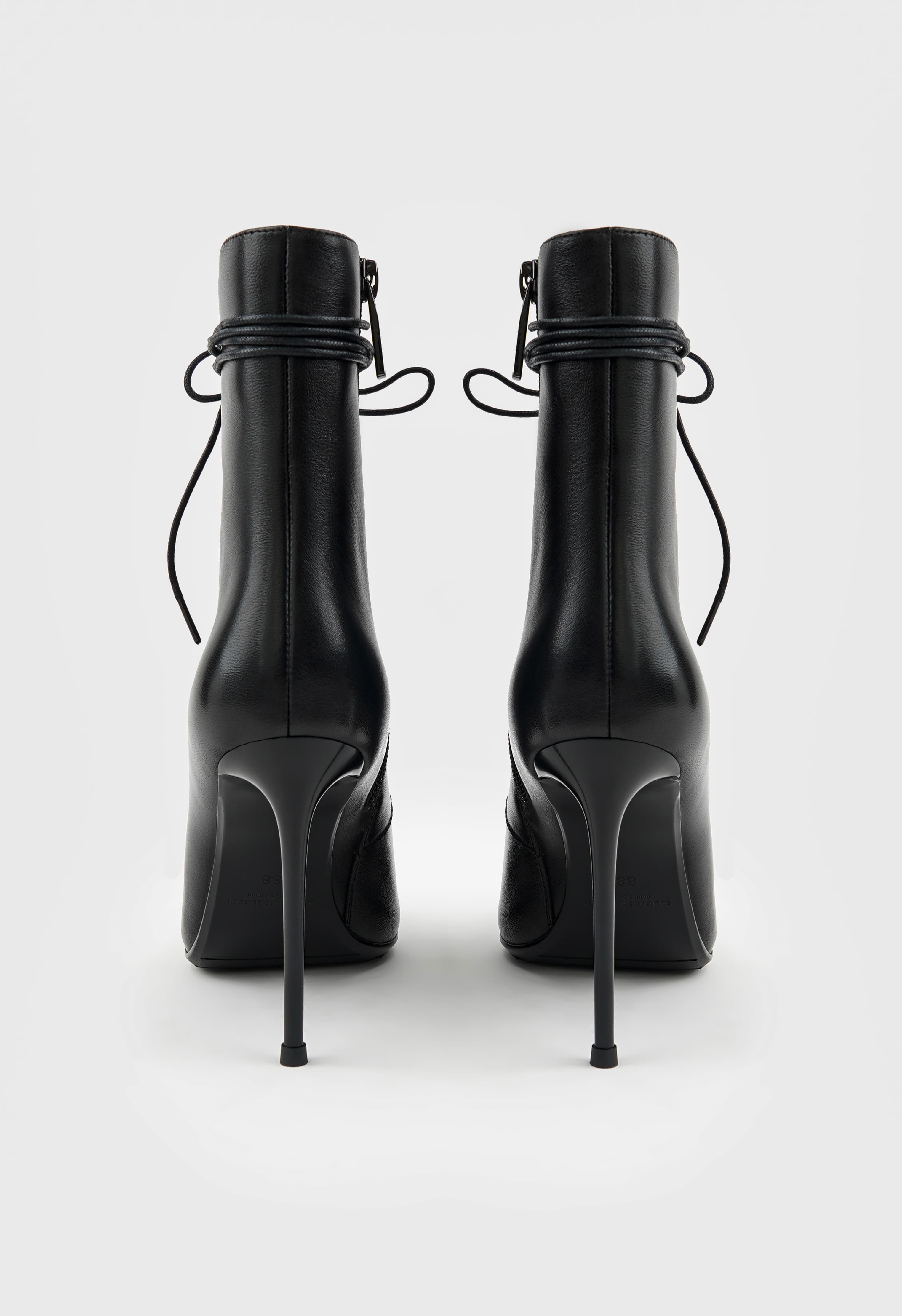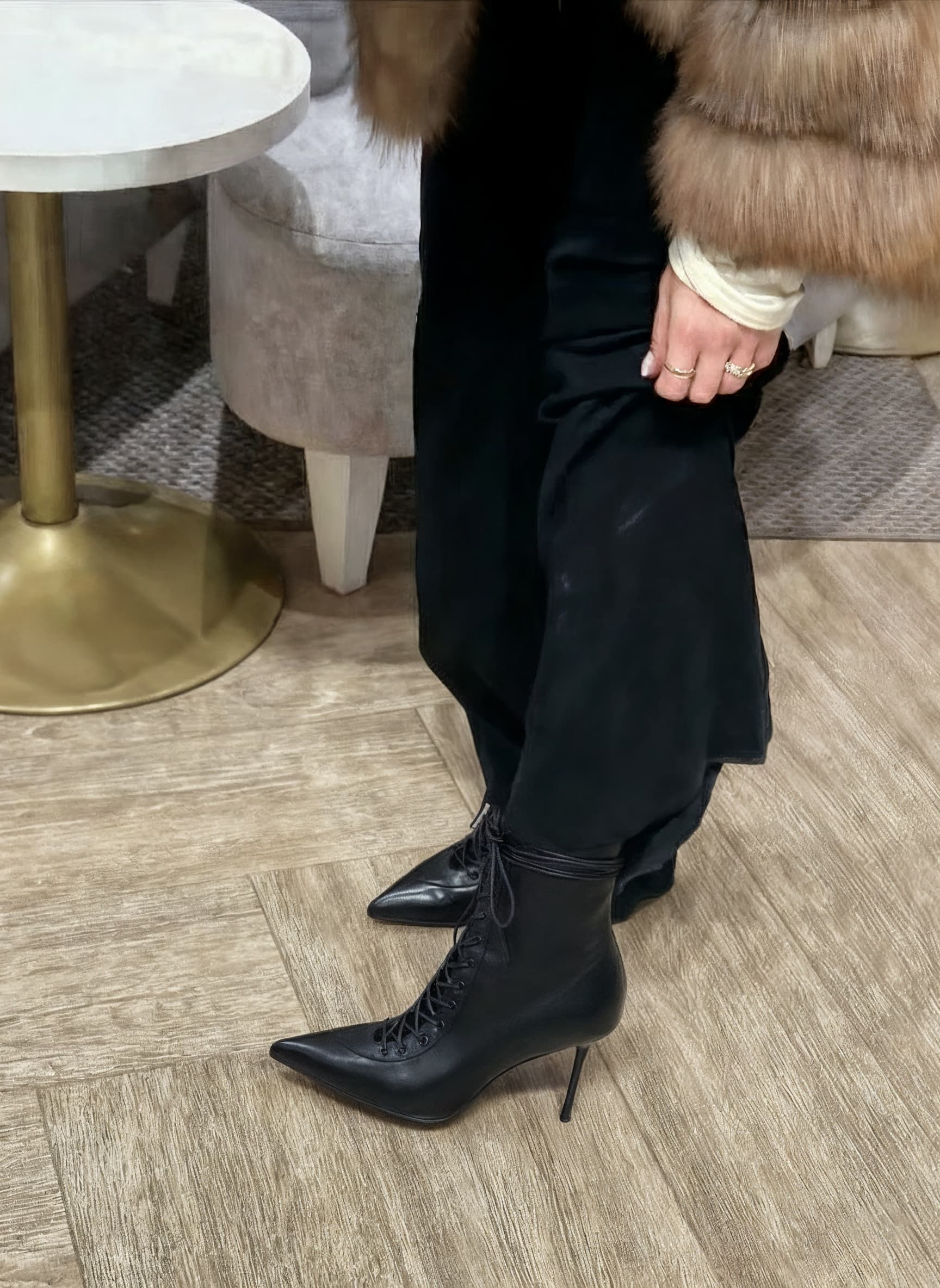 Дерзкие ботильоны из натуральной кожи с мягкой байкой внутри – смелое сочетание комфорта и яркого стиля. Черный цвет мгновенно притягивает взгляды, а заостренный мысок и изящная шпилька подчеркивают женственность и уверенность в себе. Гибкая подошва дарит легкость движений, в то время как удобная комбинация шнуровки и молнии обеспечивает идеальную посадку. Черная и металлическая фурнитура добавляют утонченного блеска, делая пару гармоничным акцентом в образе.
