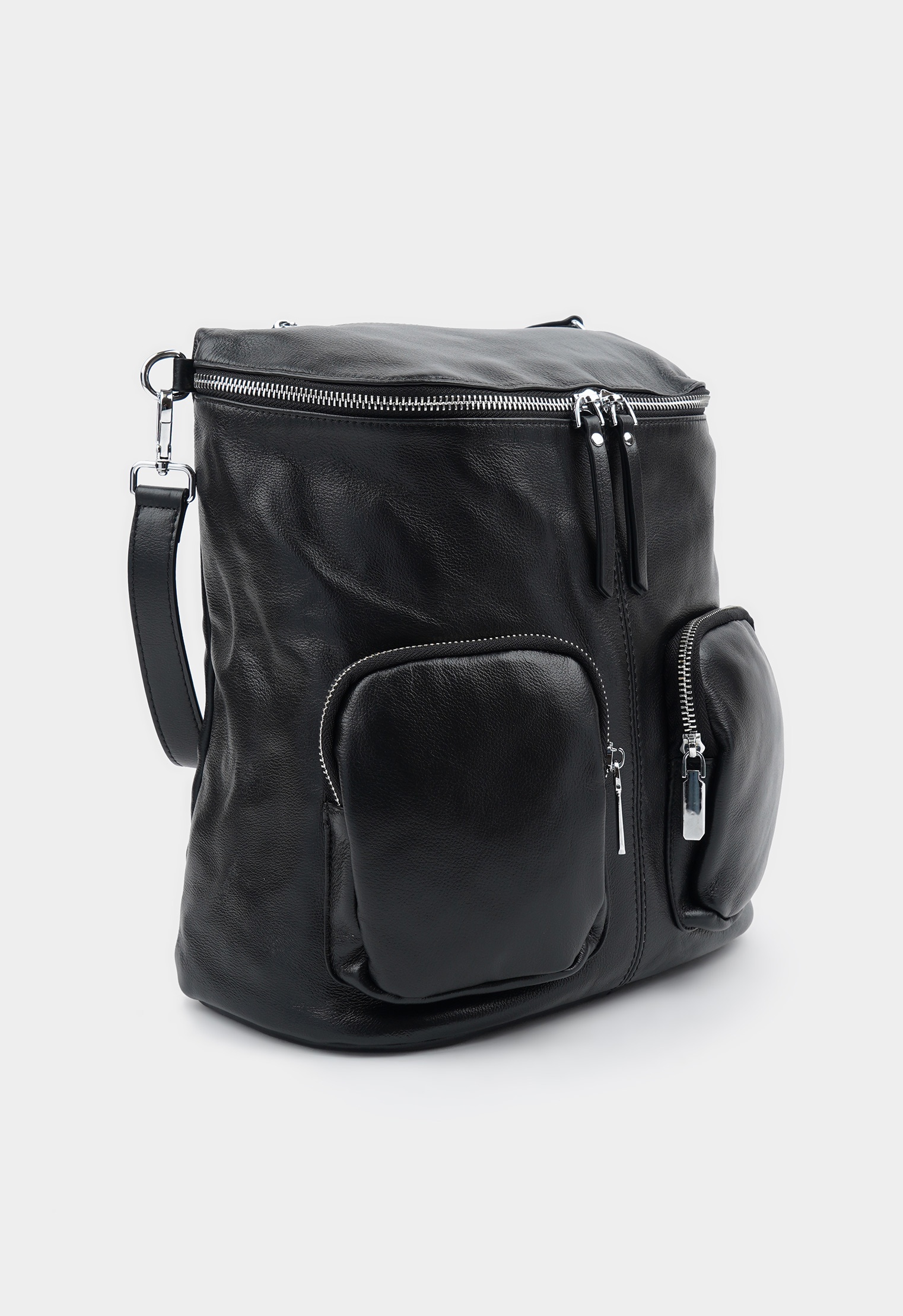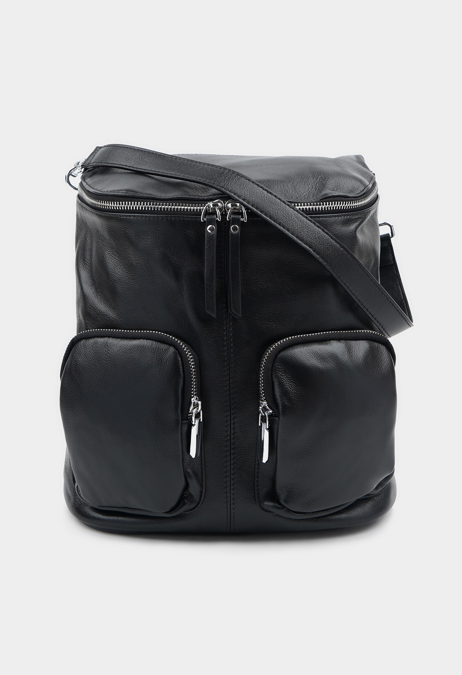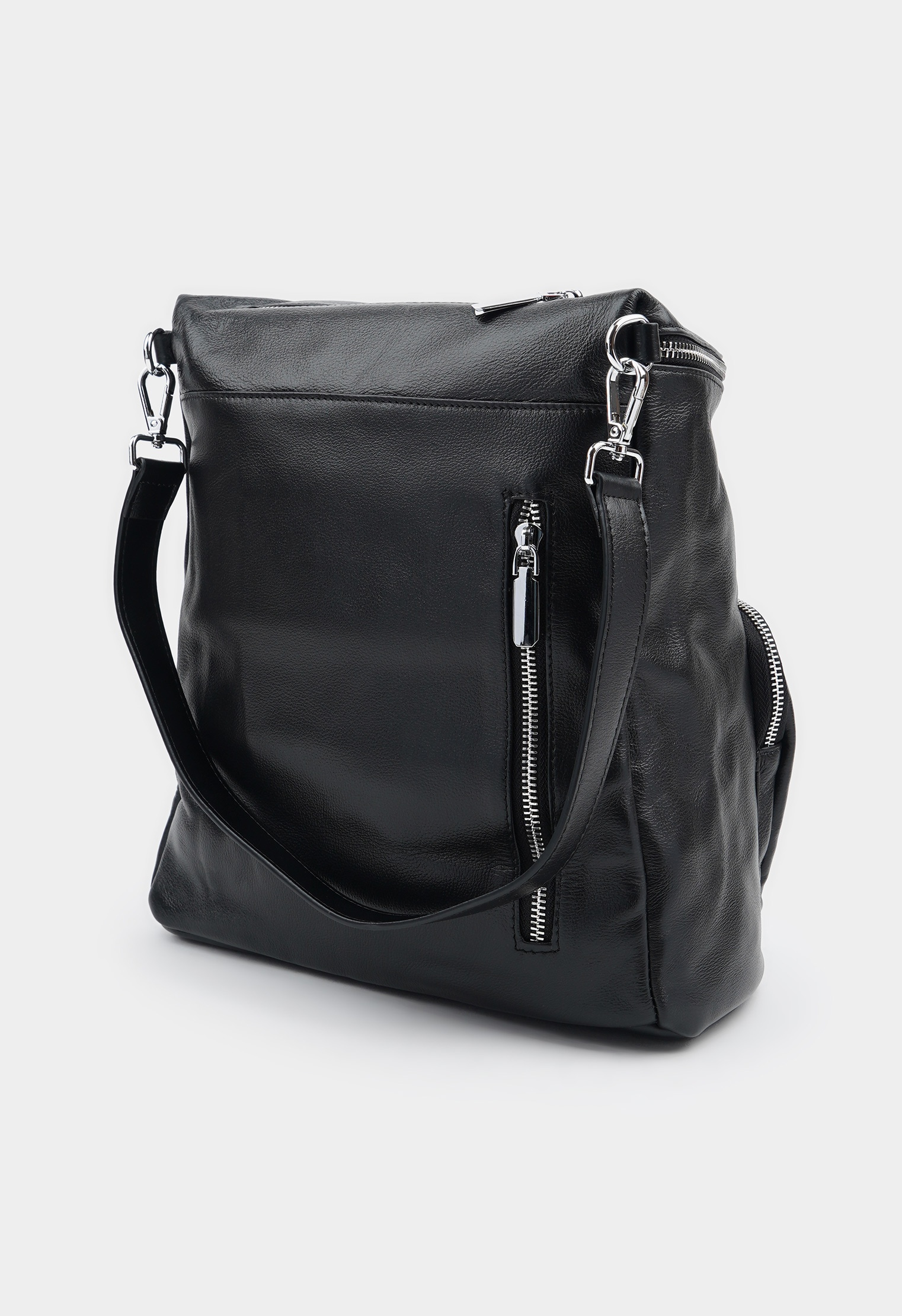 Стильная сумка из новой коллекции изготовлена из натуральной кожи и представлена в черном цвете. Изделие закрывается на молнию и имеет три внутренних отделения и четыре внешних кармана. В комплект входит съемный плечевой ремень с регулировкой длины. Вместительная модель удачно впишется в базовый гардероб и останется актуальной не один сезон.