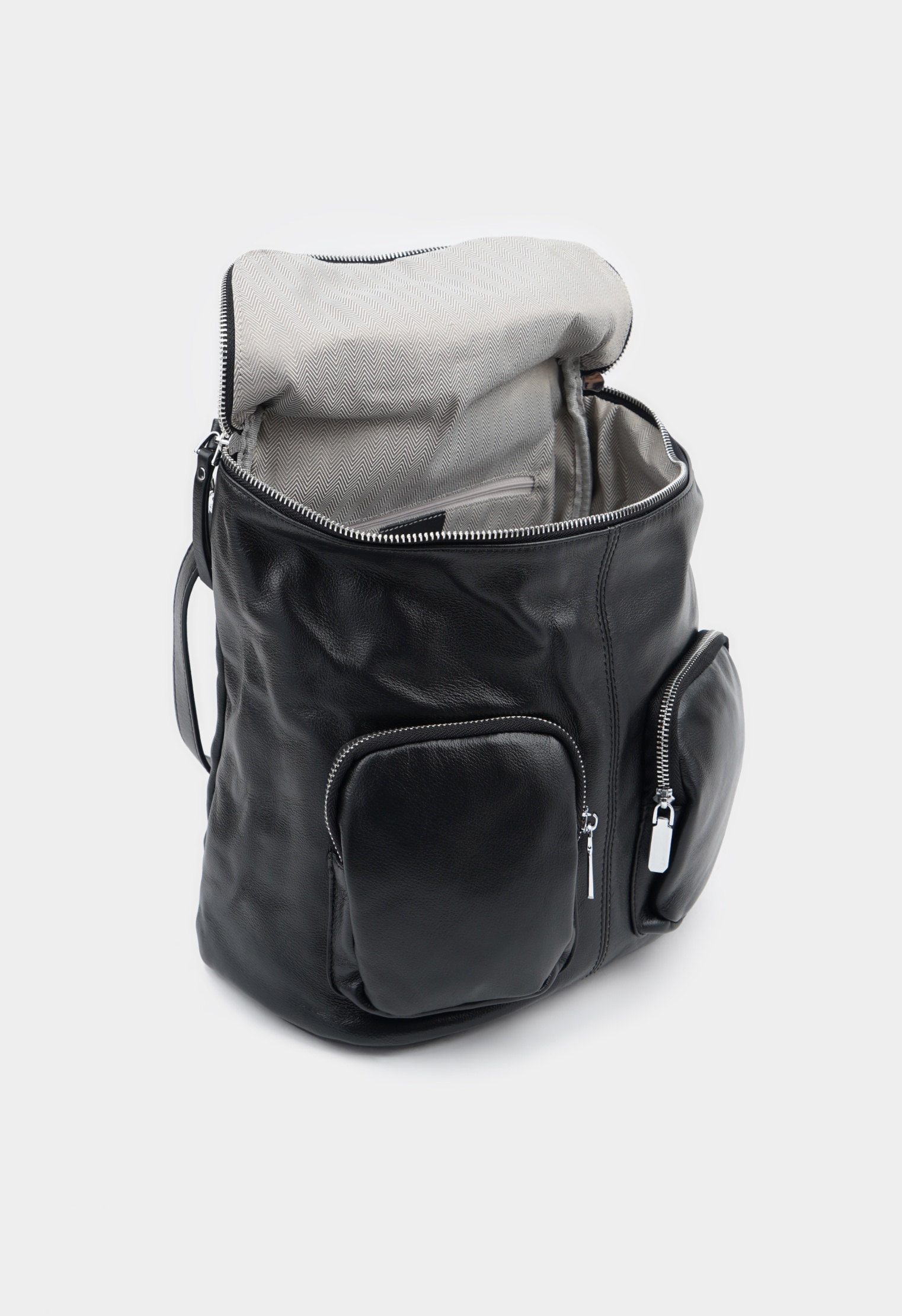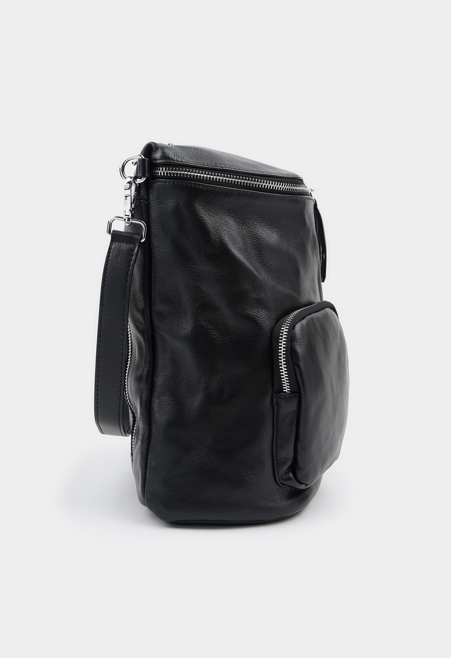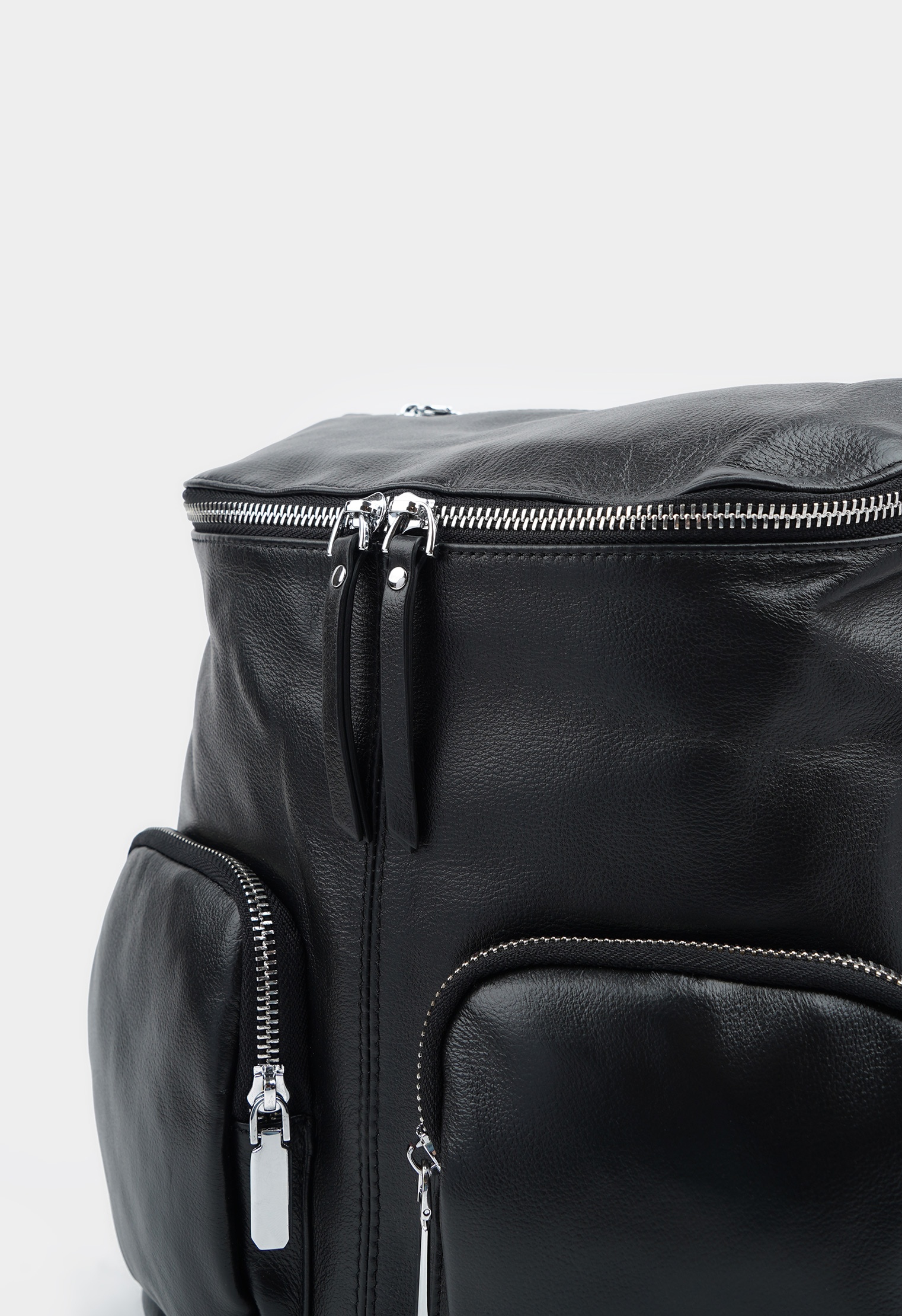 Стильная сумка из новой коллекции изготовлена из натуральной кожи и представлена в черном цвете. Изделие закрывается на молнию и имеет три внутренних отделения и четыре внешних кармана. В комплект входит съемный плечевой ремень с регулировкой длины. Вместительная модель удачно впишется в базовый гардероб и останется актуальной не один сезон.