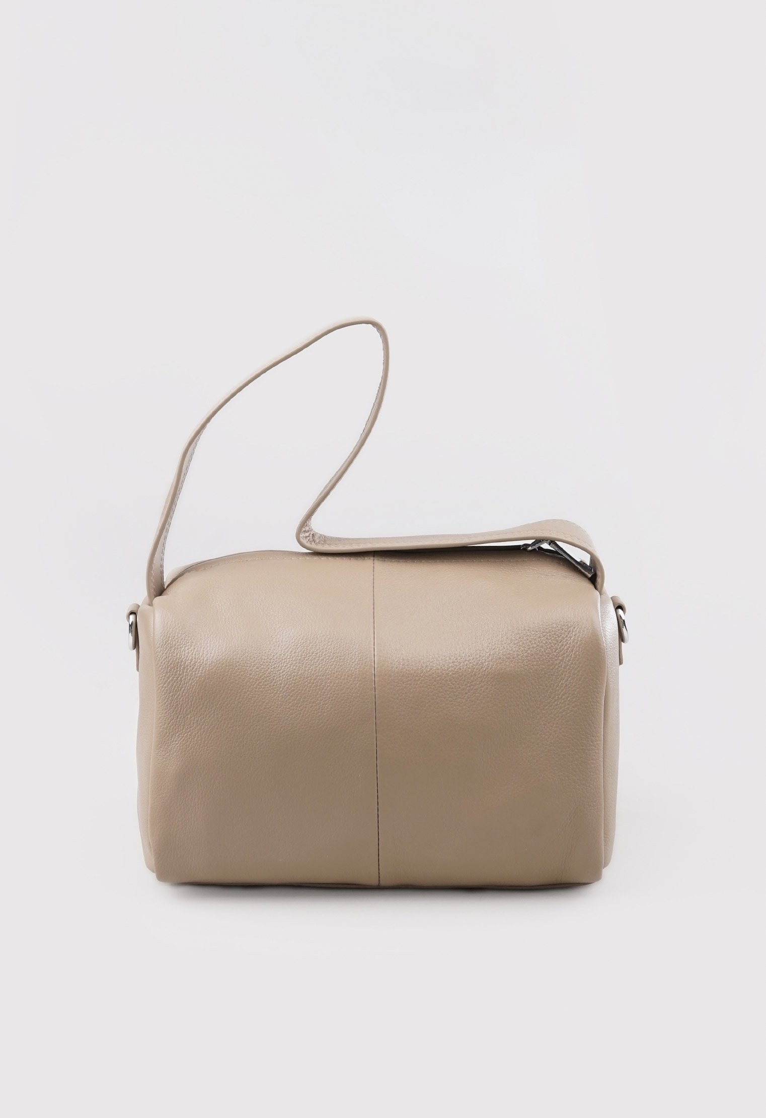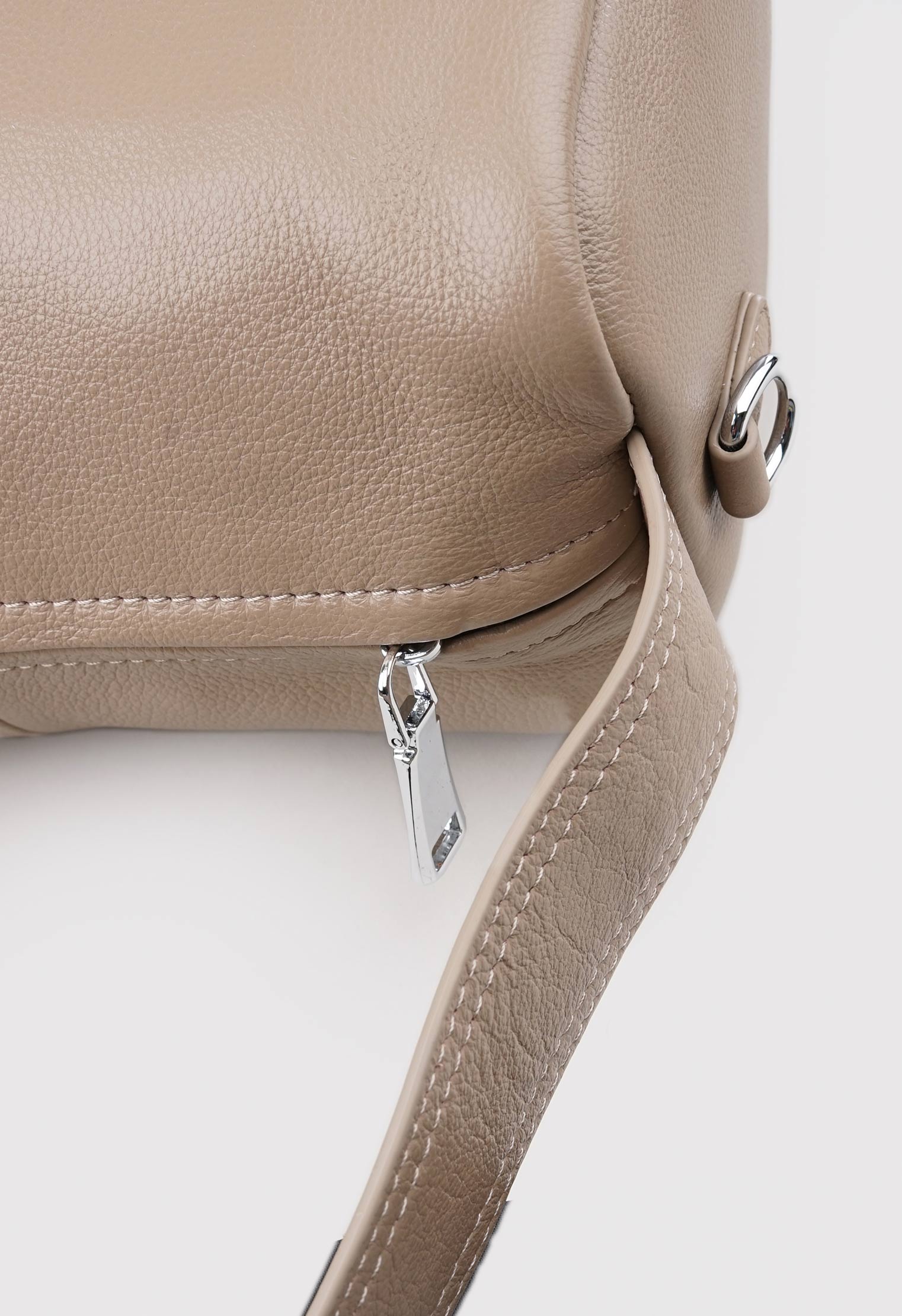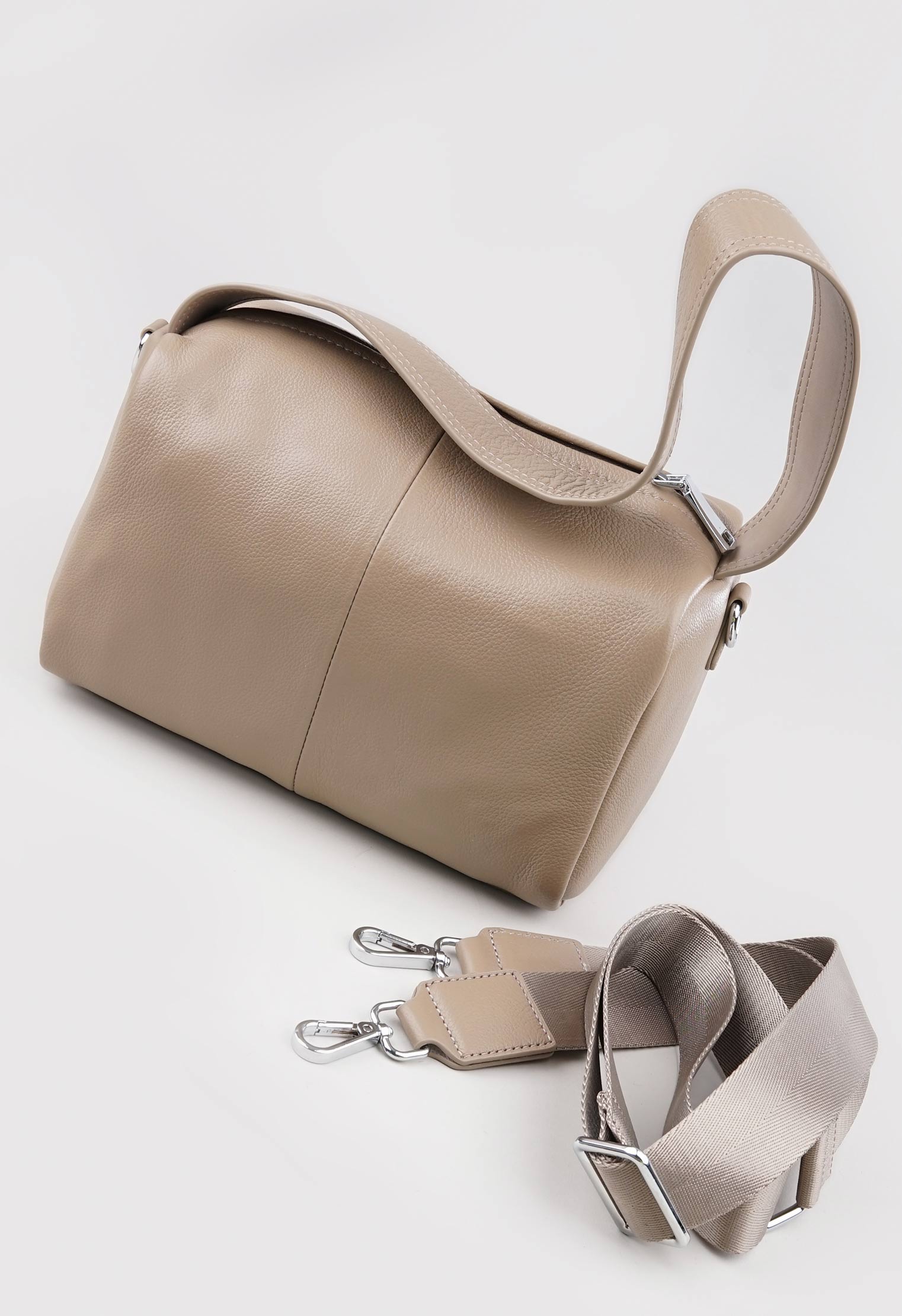 Вместительная сумка из новой коллекции изготовлена из натуральной кожи и представлена в трендовом оттенке хаки. Изделие дополнено стильной моноручкой, в комплект входит съёмный плечевой ремень на карабинах. Основное отделение застёгивается на молнию и имеет два внутренних кармана. Объёмная модель превосходно впишется в модный повседневный образ.
