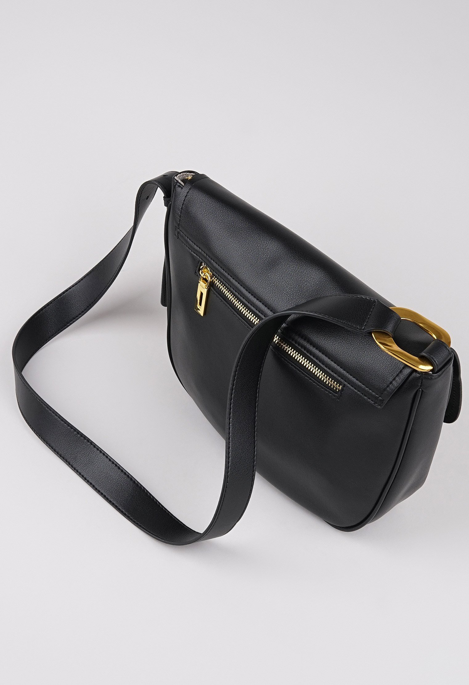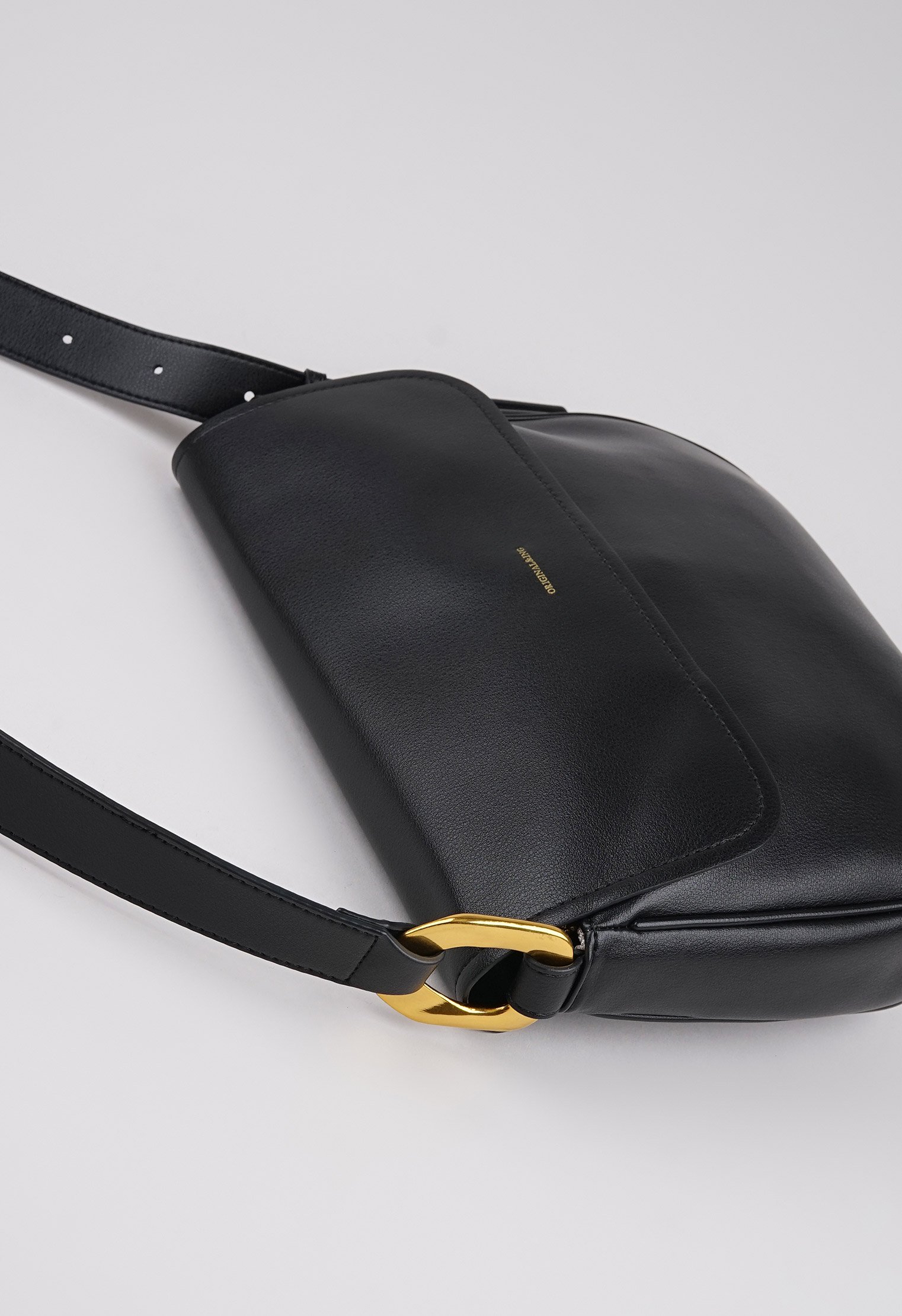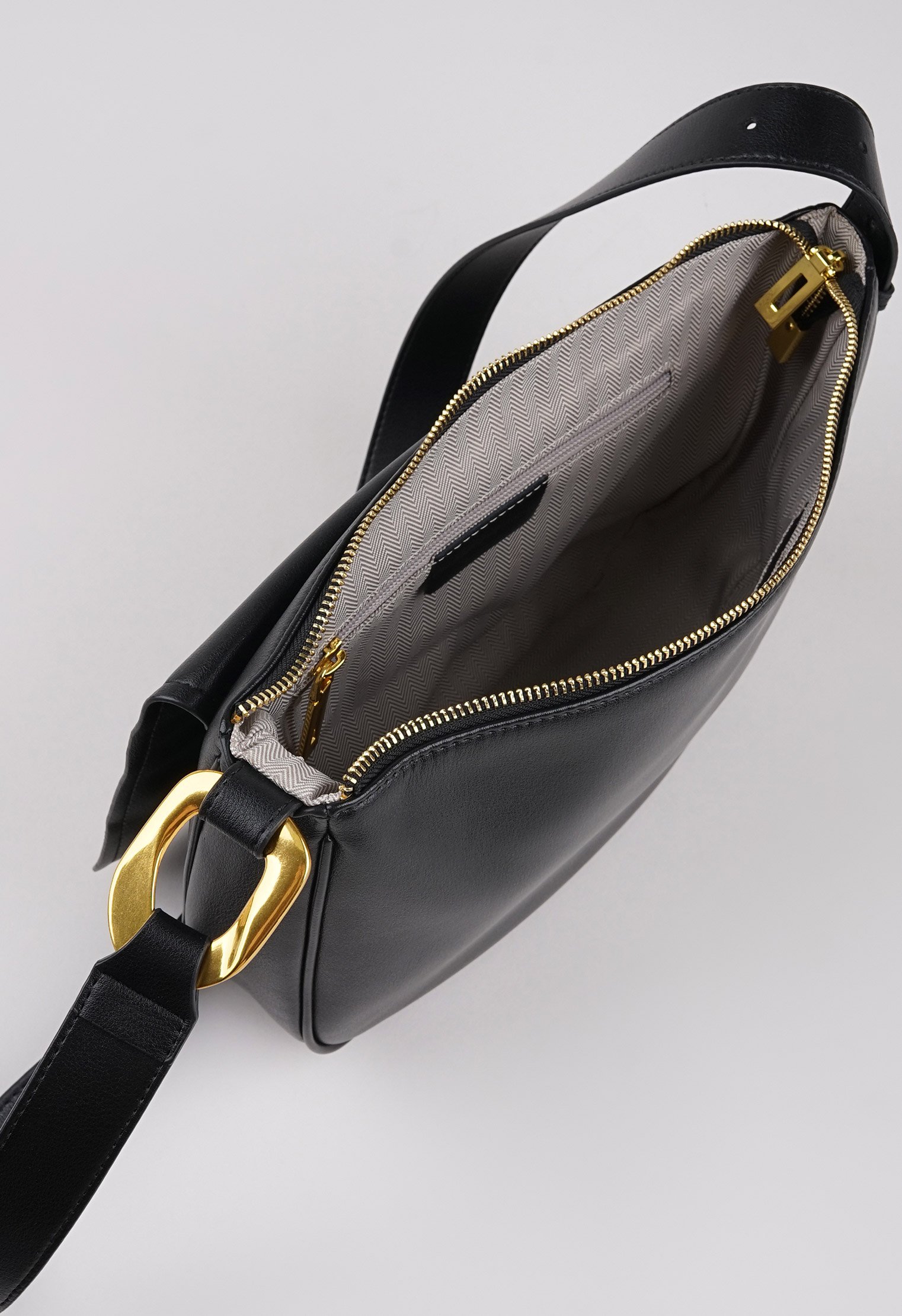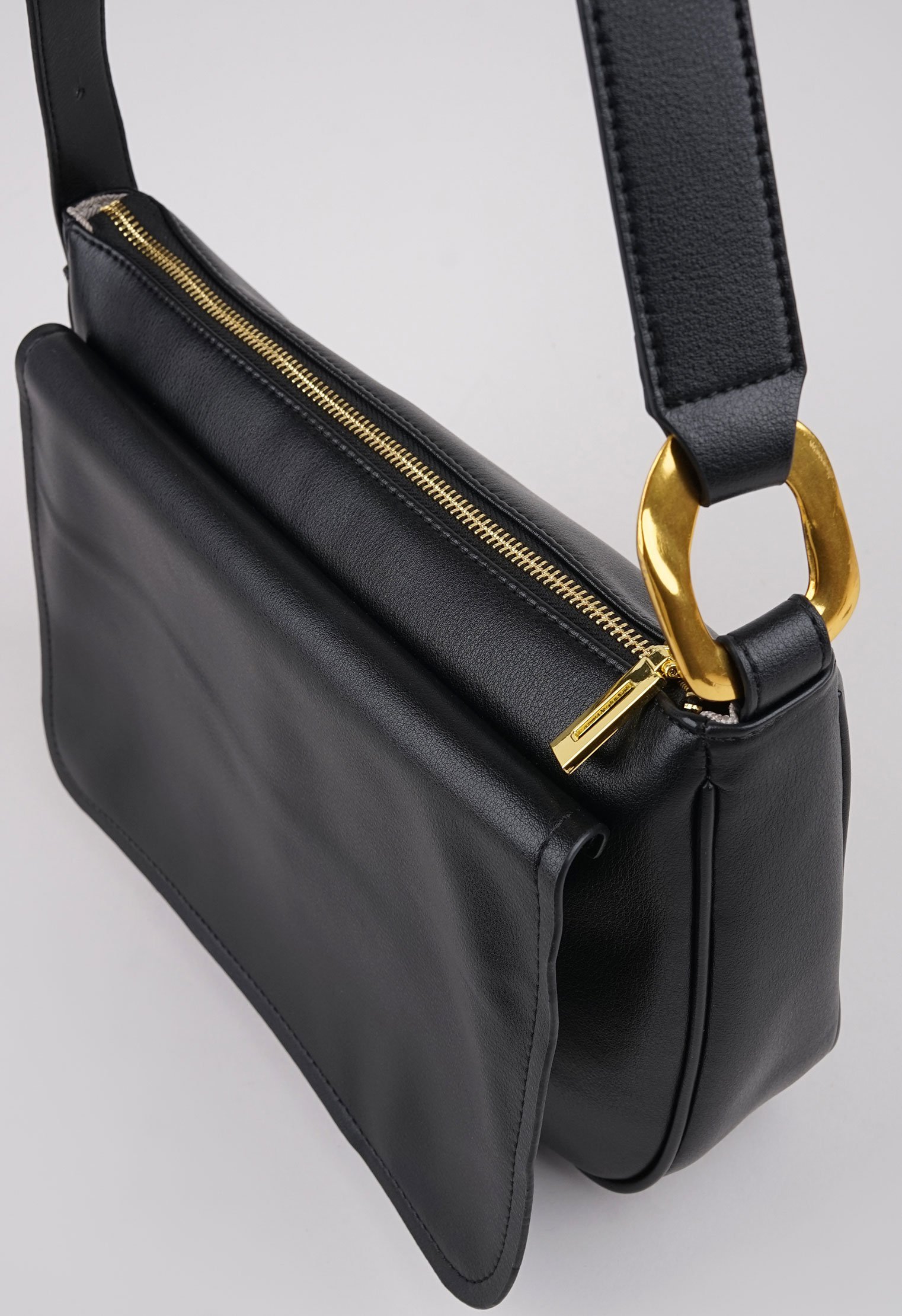 Сумка из новой коллекции изготовлена из натуральной кожи и декорирована золотистой фурнитурой. Изделие дополнено двумя внутренними карманами и одним карманом на молнии с внешней стороны. Ремень с регулировкой длины позволяет носить аксессуар в руке и на плече. Актуальная модель идеально впишется как в яркий гардероб, так и в монохромный наряд.