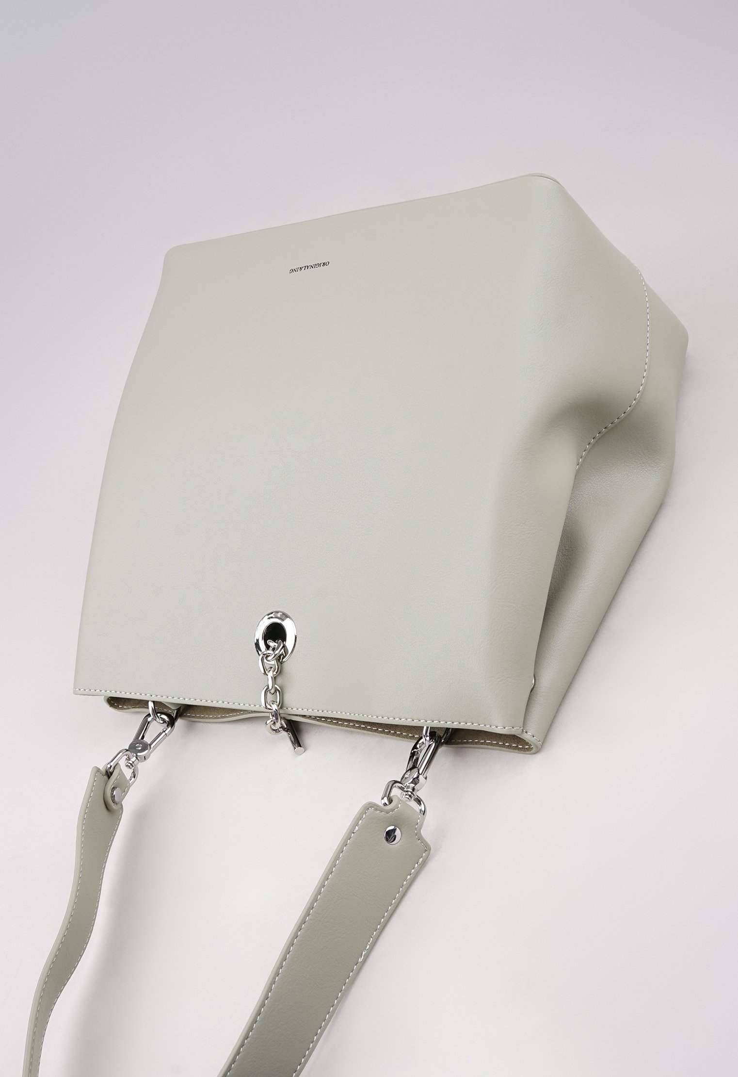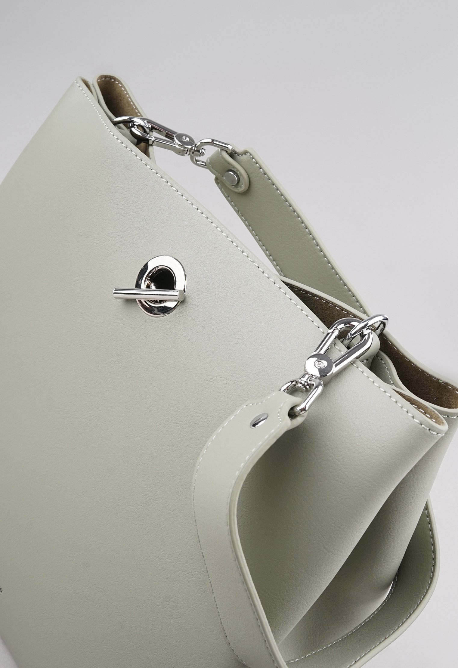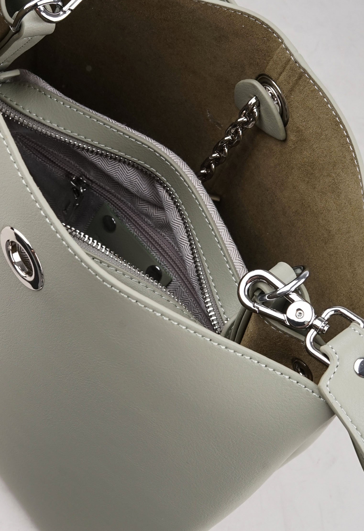 Из минусов - ремень не длинный и второй тоже не регулируется, но в целом привыкнуть можно. Внутри нет отделений только тканевая внутренняя сумочка на молнии, в ней карман тоже на молнии. Размер кажется прям большим, но по факту не так много помещается в нее. Цвет приятный серо-зеленоватый с оттенком. В руках смотрится миниатюрно. Цена средняя как в других магазинах.