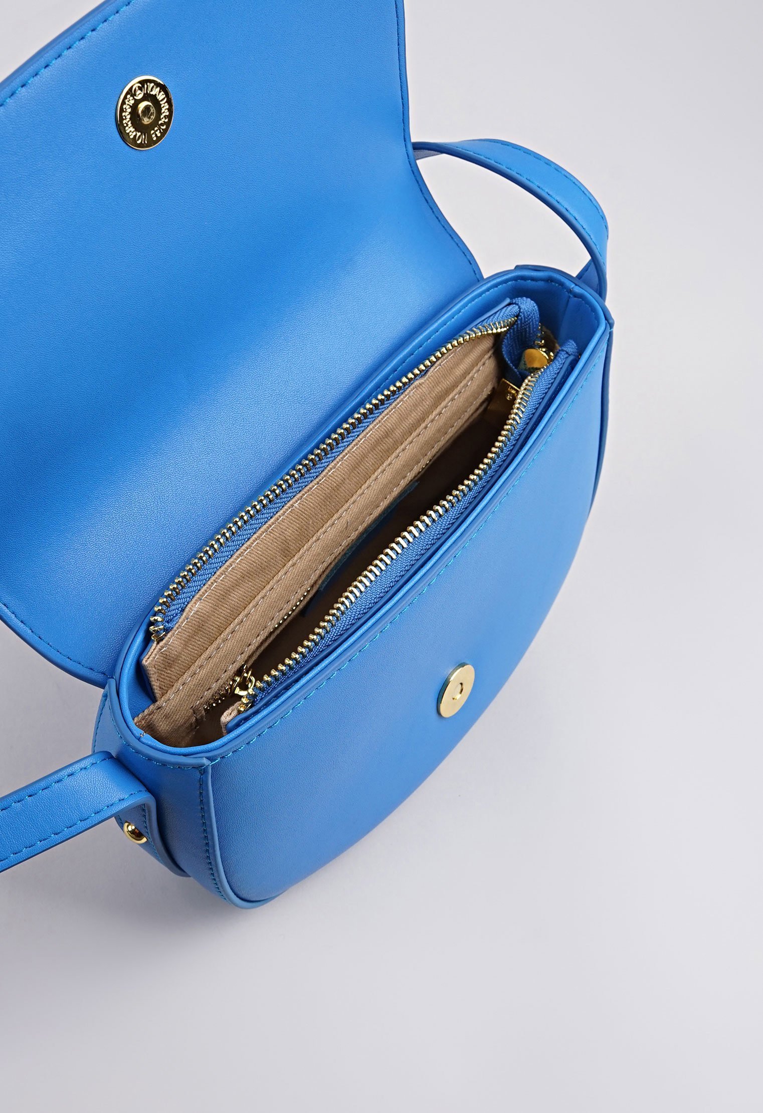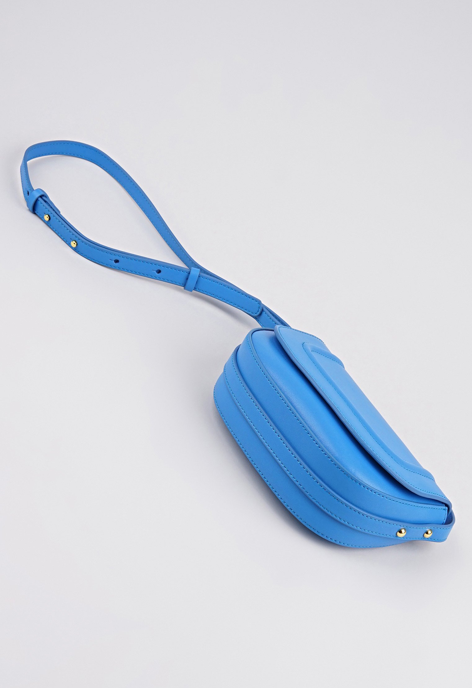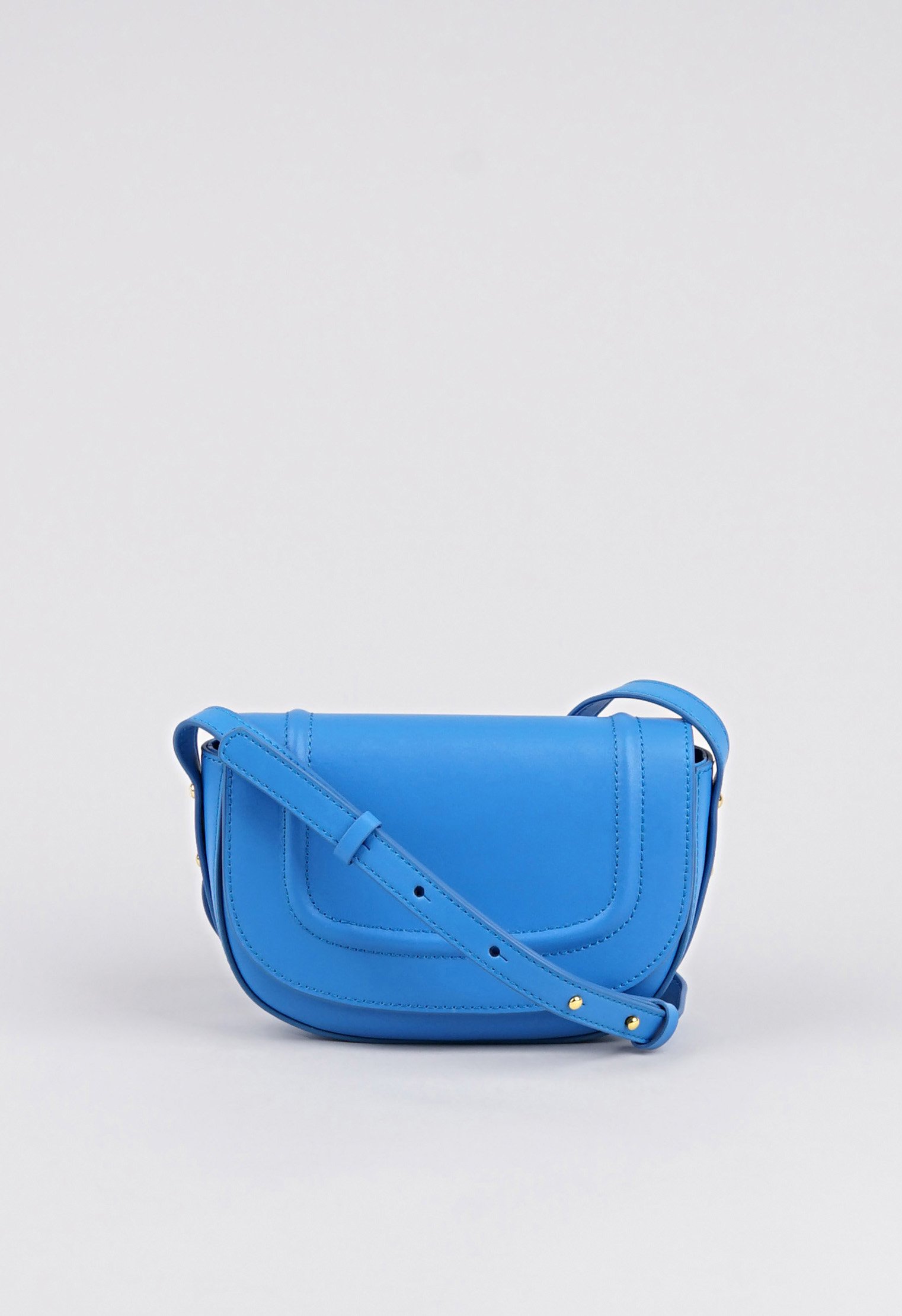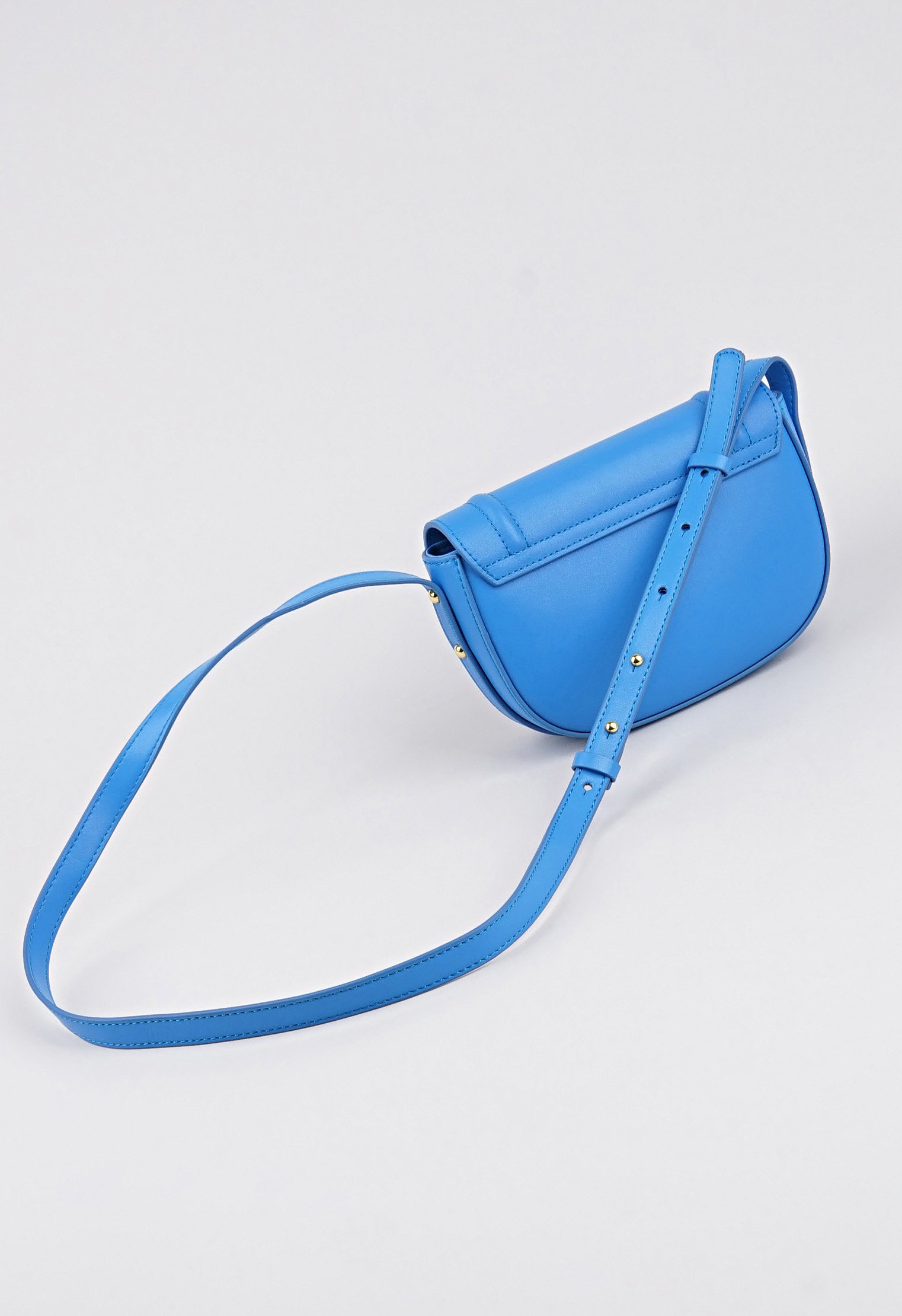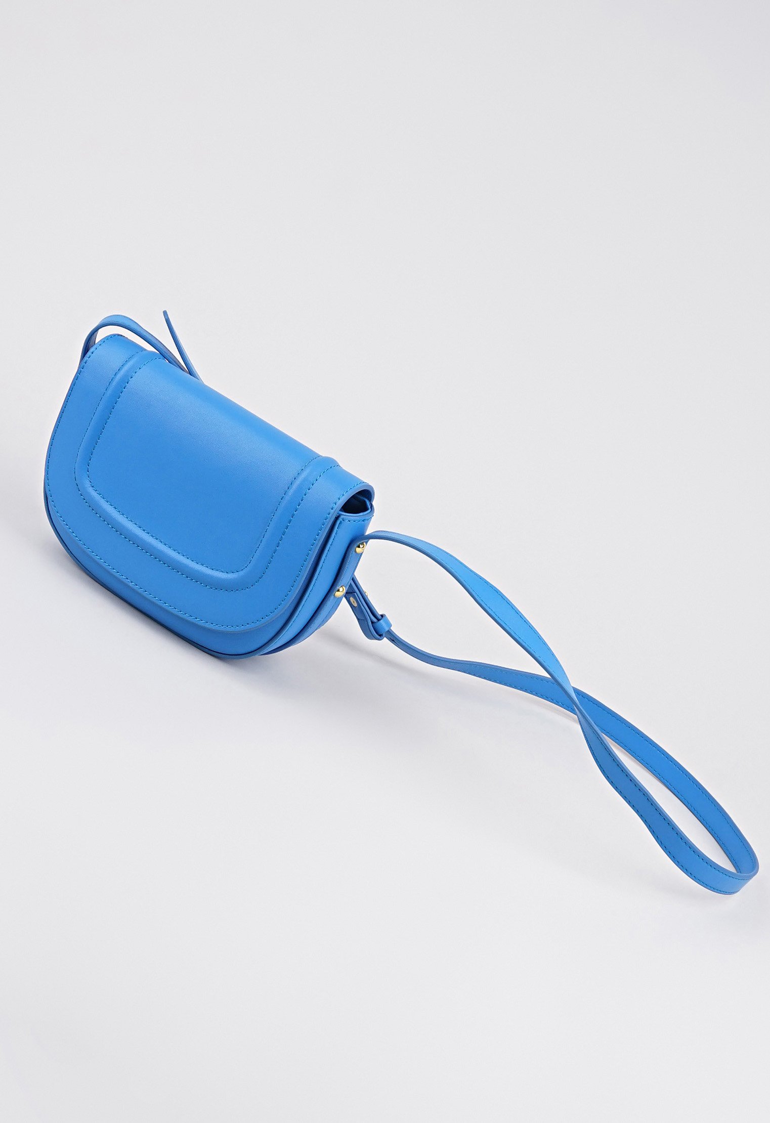 Компактная сумочка из новой коллекции изготовлена из натуральной кожи и представлена в синем цвете. Классический крой с откидным верхом дополнен застёжкой в виде кнопки и двумя внутренними карманами. Ремень с регулировкой позволяет носить аксессуар в руке и на плече. Яркая модель идеально впишется в модный образ и поможет оставаться в тренде.
