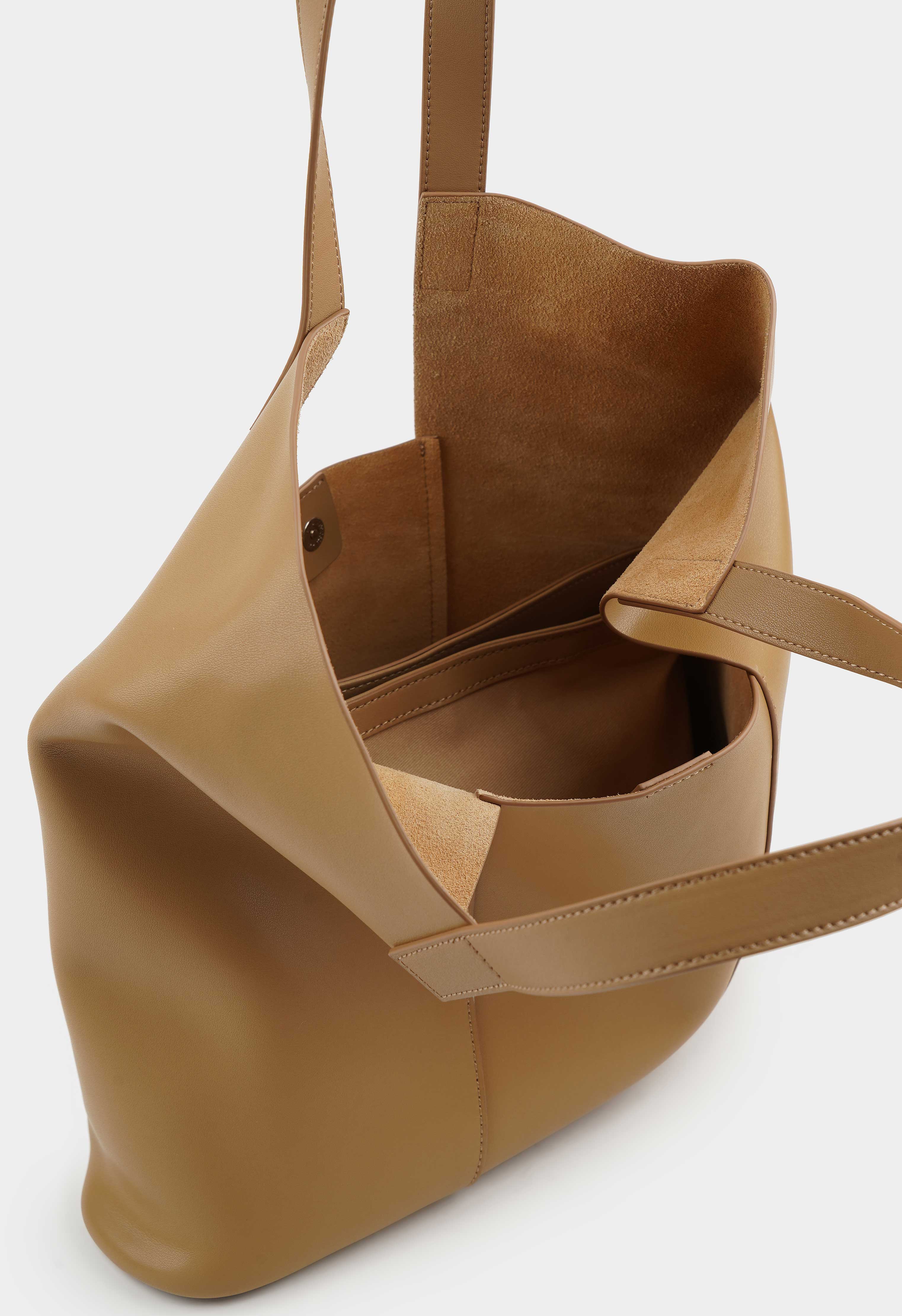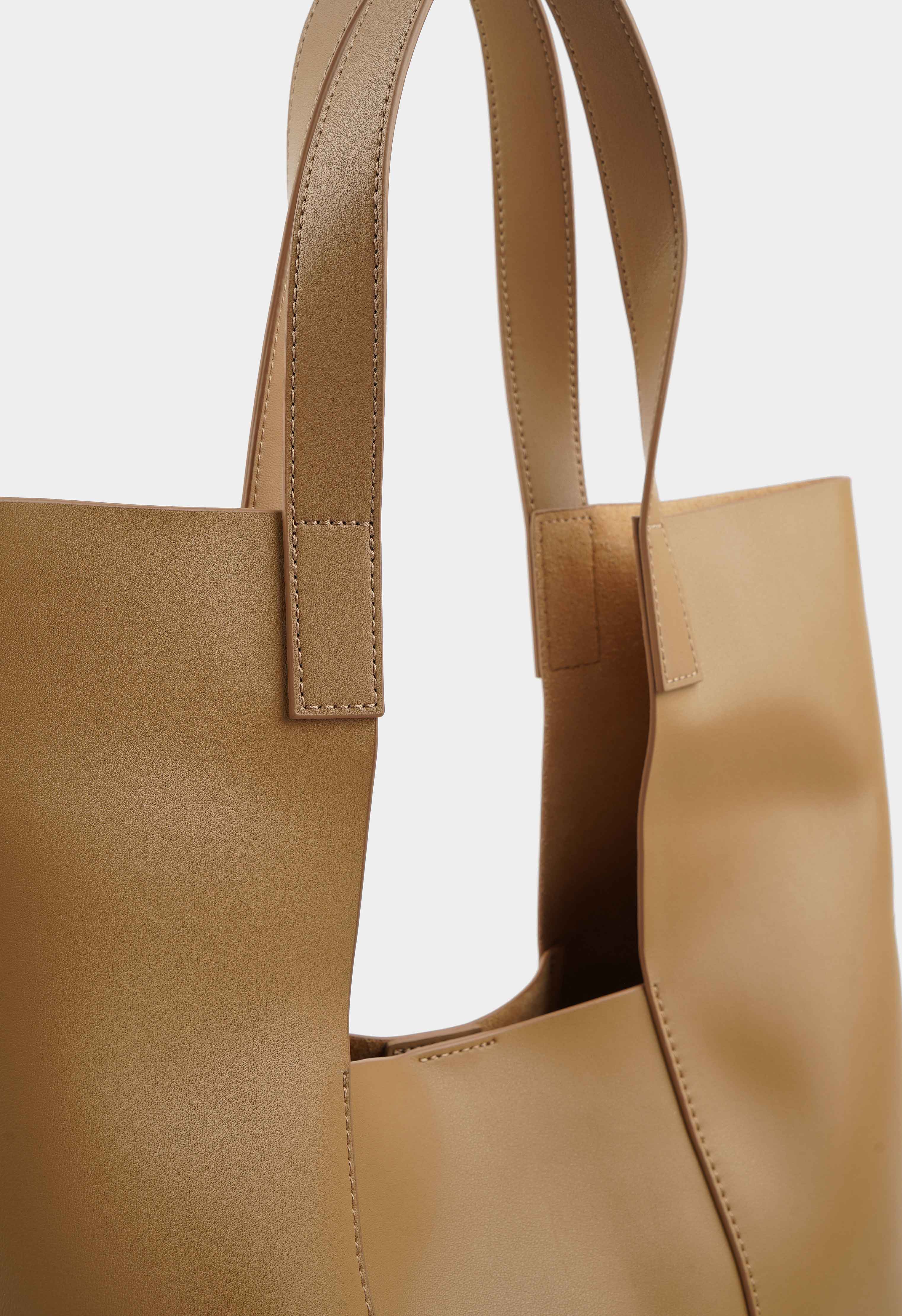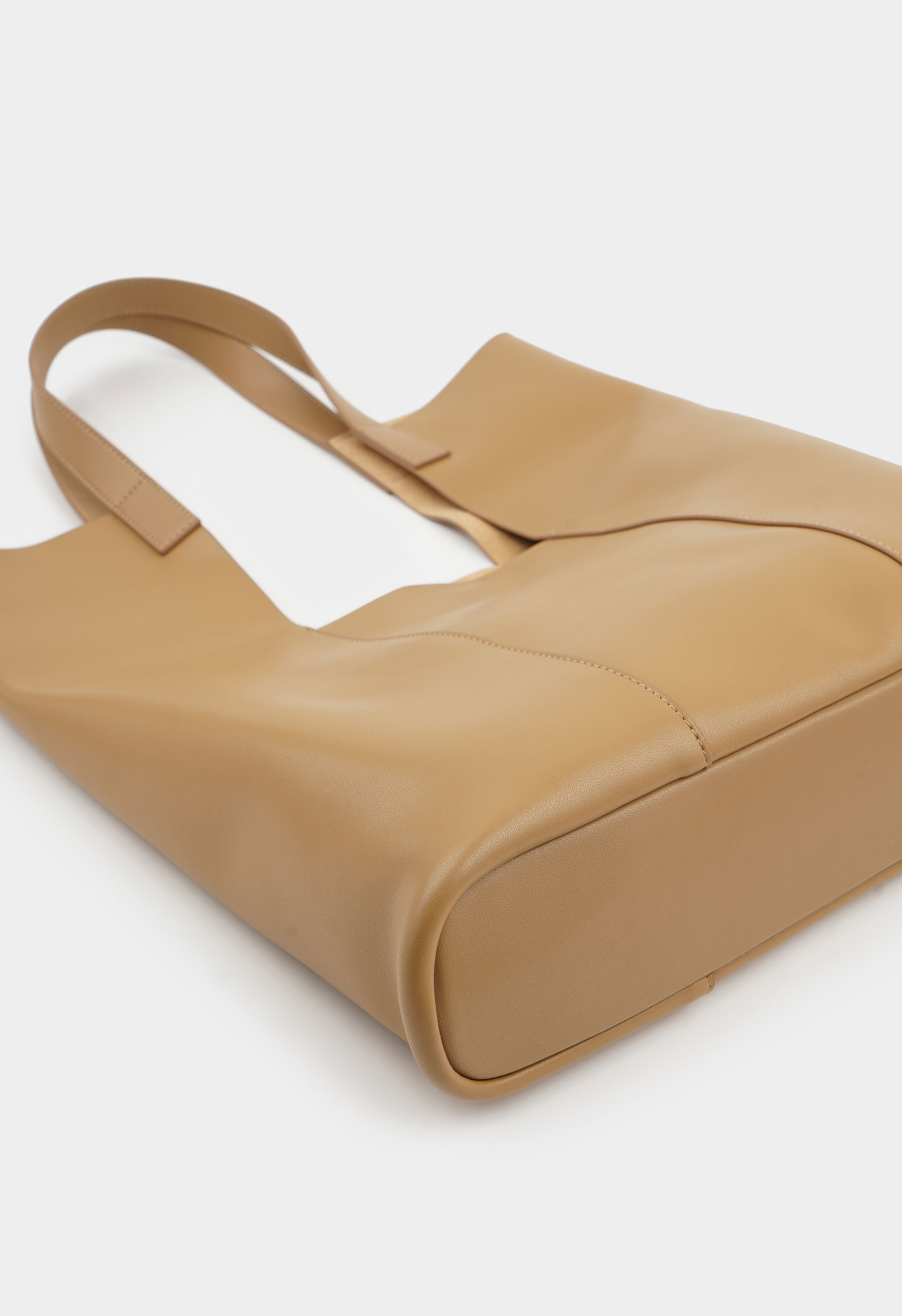 Сумка в бежевом цвете выполнена из натуральной кожи. Модель подчёркивают удобные ручки и серебряная фурнитура. Основное отделение застёгивается на кнопку и имеет четыре кармана для мелочей.