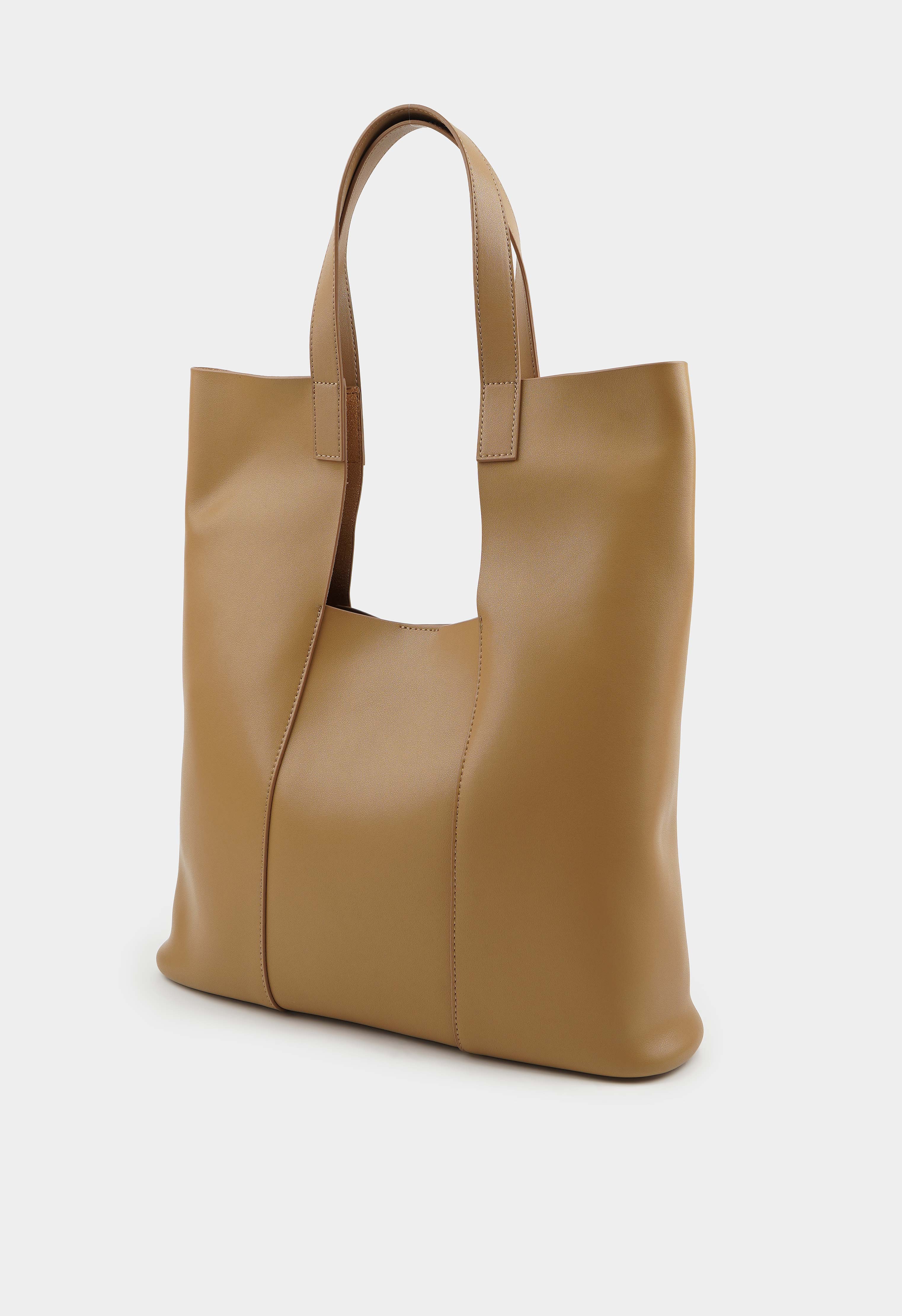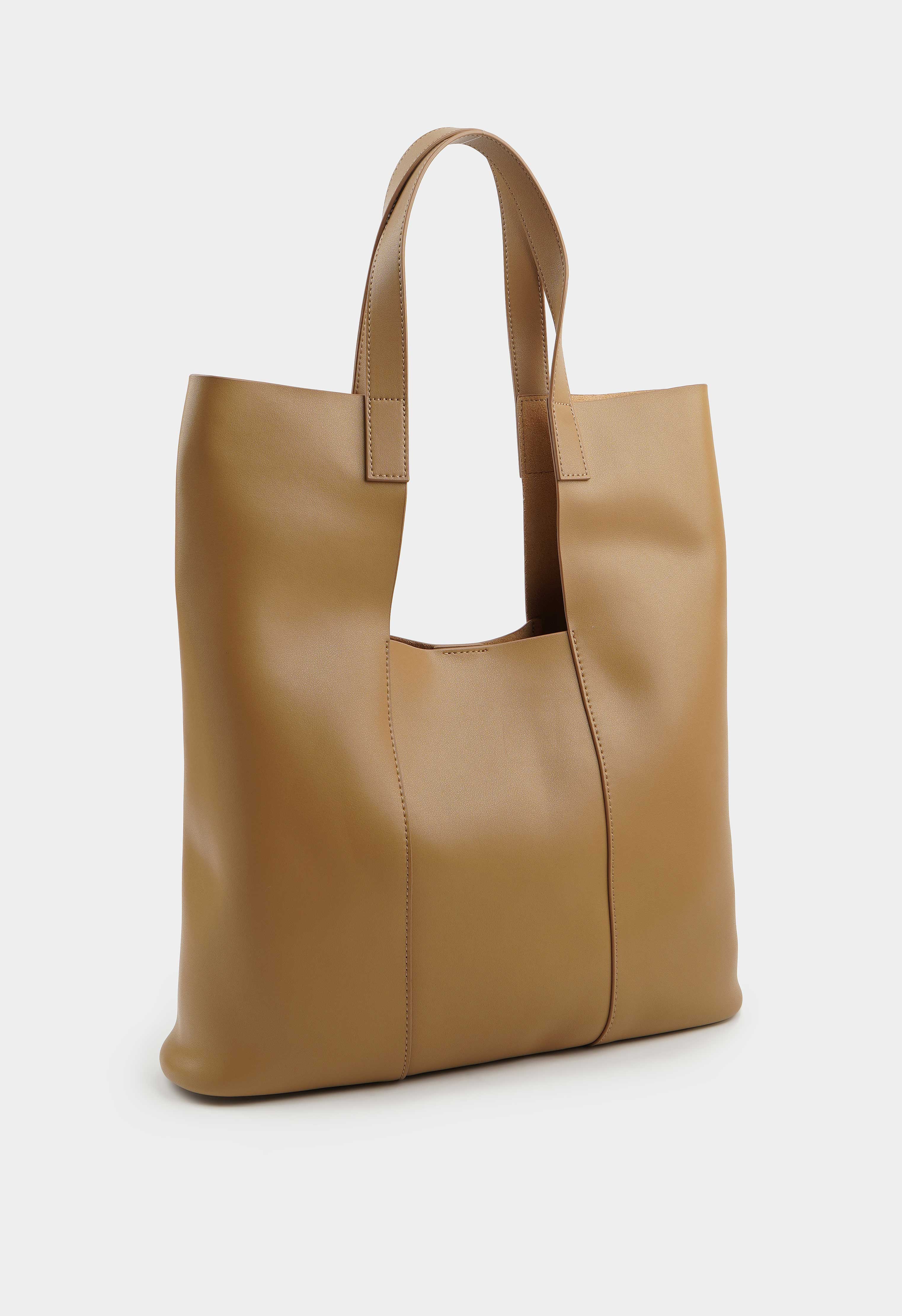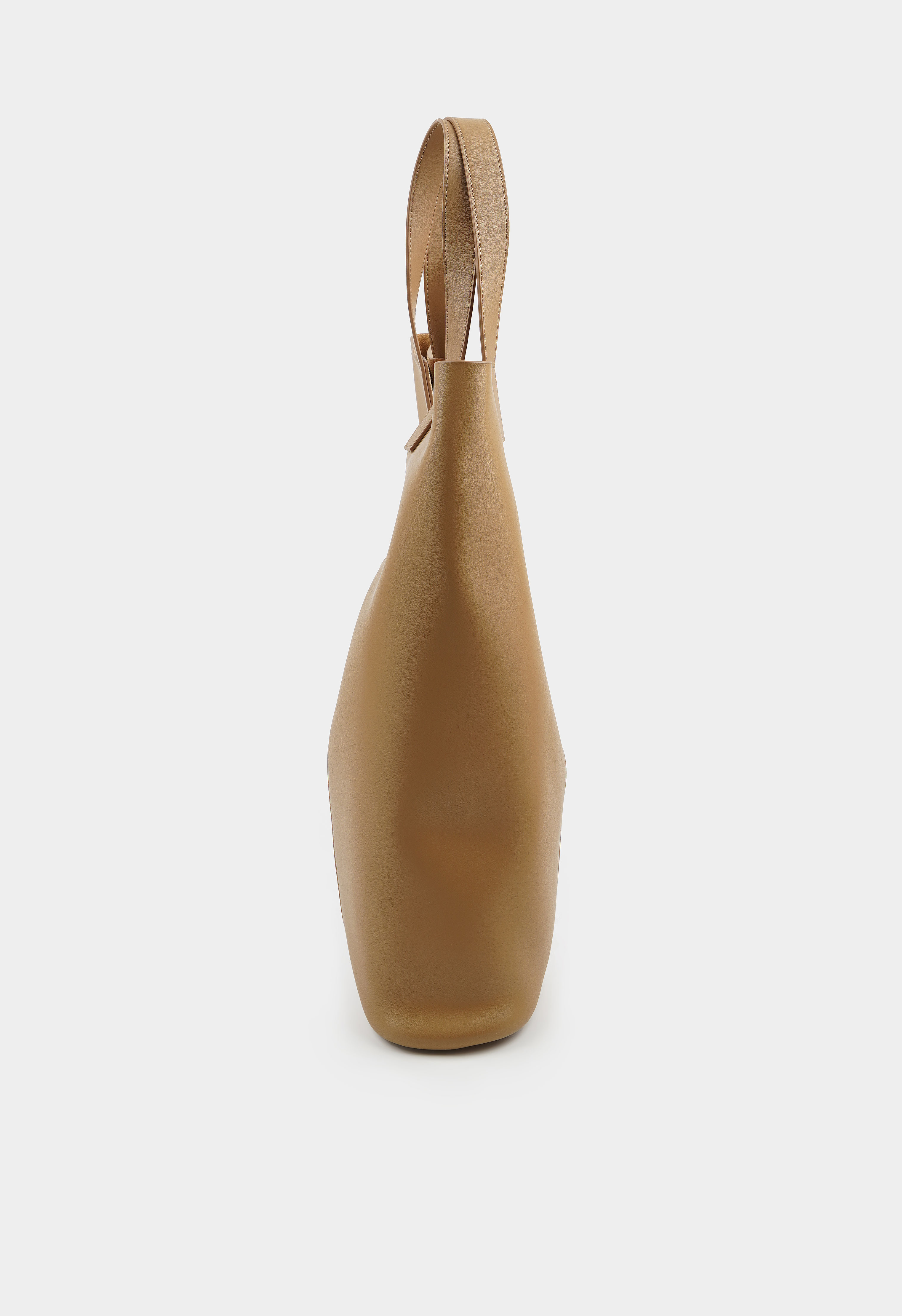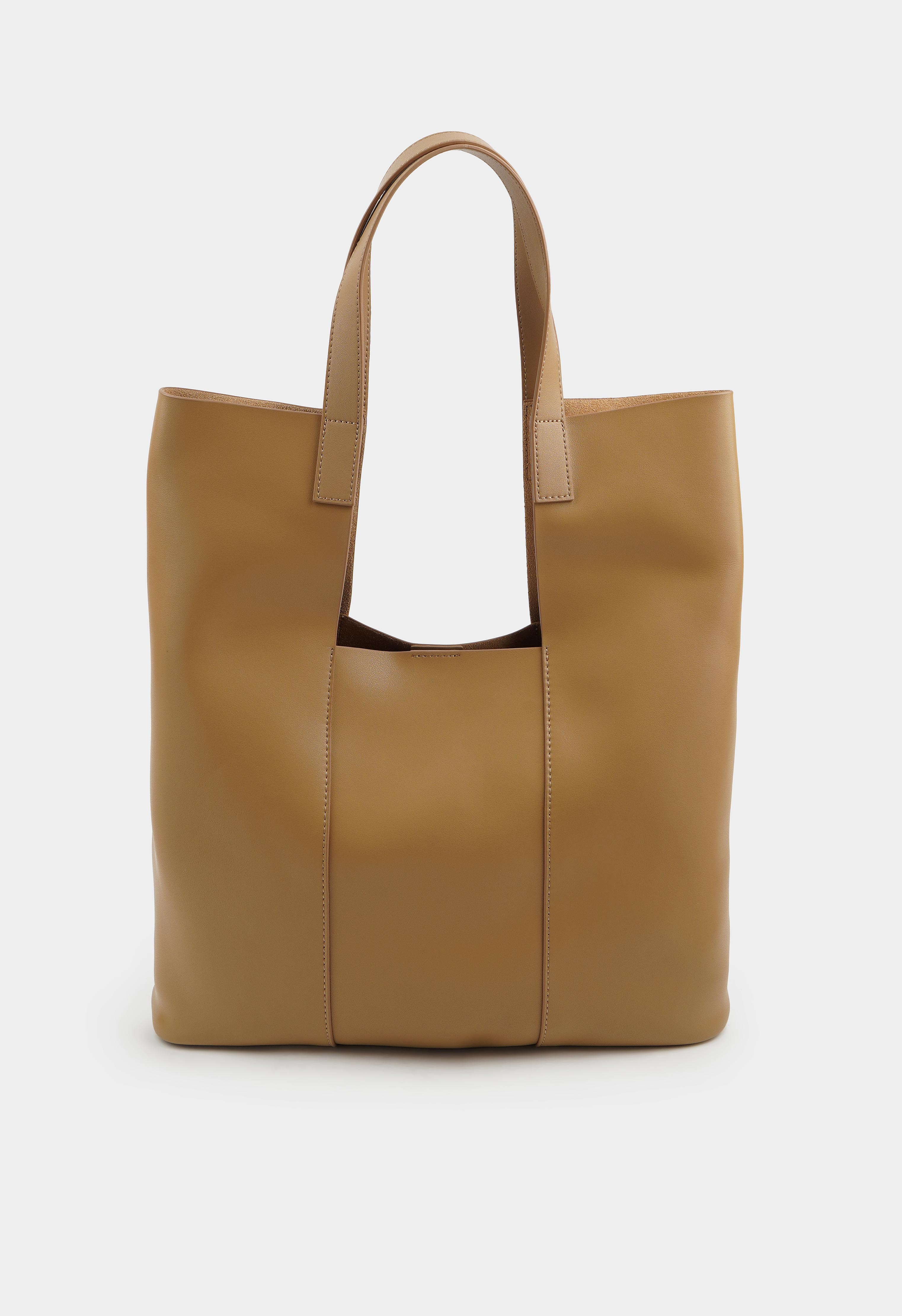 Сумка в бежевом цвете выполнена из натуральной кожи. Модель подчёркивают удобные ручки и серебряная фурнитура. Основное отделение застёгивается на кнопку и имеет четыре кармана для мелочей.