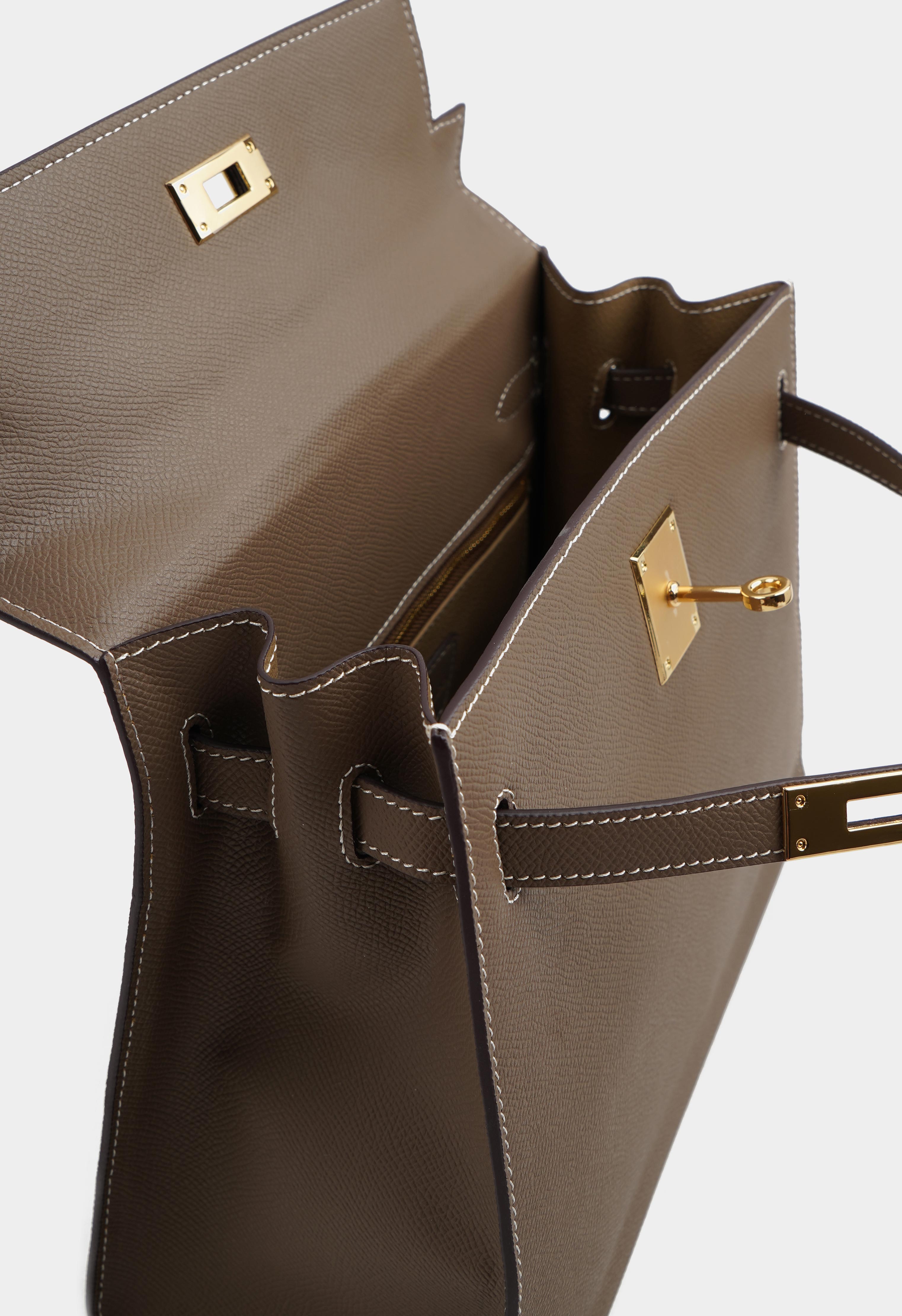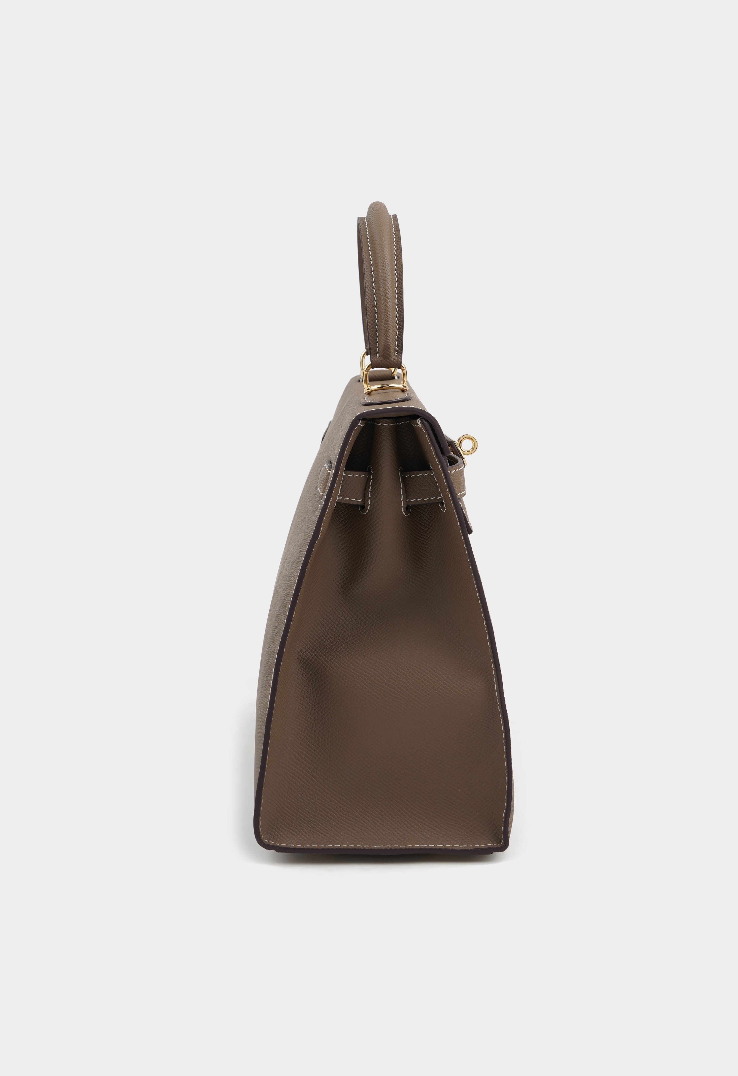 Повседневная сумка из натуральной кожи в цвете хаки. Основное отделение имеет три кармана для мелочей и застегивается на пряжку. Модель дополняют короткая ручка и золотая фурнитура. В комплект входит плечевой ремень.