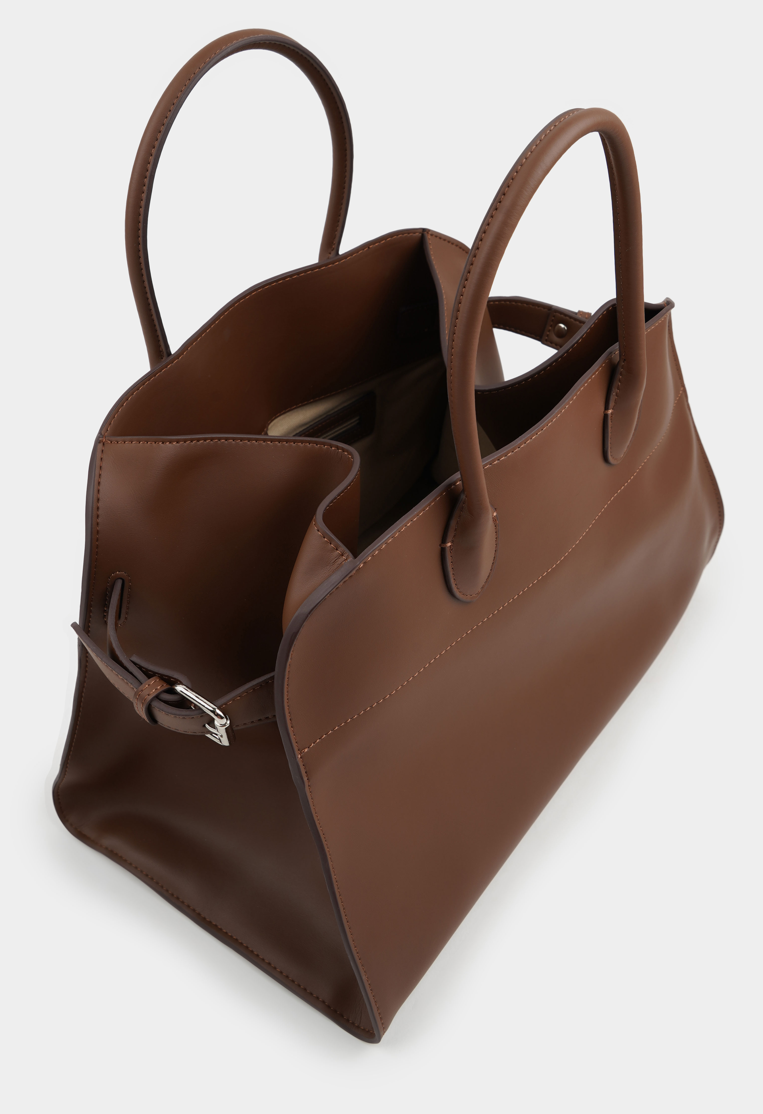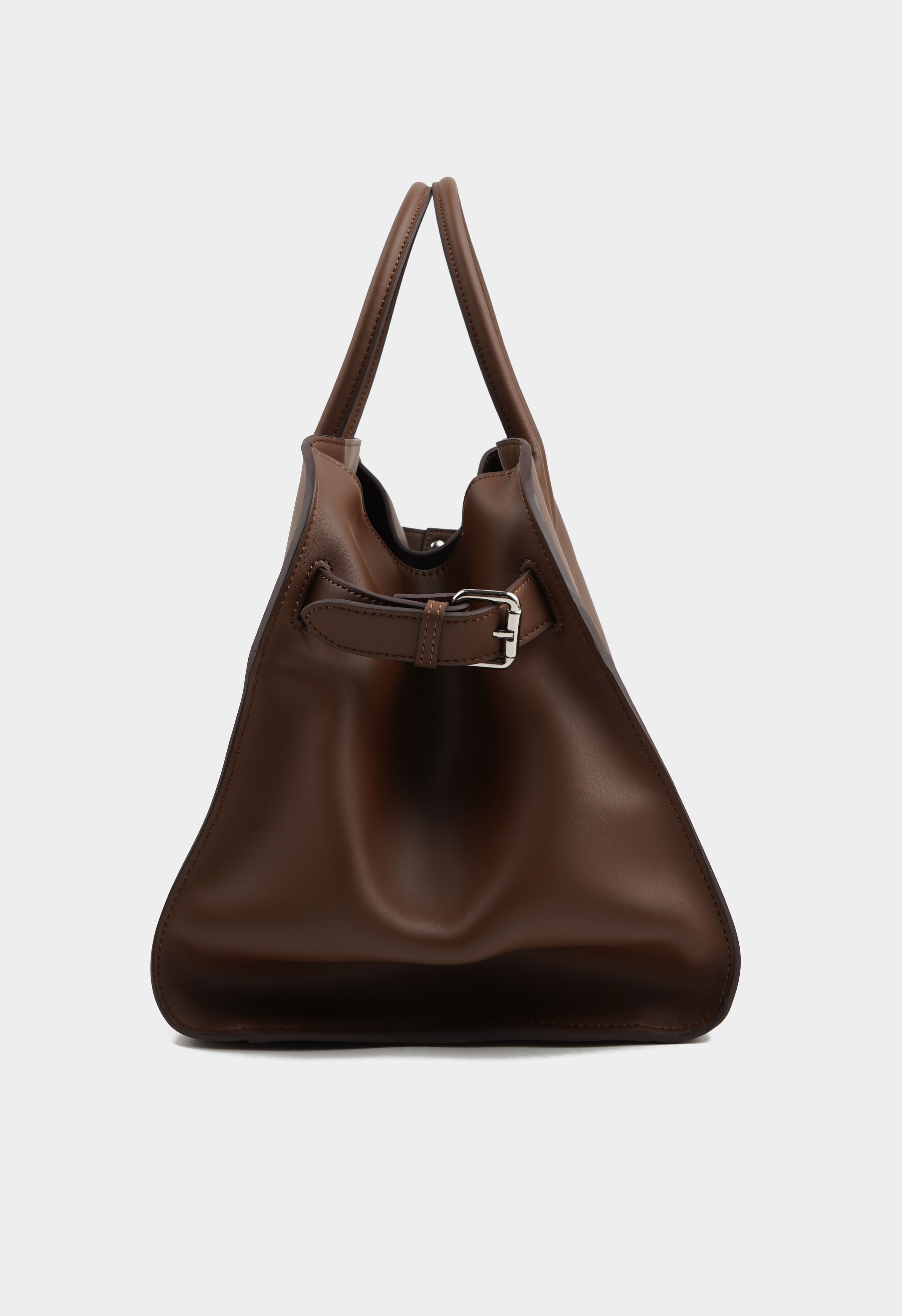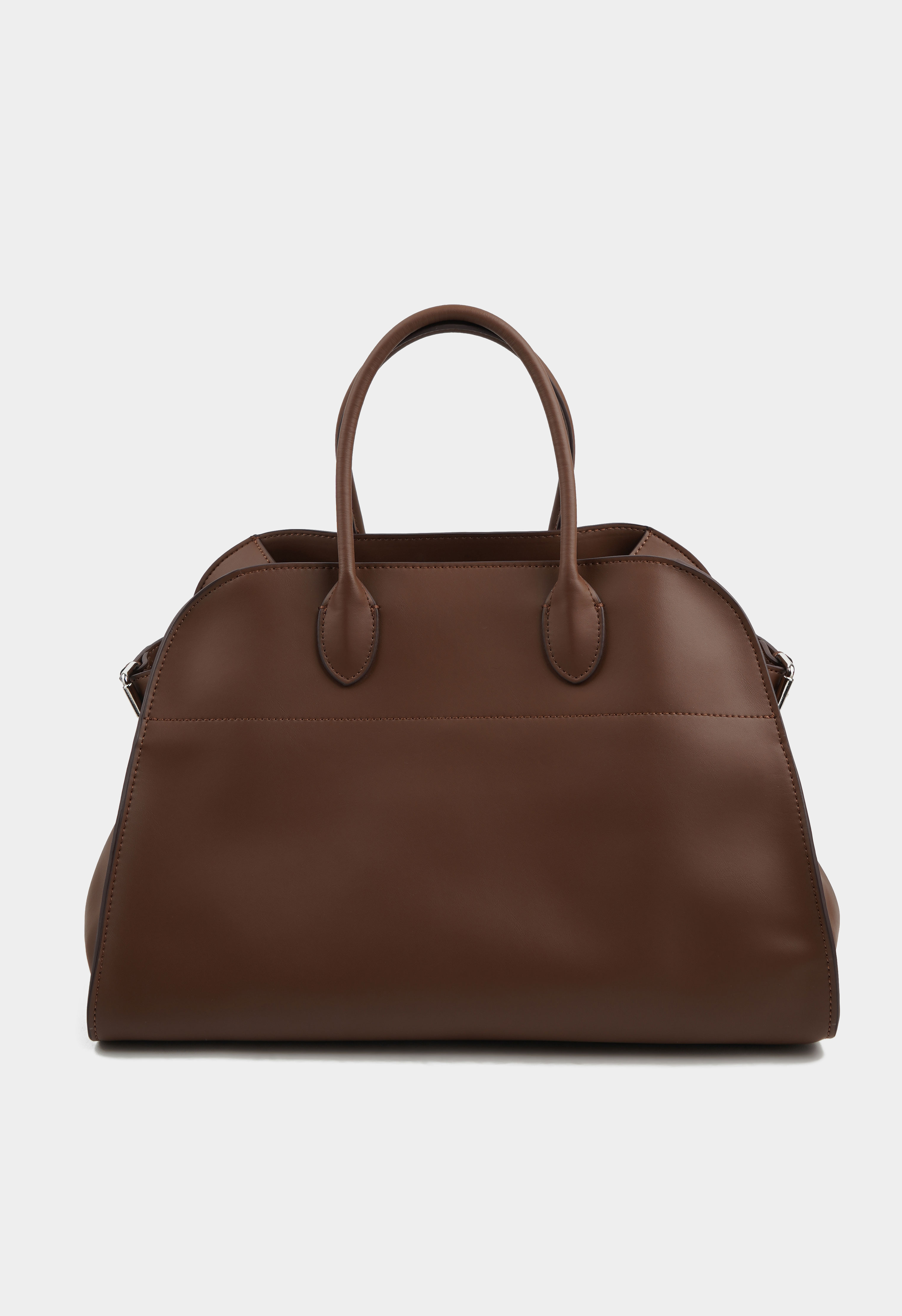 Вместительная сумка из натуральной кожи представлена в коричневом цвете. Основное отделение имеет два кармана для мелочей. Модель дополняют серебряная фурнитура и тонкие ручки.