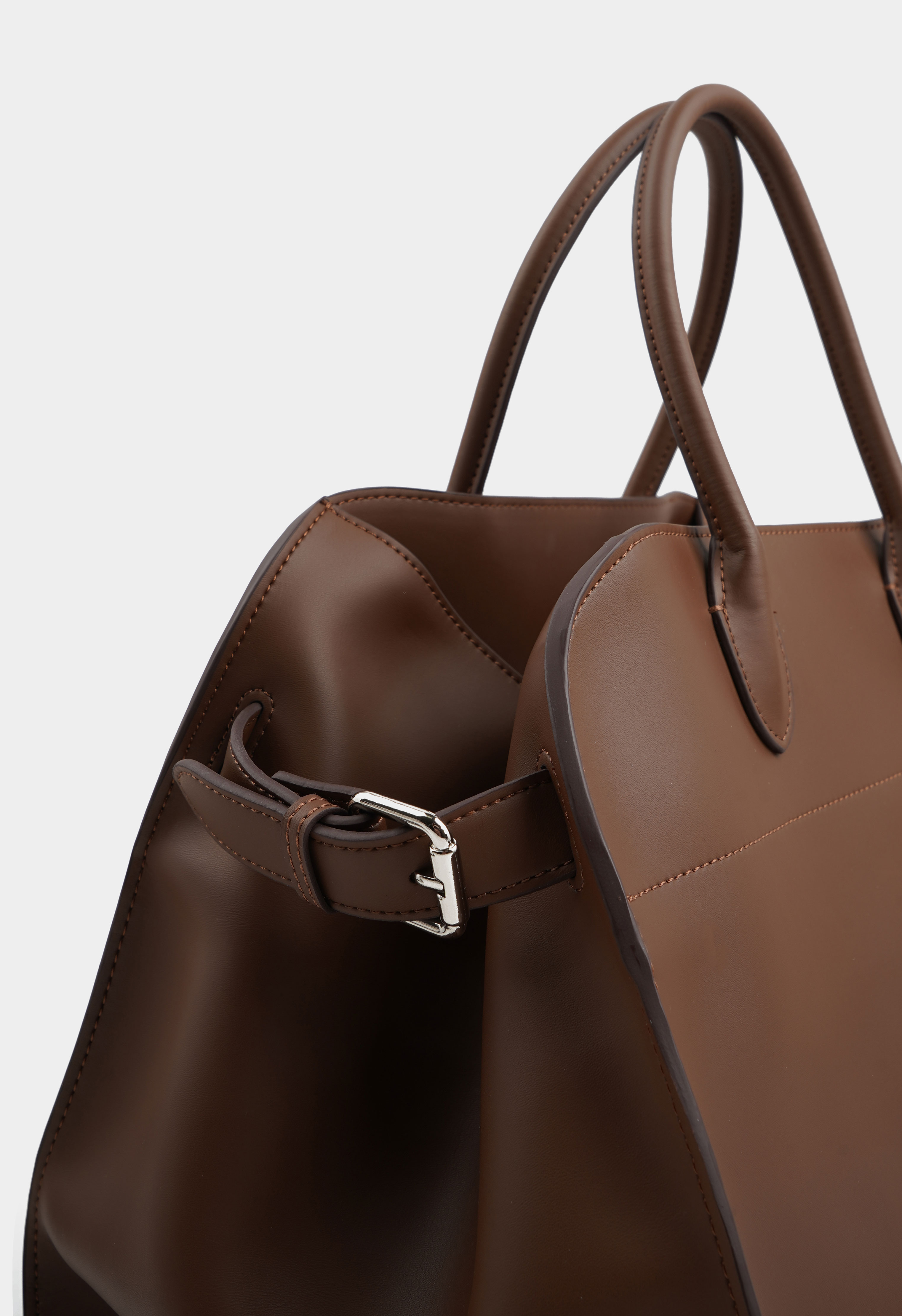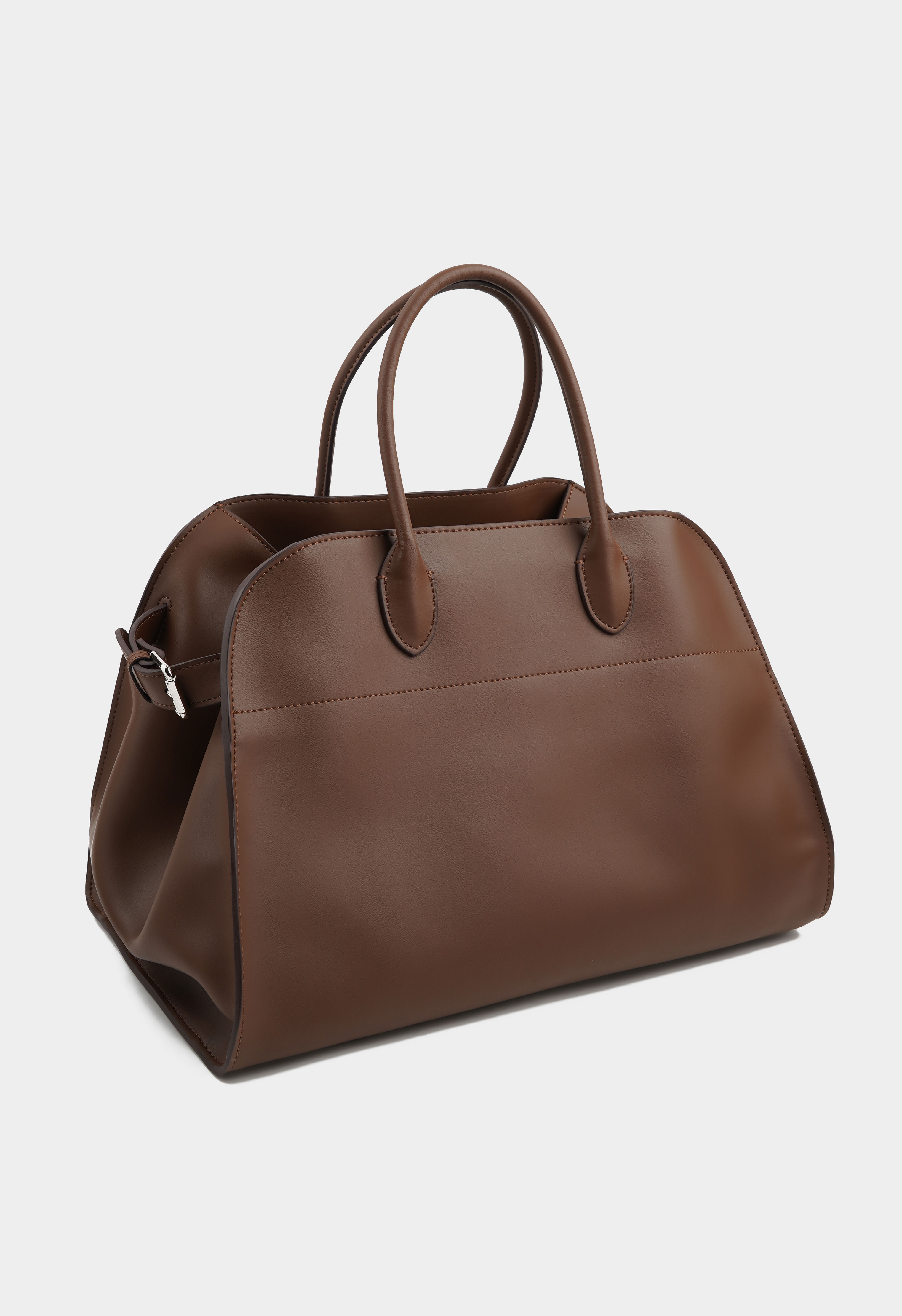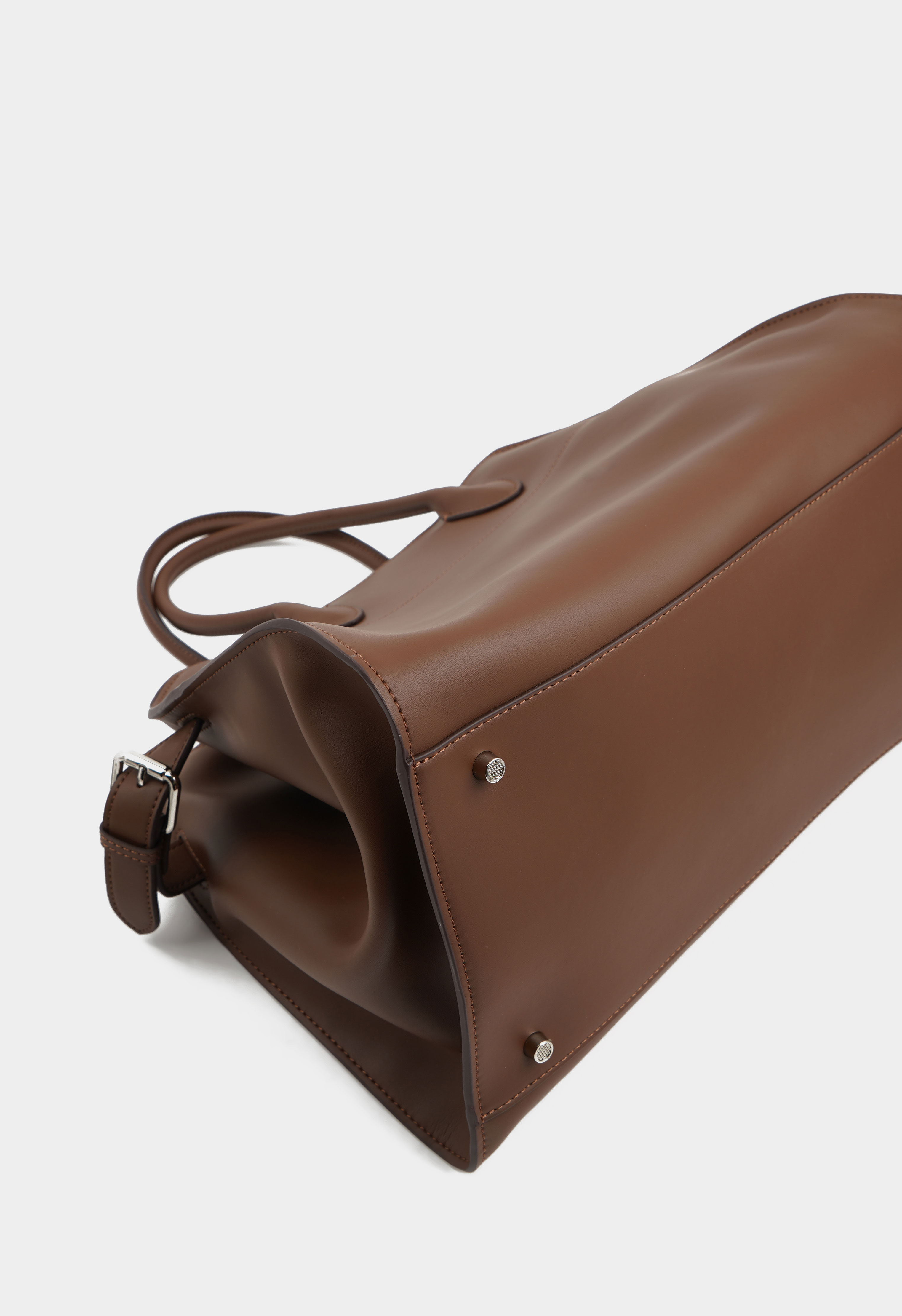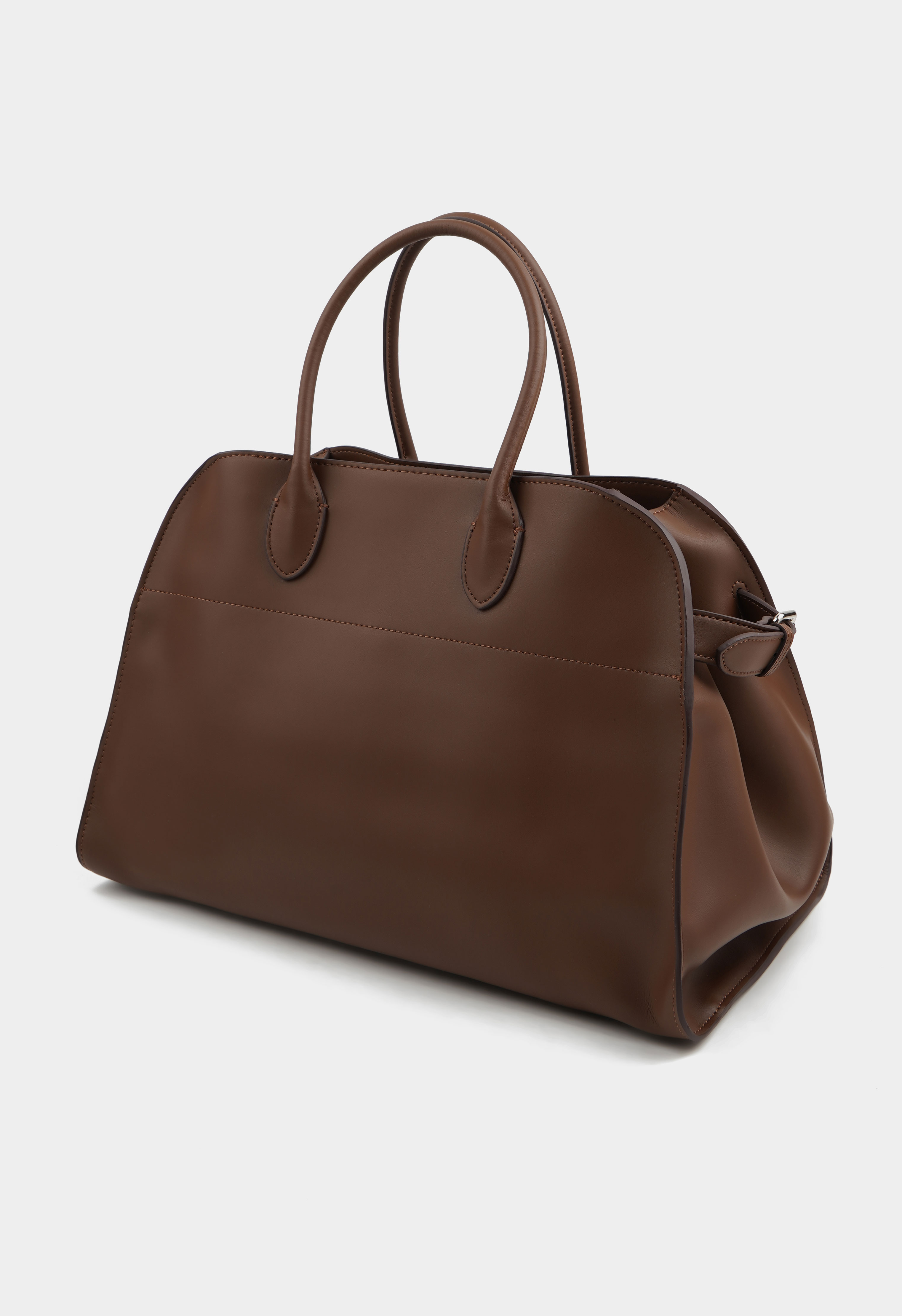 Вместительная сумка из натуральной кожи представлена в коричневом цвете. Основное отделение имеет два кармана для мелочей. Модель дополняют серебряная фурнитура и тонкие ручки.