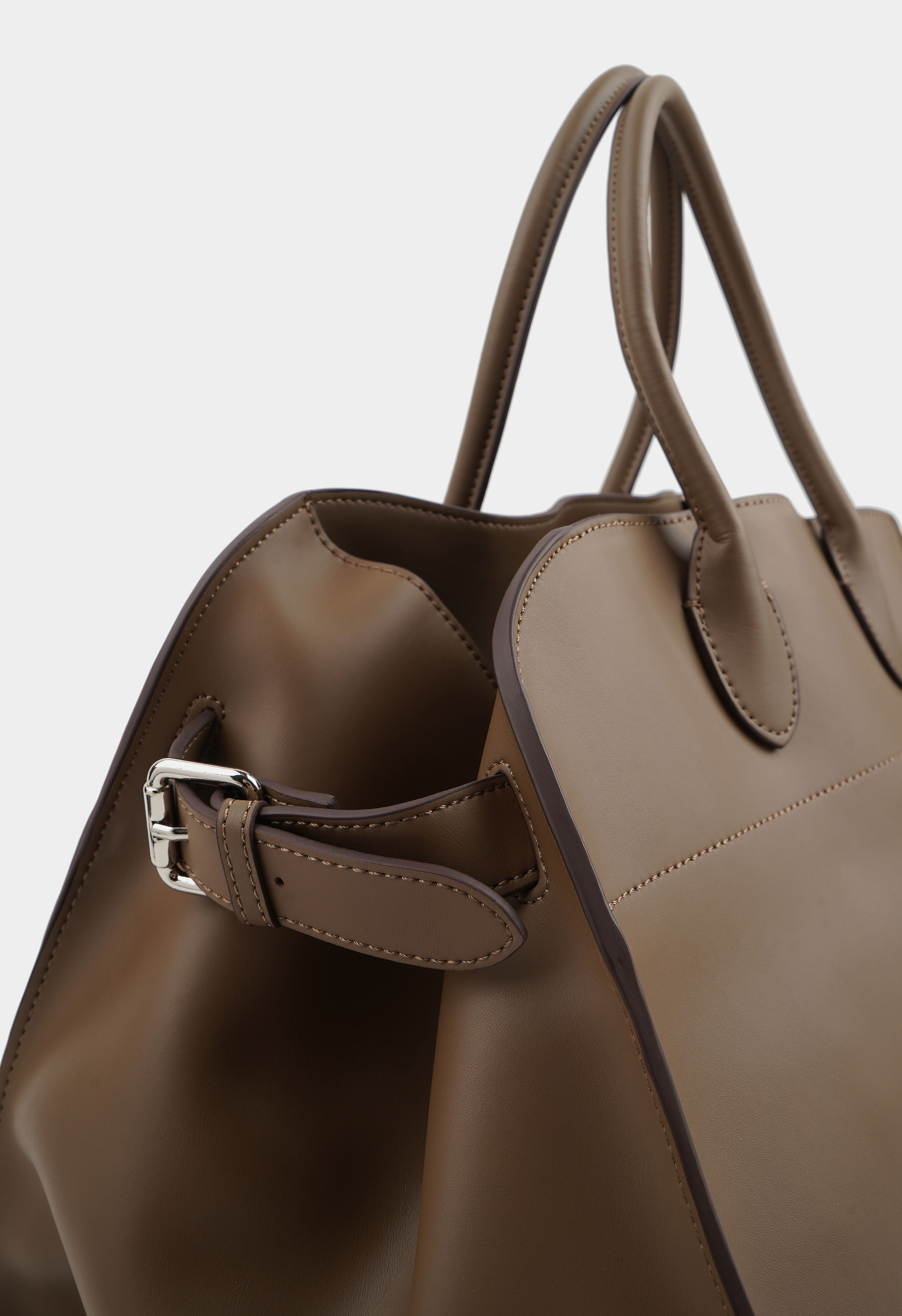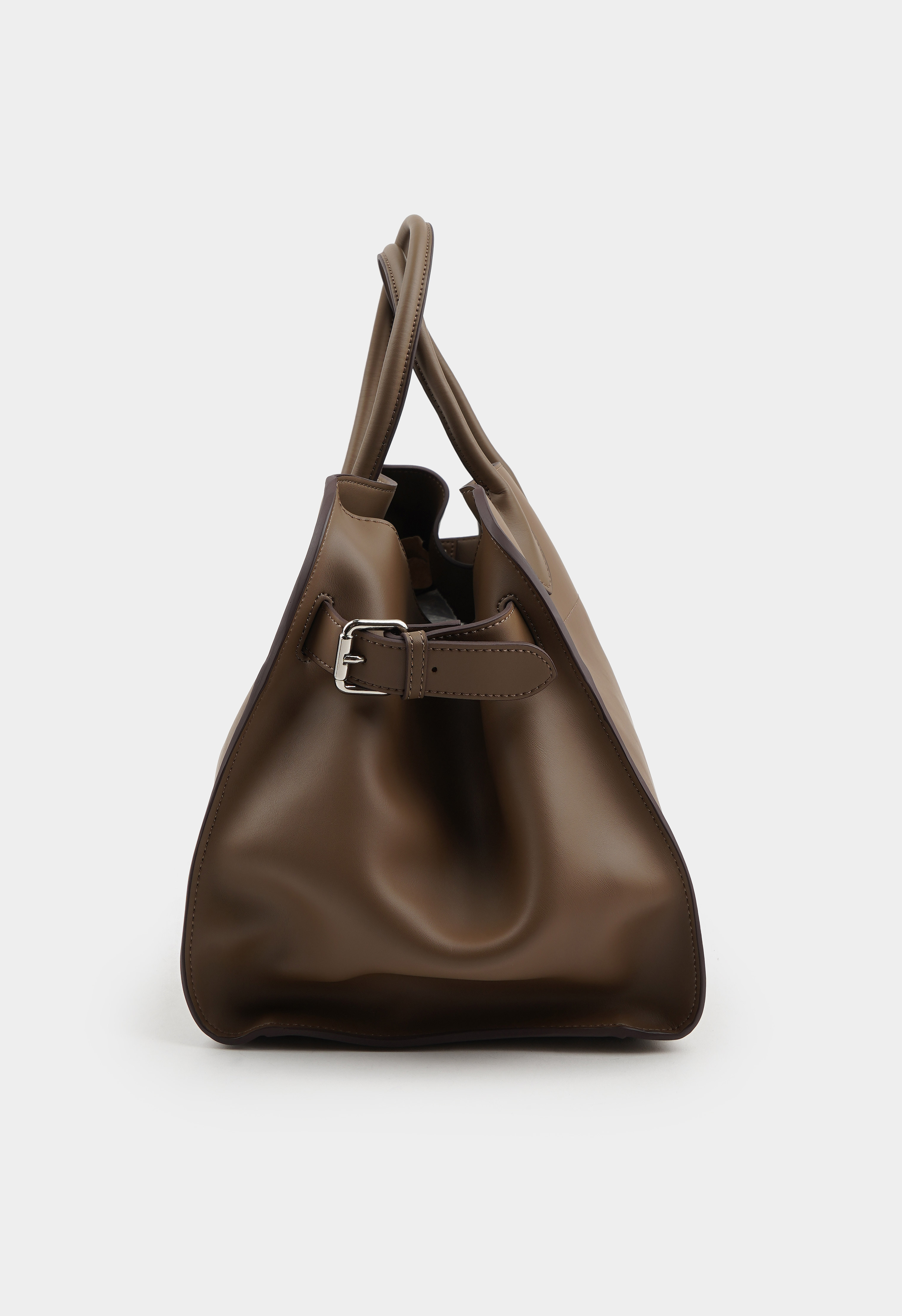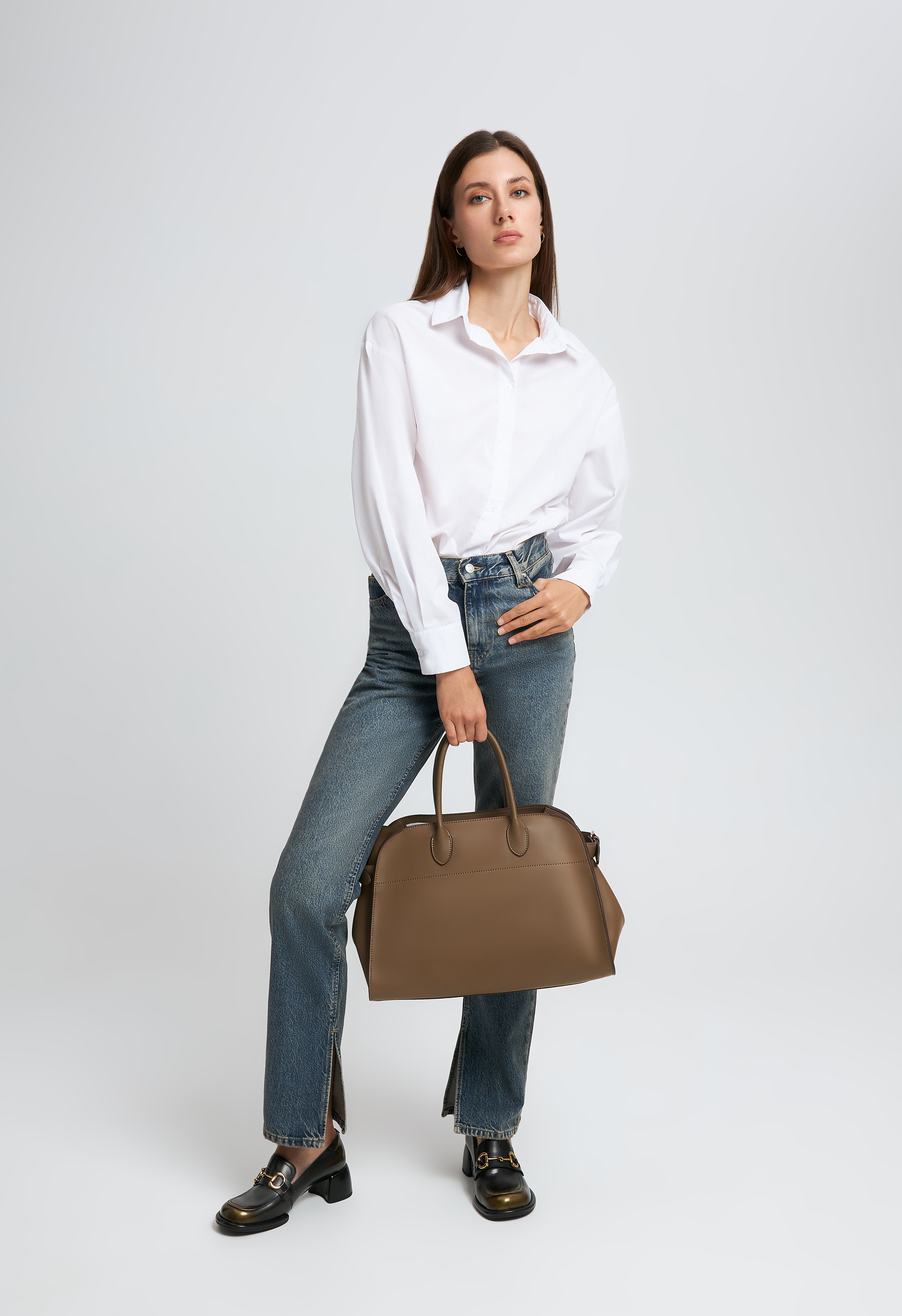 Вместительная сумка из натуральной кожи представлена в цвете хаки. Основное отделение имеет два кармана для мелочей. Модель дополняют серебряная фурнитура и тонкие ручки.