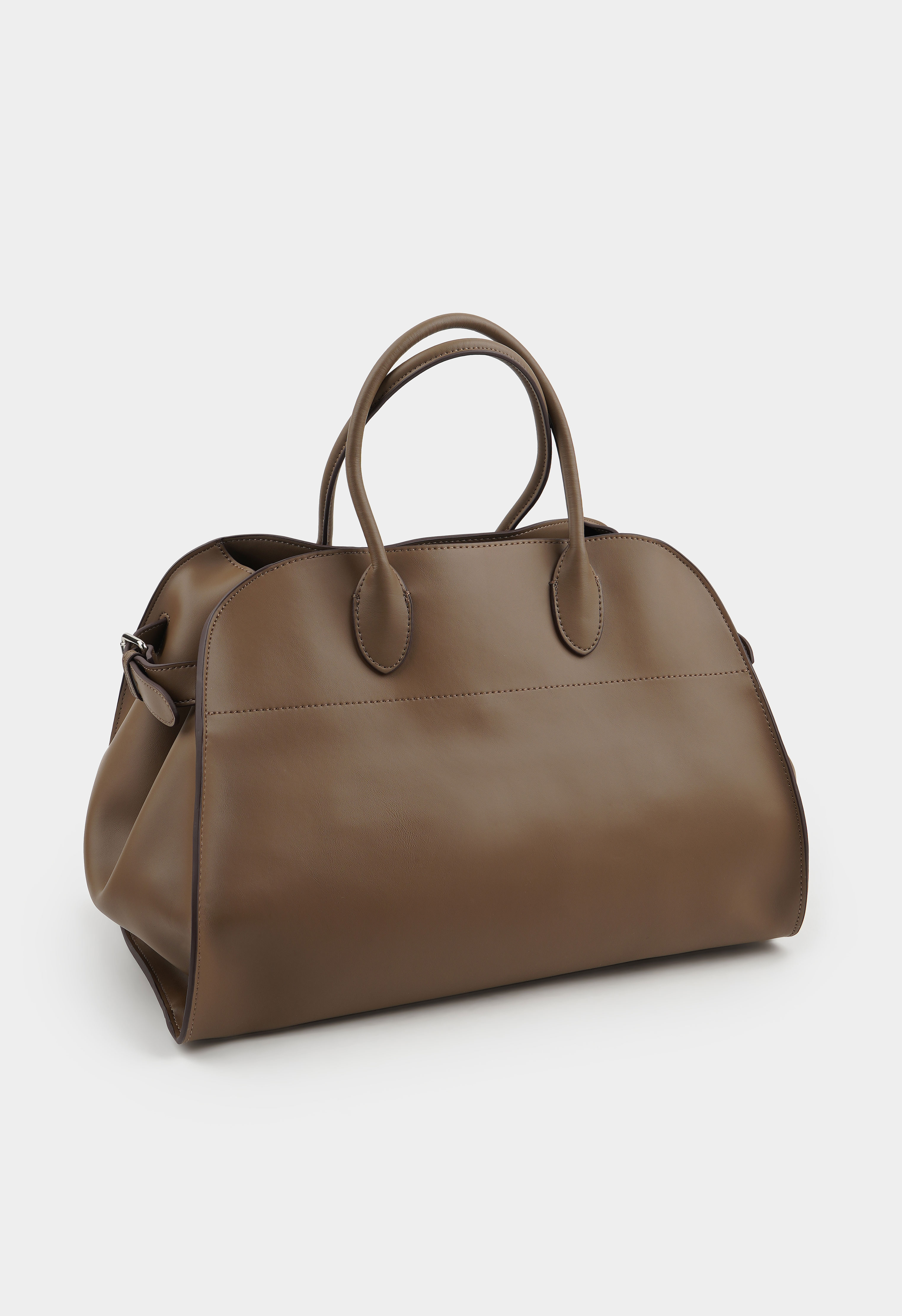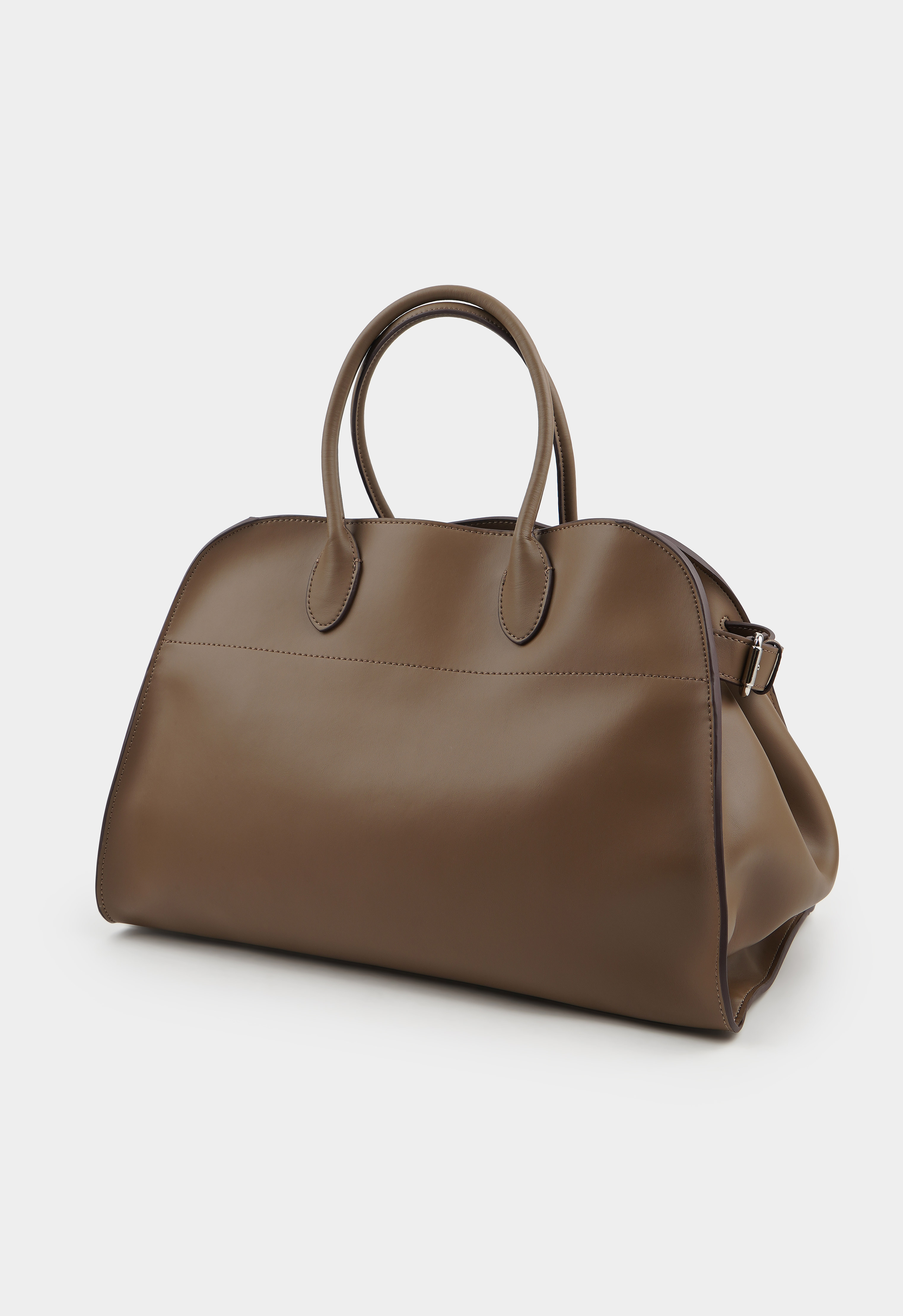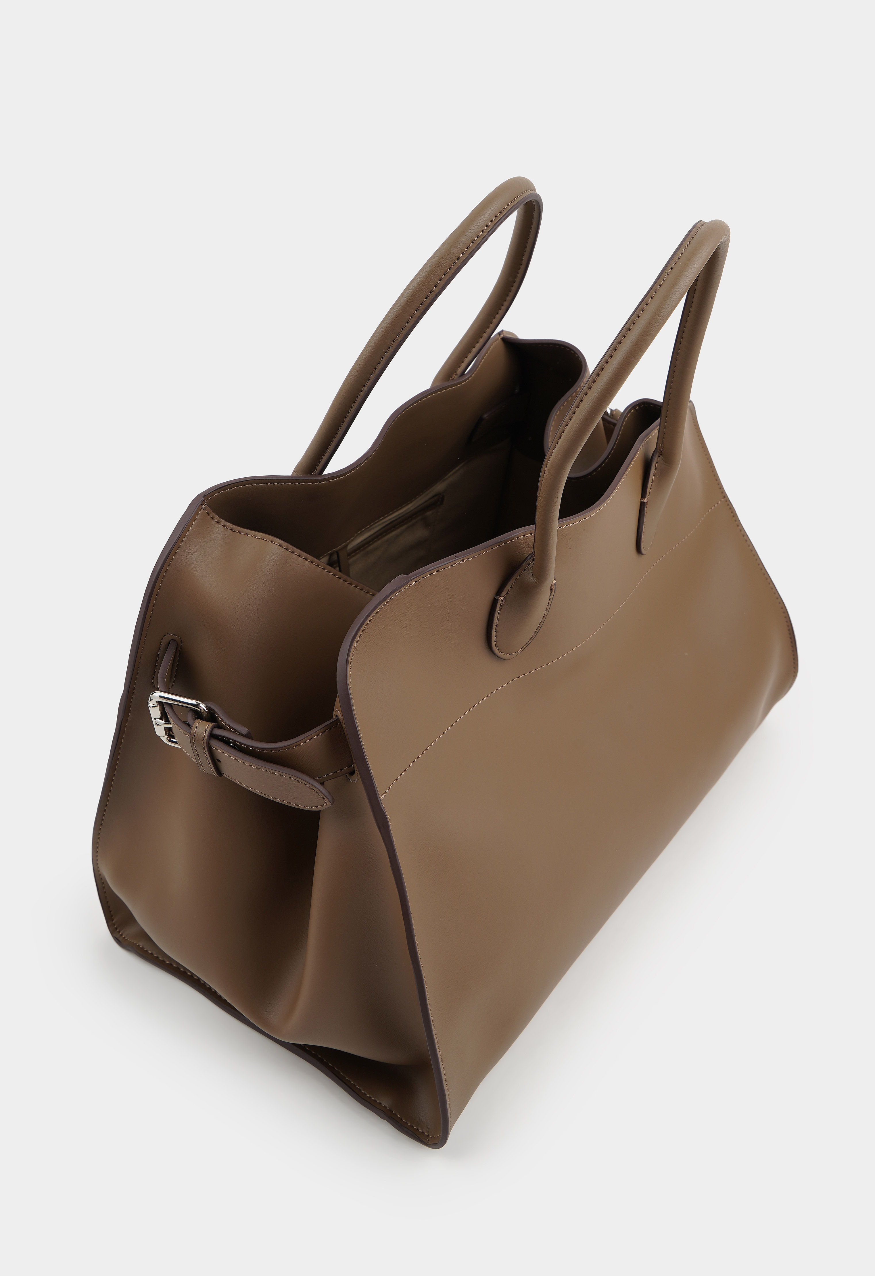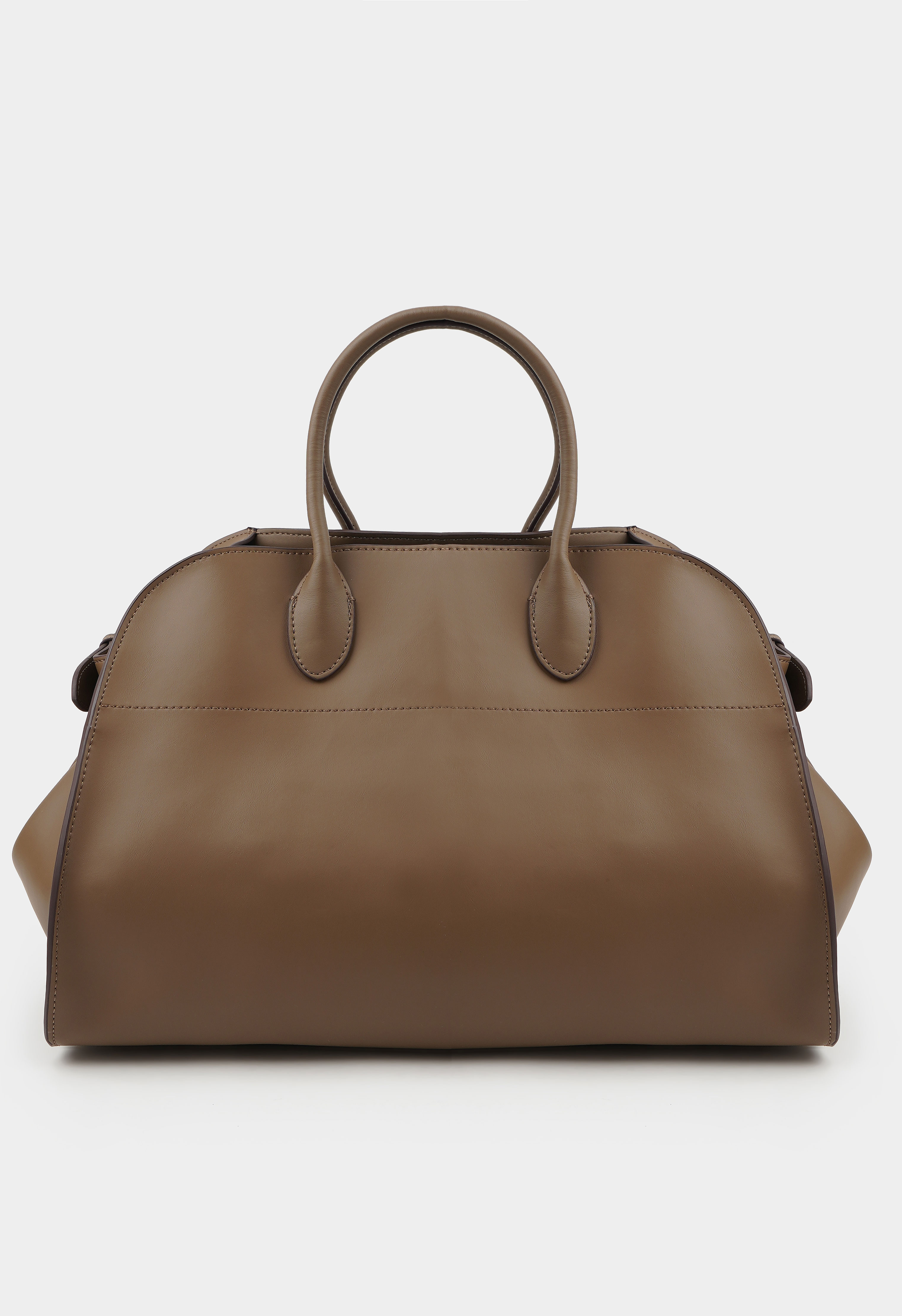 Вместительная сумка из натуральной кожи представлена в цвете хаки. Основное отделение имеет два кармана для мелочей. Модель дополняют серебряная фурнитура и тонкие ручки.