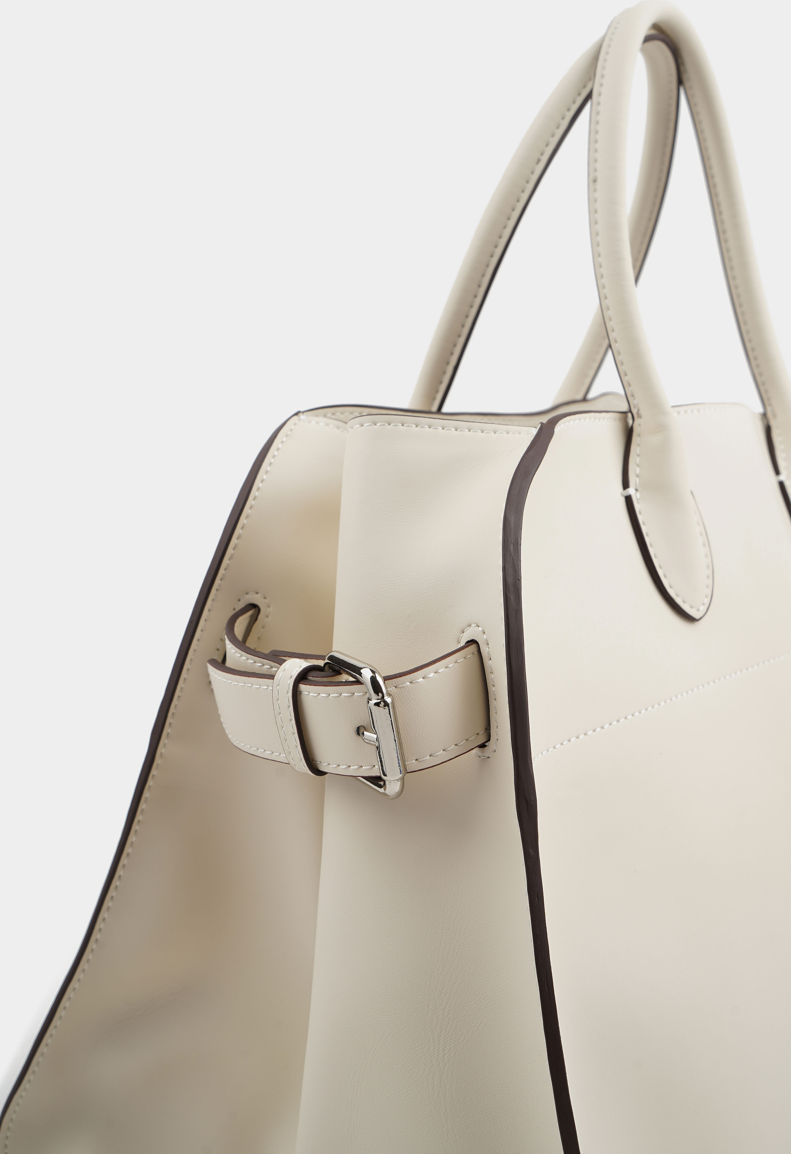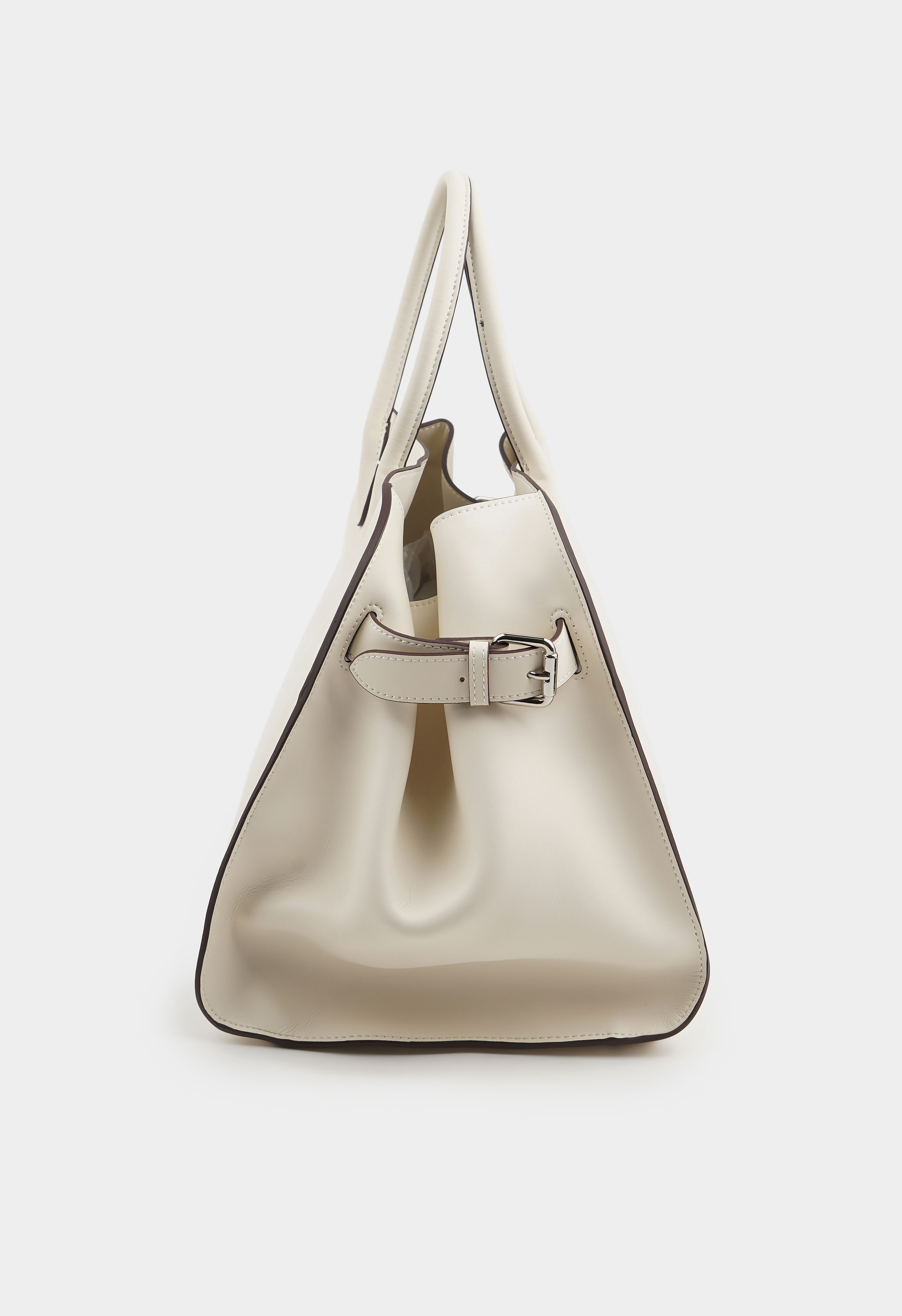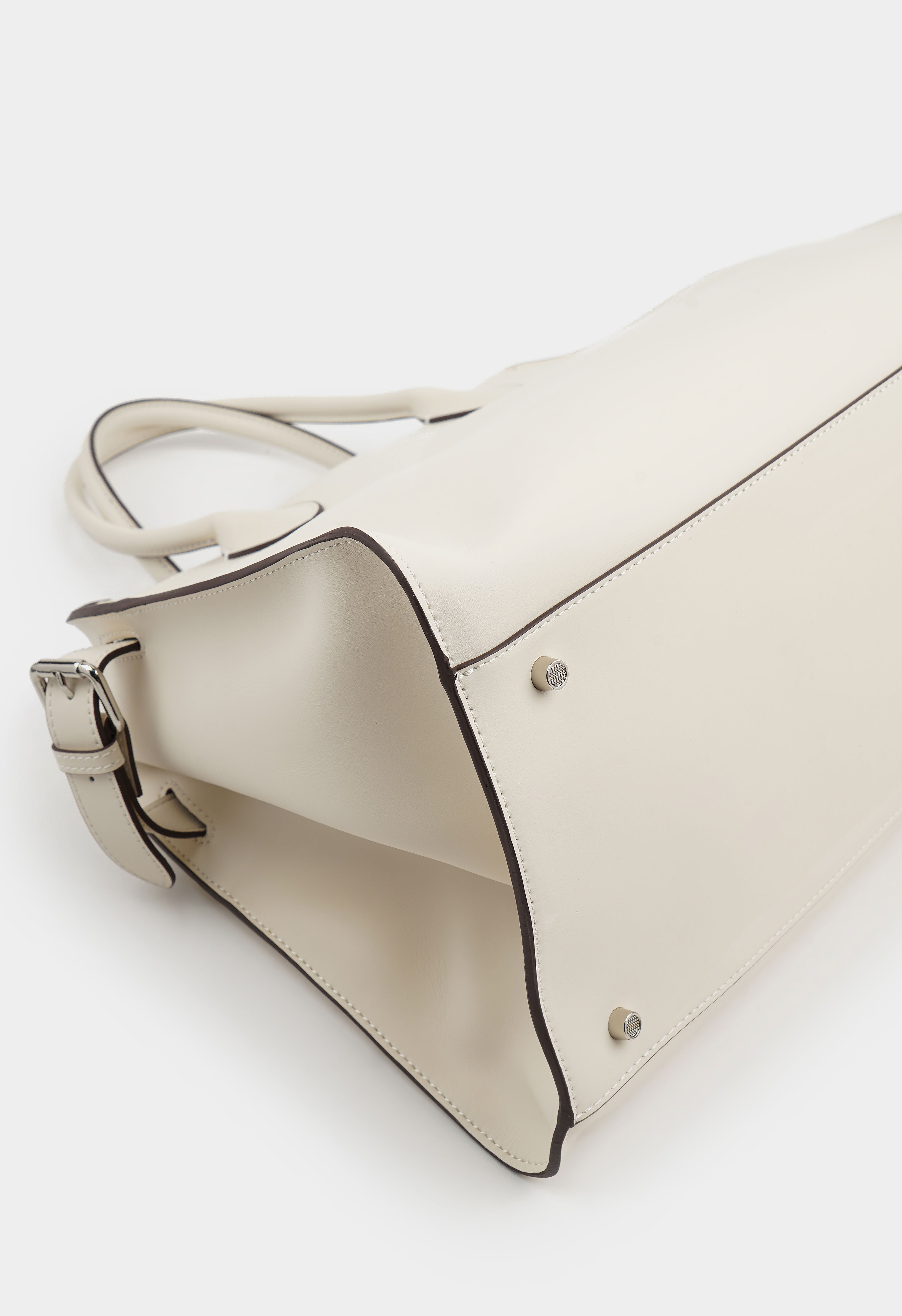 Вместительная сумка из натуральной кожи представлена в молочном цвете. Основное отделение имеет два кармана для мелочей. Модель дополняют серебряная фурнитура и тонкие ручки.