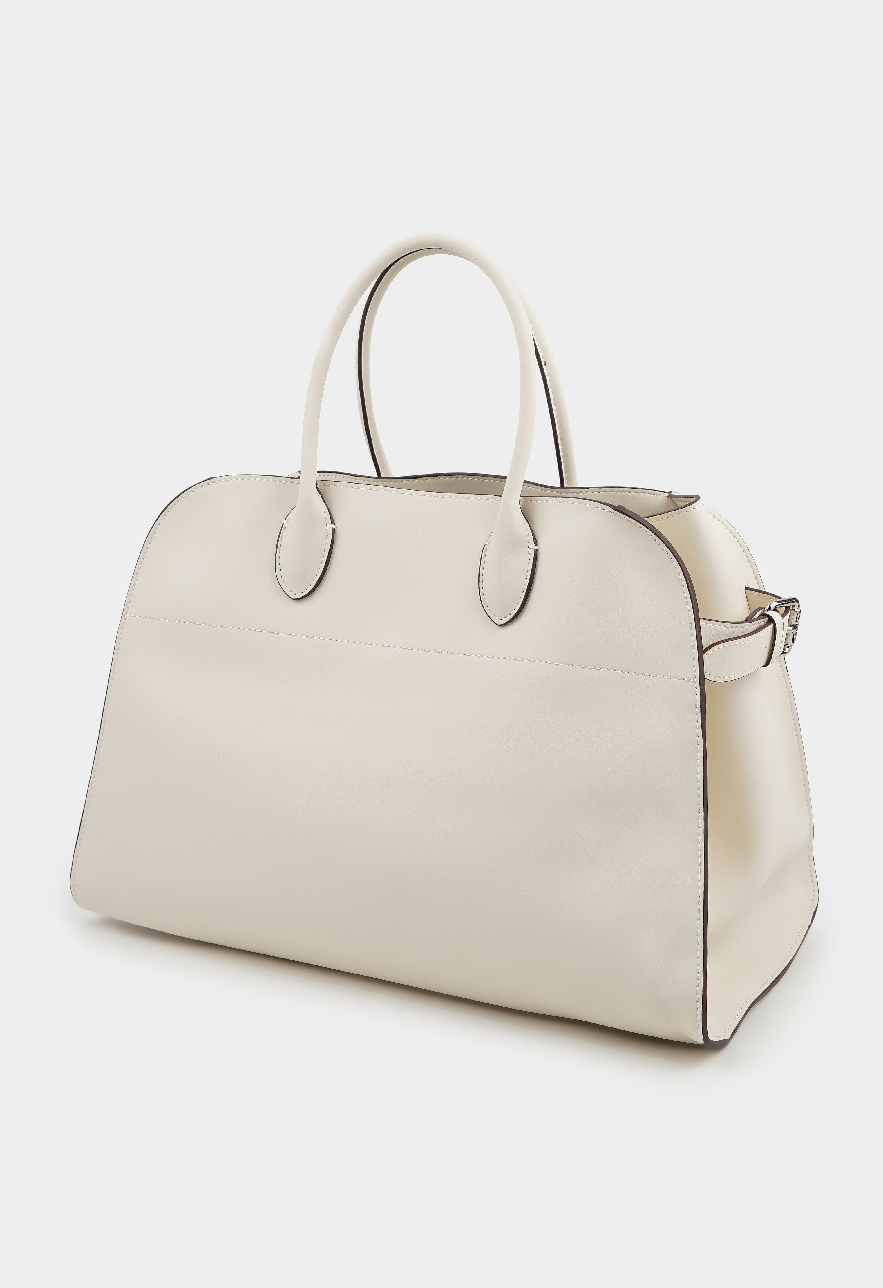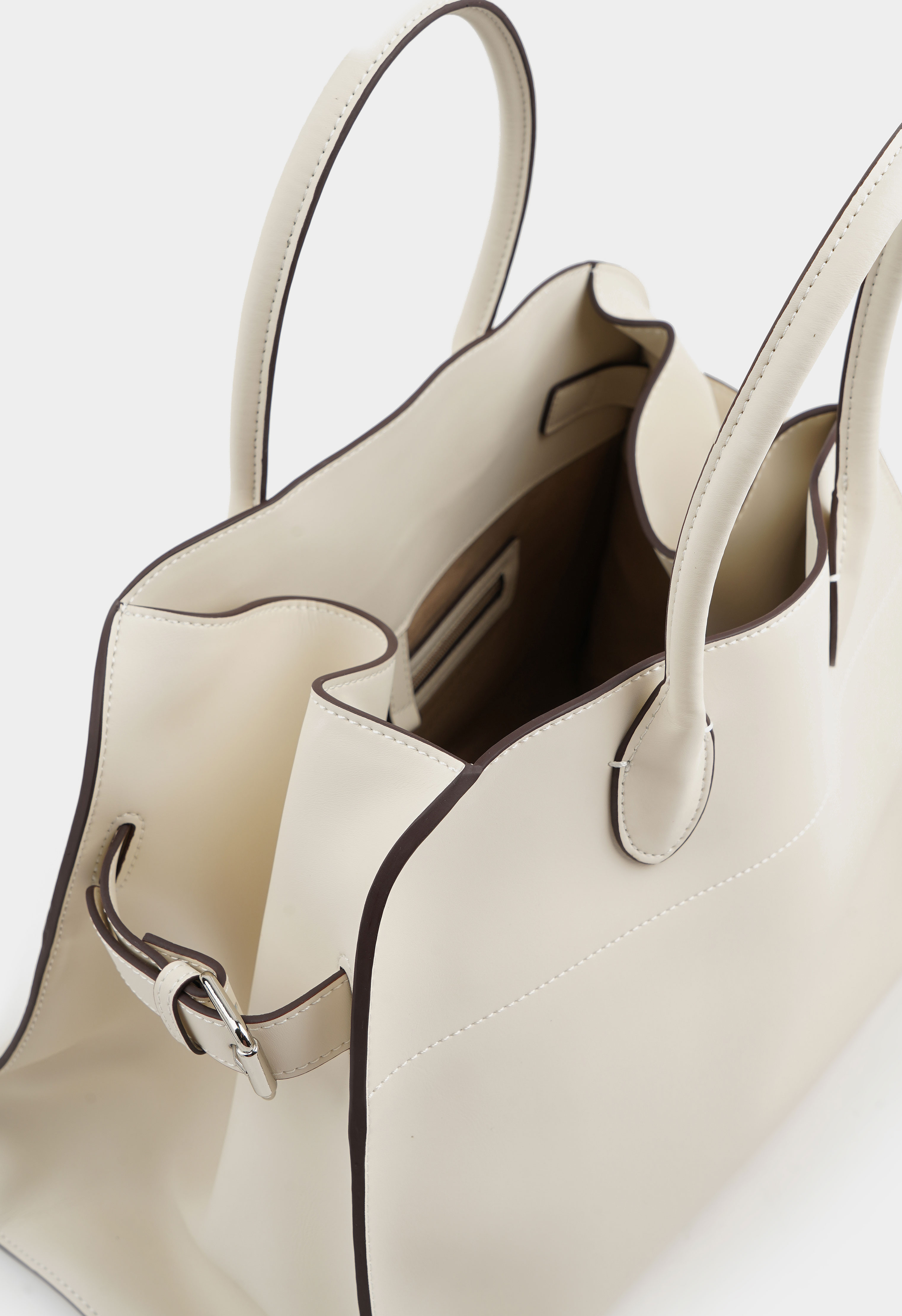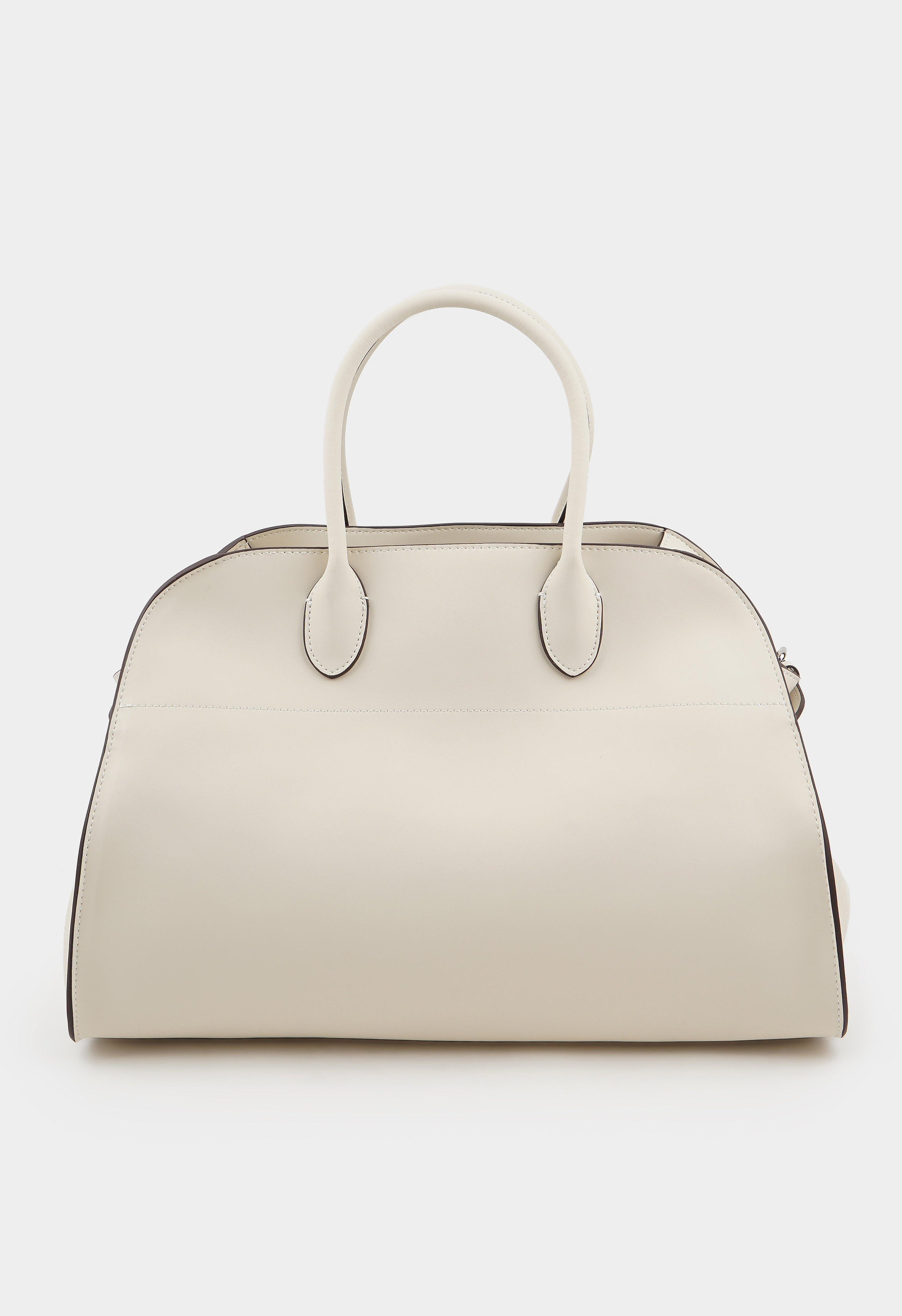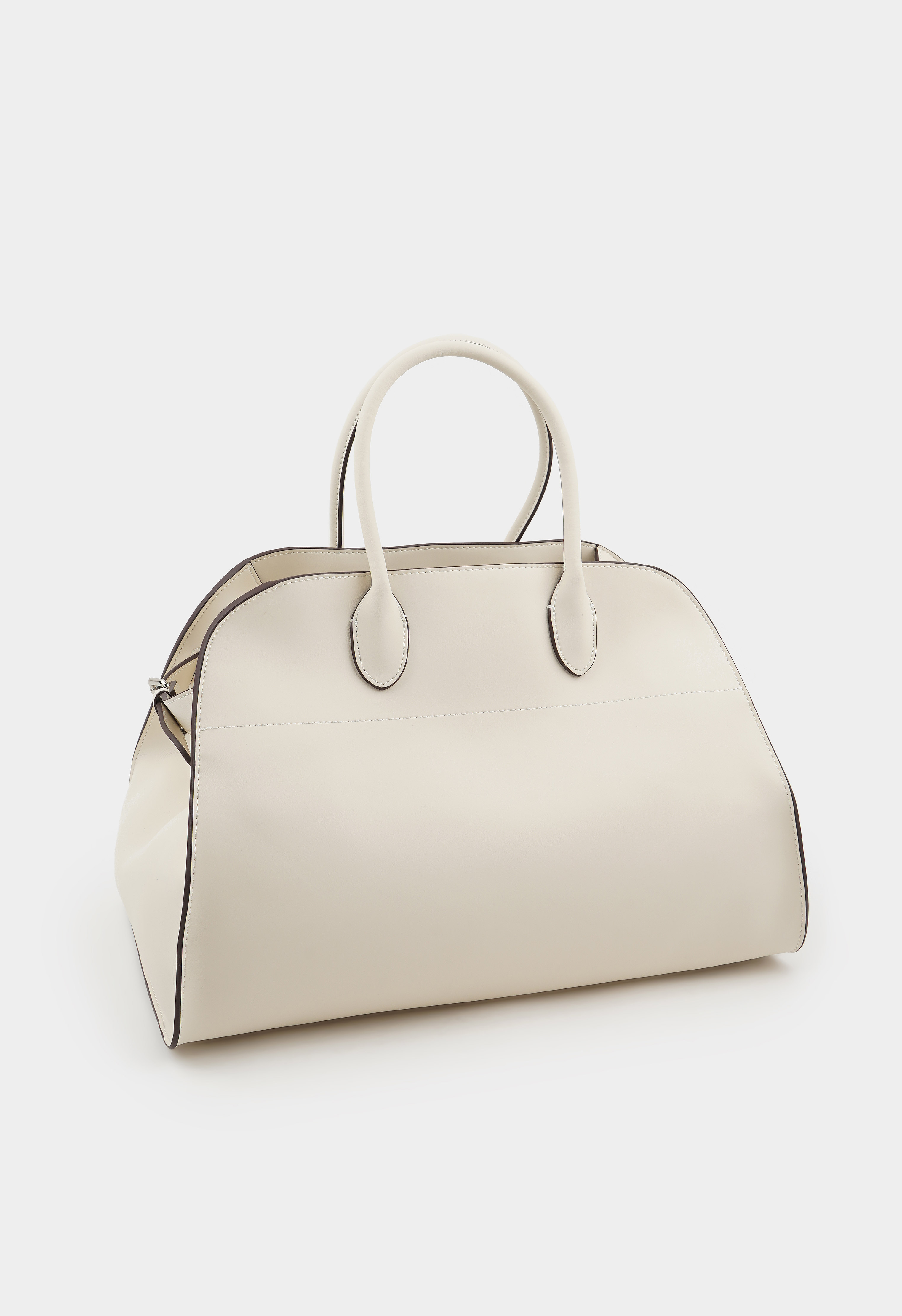 Вместительная сумка из натуральной кожи представлена в молочном цвете. Основное отделение имеет два кармана для мелочей. Модель дополняют серебряная фурнитура и тонкие ручки.