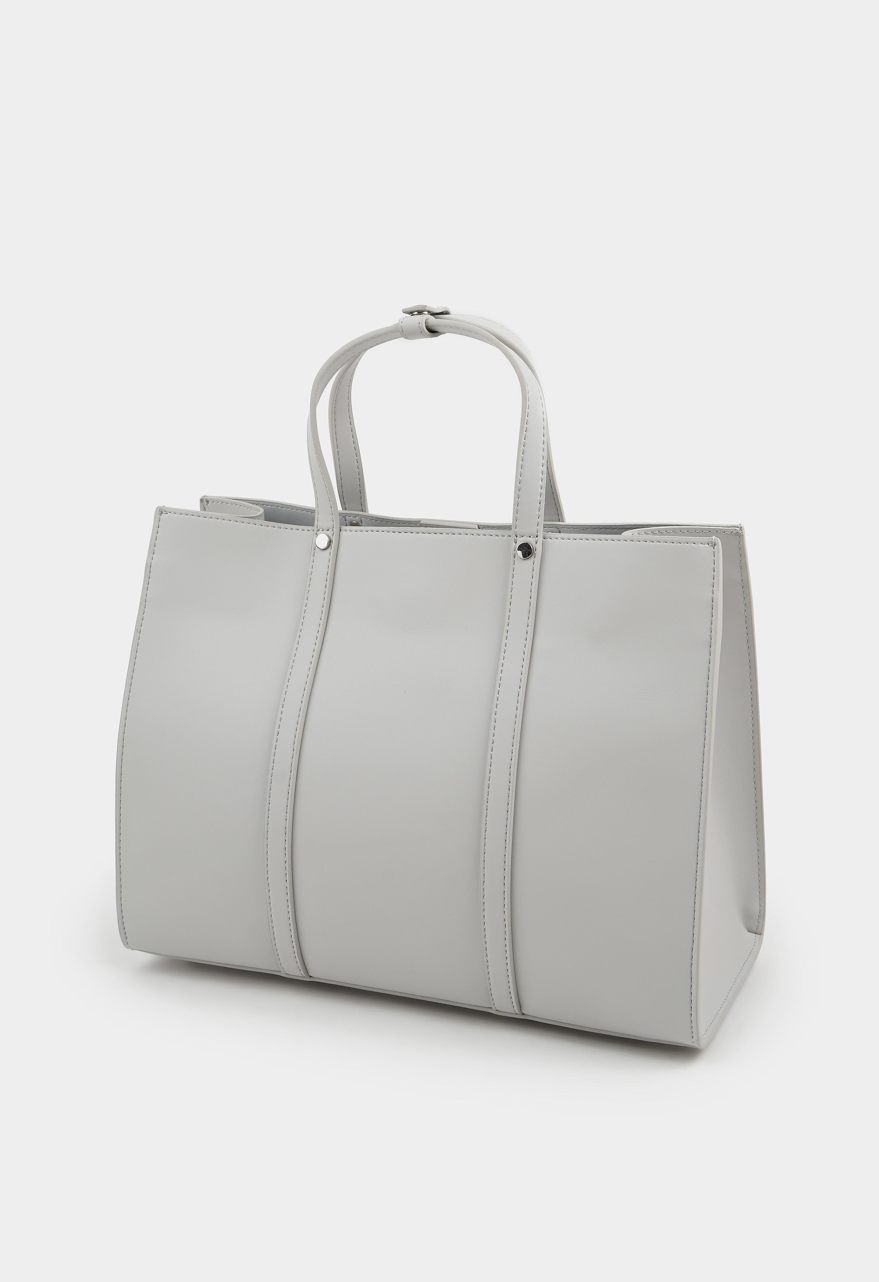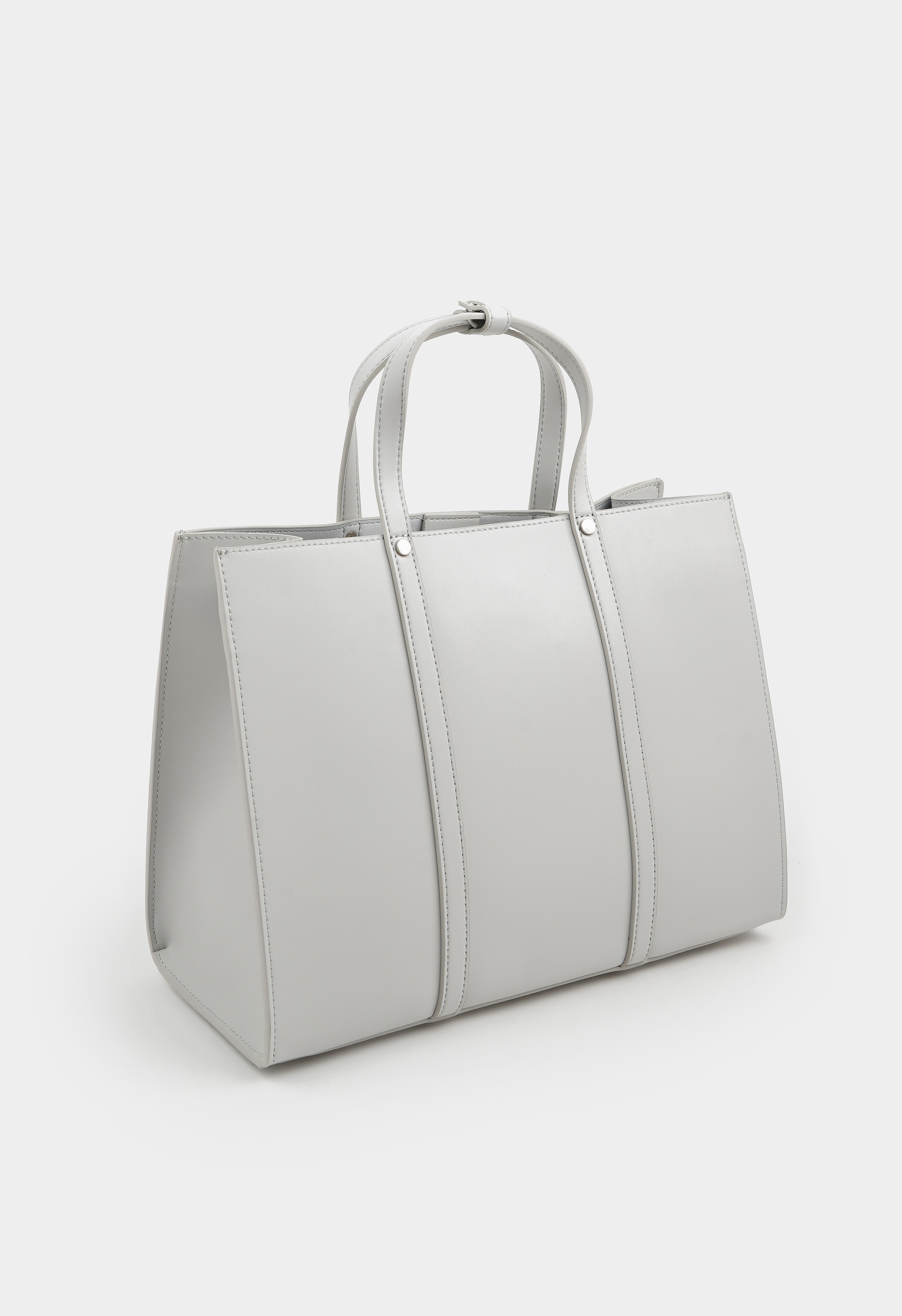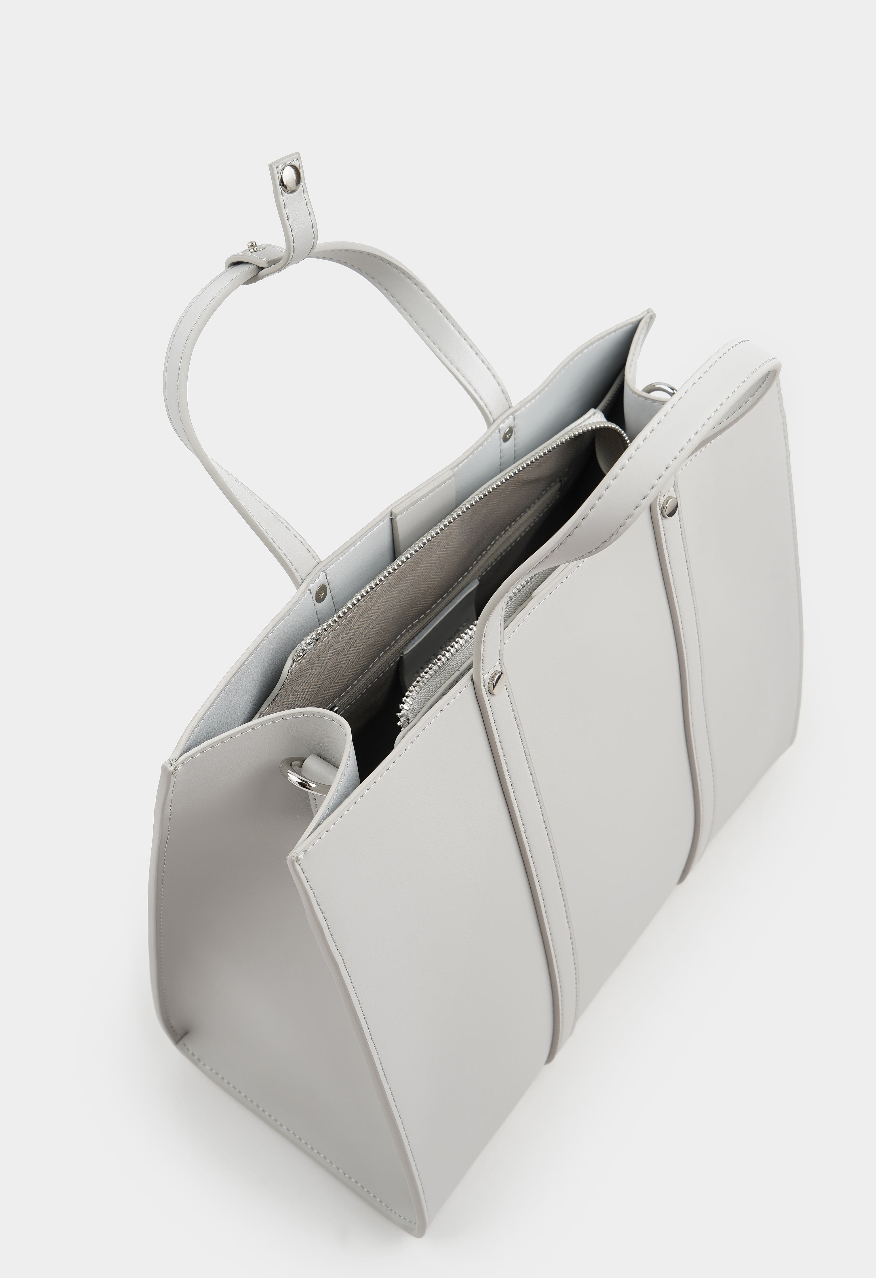 Сумка из натуральной кожи представлена в сером цвете. Основное отделение имеет два кармана для мелочей и застегивается на молнию. Модель подчеркивают короткие ручки и серебряная фурнитура. В комплект входит плечевой ремень.