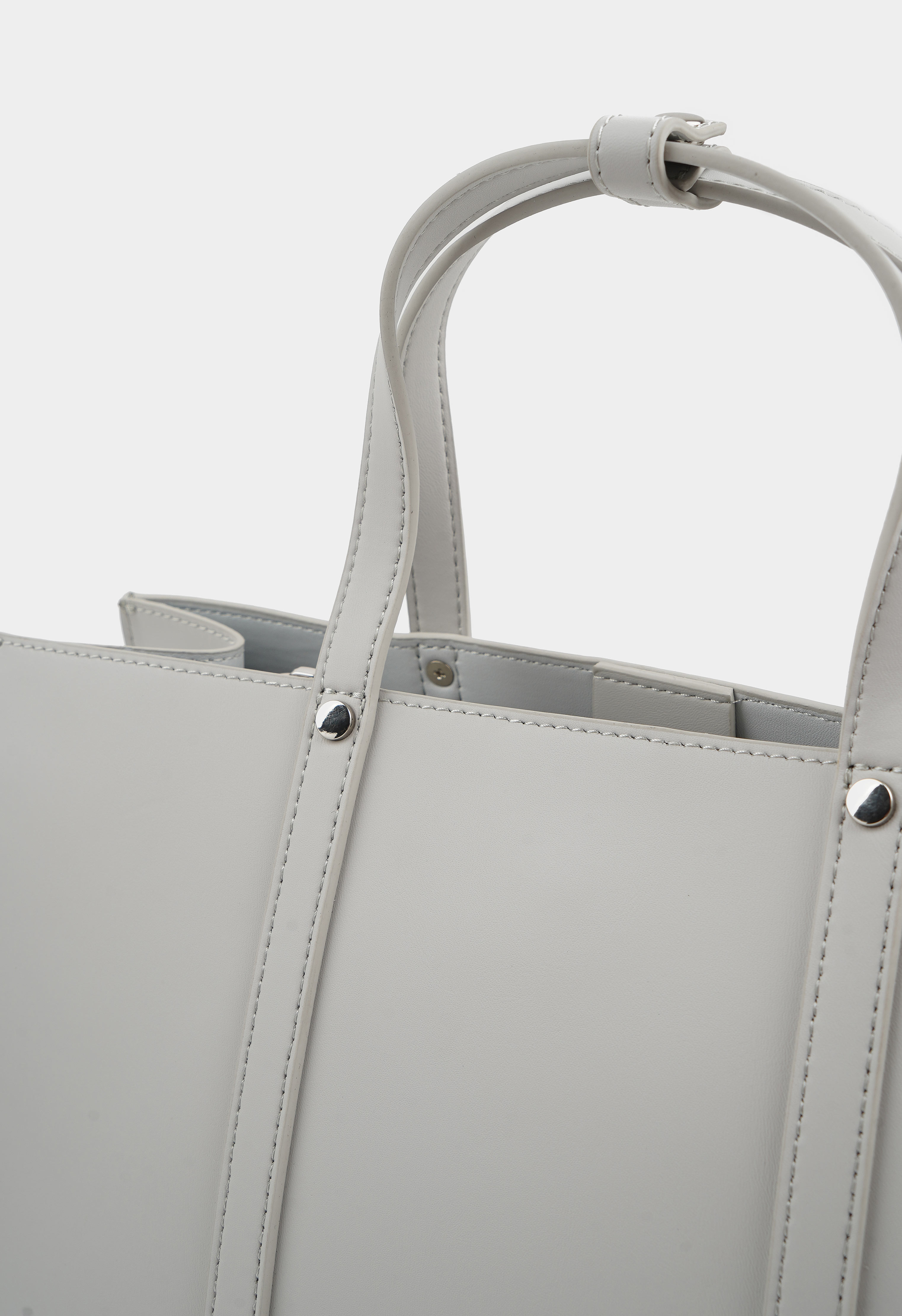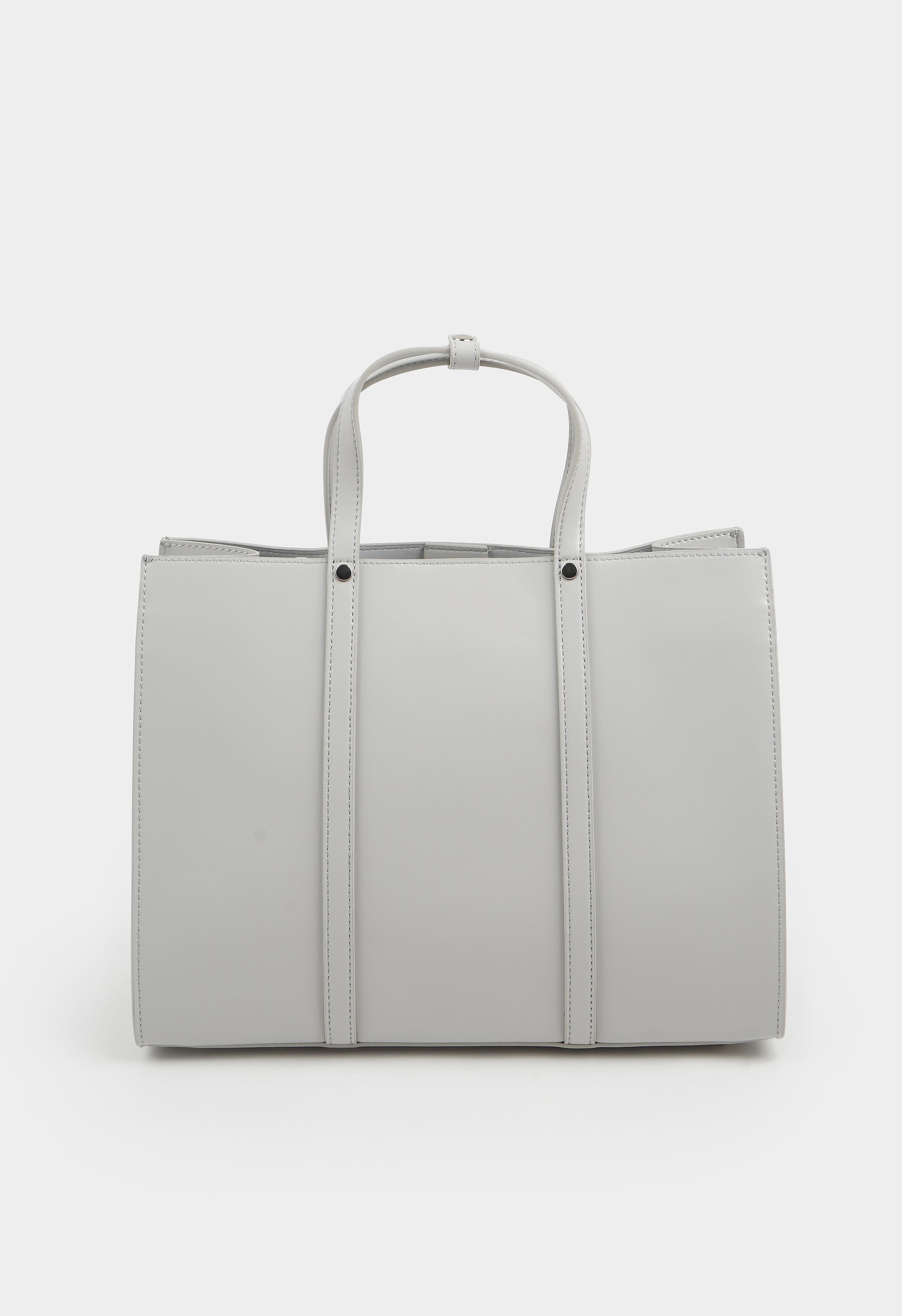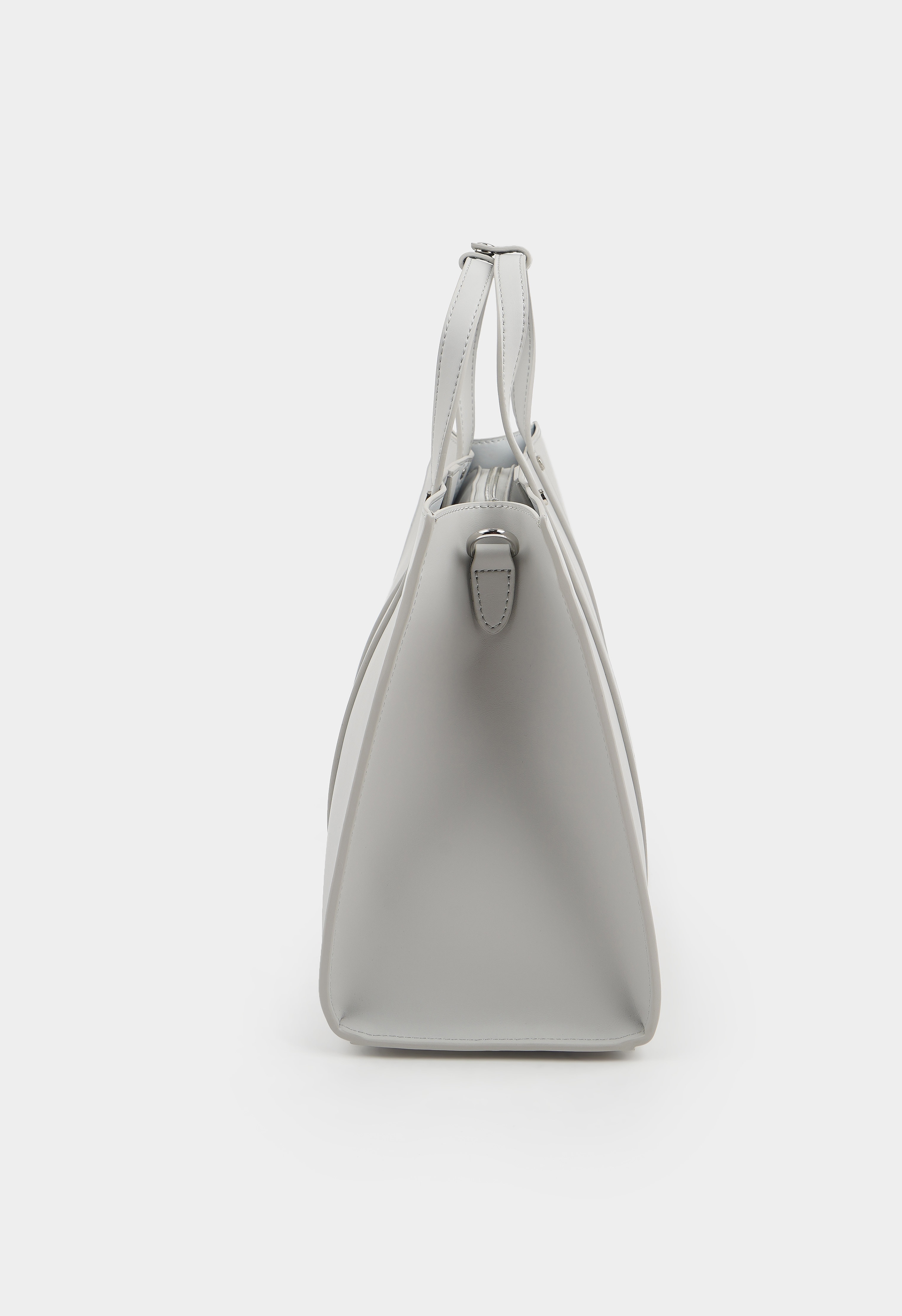 Сумка из натуральной кожи представлена в сером цвете. Основное отделение имеет два кармана для мелочей и застегивается на молнию. Модель подчеркивают короткие ручки и серебряная фурнитура. В комплект входит плечевой ремень.