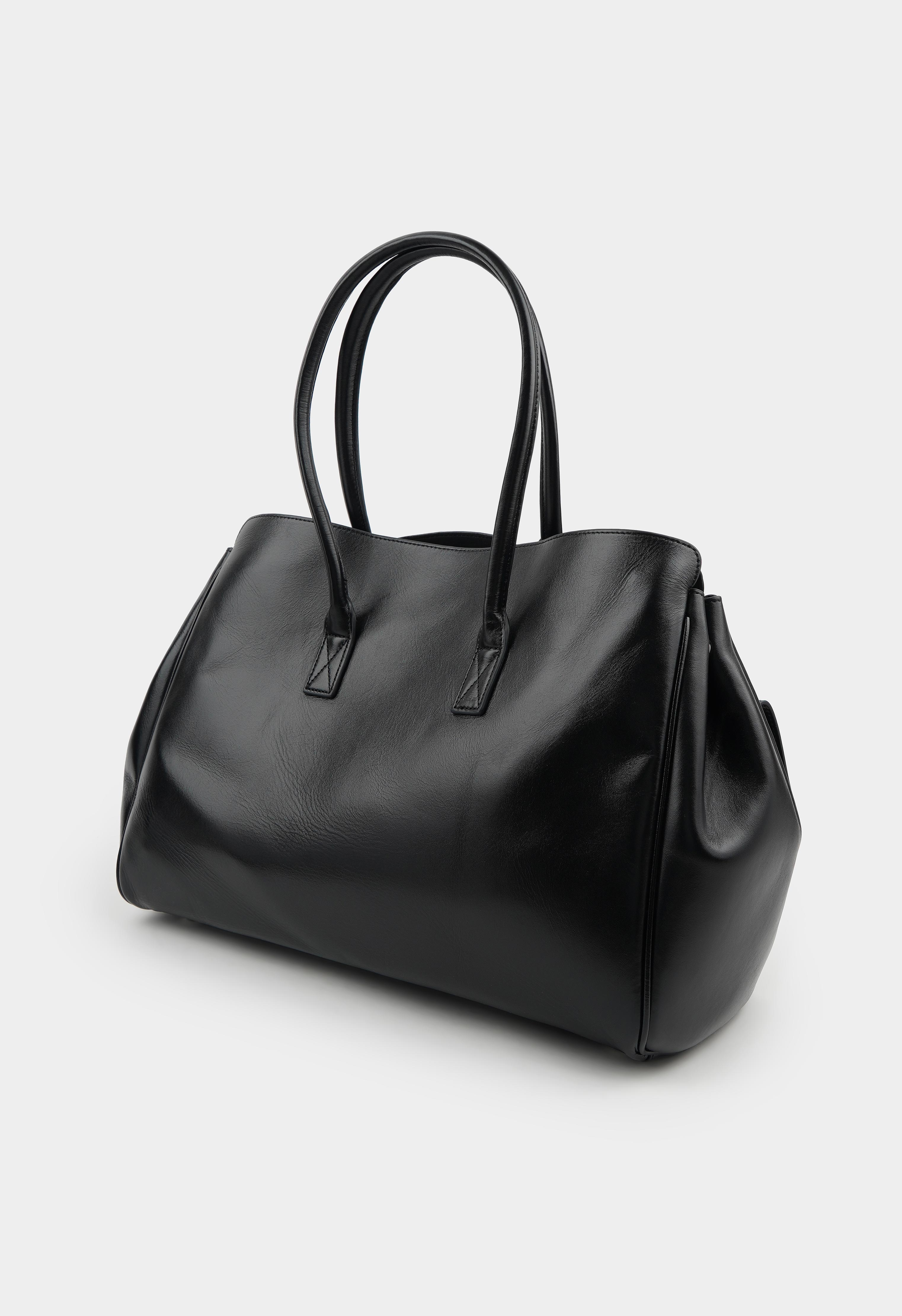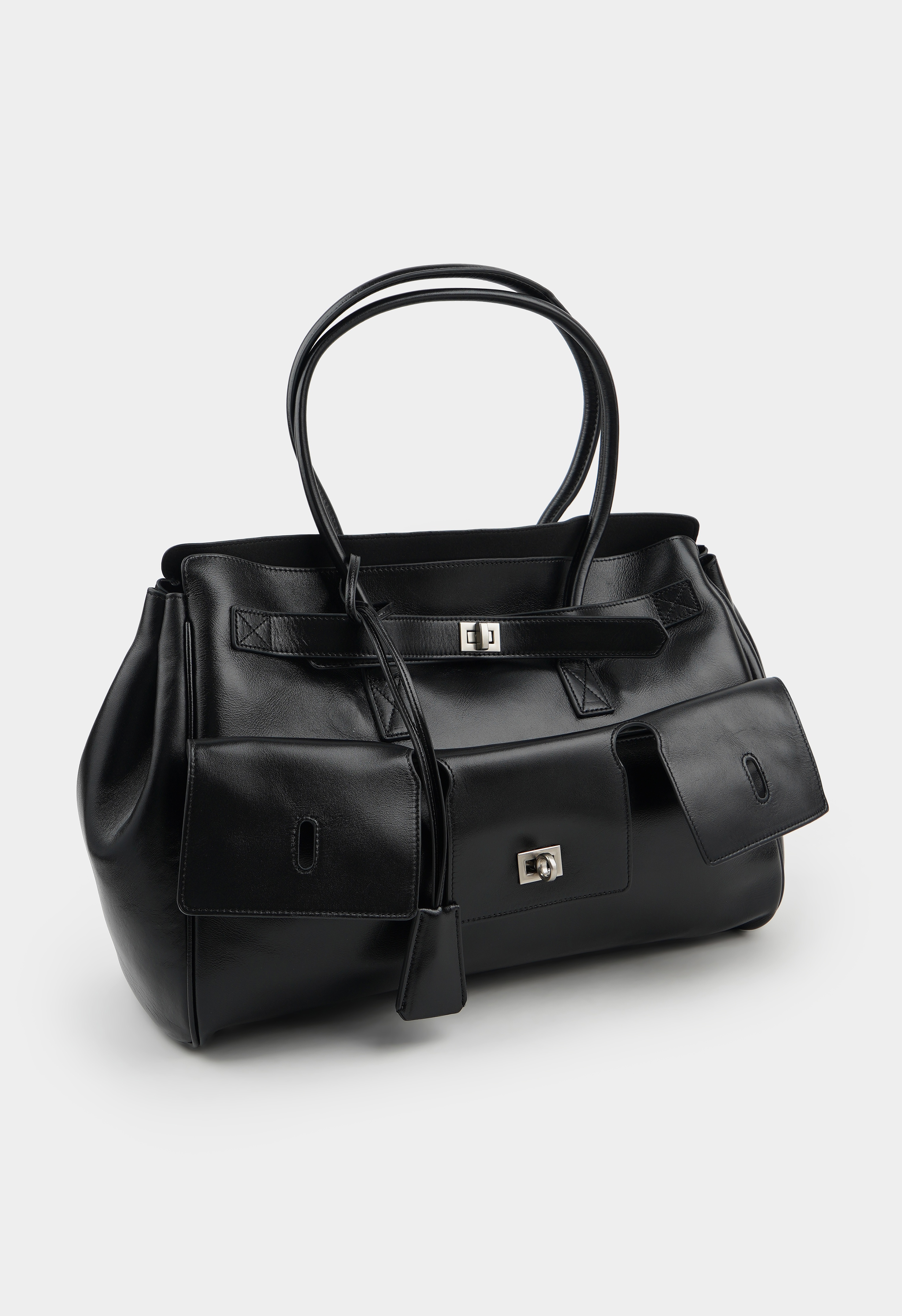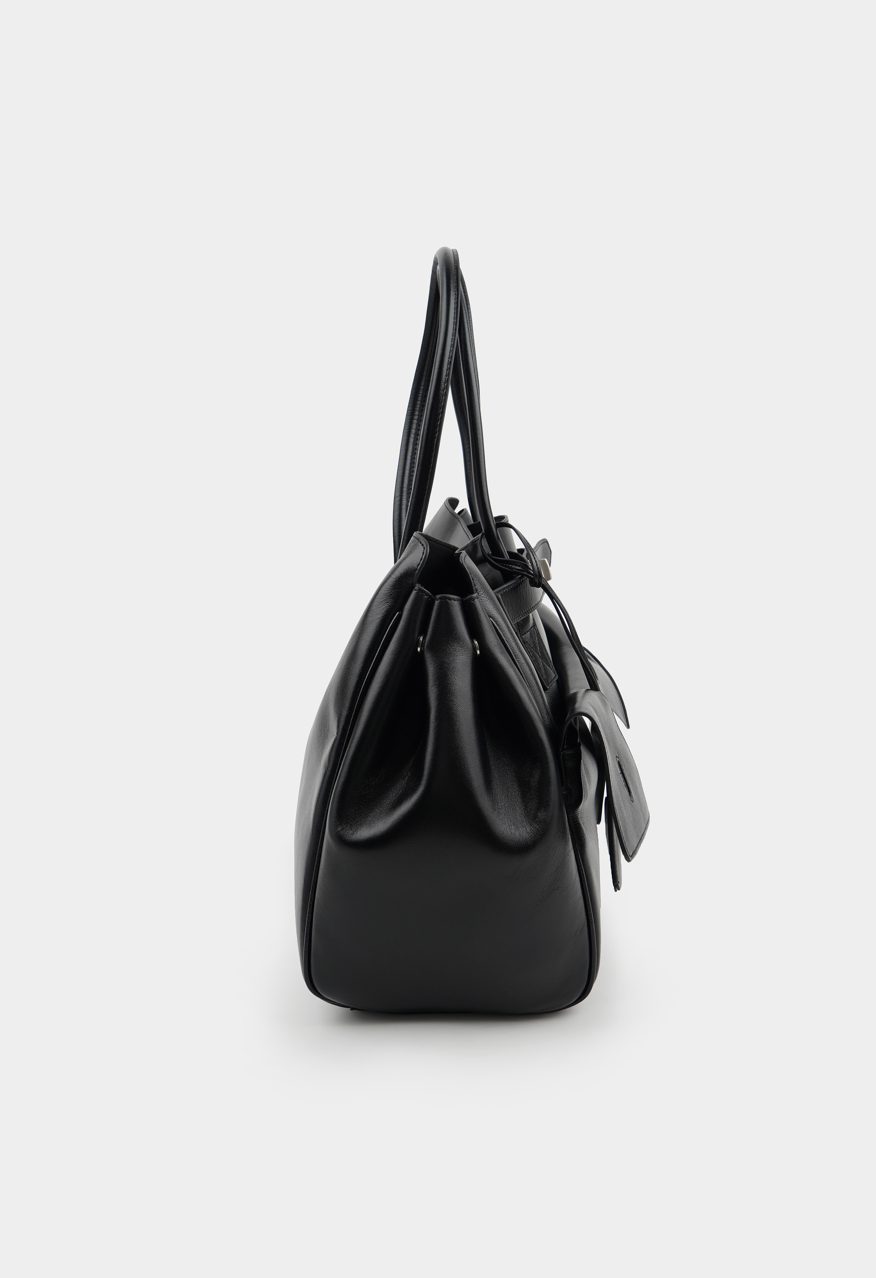 Сумка из натуральной кожи выполнена в черном цвете. Основное отделение имеет два кармана для мелочей. Модель дополняет серебряная фурнитура.