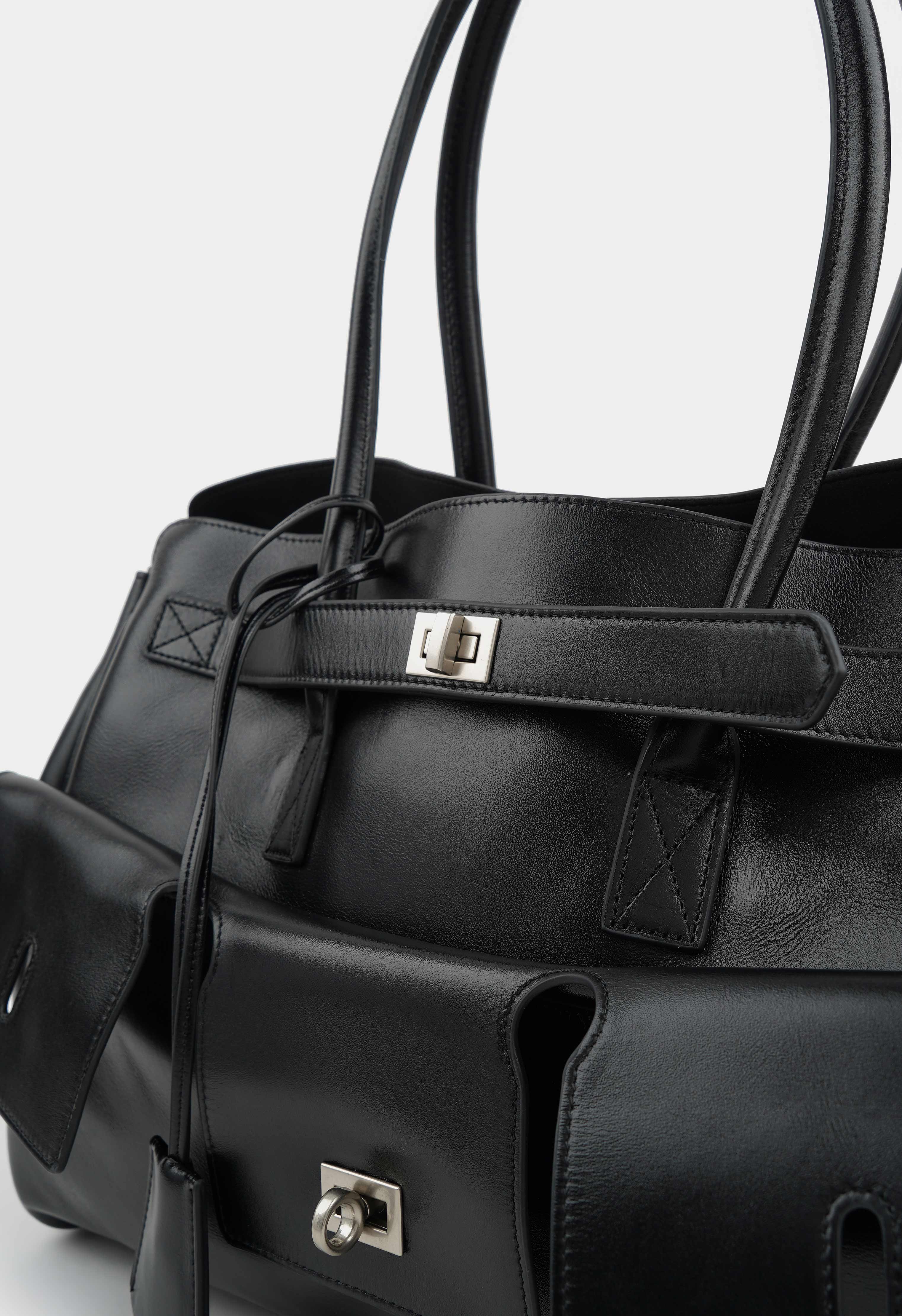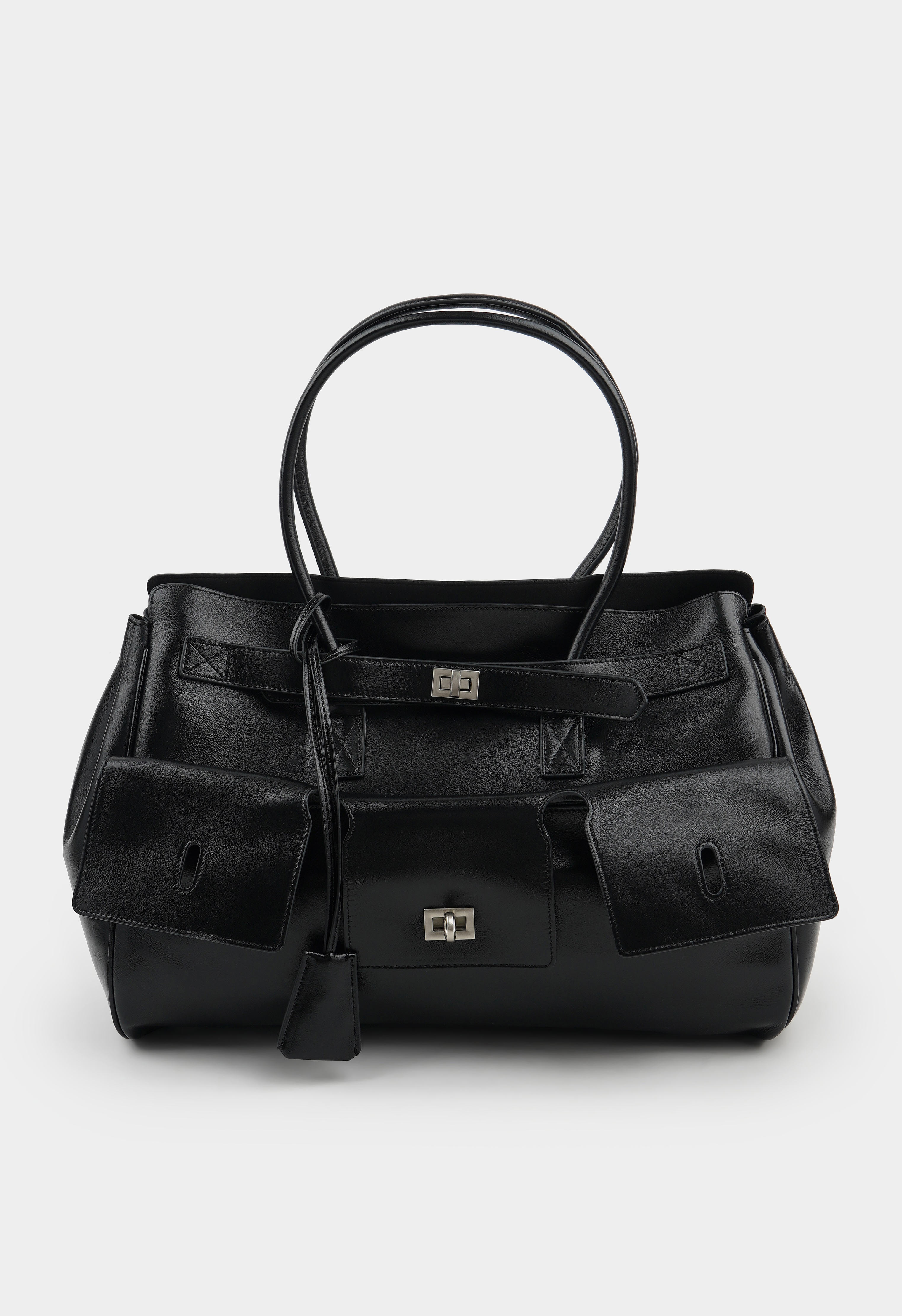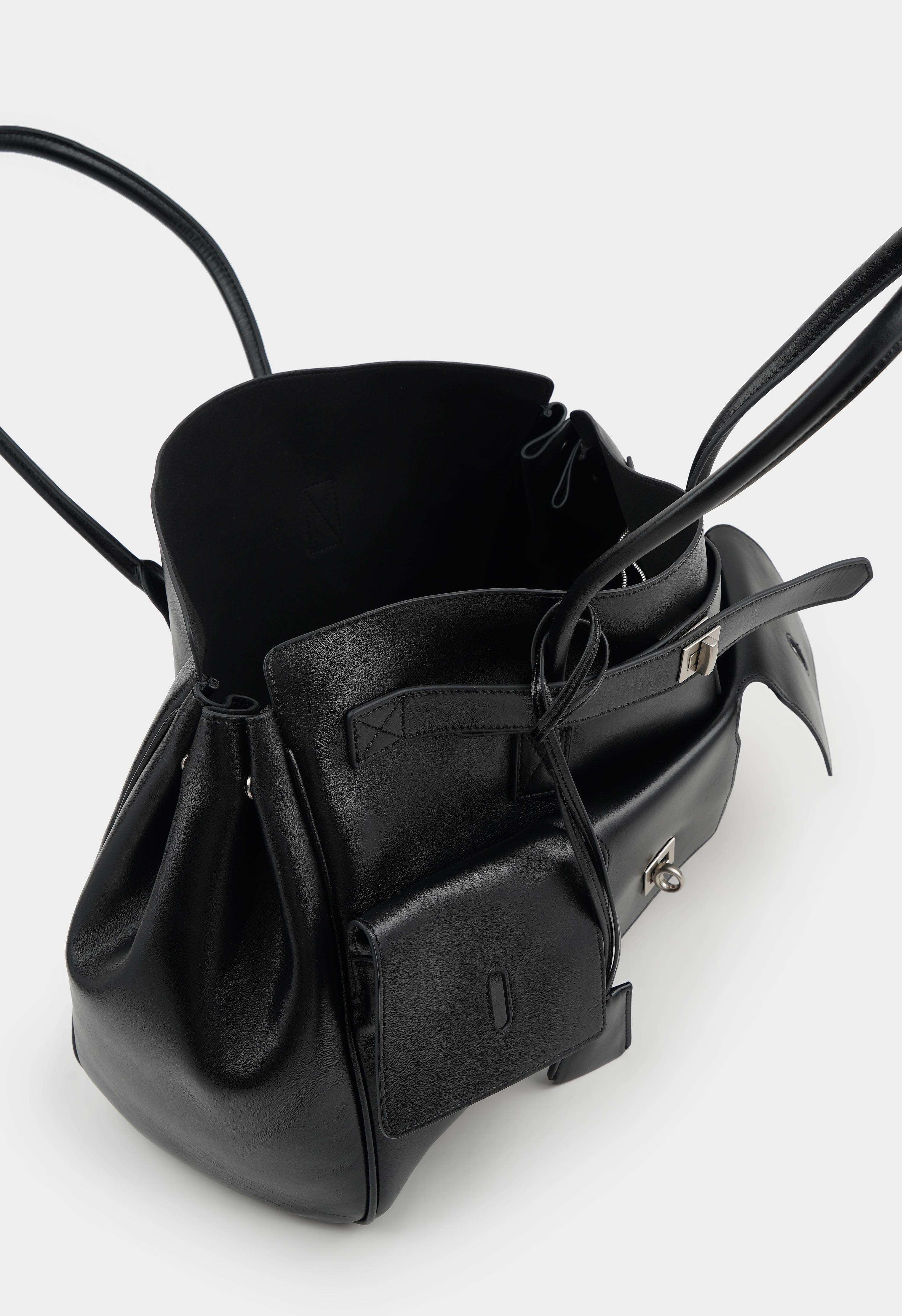 Сумка из натуральной кожи выполнена в черном цвете. Основное отделение имеет два кармана для мелочей. Модель дополняет серебряная фурнитура.