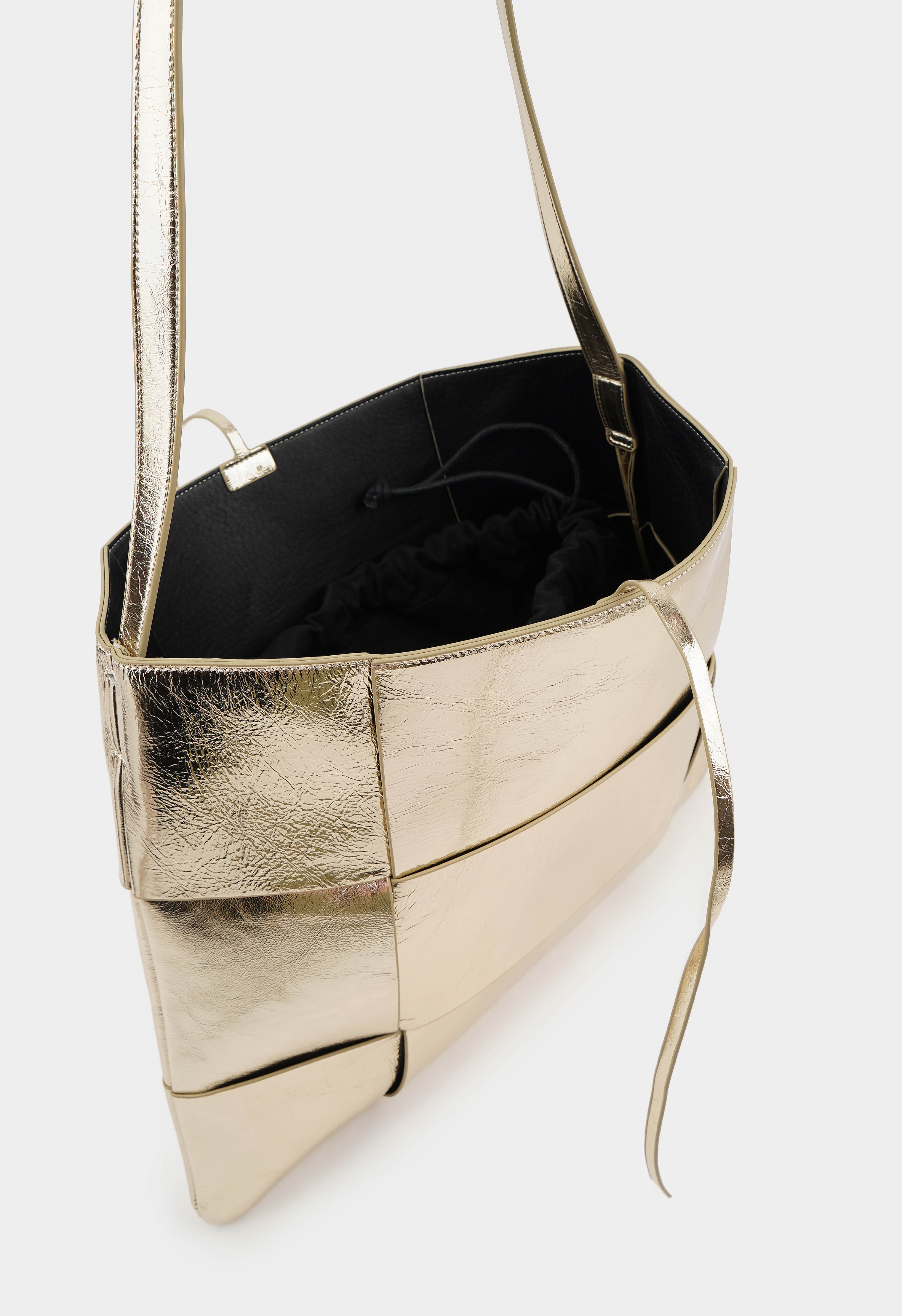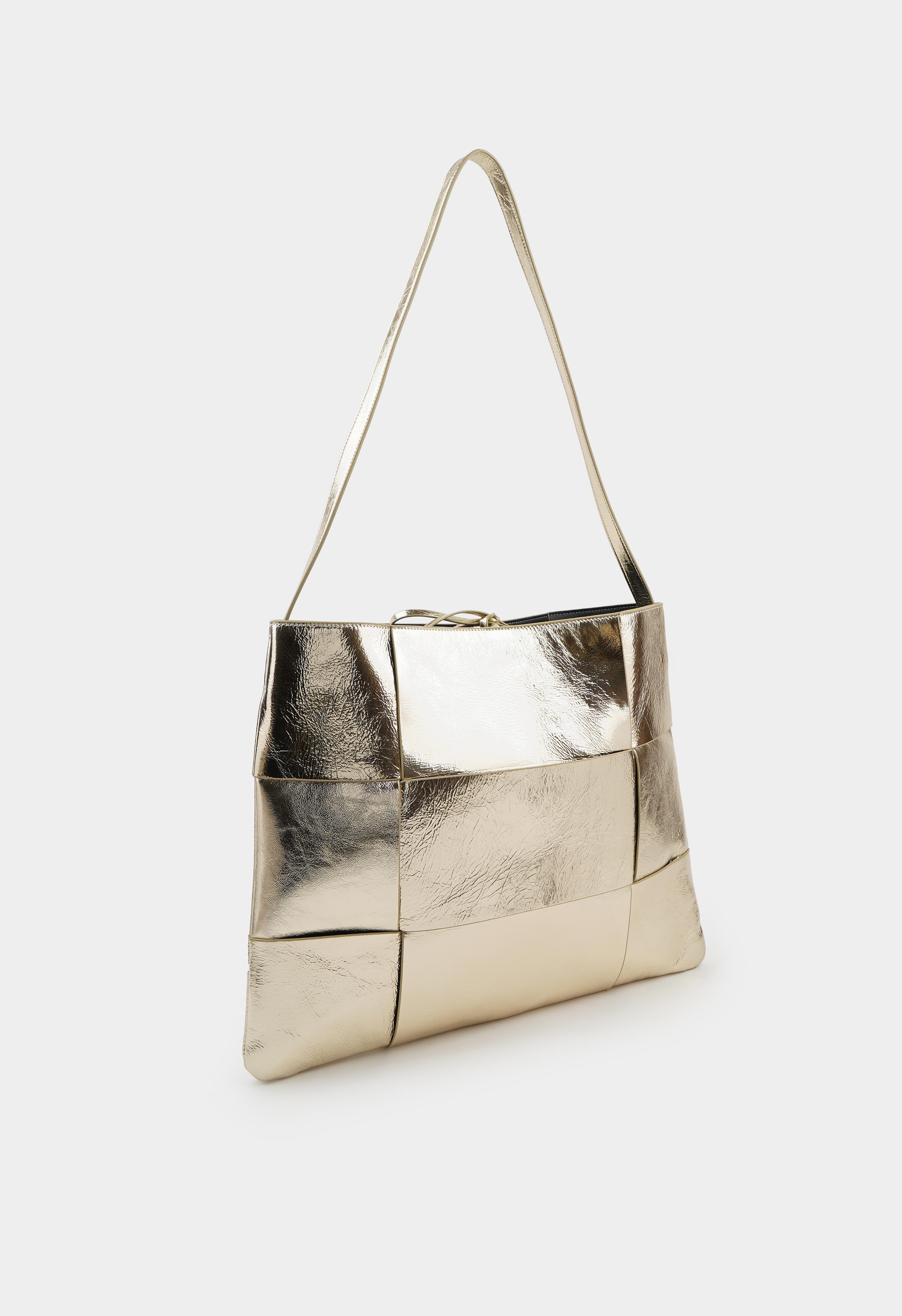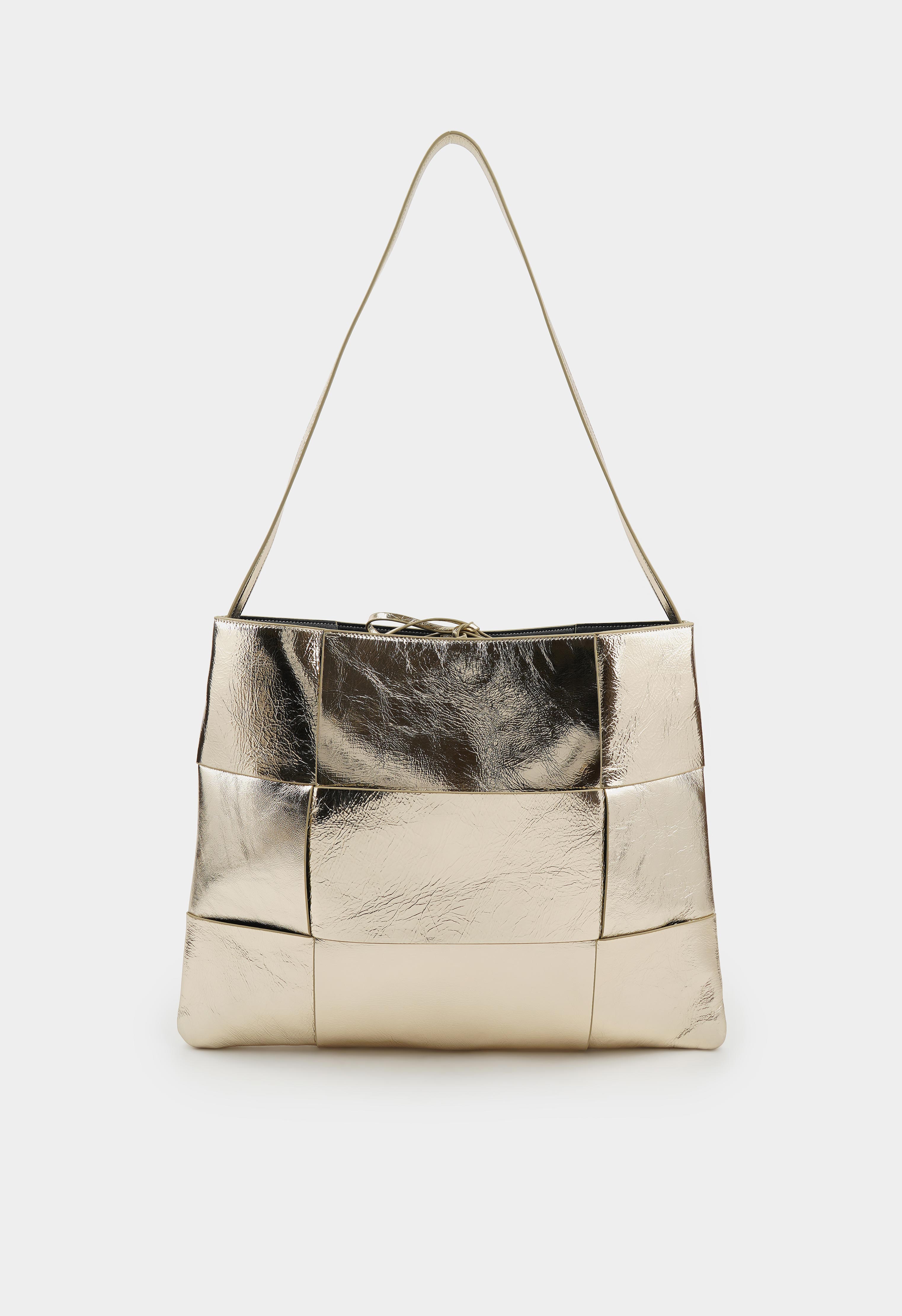Стильная сумка из натуральной кожи в золотом цвете. Основное отделение представлено косметичкой и имеет два кармана для мелочей. Дизайн дополняет длинная ручка.