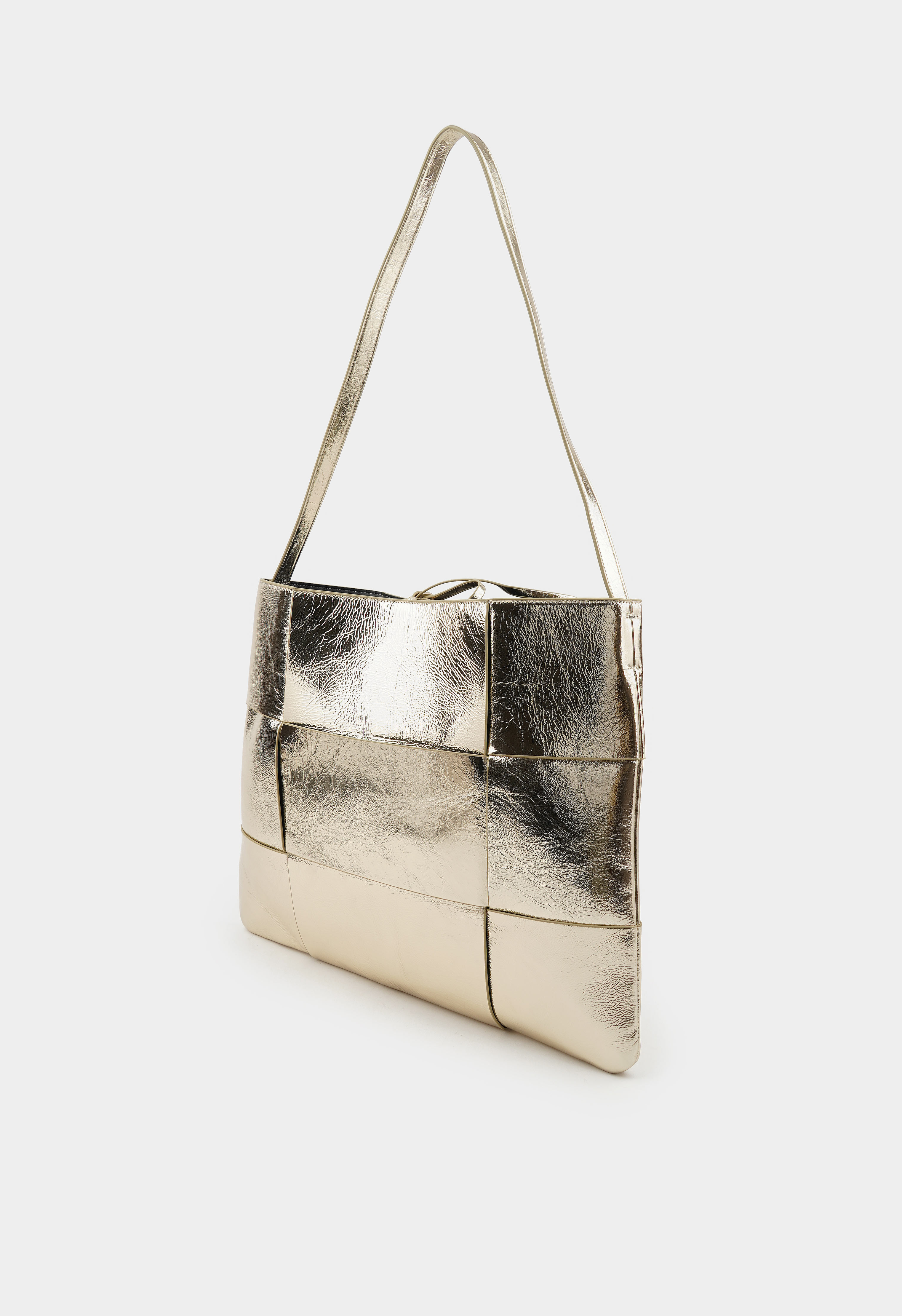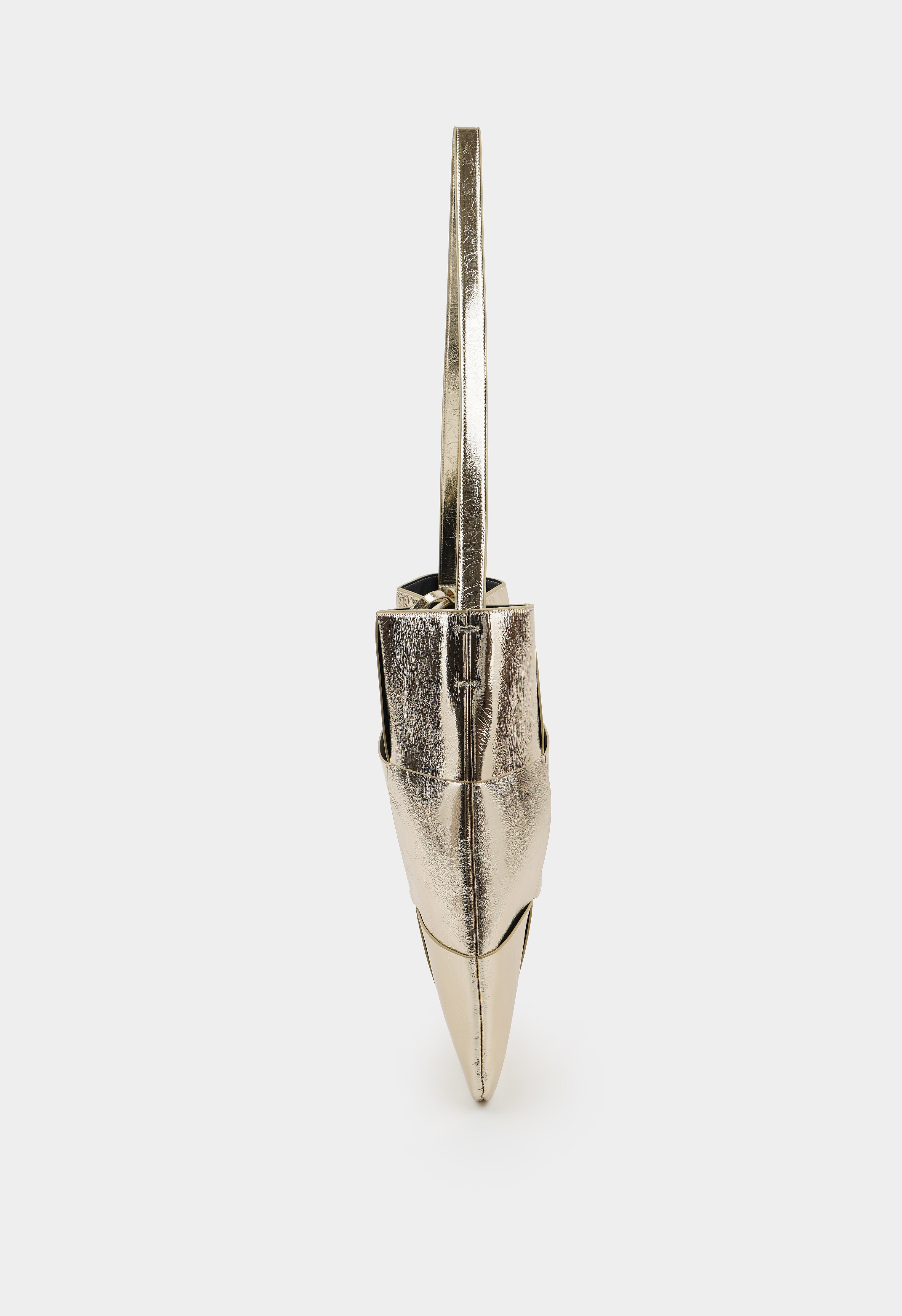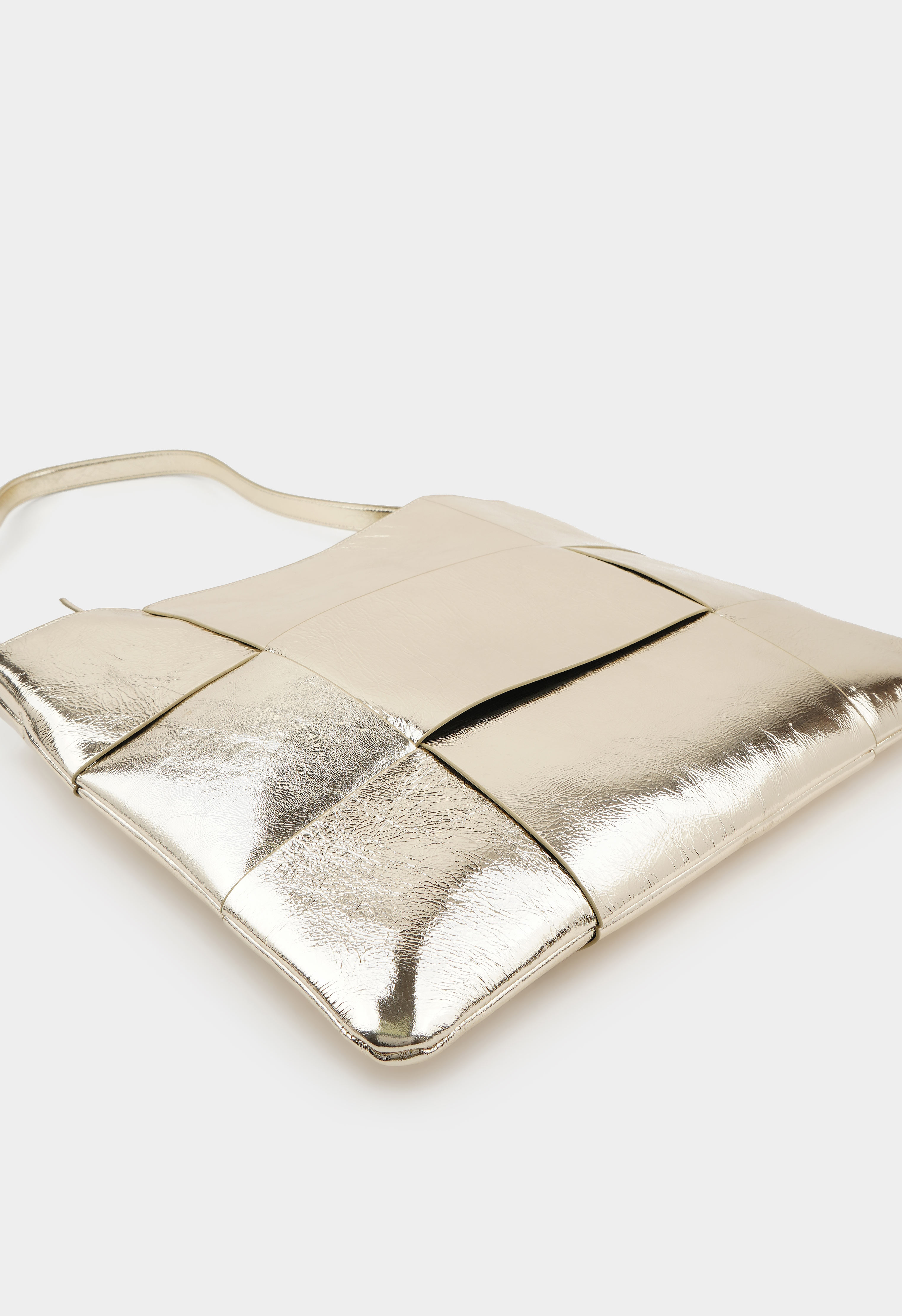 Стильная сумка из натуральной кожи в золотом цвете. Основное отделение представлено косметичкой и имеет два кармана для мелочей. Дизайн дополняет длинная ручка.
