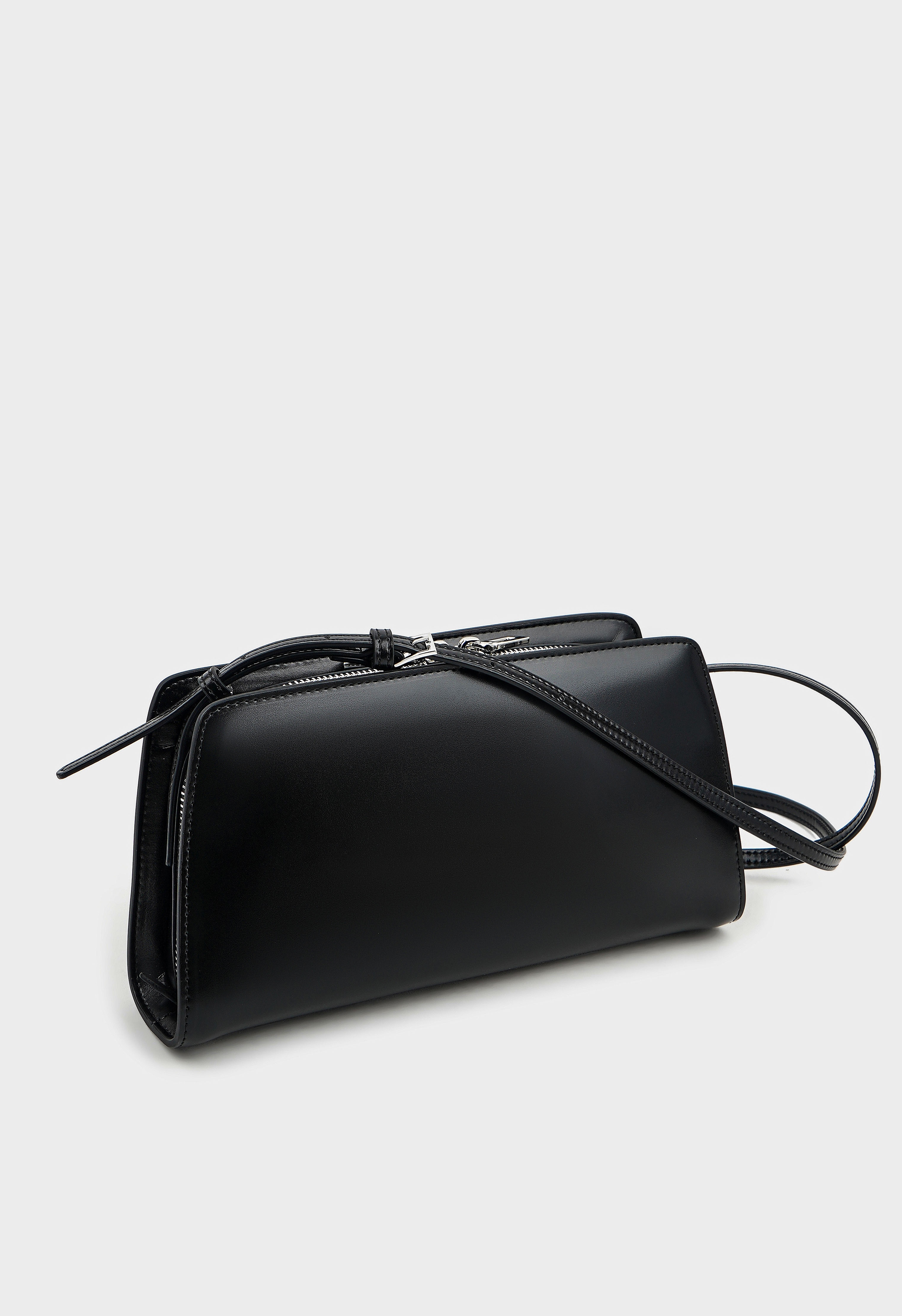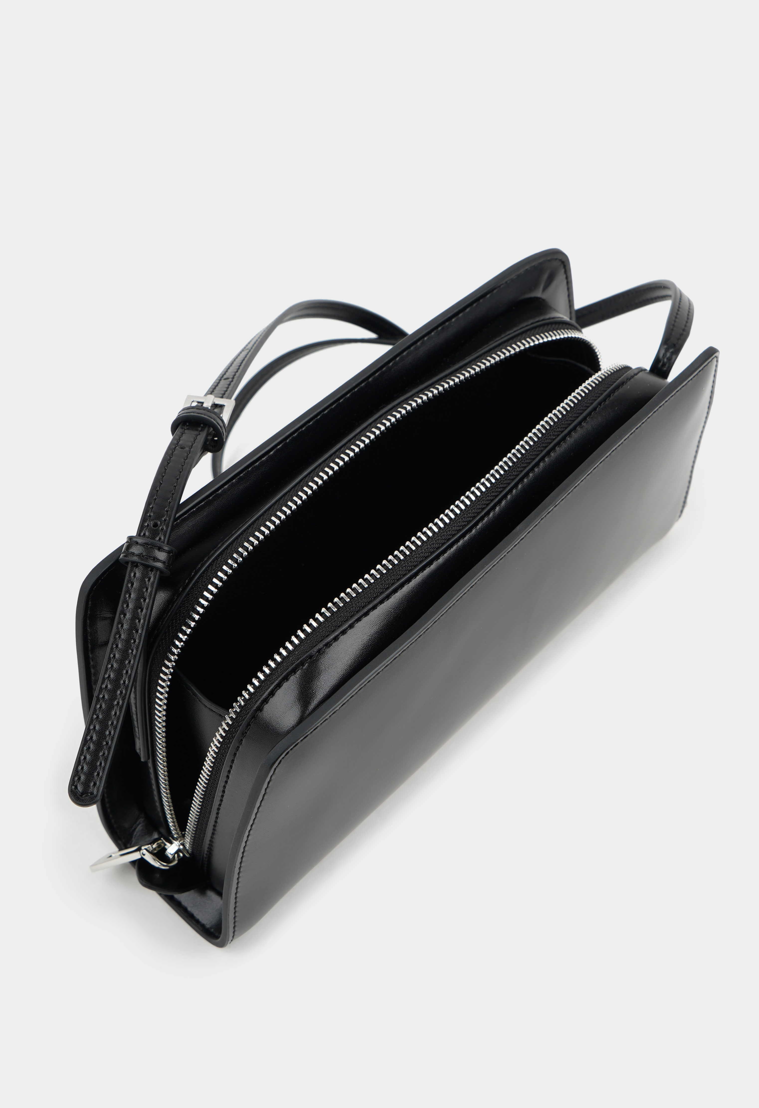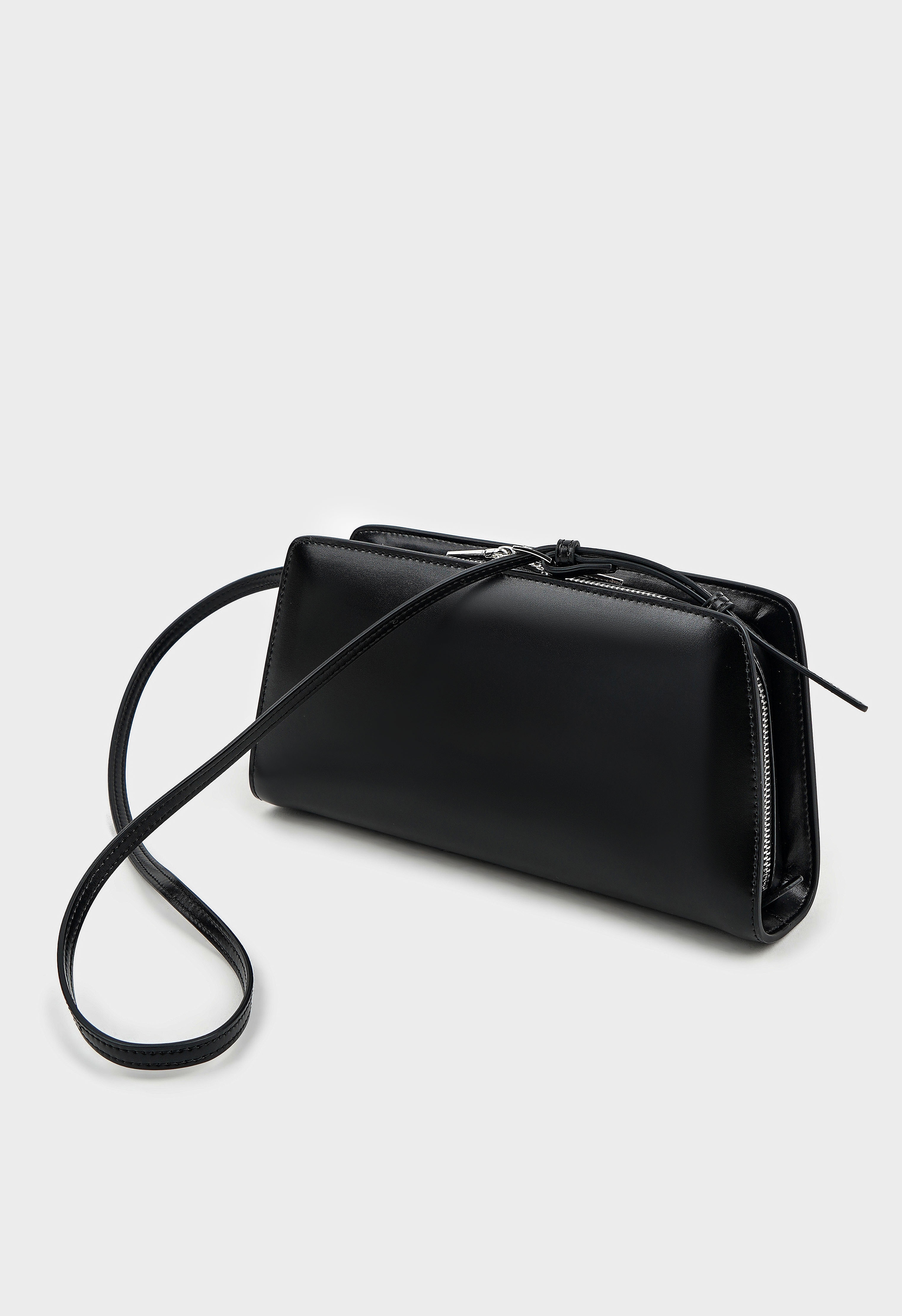 Строгая чёрная сумка из натуральной кожи выгодно подчеркнёт вечерний образ и станет незаменимым украшением гардероба. Для удобства основное отделение содержит один карман для мелочей и застёгивается на молнию. Минималистичный дизайн выгодно дополняет серебряная фурнитура и тонкая регулируемая ручка.