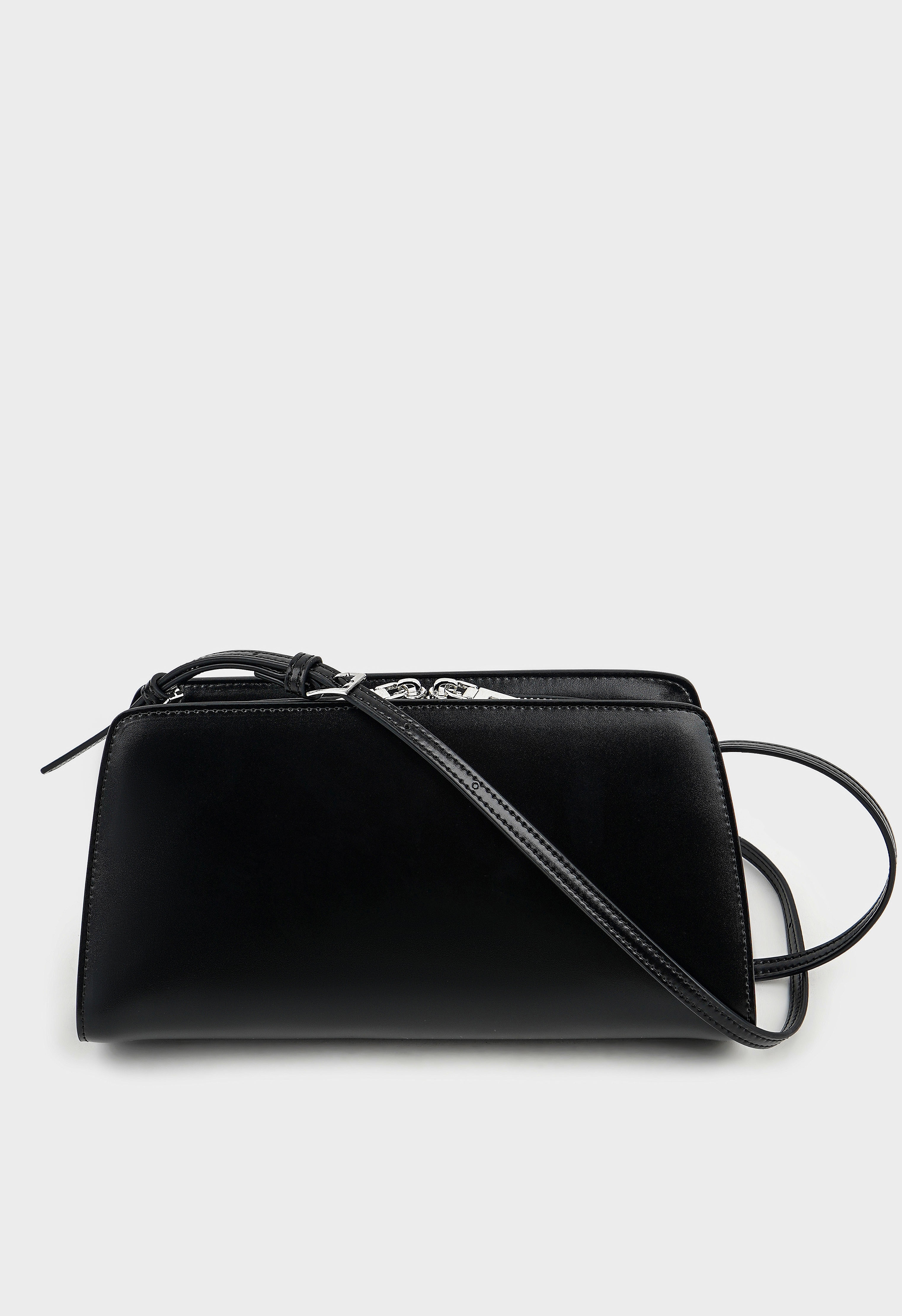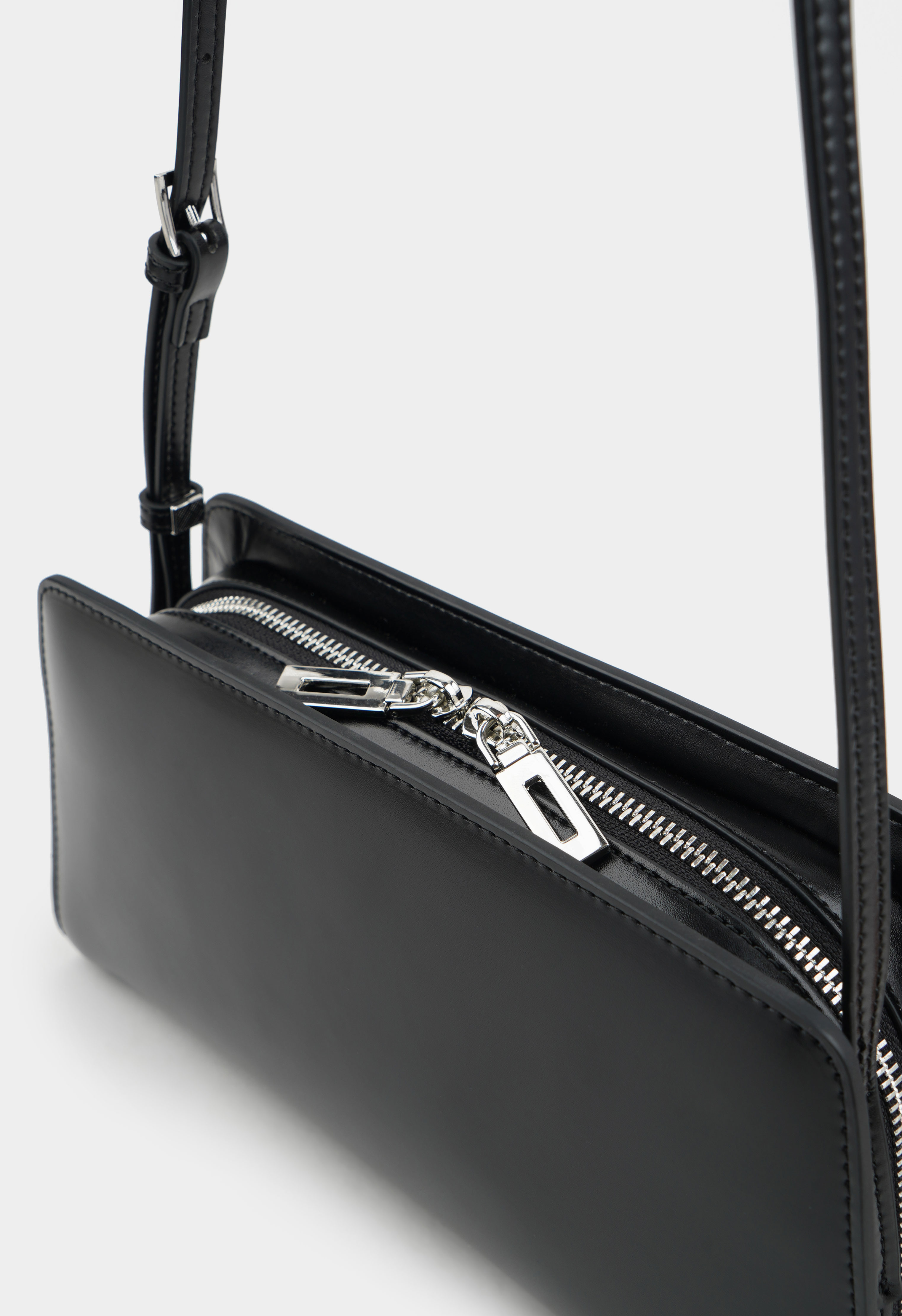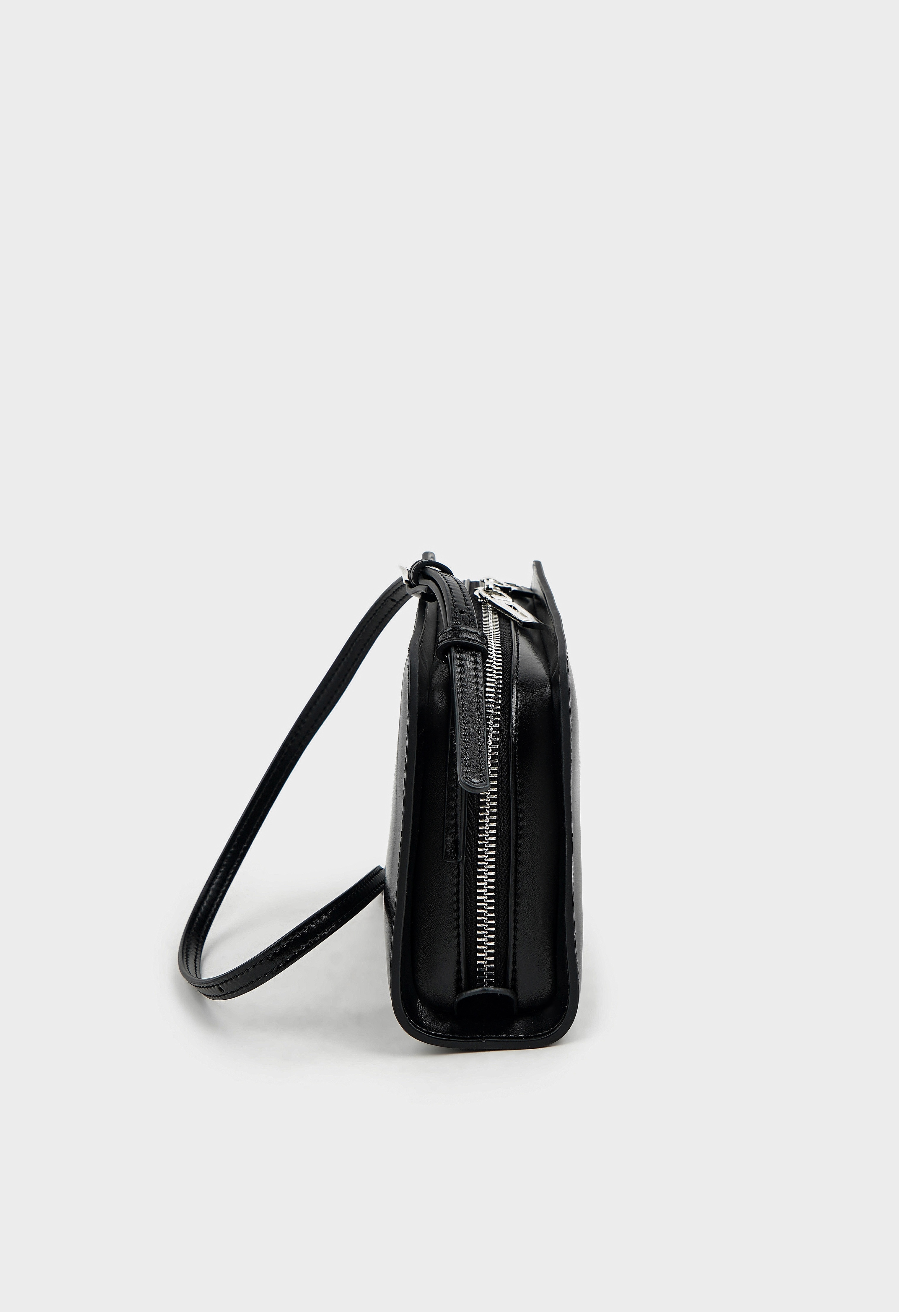 Строгая чёрная сумка из натуральной кожи выгодно подчеркнёт вечерний образ и станет незаменимым украшением гардероба. Для удобства основное отделение содержит один карман для мелочей и застёгивается на молнию. Минималистичный дизайн выгодно дополняет серебряная фурнитура и тонкая регулируемая ручка.
