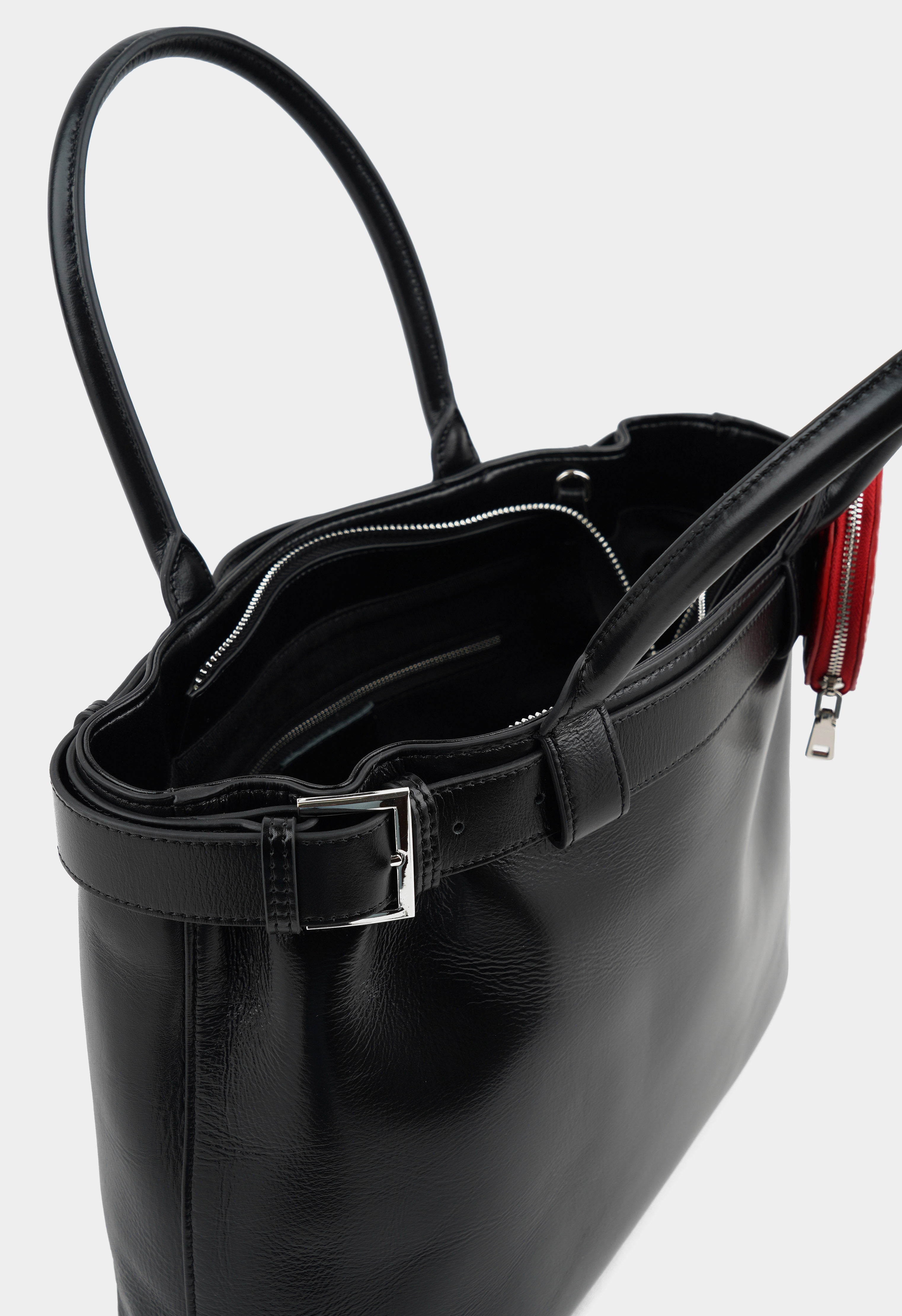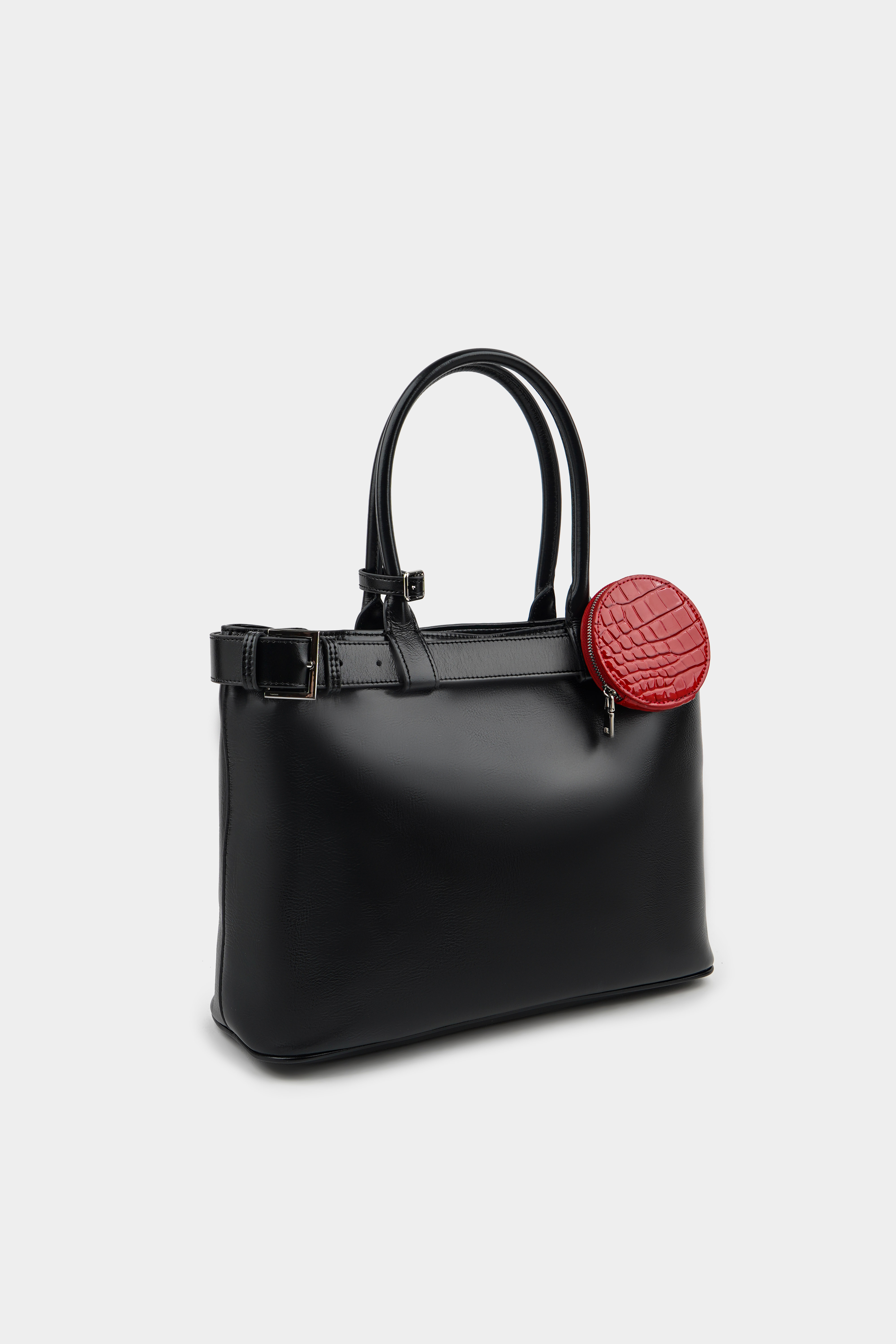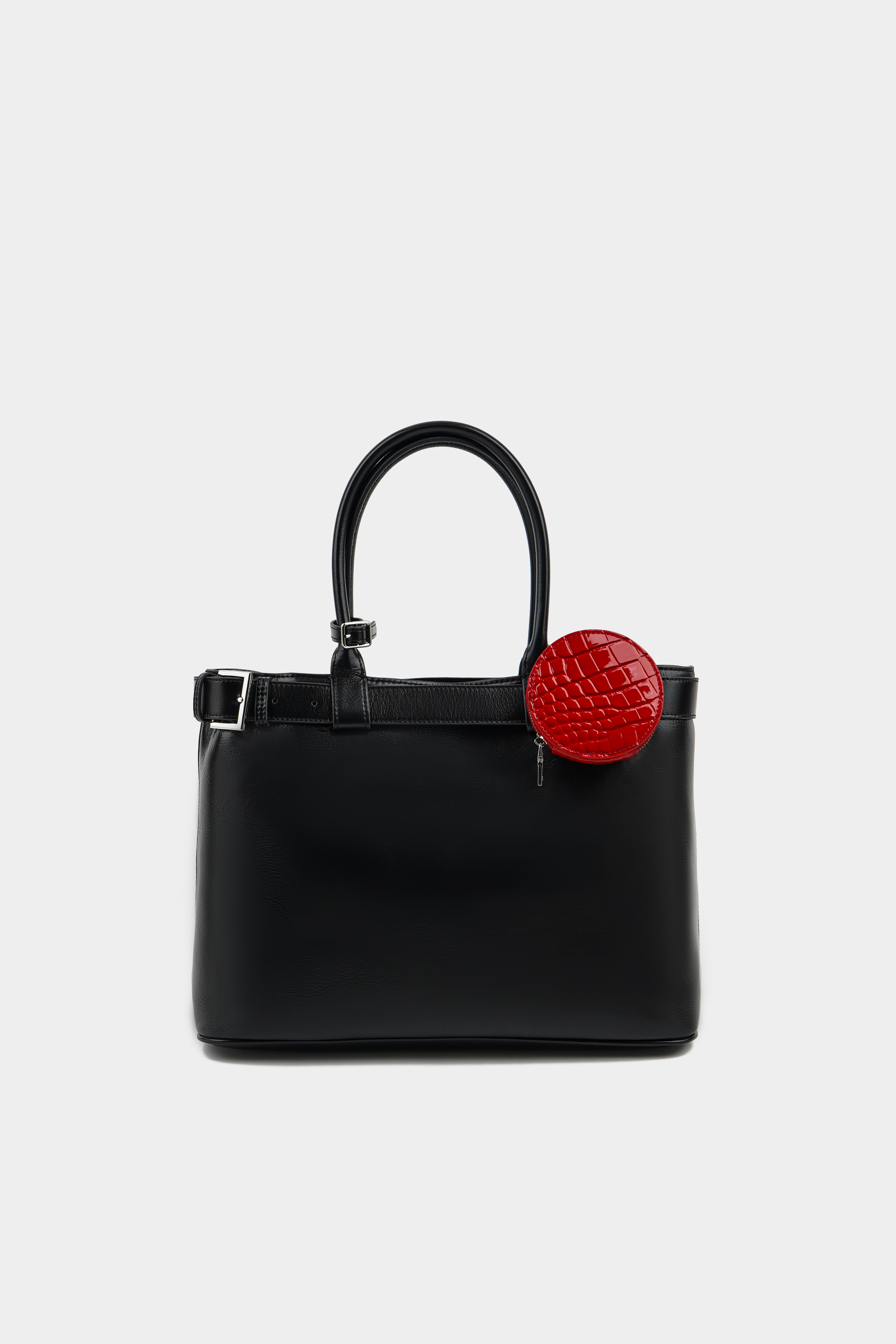 Вместительная чёрная сумка из кожи – сочетание стиля и практичности в одной модели. Основное отделение содержит два кармана для мелочей и застёгивается на плавную молнию. С помощью кожаного ремешка с пряжкой и красного кошелёчка дизайн модели хочется рассматривать до каждой малейшей детали. Плечевой ремень идёт в комплекте, с ним сумку можно носить с комфортом.