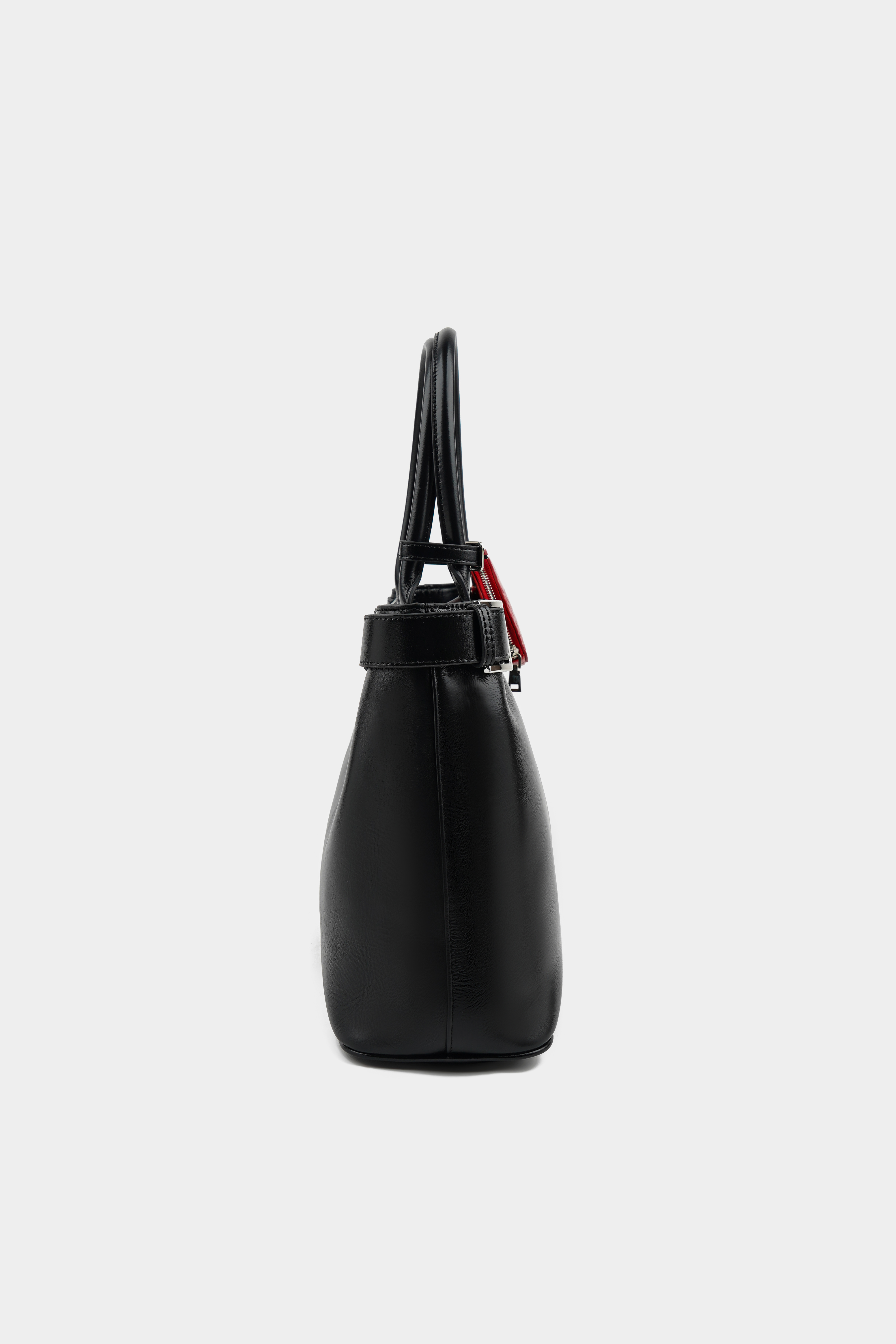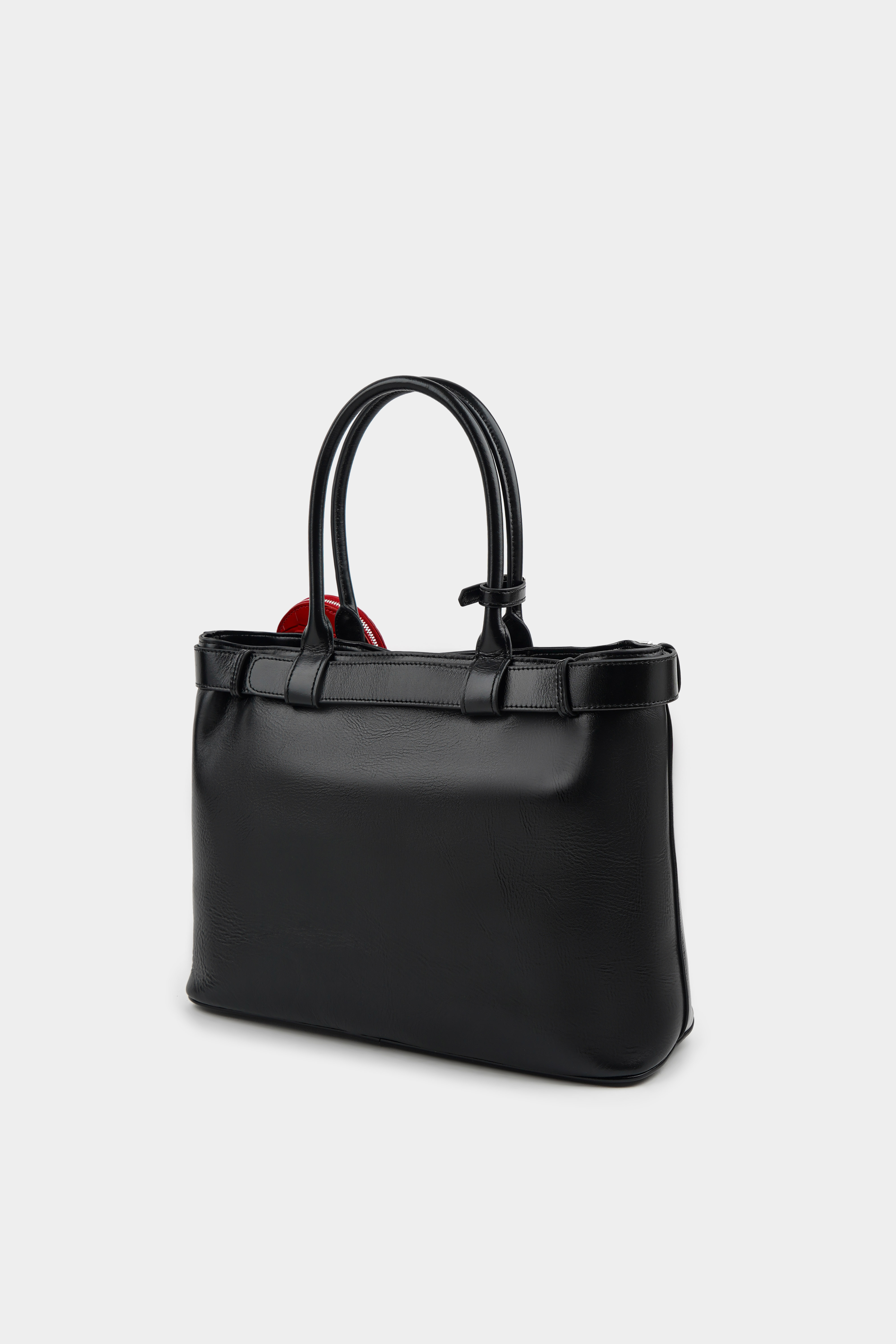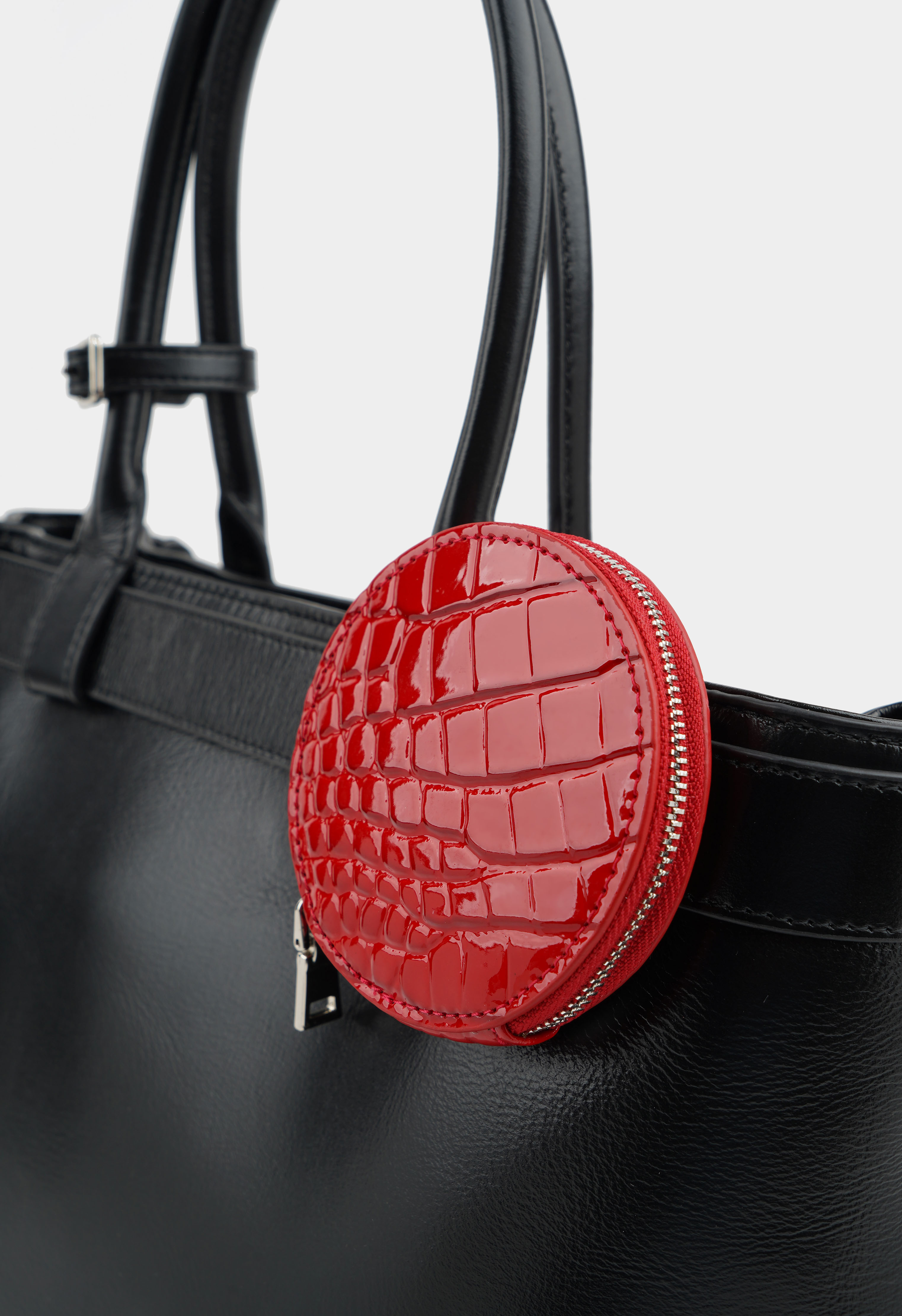 Вместительная чёрная сумка из кожи – сочетание стиля и практичности в одной модели. Основное отделение содержит два кармана для мелочей и застёгивается на плавную молнию. С помощью кожаного ремешка с пряжкой и красного кошелёчка дизайн модели хочется рассматривать до каждой малейшей детали. Плечевой ремень идёт в комплекте, с ним сумку можно носить с комфортом.