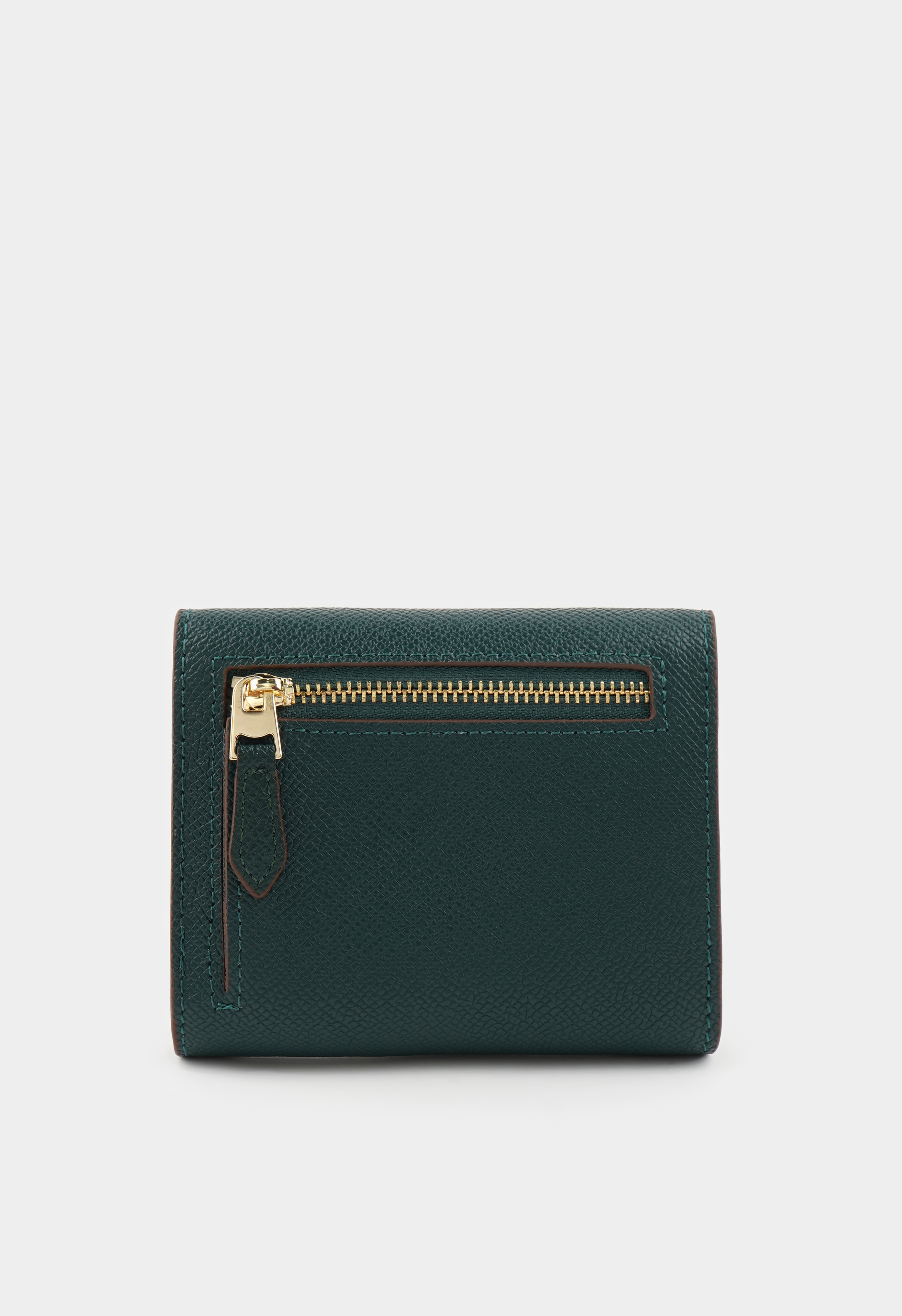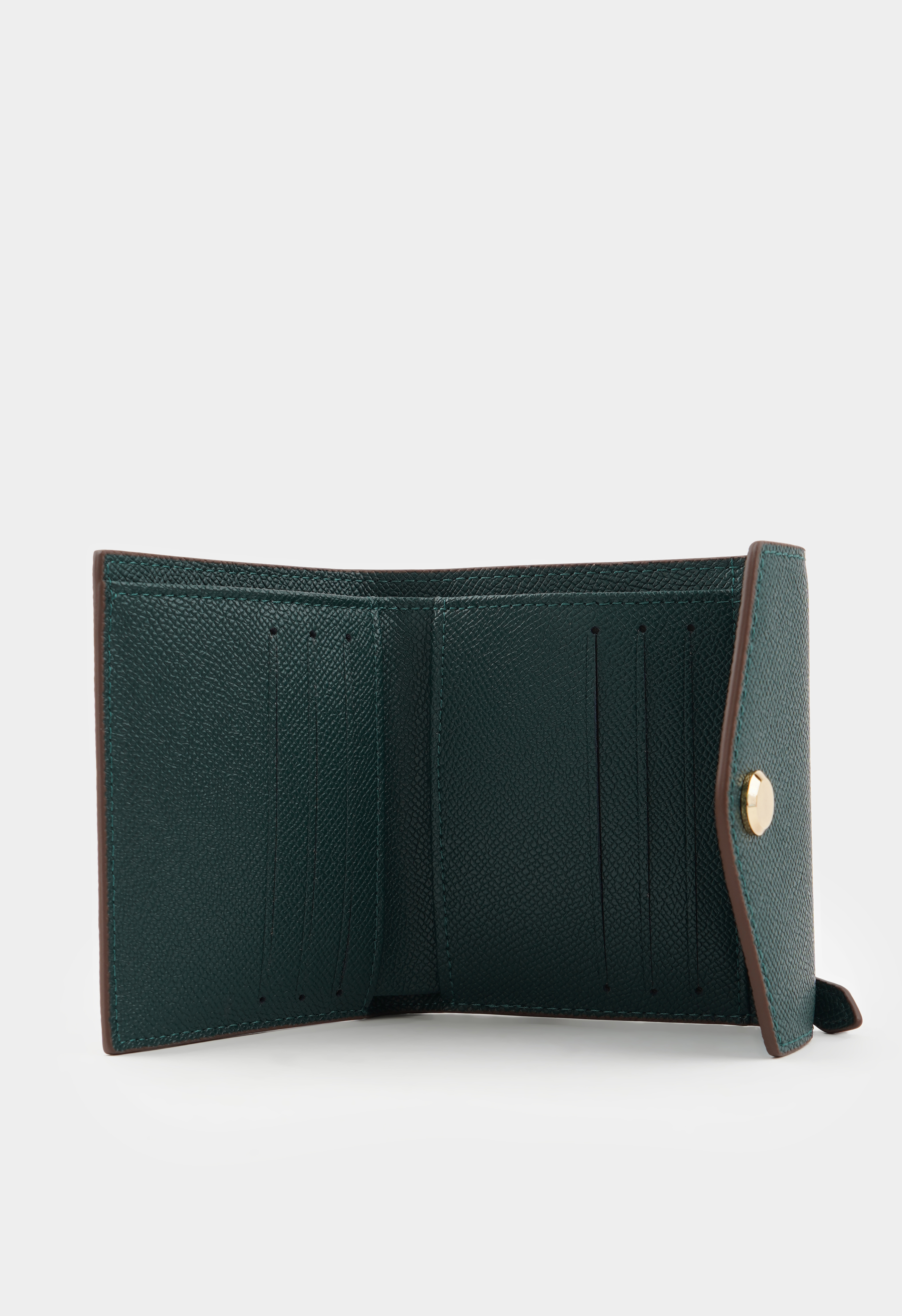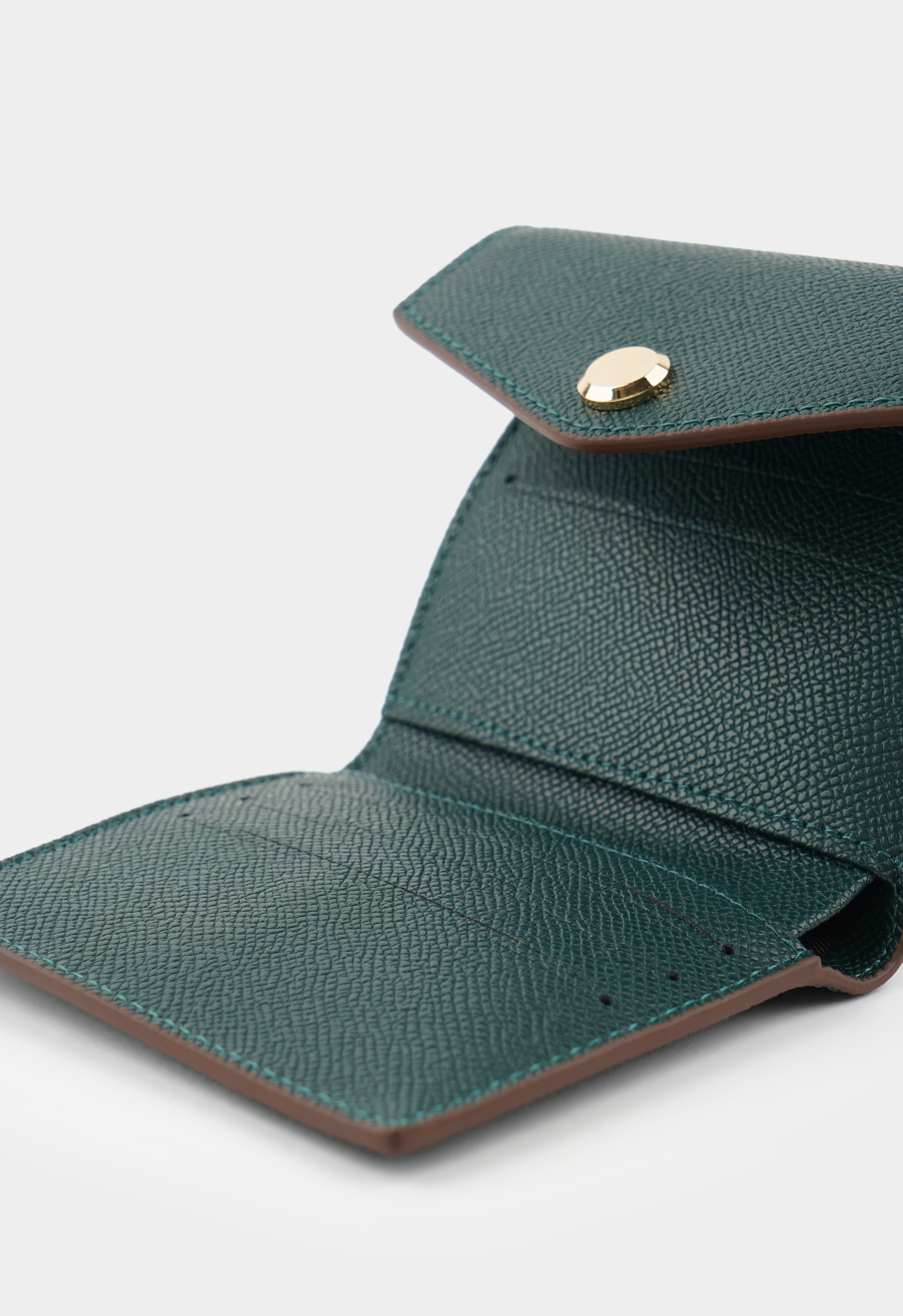 Стильный зеленый кошелек из натуральной кожи станет надежным спутником в повседневной жизни. Застежка на кнопку гарантирует безопасность содержимого, а золотая фурнитура добавляет стильный акцент. Один внешний карман для быстрого доступа к мелочам, три внутренних отделения и семь карманов для визиток позволяют держать все под рукой и в порядке. Компактный, практичный и элегантный кошелек идеально дополнит любой образ, сочетая удобство и стиль.