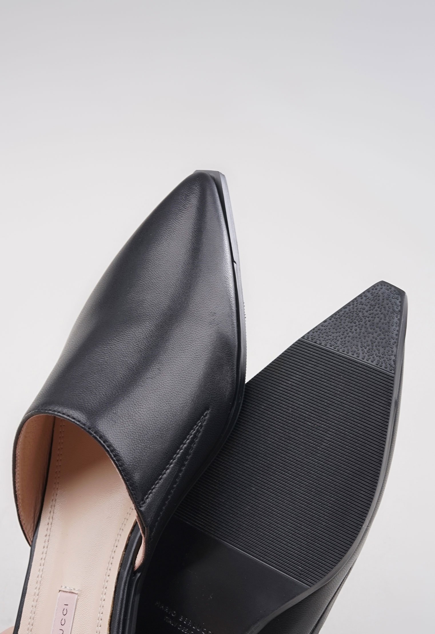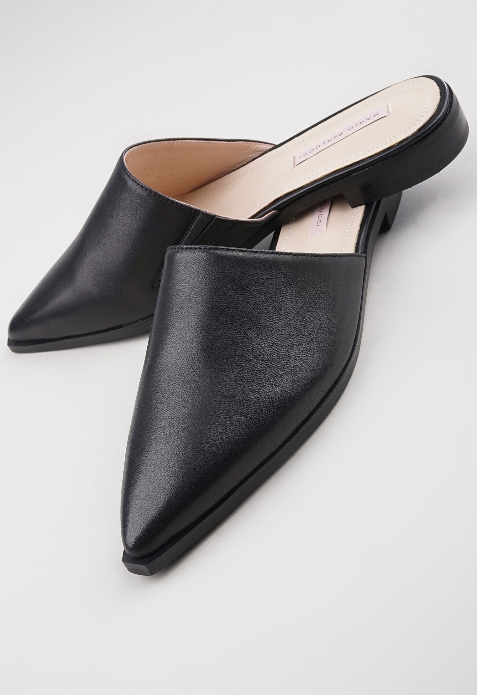 Обратите внимание: данная модель идёт в размер и отлично подходит для ног с узкой полнотой стопы. Советуем проконсультироваться с менеджером по выбору наиболее подходящего Вам размера. Лаконичные мюли из лимитированной коллекции выполнены из натуральной гладкой кожи и представлены в чёрном цвете. Изделие дополнено эластичными вставками, что обеспечивает особенно комфортную посадку. Широкий каблук позволяет равномерно распределить нагрузку на стопу. Актуальная модель с зауженным мысом превосходно сочетается с платьями и юбками.