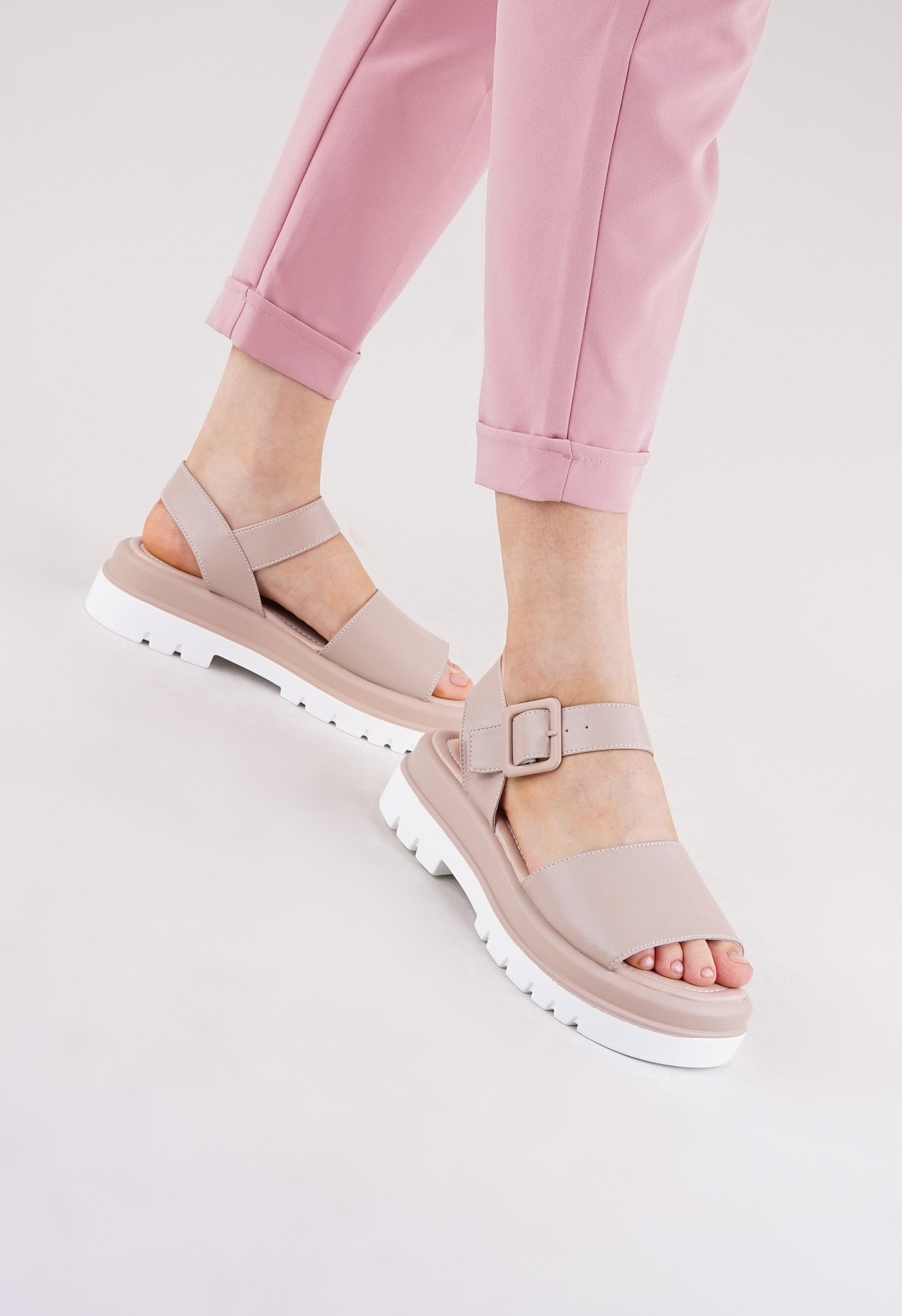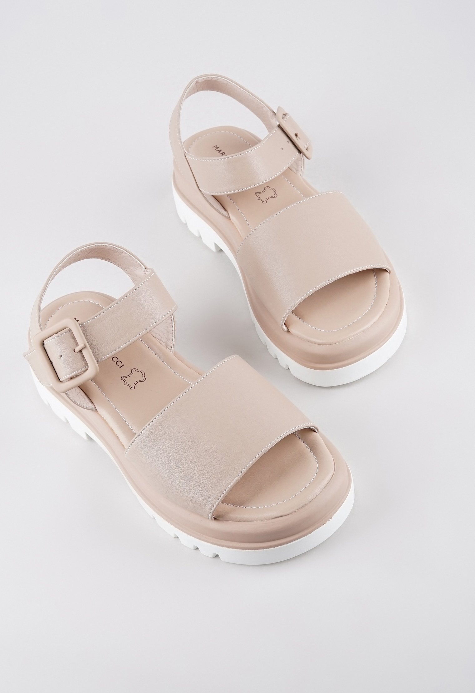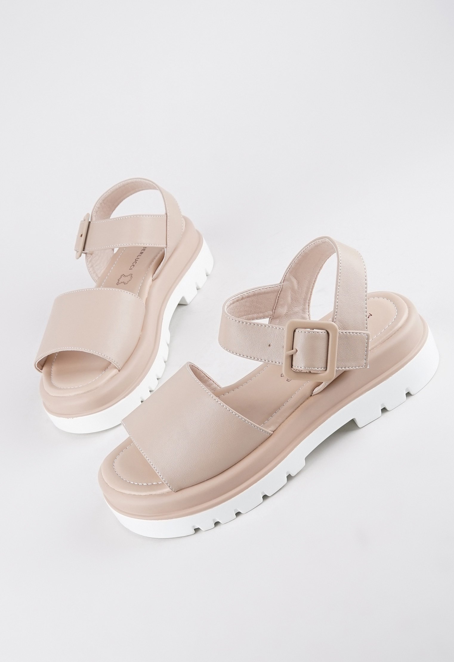 Обратите внимание: данная модель идёт в размер и отлично подходит для ног со средней полнотой стопы. Лаконичные босоножки из новой коллекции выполнены из натуральной кожи бежевого цвета и дополнены акцентной платформой. Ремень с пряжкой позволяет регулировать полноту стопы, мягкая кожаная подкладка и специальная стелька обеспечивают высокий уровень комфорта. Современная модель идеально сочетается с элементами повседневного гардероба.
