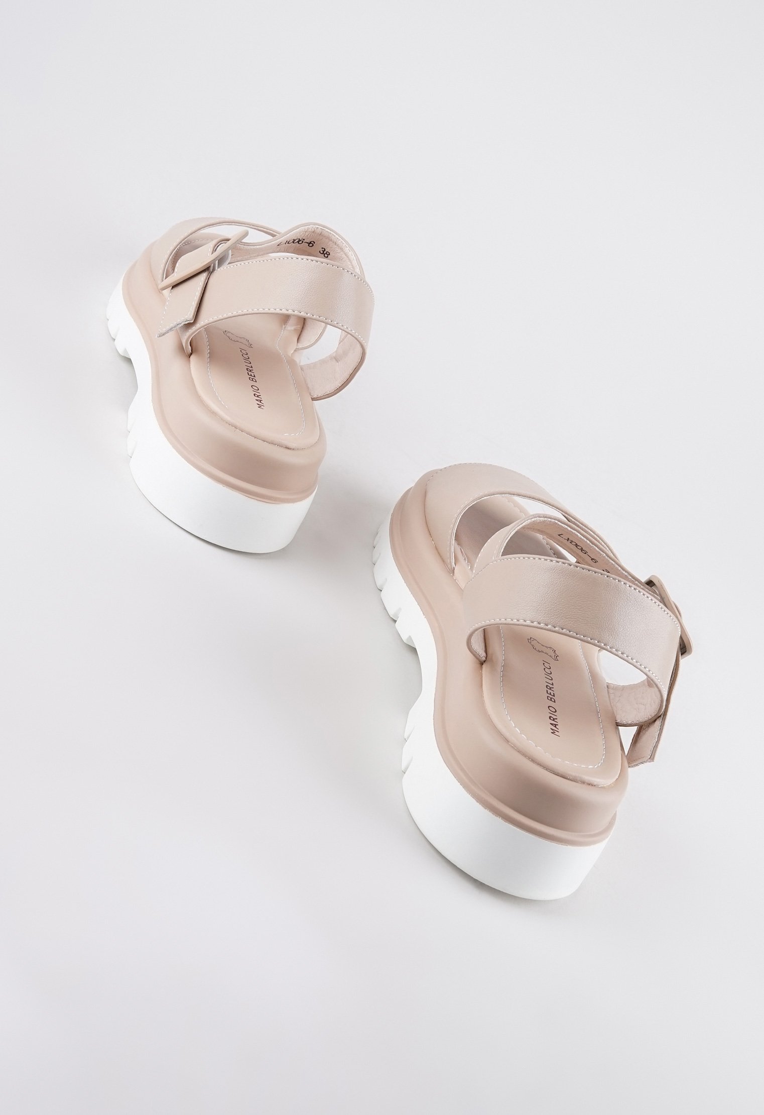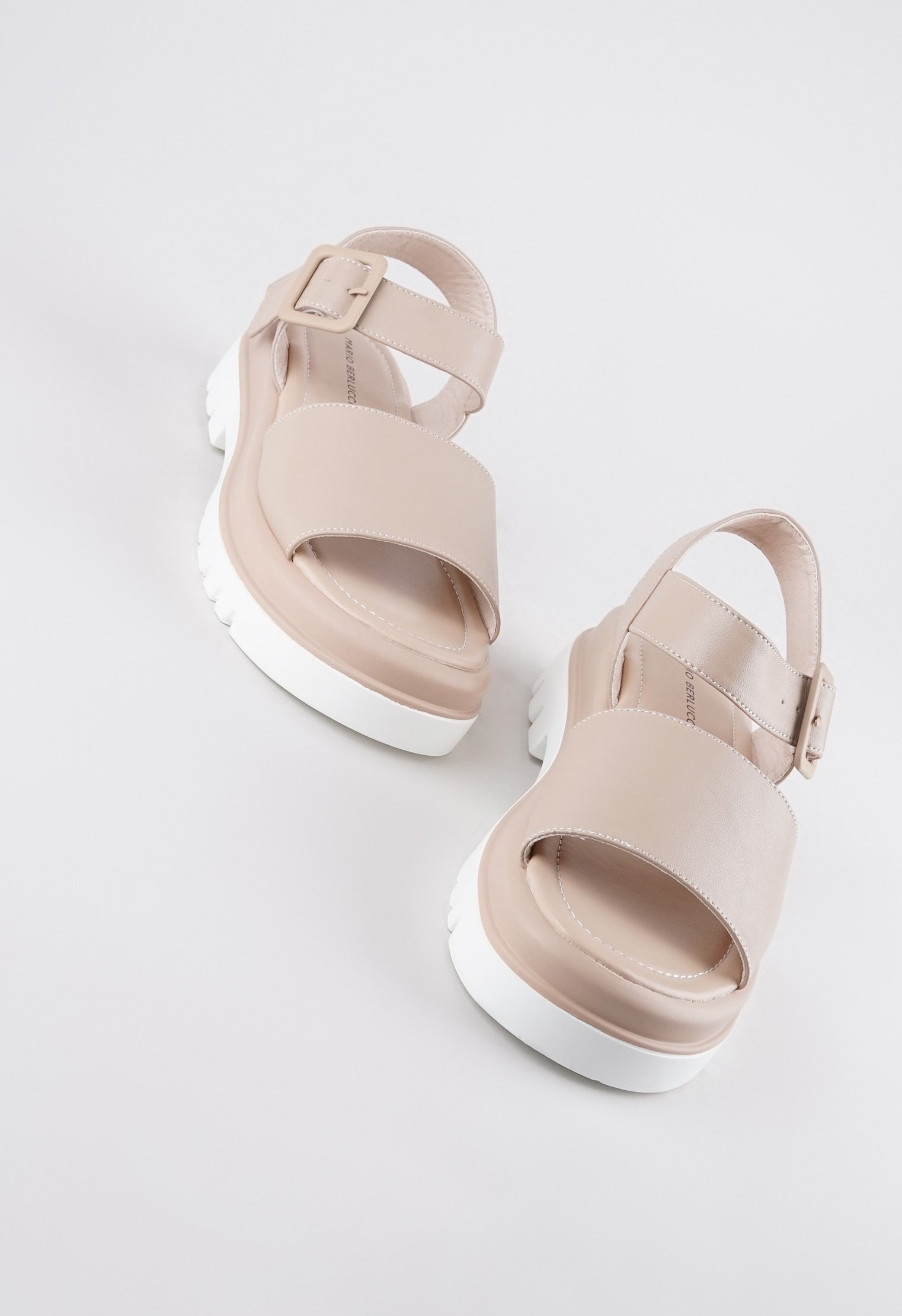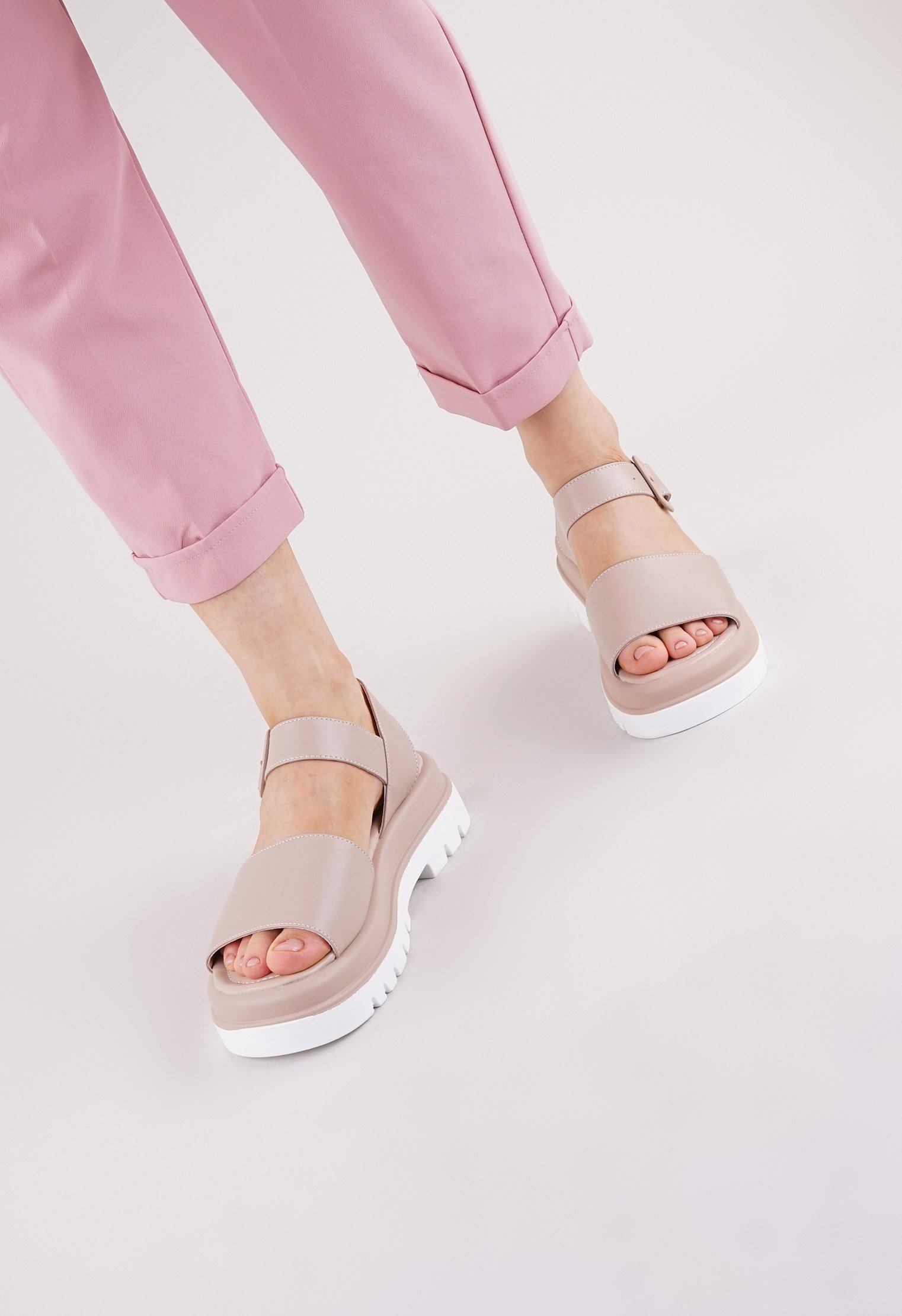 Обратите внимание: данная модель идёт в размер и отлично подходит для ног со средней полнотой стопы. Лаконичные босоножки из новой коллекции выполнены из натуральной кожи бежевого цвета и дополнены акцентной платформой. Ремень с пряжкой позволяет регулировать полноту стопы, мягкая кожаная подкладка и специальная стелька обеспечивают высокий уровень комфорта. Современная модель идеально сочетается с элементами повседневного гардероба.