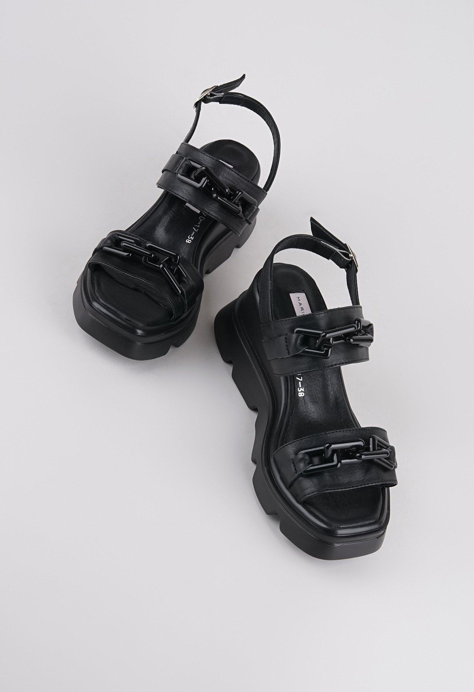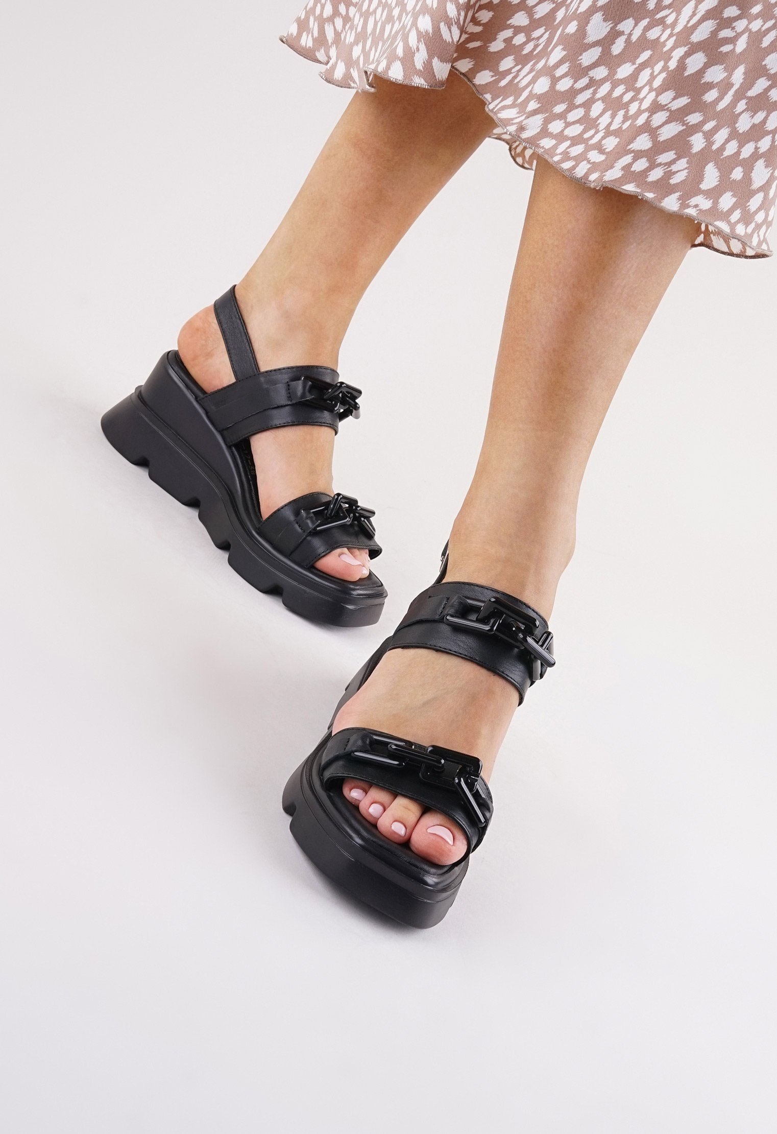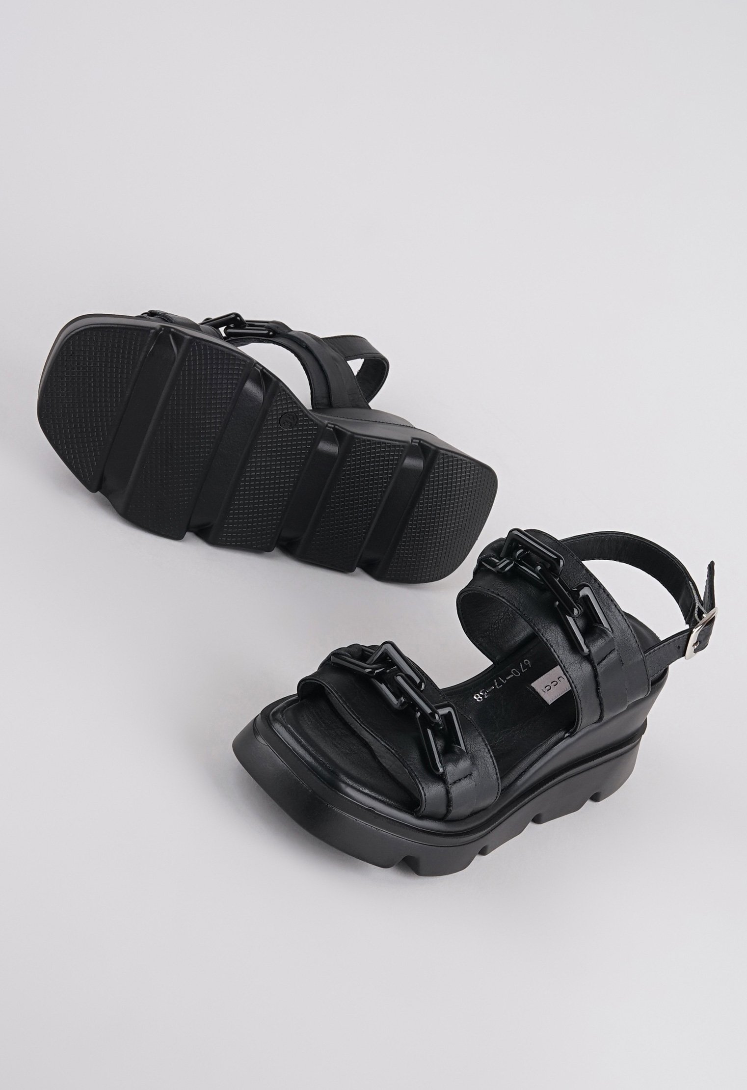 Обратите внимание: данная модель является маломеркой и отлично подходит для ног со средней полнотой и любым подъёмом стопы. Стильные босоножки на танкетке выполнены из натуральной кожи и представлены в новой коллекции в чёрном цвете. Трендовый крой с геометричным мысом декорирован эффектной фурнитурой, пряжка позволяет регулировать полноту. Анатомическая кожаная стелька подарит комфорт в течение дня. Актуальная модель идеально впишется в базовый гардероб.