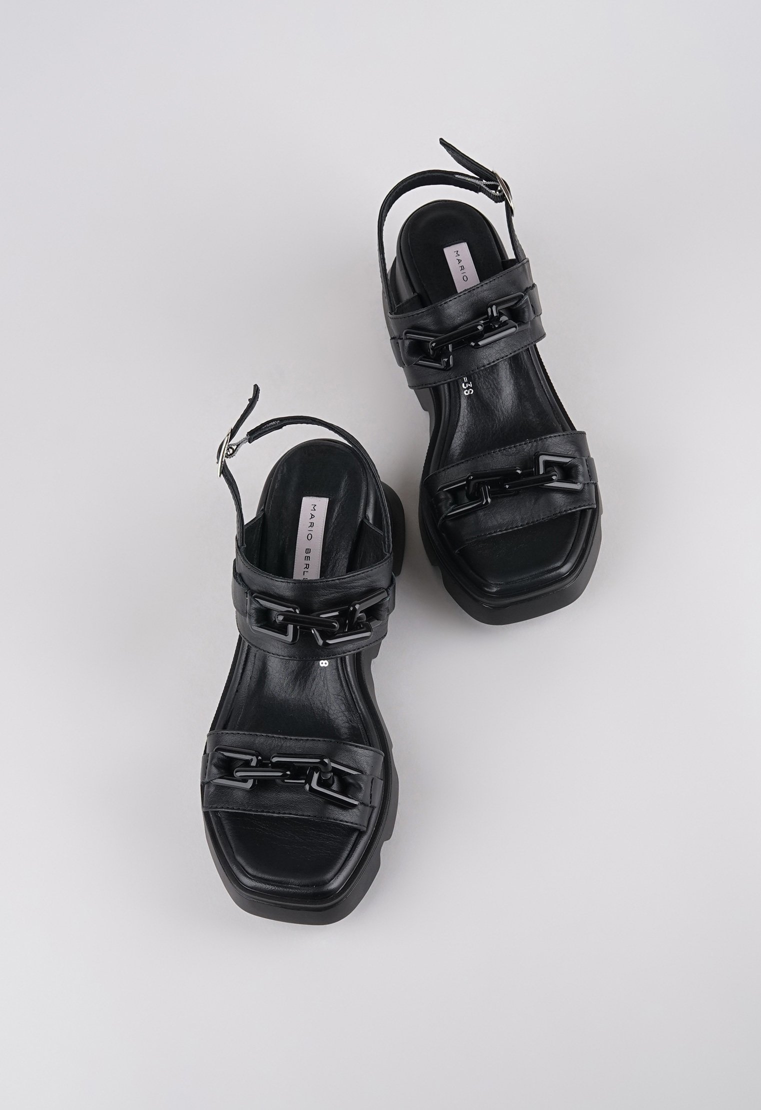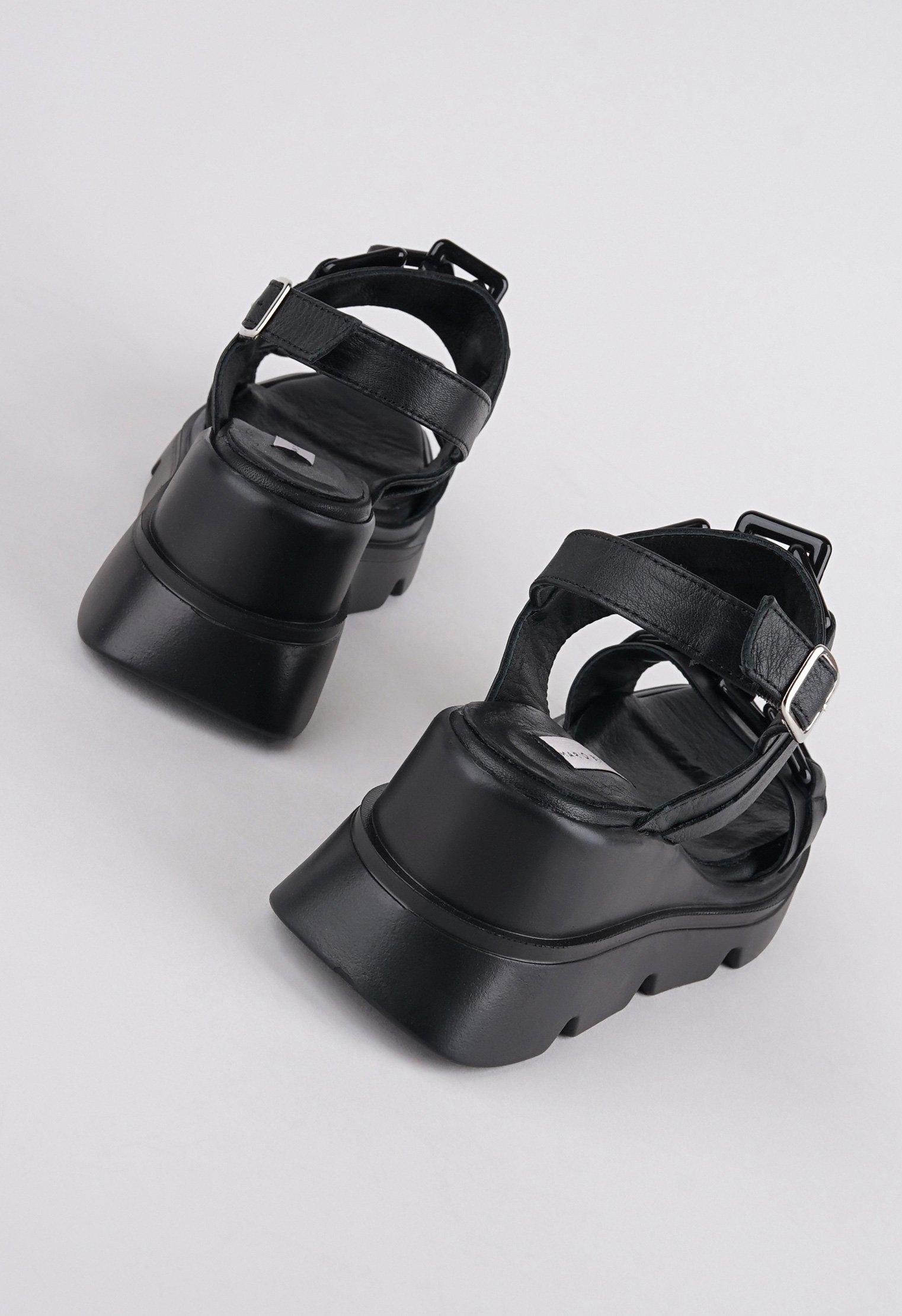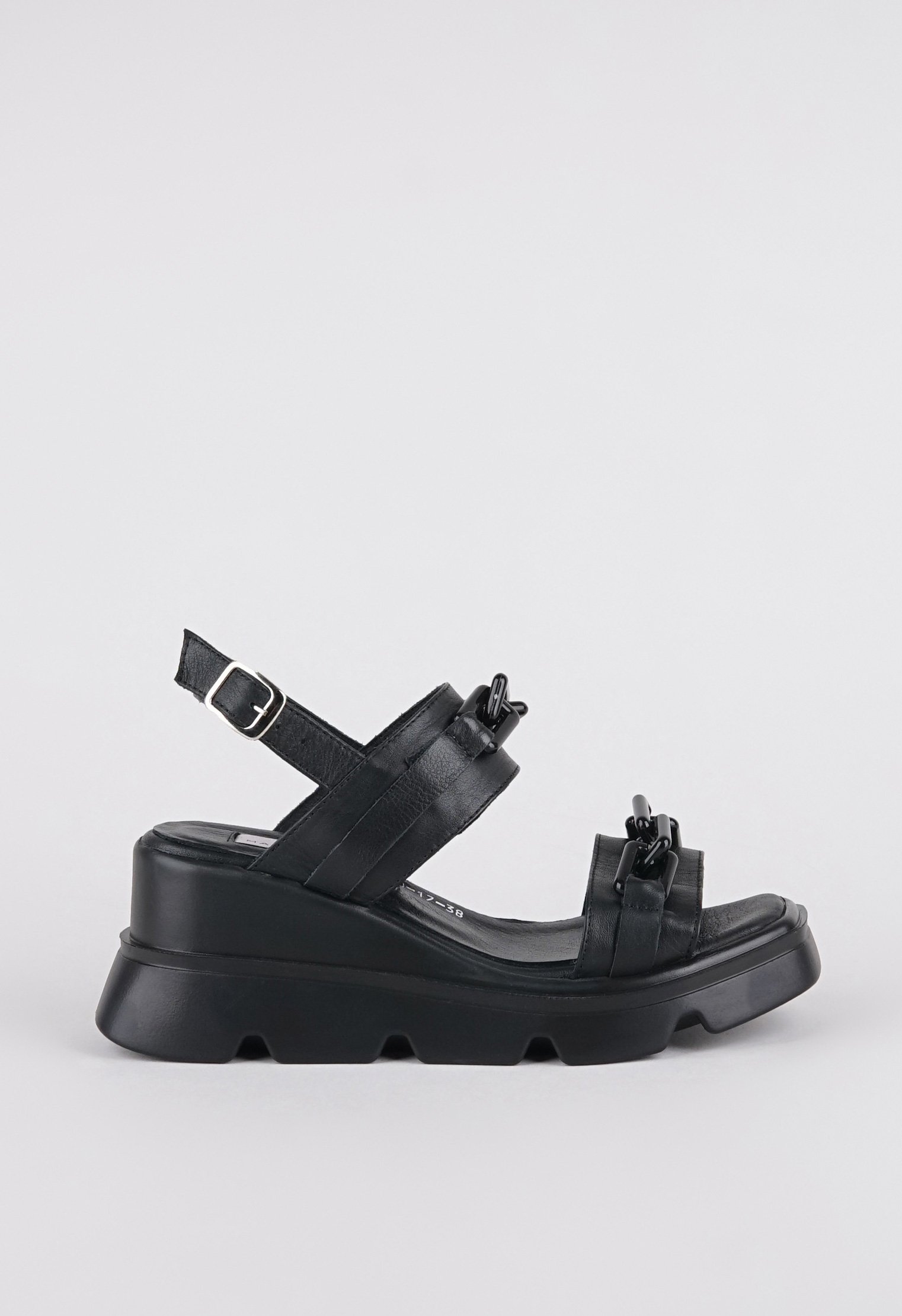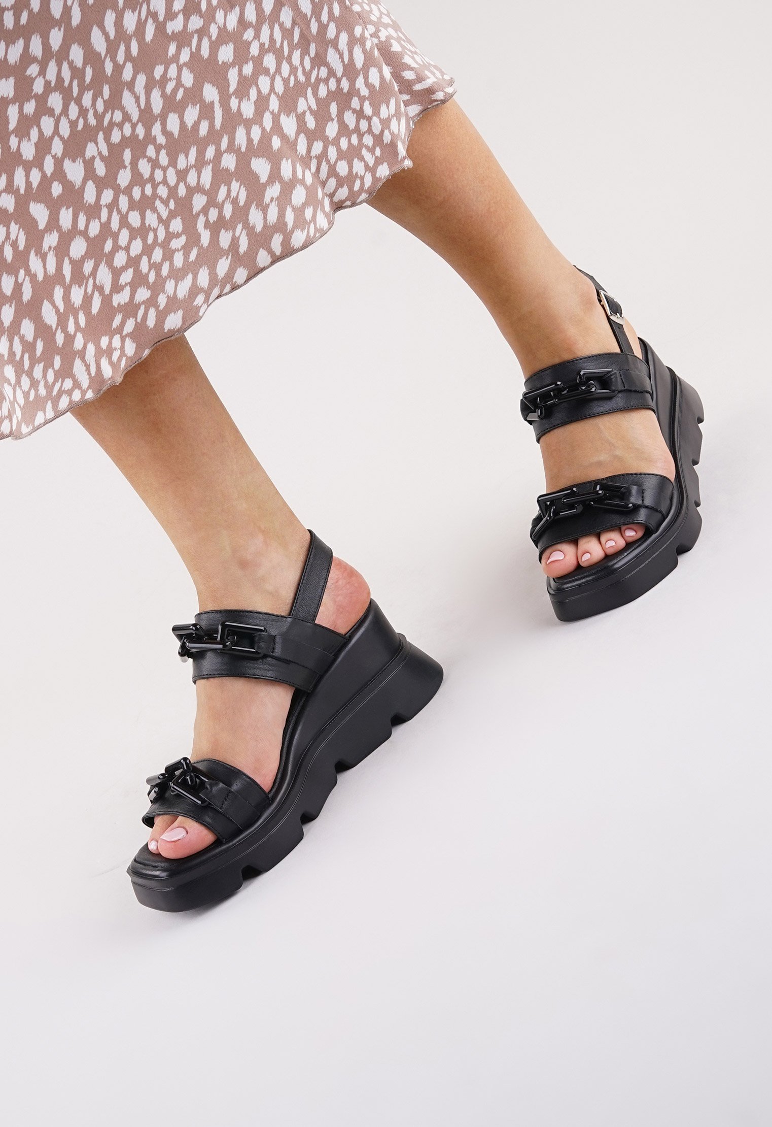 Обратите внимание: данная модель является маломеркой и отлично подходит для ног со средней полнотой и любым подъёмом стопы. Стильные босоножки на танкетке выполнены из натуральной кожи и представлены в новой коллекции в чёрном цвете. Трендовый крой с геометричным мысом декорирован эффектной фурнитурой, пряжка позволяет регулировать полноту. Анатомическая кожаная стелька подарит комфорт в течение дня. Актуальная модель идеально впишется в базовый гардероб.