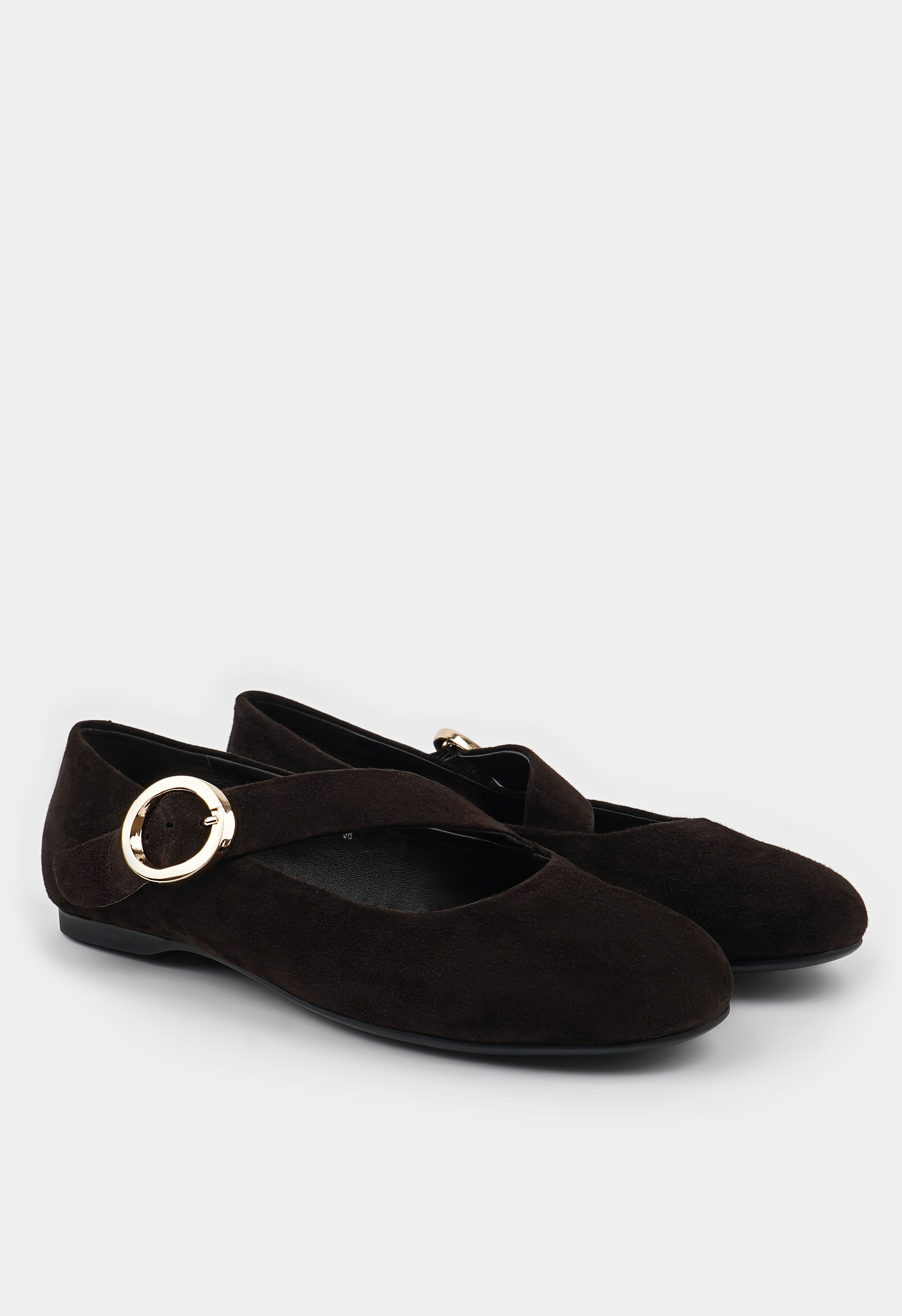 Коричневые балетки из натуральной замши – женственная пара с благородной бархатистой фактурой. Округлый мысок делает силуэт мягким и комфортным, а аккуратный венский каблук удобен для ежедневных дел. Ремешок с пряжкой и золотой фурнитурой работает как изящное украшение: красиво подчеркивает едва заметный подъем и делает модель более выразительной. Гибкая подошва приятно сгибается при ходьбе и поддерживает легкий шаг.