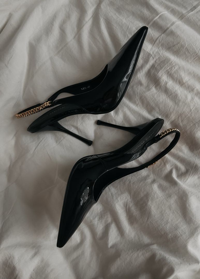 Слингбэки из натуральной лаковой кожи сочетают в себе элегантность и комфорт. Гибкая подошва обеспечивает лёгкость в каждом шаге, а заострённый мысок добавляет образу утончённости и изящества. Золотая фурнитура привносит роскошный акцент, а втачная резинка гарантирует идеальную посадку и удобство. Устойчивый каблук даёт чувство уверенности и лёгкости даже после долгого дня. Чтобы выбрать наиболее комфортную модель, соответствующую вашим анатомическим особенностям, следует учесть полноту модели и характеристики стопы. Более подробную информацию по выбору размера и об особенностях модели предоставит наш менеджер.