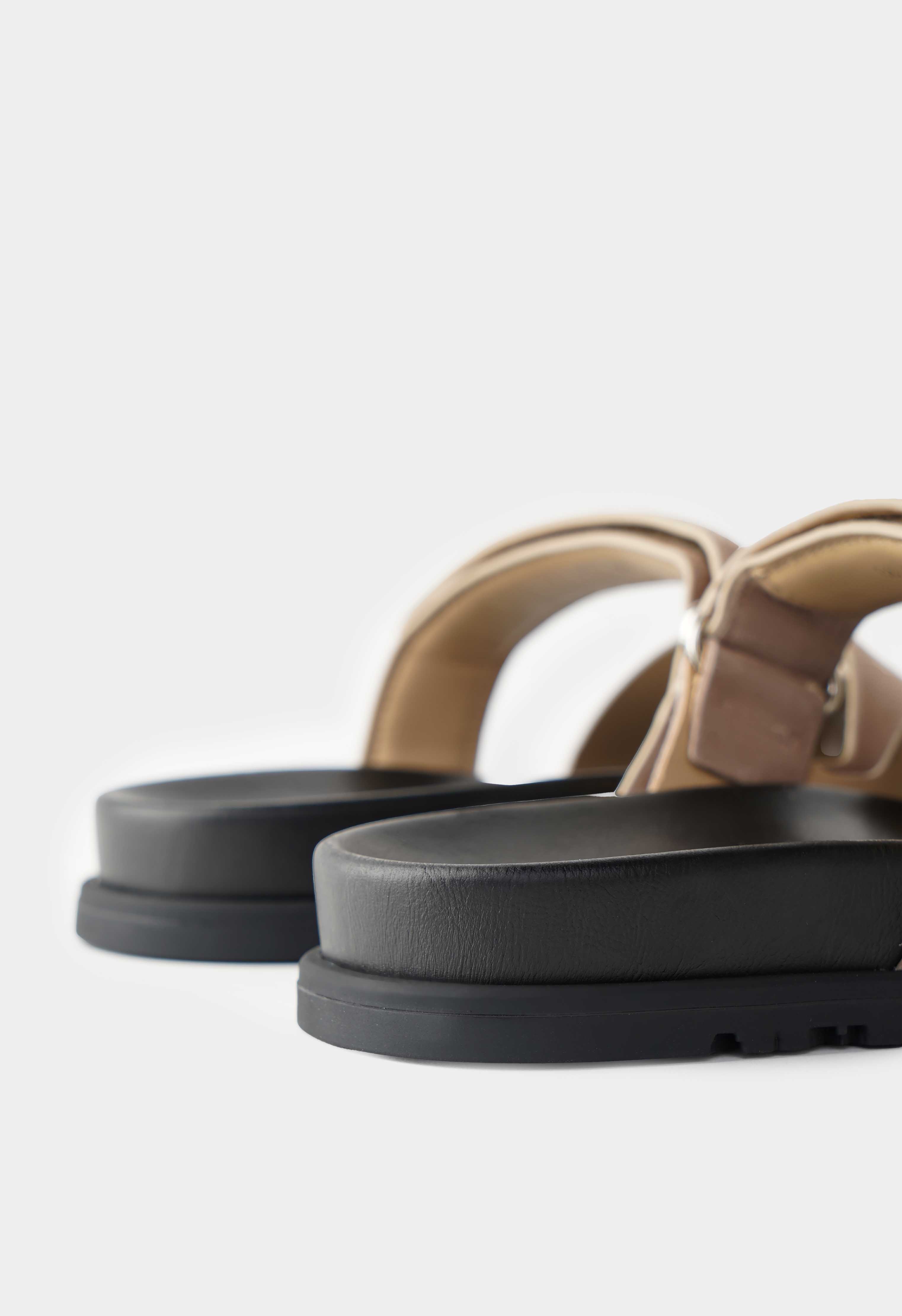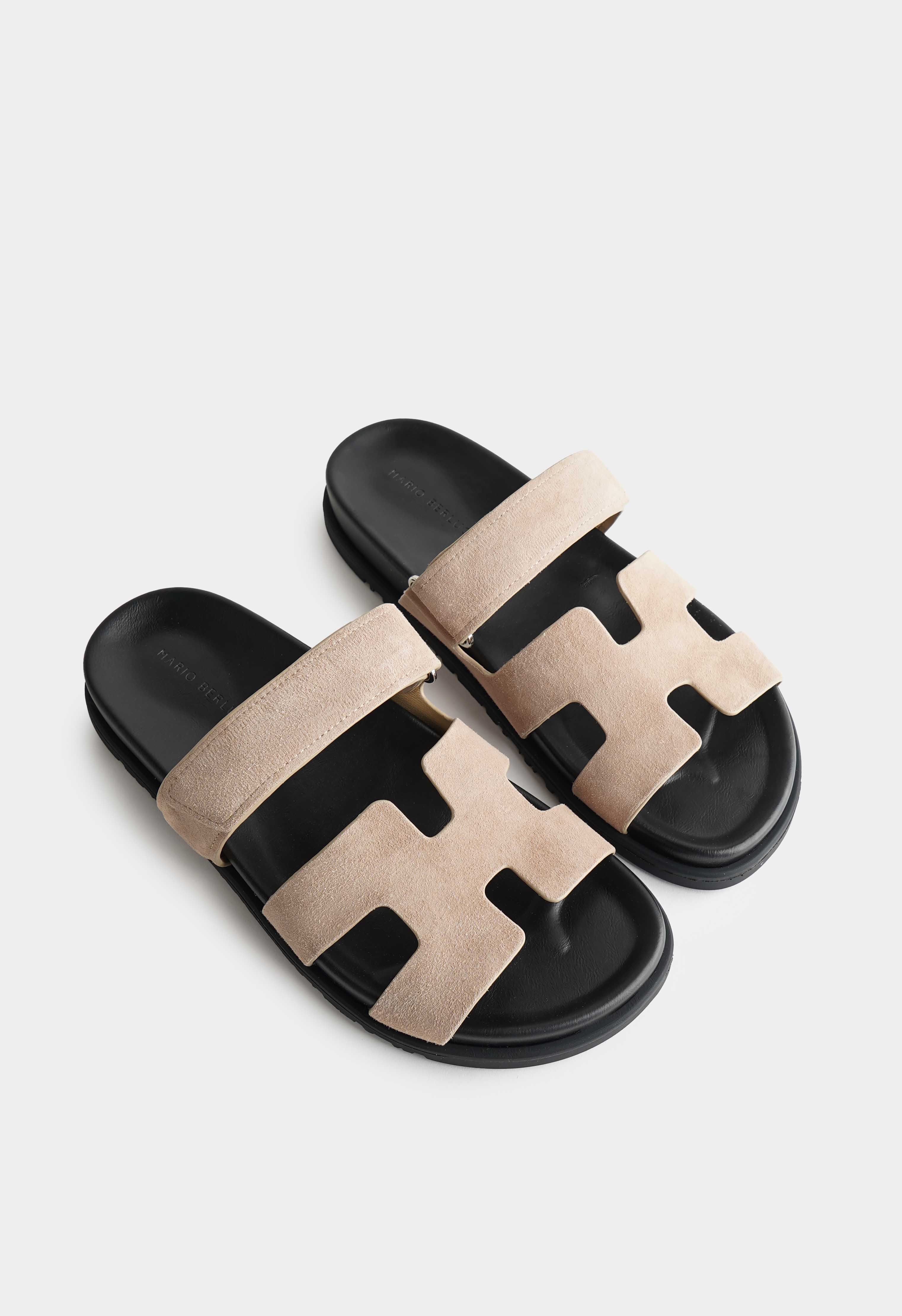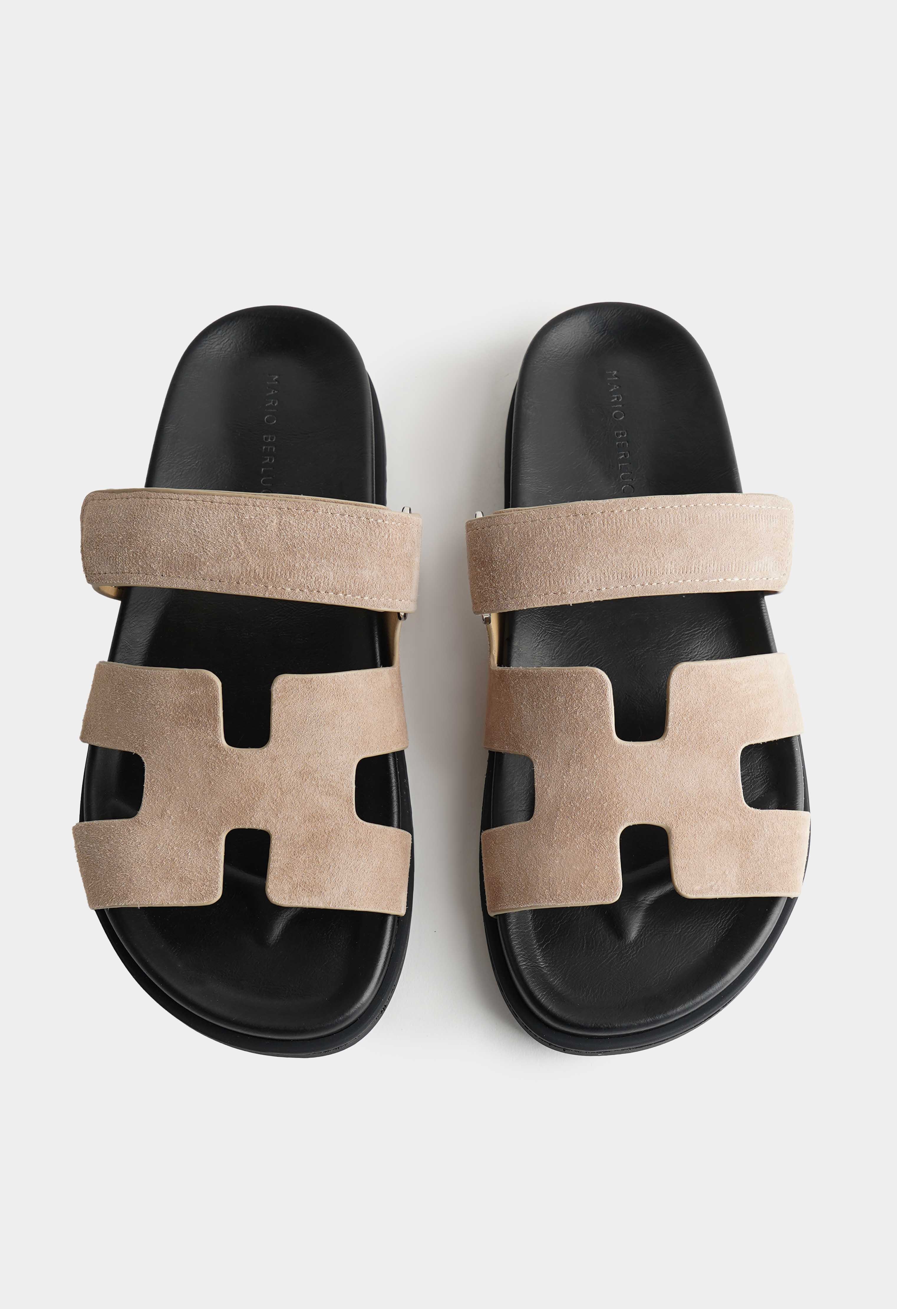 Стильные пантолеты в бежевом оттенке – идеальный выбор для комфорта и актуального повседневного образа. Модель выполнена из натуральной замши с мягкой текстурой. Открытый мысок добавляет легкости и делает пару отличным вариантом для летнего сезона, а удобная застежка на липучке с серебряной фурнитурой позволяет легко регулировать посадку. Платформа визуально вытягивает силуэт и обеспечивает дополнительную поддержку, в то время как гибкая черная подошва дарит свободу движения и комфорт в течение всего дня.