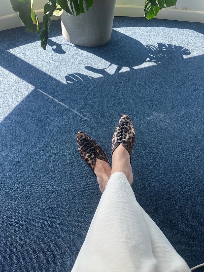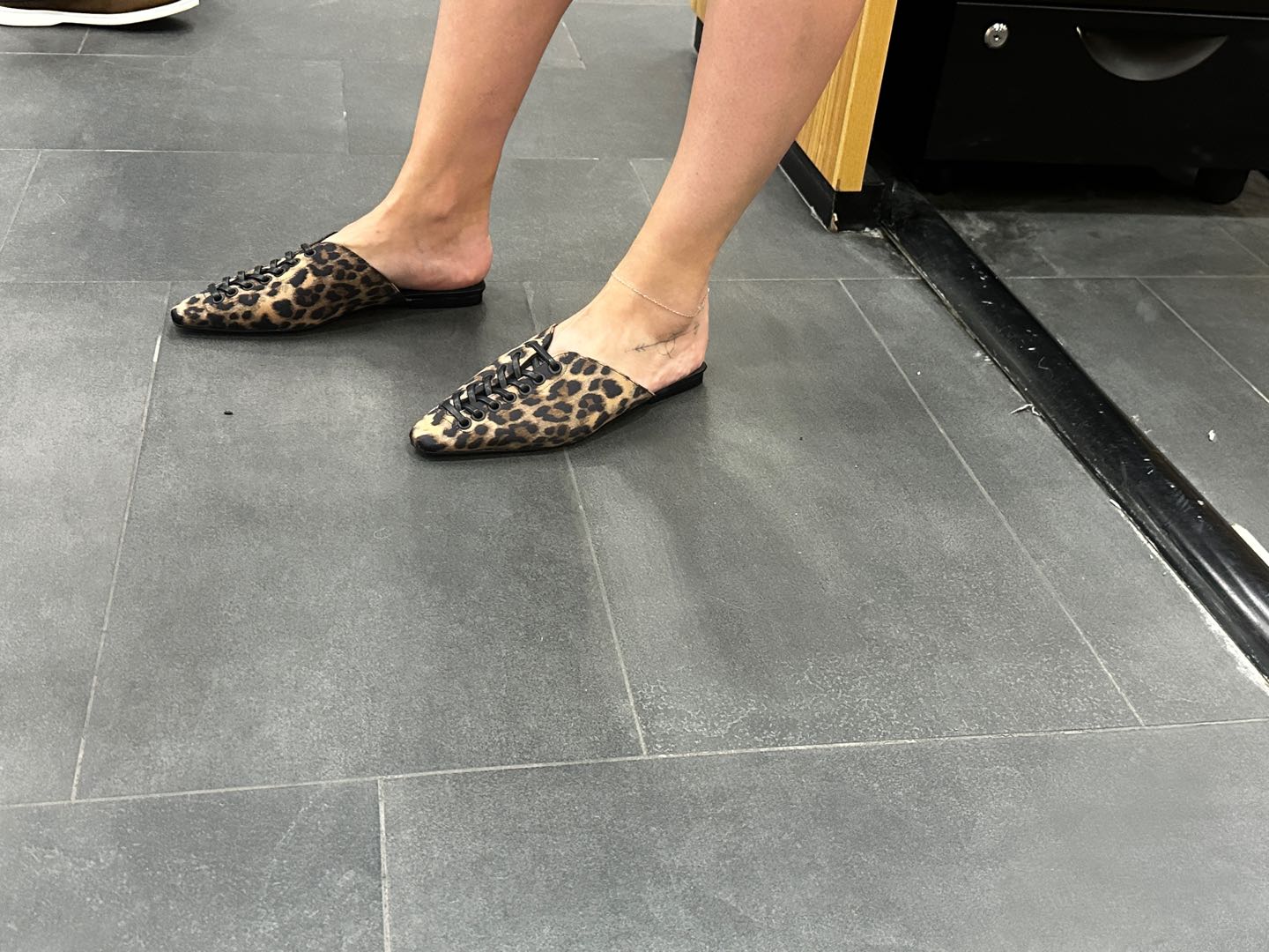 Мюли с леопардовым принтом – это смелый акцент в образе, который моментально притягивает взгляды. Легкий текстиль дарит комфорт и свободу движений, а заостренный мысок добавляет элегантности и визуально вытягивает силуэт. Венский каблук делает походку женственной, но при этом остается удобным для активного дня. Черная фурнитура эффектно смотрится с принтом, подчёркивая дерзкий, но продуманный стиль.
