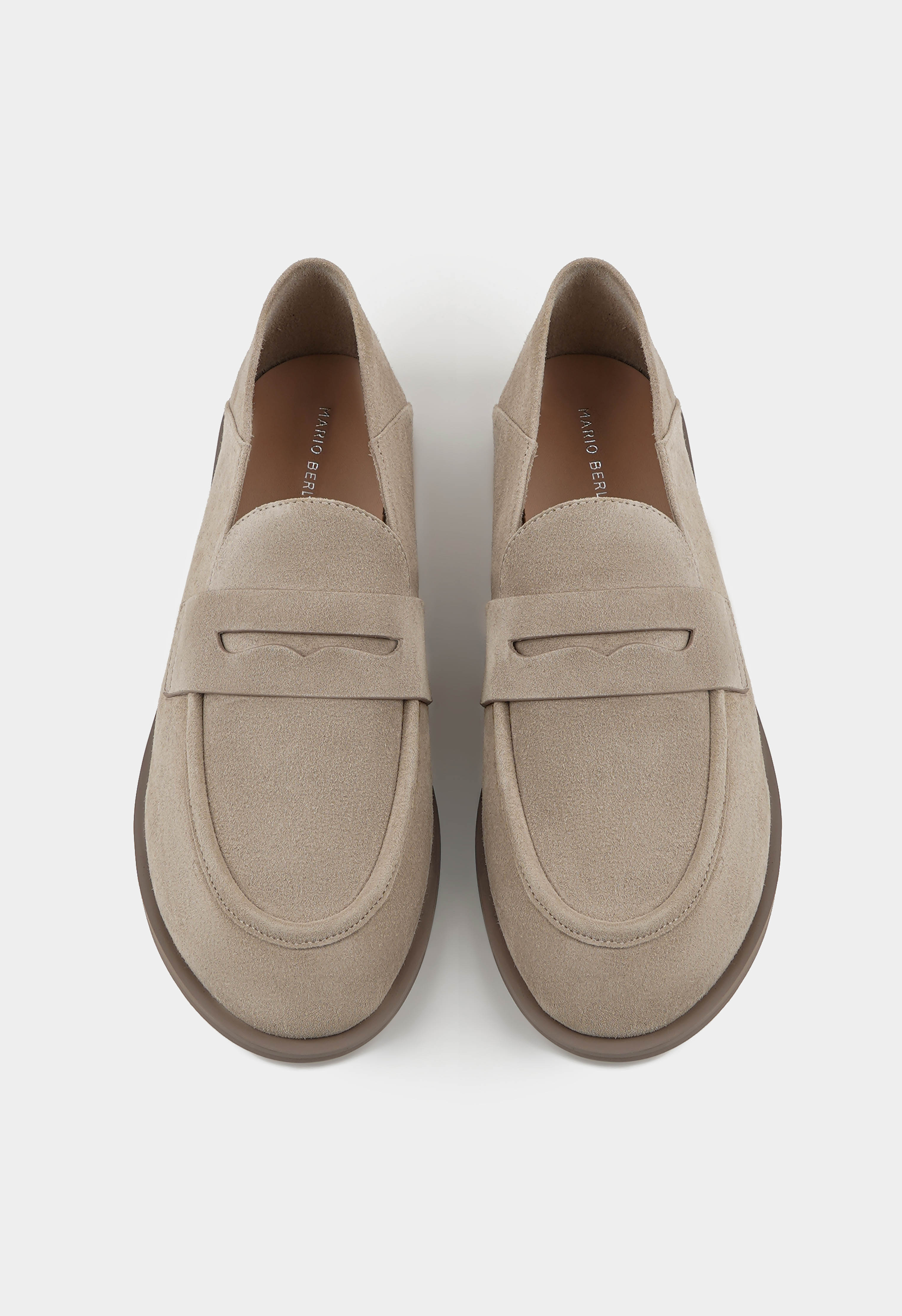 "Бежевые лоферы с гибкой подошвой из натуральной замши являются отличным выбором для комфортных прогулок. Округлый мысок и венский каблук придают модели элегантность и устойчивость. Модель легко впишется в любой образ, добавляя стиль и лёгкость.