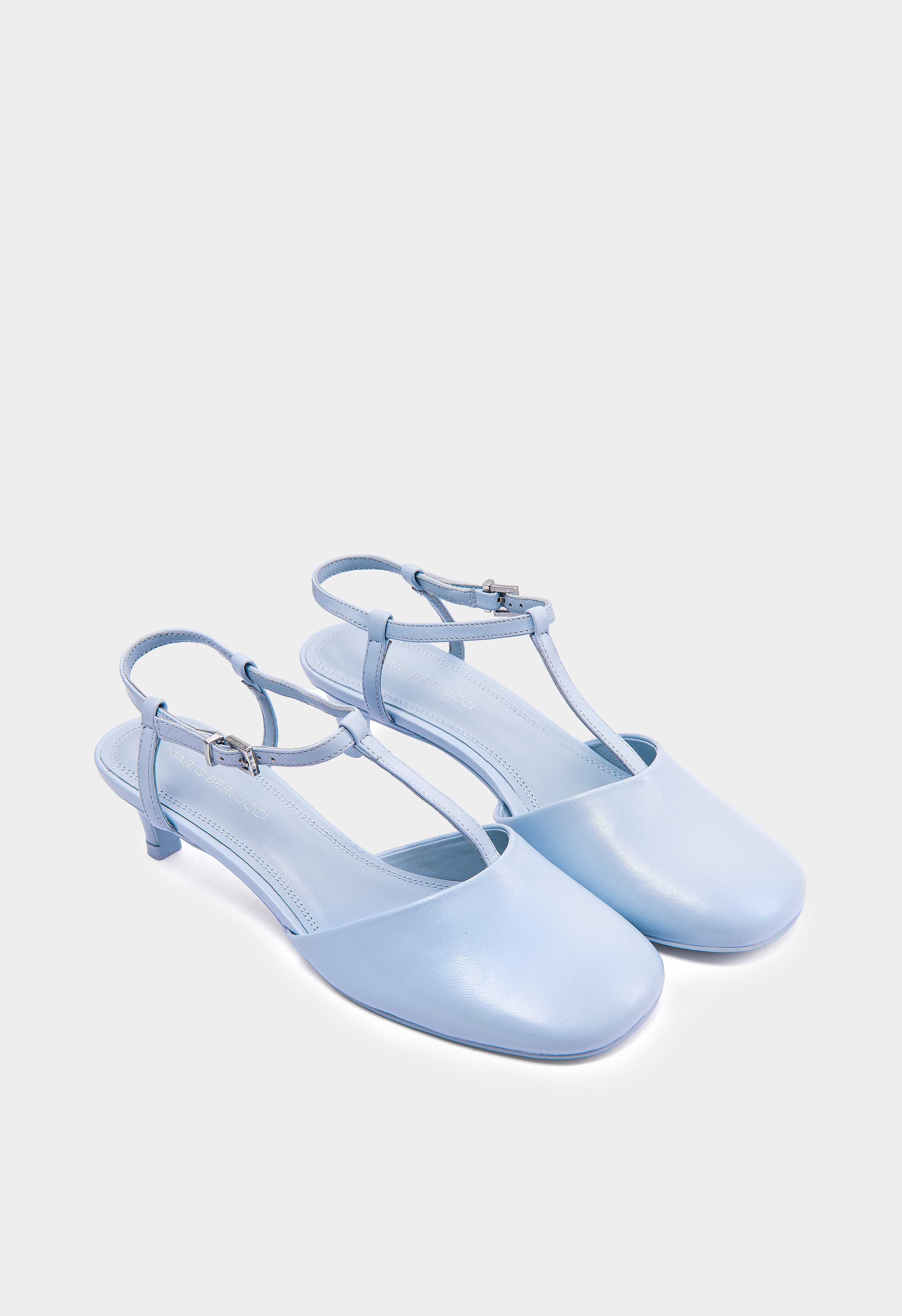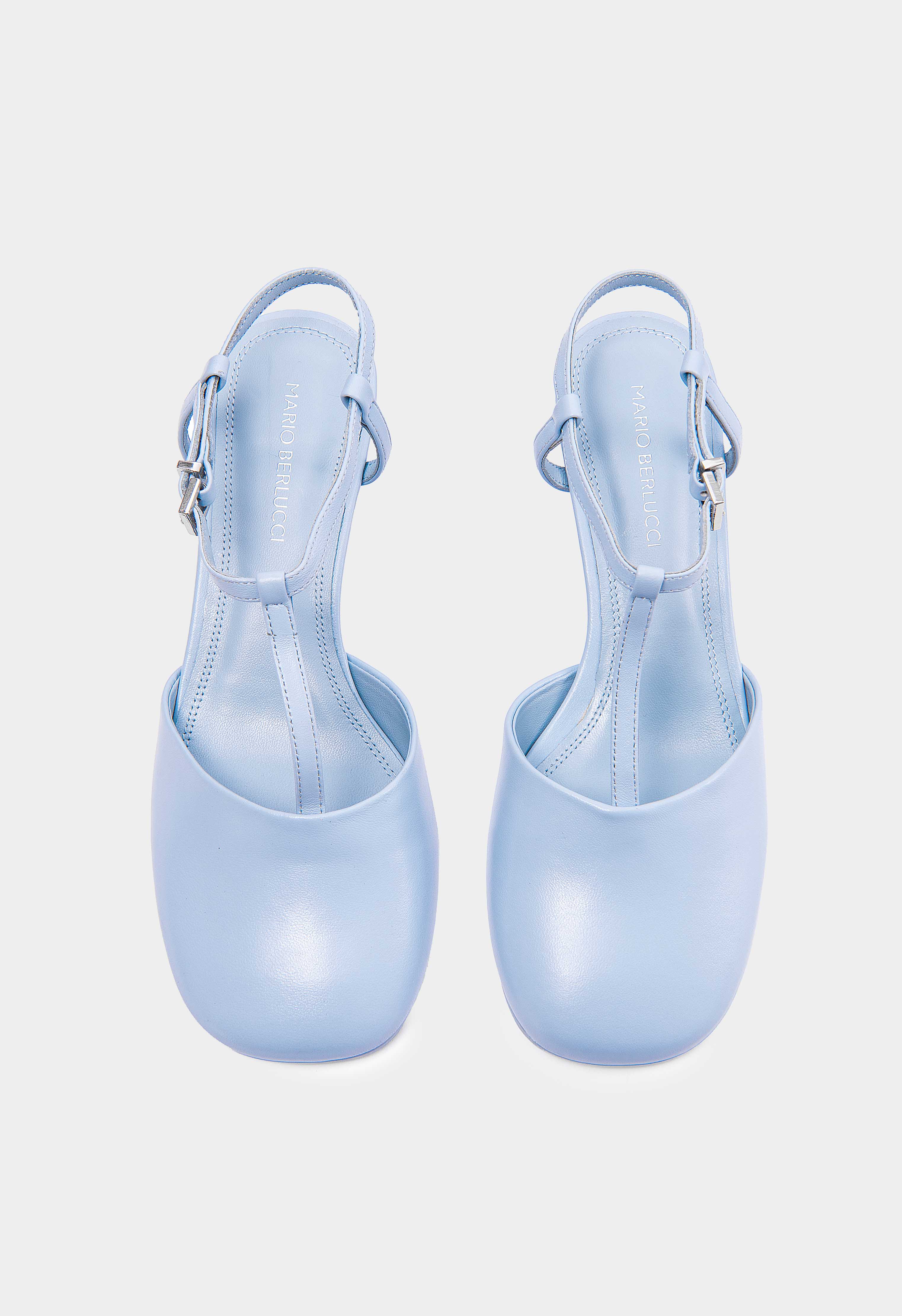 Голубые туфли из натуральной кожи – аккуратная пара с легким оттенком и строгой геометрией, которая красиво освежает образ. Квадратный мысок делает силуэт современным и собранным, а тонкий ремешок фиксирует стопу и подчеркивает подъем. Серебряная пряжка добавляет сдержанный акцент и аккуратно завершает дизайн. Каблук-рюмка дает изящную высоту и уверенную опору, жесткая подошва держит форму и помогает шагать стабильно – идеальный вариант для офиса, мероприятий и летних выходов.