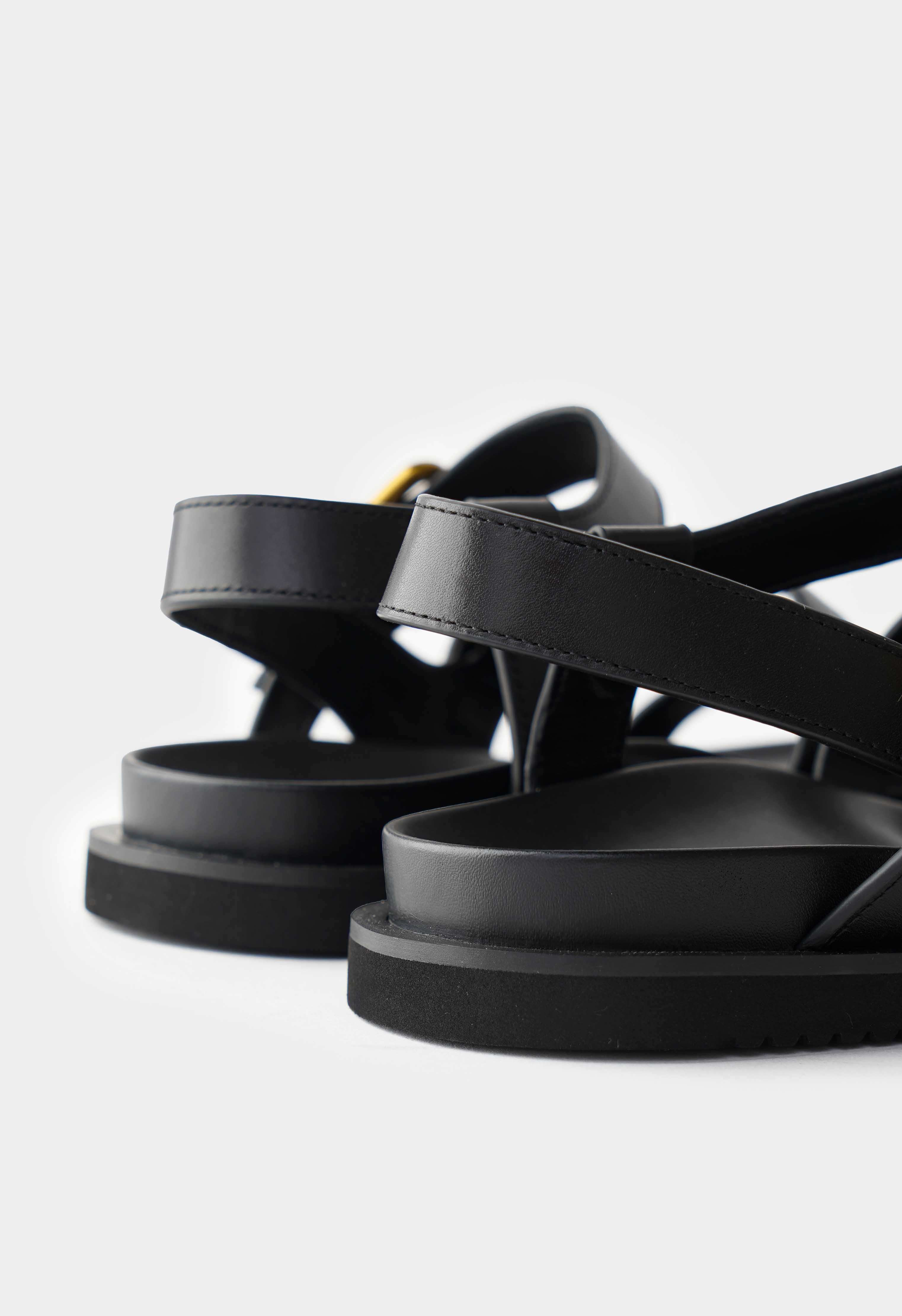 Черные сандалии из натуральной кожи – выразительное сочетание практичности и трендового дизайна: открытый мысок добавляет легкости, а массивная платформа делает силуэт современным и уверенным. Золотые пряжки становятся ярким акцентом и позволяют удобно отрегулировать посадку, подчеркивая стиль каждой детали. Жесткая подошва обеспечивает устойчивость и надежность, делая эту модель идеальной для динамичных городских образов.