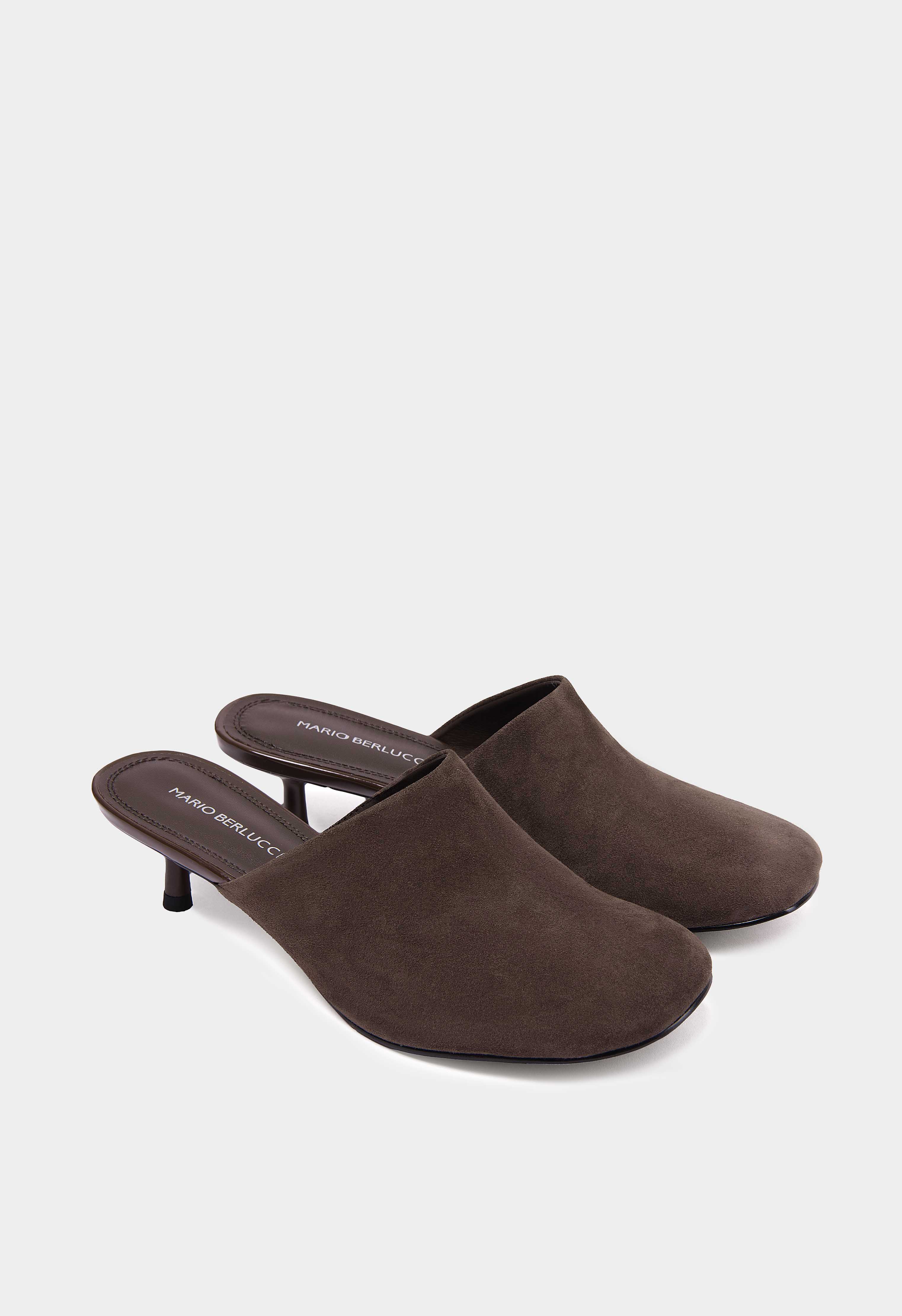 Коричневые мюли из натуральной замши – лаконичная пара с благородной бархатистой фактурой, которая выглядит спокойно и очень элегантно. Квадратный мысок задает современную геометрию и делает силуэт более собранным, а изящный каблук-рюмка добавляет аккуратную высоту без лишней нагрузки. Втачная резинка помогает посадке быть комфортной и более точной, сохраняя чистые линии верха. Жесткая подошва держит форму и обеспечивает стабильную опору – отличный вариант для офиса, мероприятий и летних выходов, когда хочется выглядеть утонченно и уверенно.