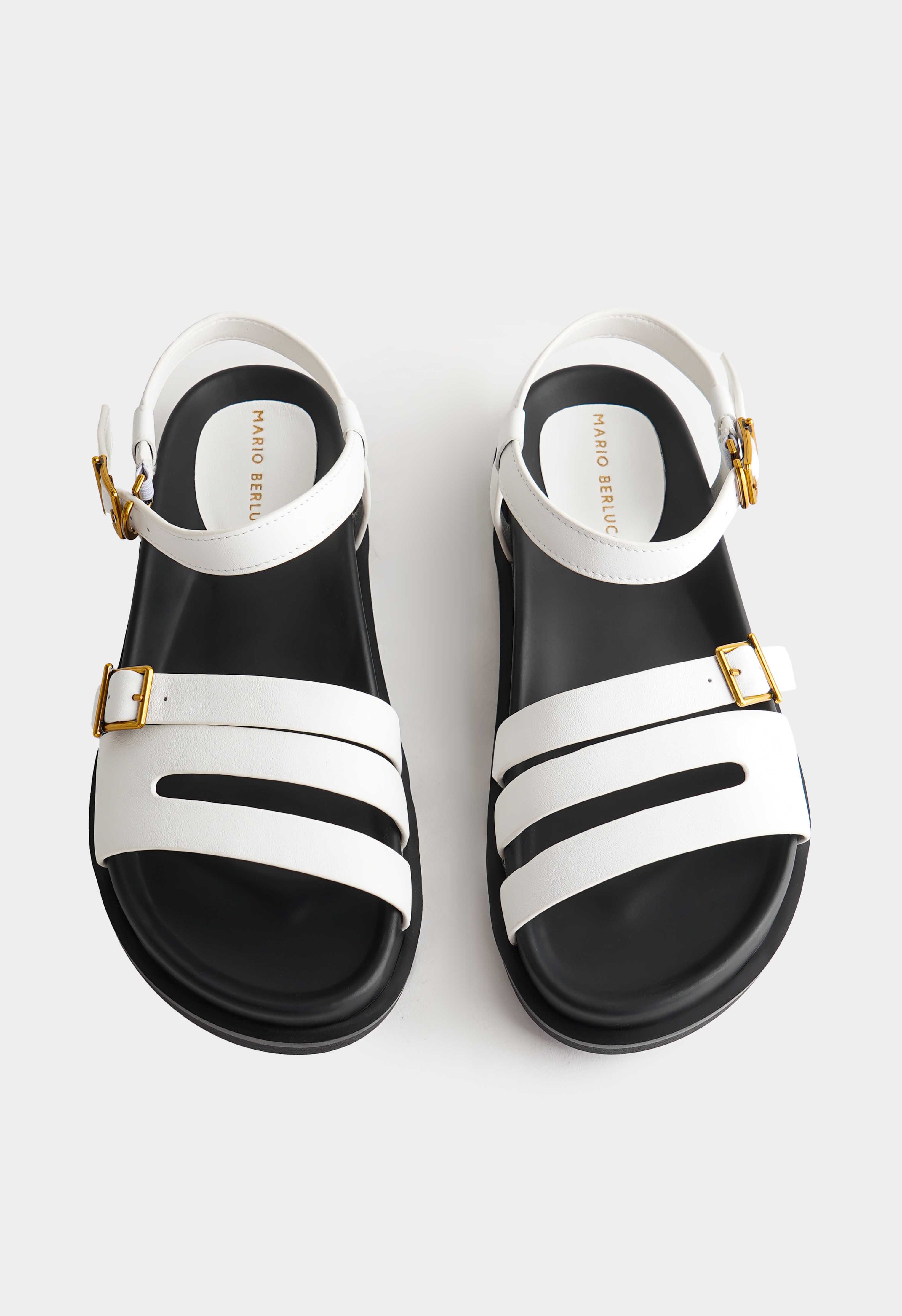 Базовые белые сандалии из натуральной кожи – идеальное сочетание минимализма и выразительных деталей. Открытый мысок добавляет легкости образу, а золотые пряжки создают эффектный акцент и подчеркивают премиальность модели. Удобная контрастная черная платформа визуально вытягивает силуэт и обеспечивает комфорт на каждый день, в то время как гибкая подошва дарит свободу движений и мягкость шага.