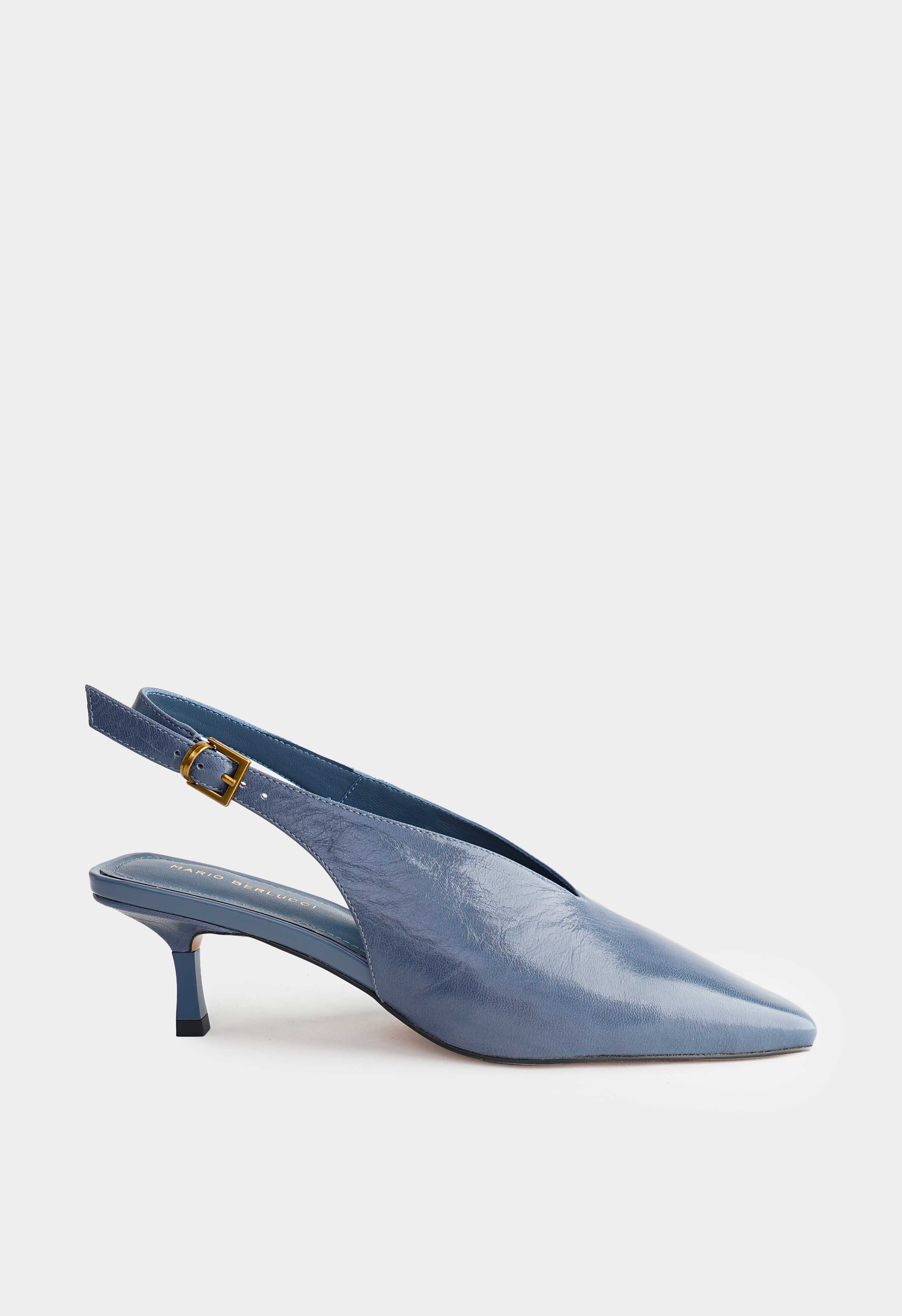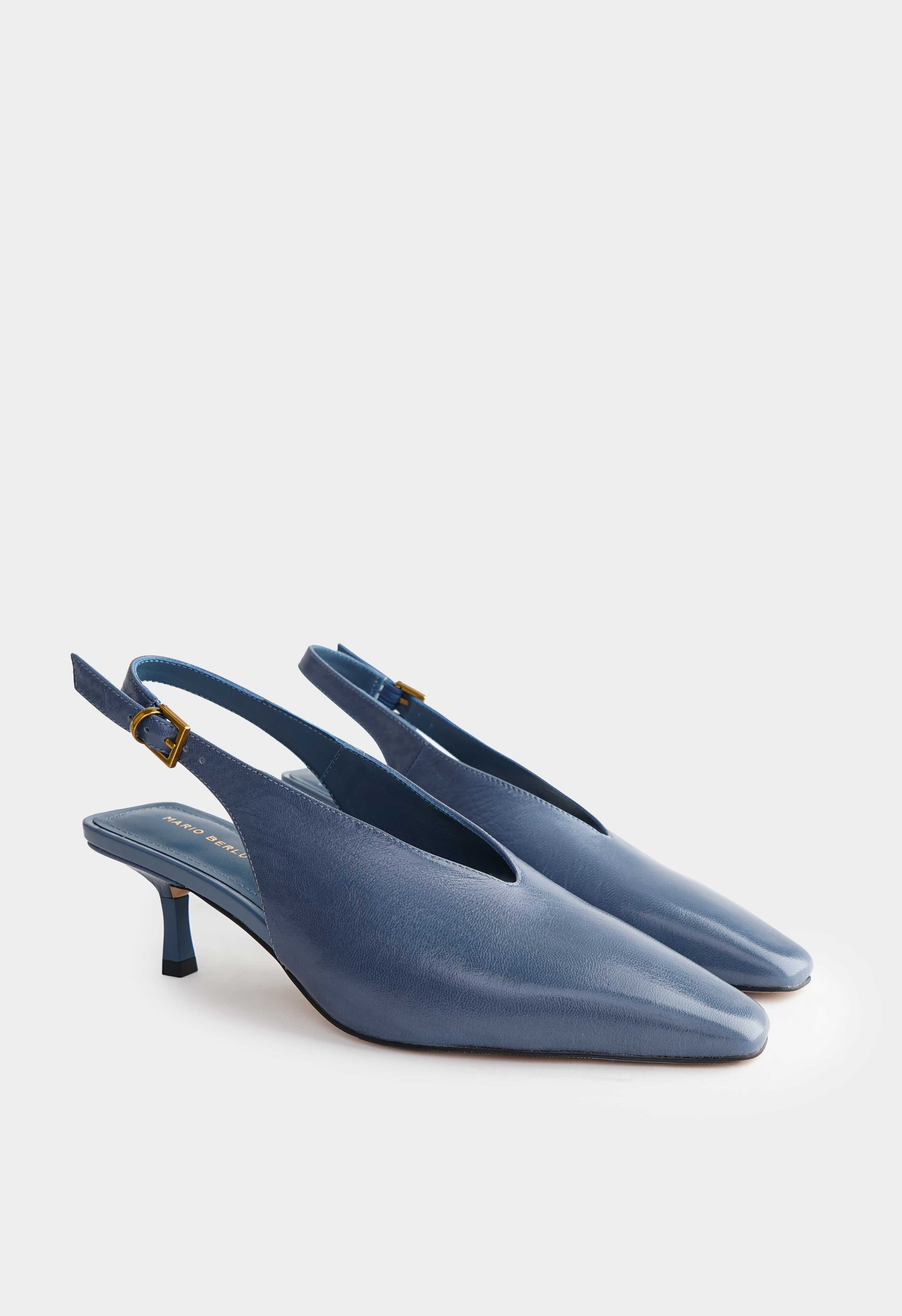 Туфли в синем оттенке из натуральной кожи выглядят элегантно и очень аккуратно благодаря силуэту и открытому заднику. Квадратный мысок добавляет современную геометрию и подчеркивает ухоженный вид, а тонкая шпилька делает линию ноги более изящной. Ремешок с золотой пряжкой красиво фиксирует пятку и добавляет акцент, который смотрится дорого, в то время как гибкая подошва поддерживает комфортный шаг.