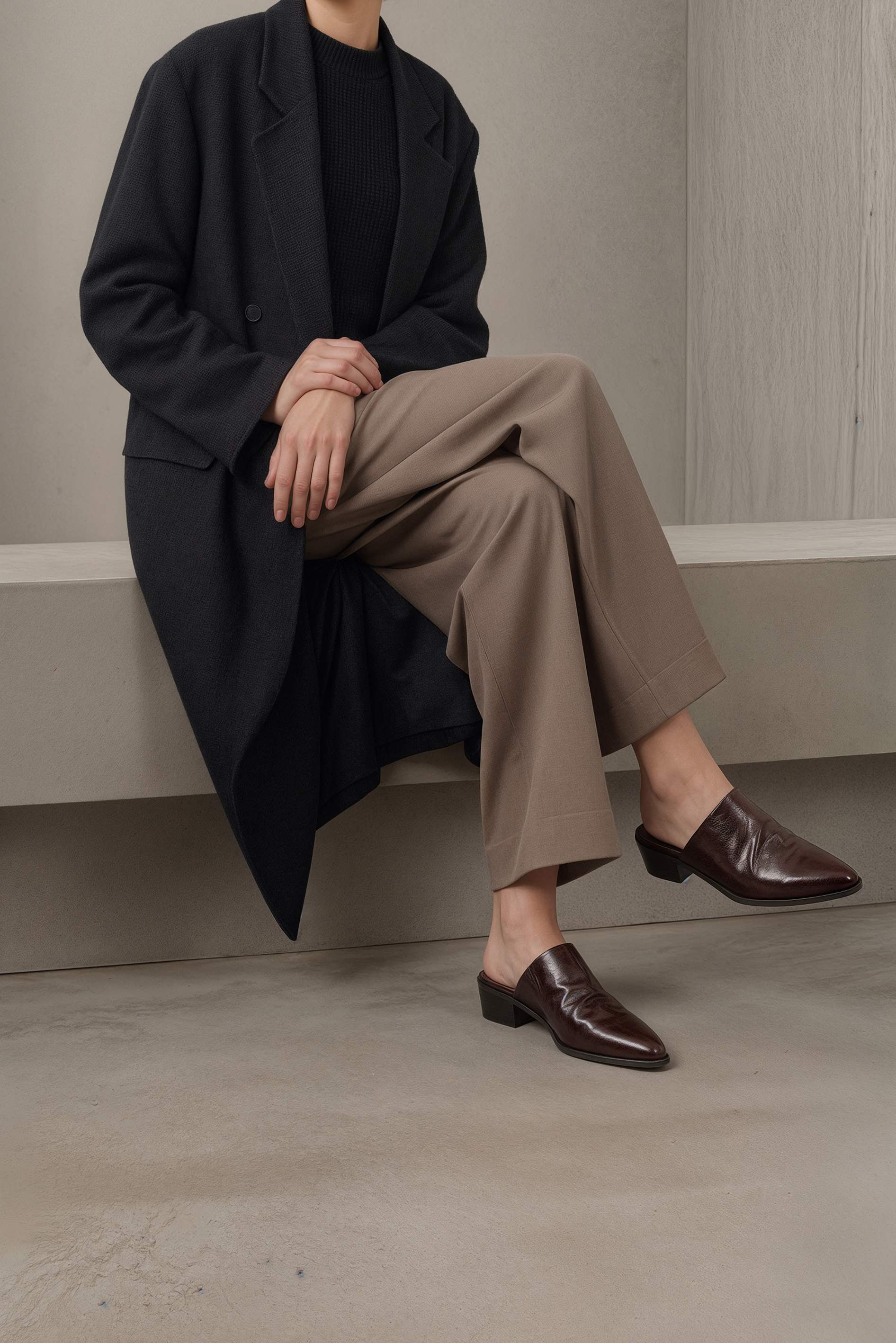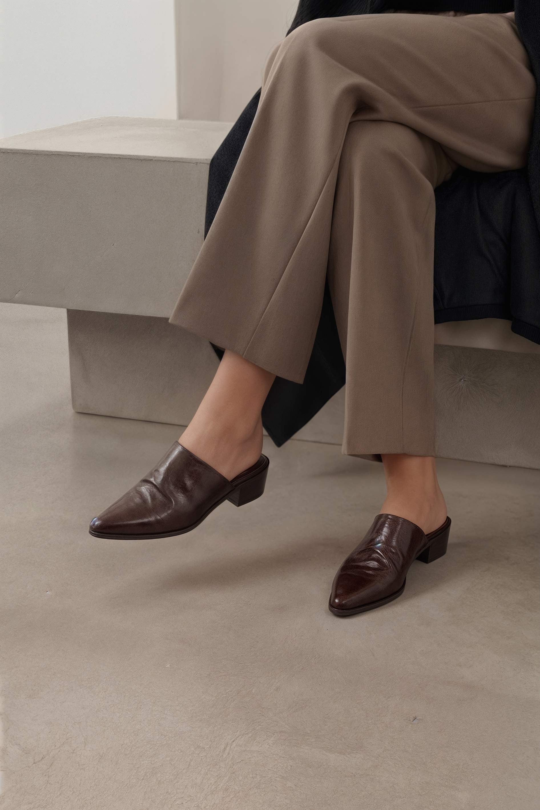 Коричневые мюли из натуральной кожи – элегантная пара с мягким и аккуратным силуэтом. Заостренный мысок визуально вытягивает ногу и делает образ более собранным, а наборный каблук добавляет благородный акцент и устойчивость. Мягкая кожа красиво ложится по стопе, в то время как гибкая подошва поддерживает комфортный шаг и легкость при ходьбе. Такие мюли легко сочетаются с брюками, джинсами и платьями и подходят и для офиса, и для городских выходов.