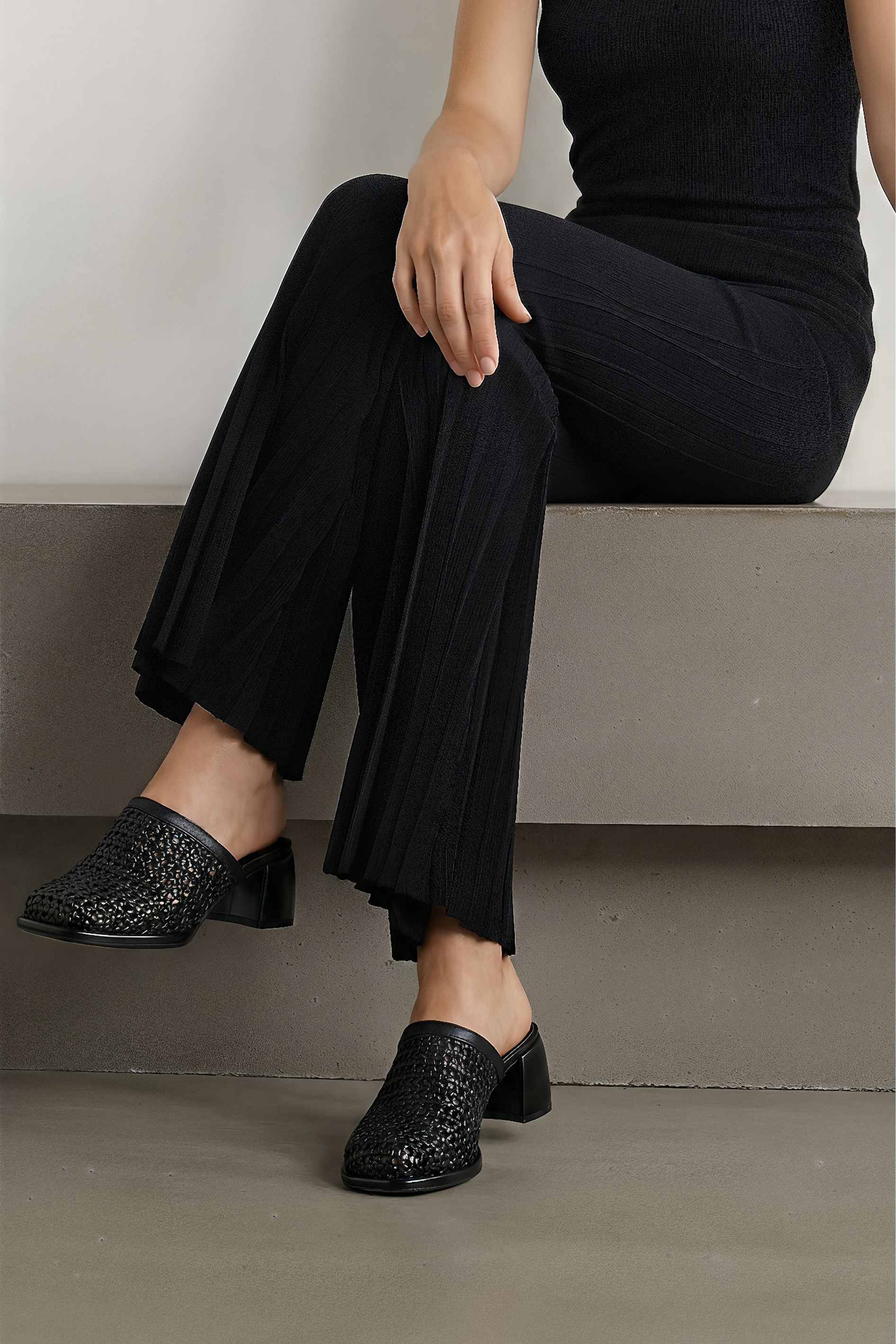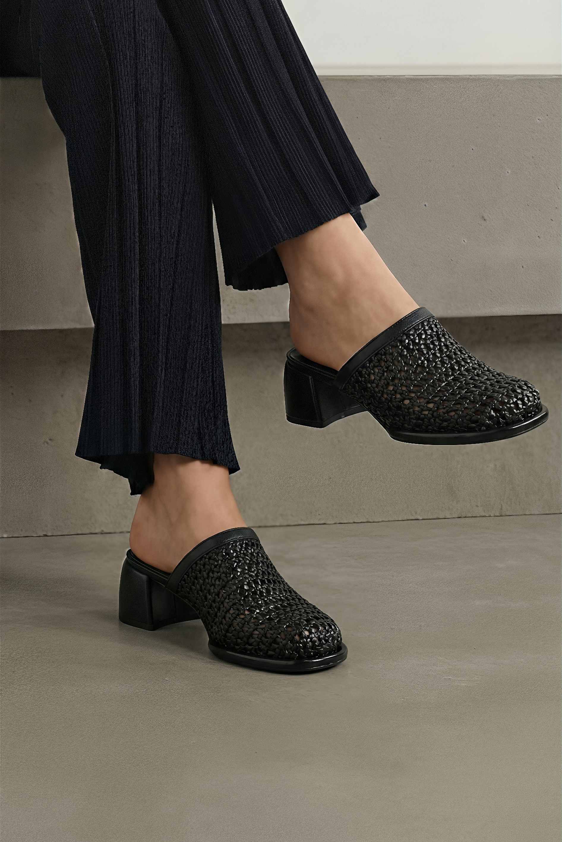 Черные мюли из натуральной кожи выглядят стильно благодаря эффектному плетеному верху, который добавляет образу фактуры и настроения. Аккуратный округлый мысок делает силуэт мягче и универсальнее, хорошо сочетается и с платьями, и с брюками. Устойчивый широкий каблук смотрится современно, а жесткая подошва обеспечивает стабильный шаг. Идеальный вариант для города и вечерних выходов, когда хочется выглядеть эффектно без лишних усилий.