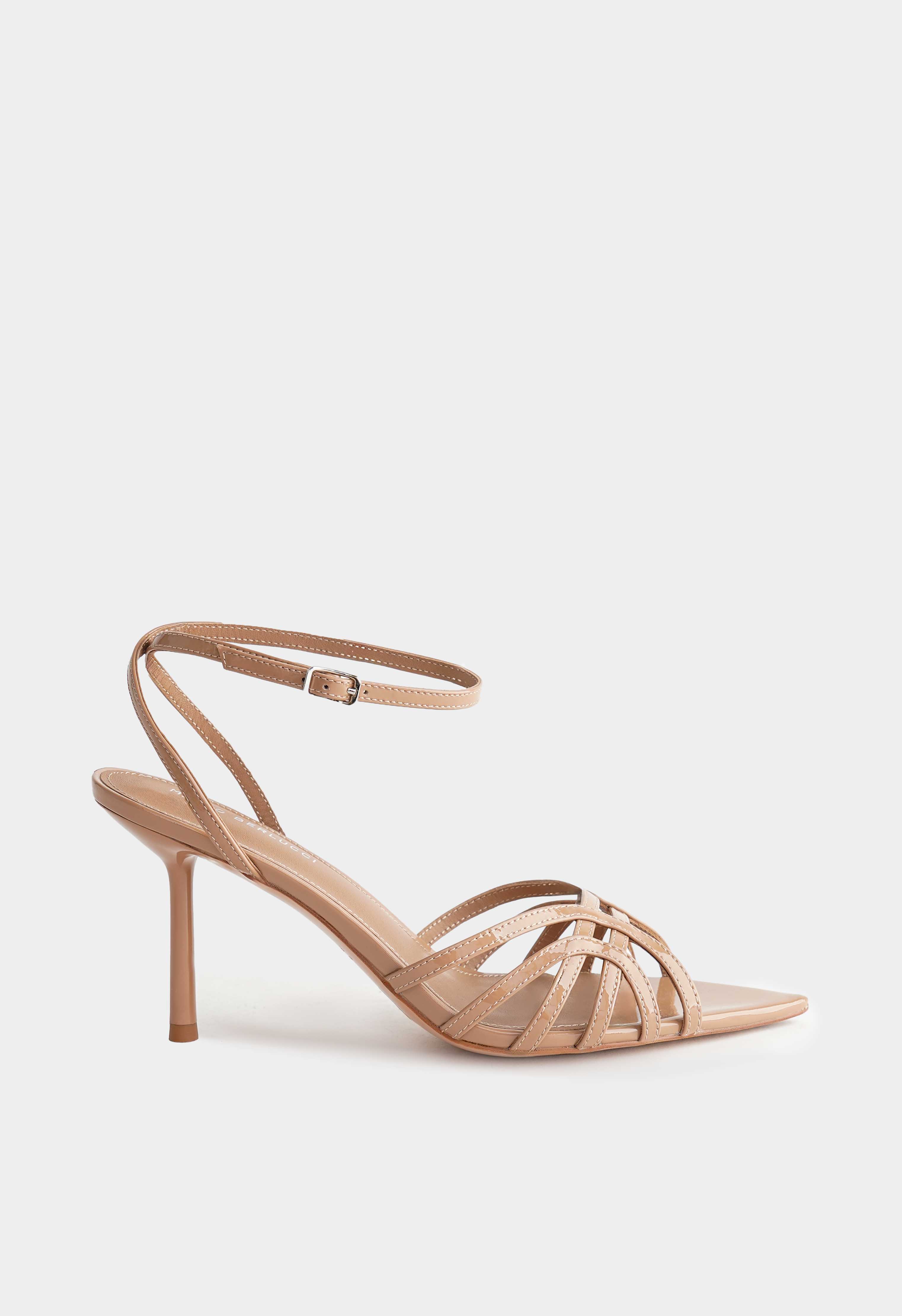 Бежевые босоножки из натуральной лаковой кожи выглядят очень эффектно за счет зеркального блеска и изящного переплетения ремешков. Открытый мысок добавляет легкости, а тонкая шпилька делает ноги визуально длиннее и придает образу уверенную женственность. Регулируемая пряжка фиксирует посадку, металлик-фурнитура добавляет аккуратный акцент и подчеркивает женственные линии. Жесткая подошва сохраняет форму и обеспечивает стабильный шаг – отличная пара для коктейльных образов, вечеринок и торжественных выходов.