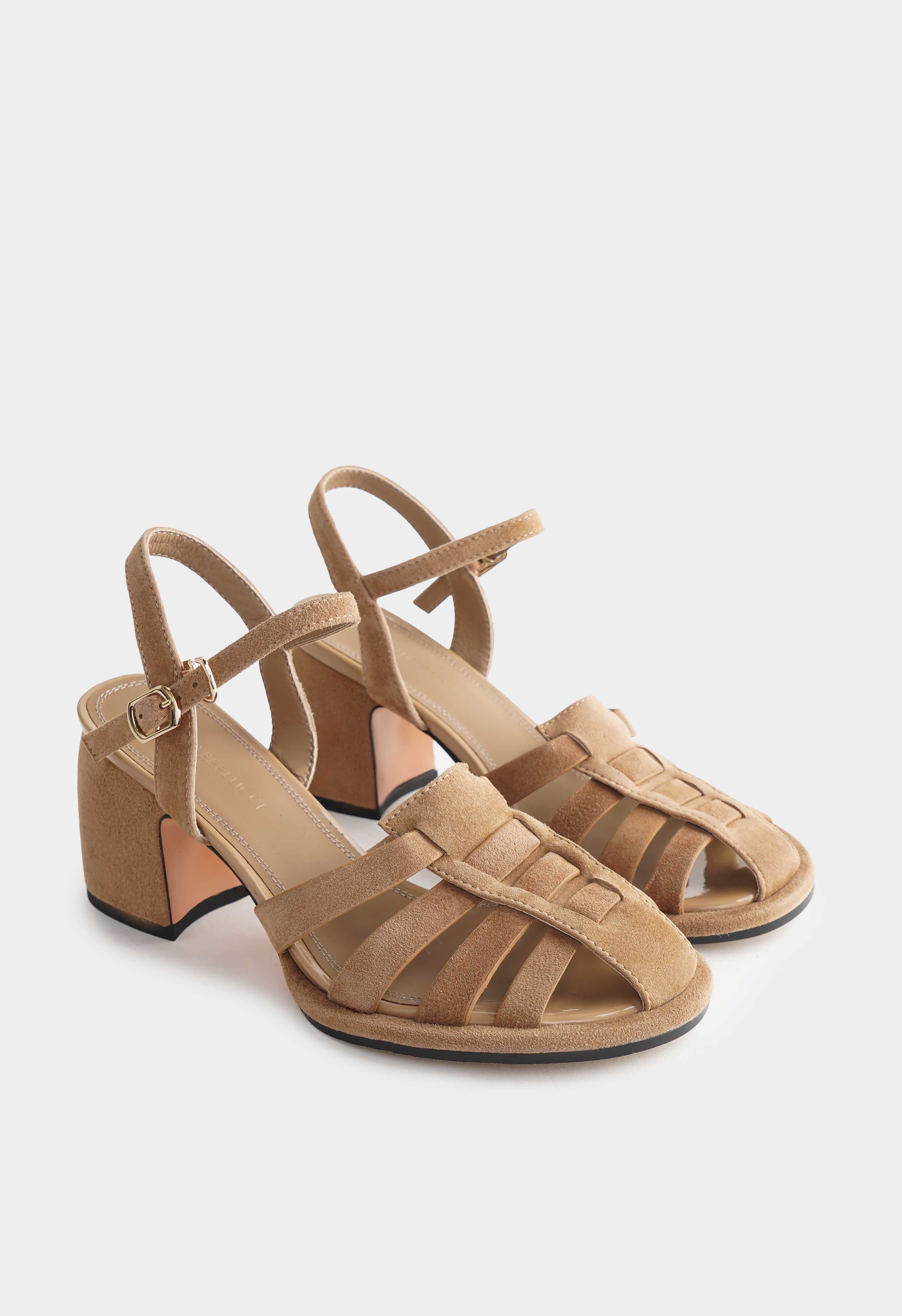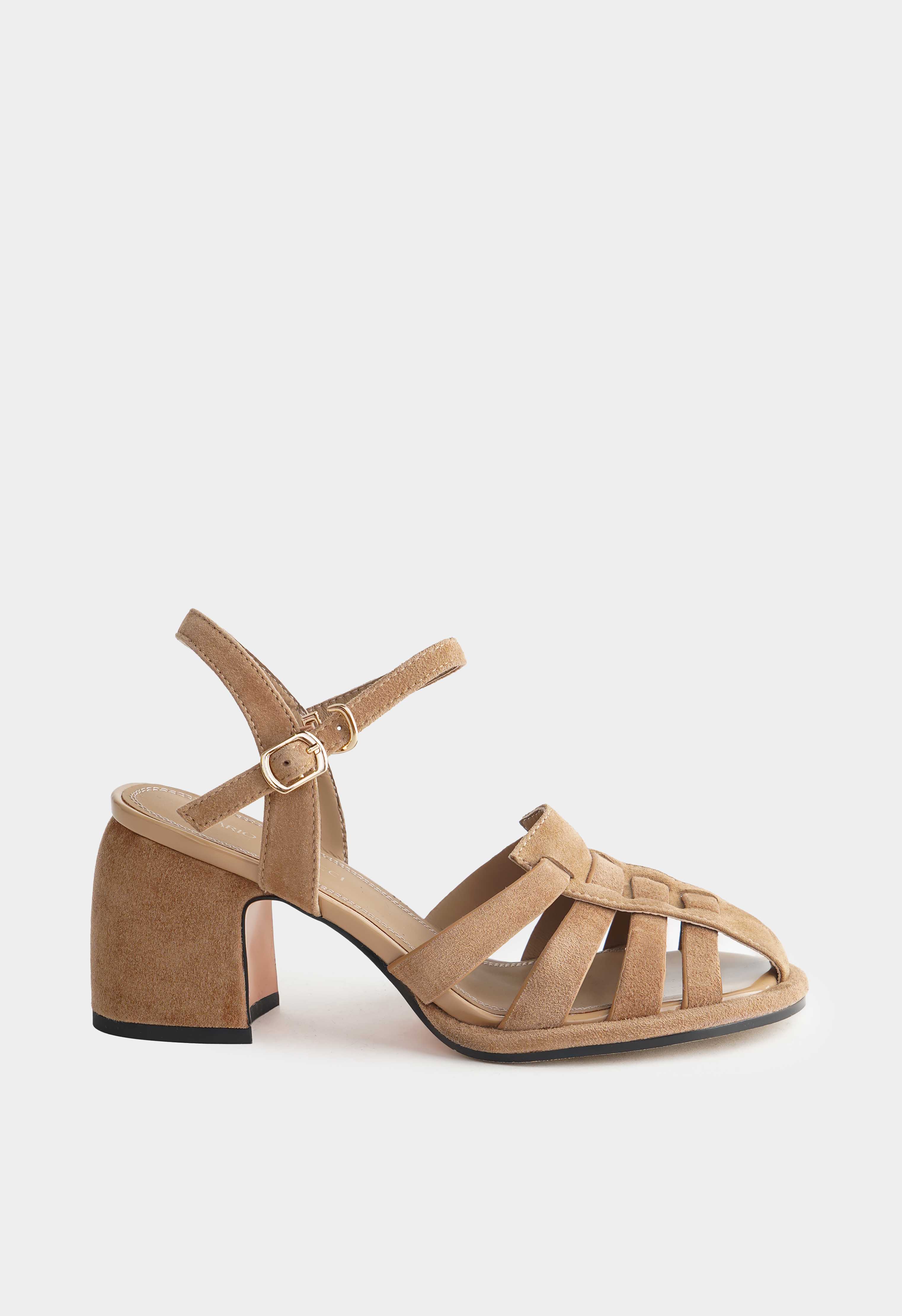 Эти бежевые босоножки из натуральной замши сочетают элегантность и комфорт: округлый мысок обеспечивает удобную посадку, а трапециевидный каблук – устойчивую и грациозную походку. Золотая пряжка добавляет изысканный акцент, в то время как жесткая подошва гарантирует надежность на каждом шаге, делая их идеальным выбором для выходов и вечерних прогулок.